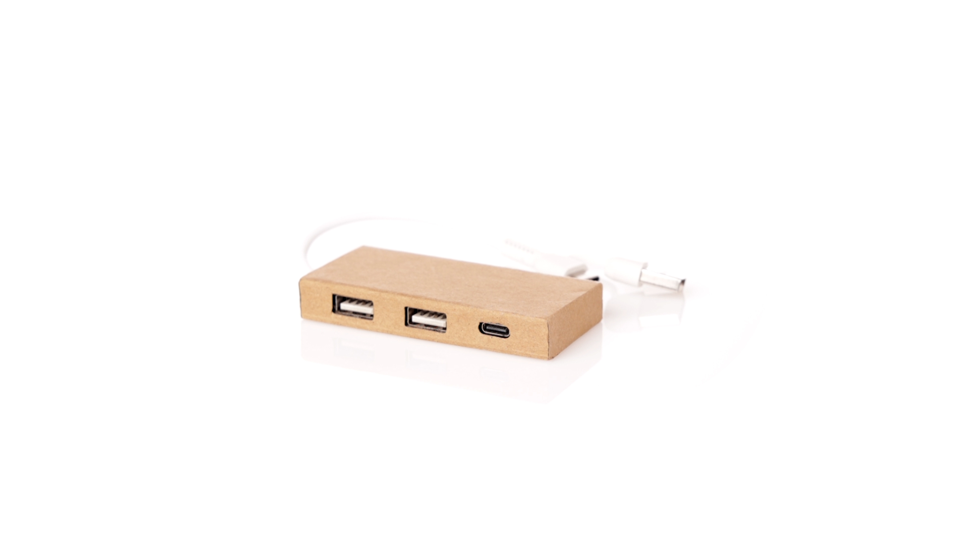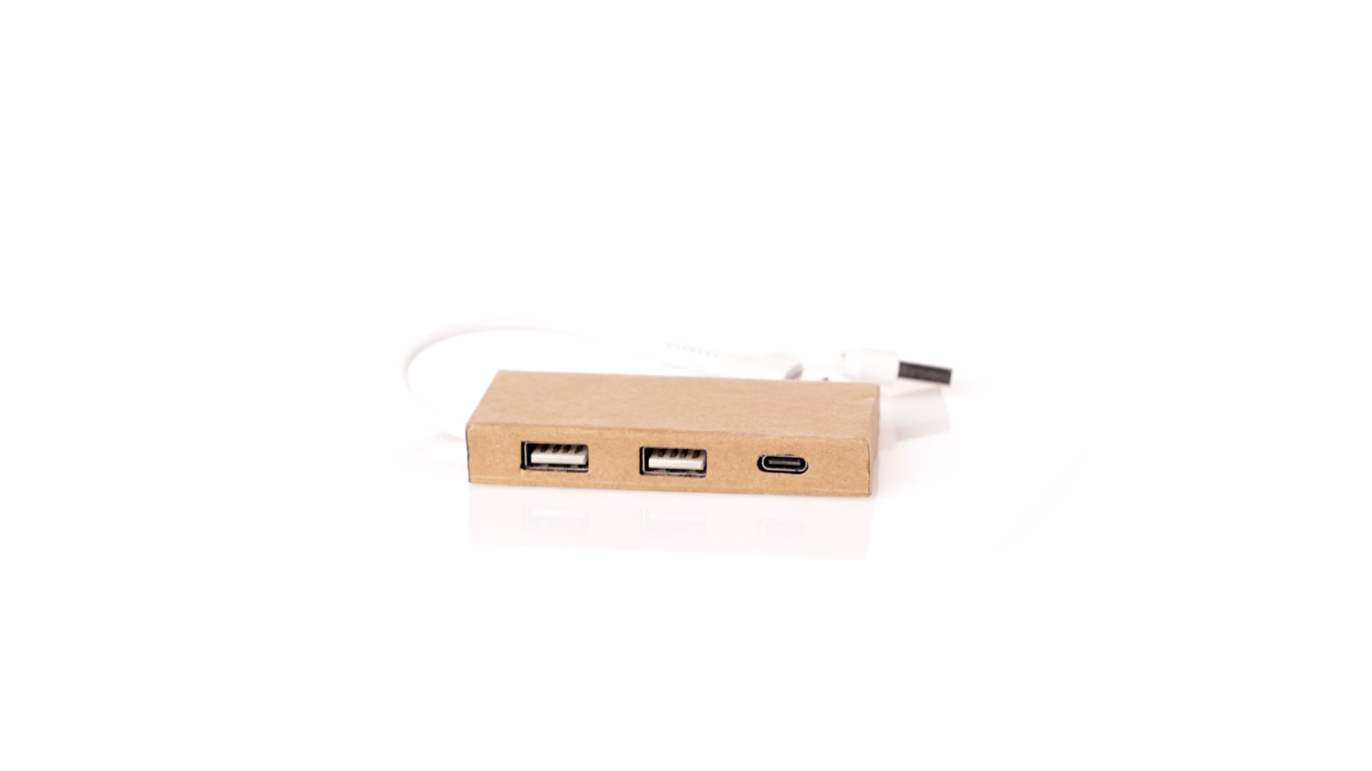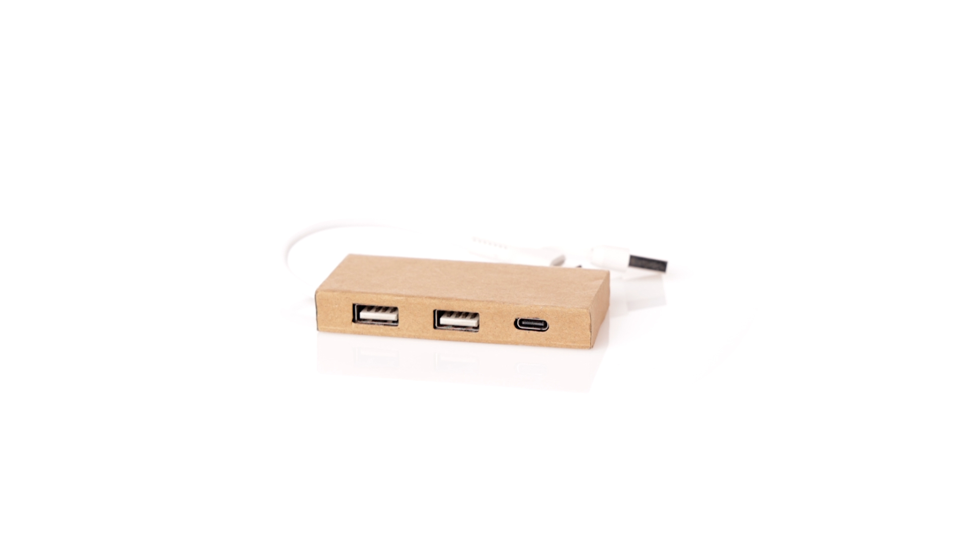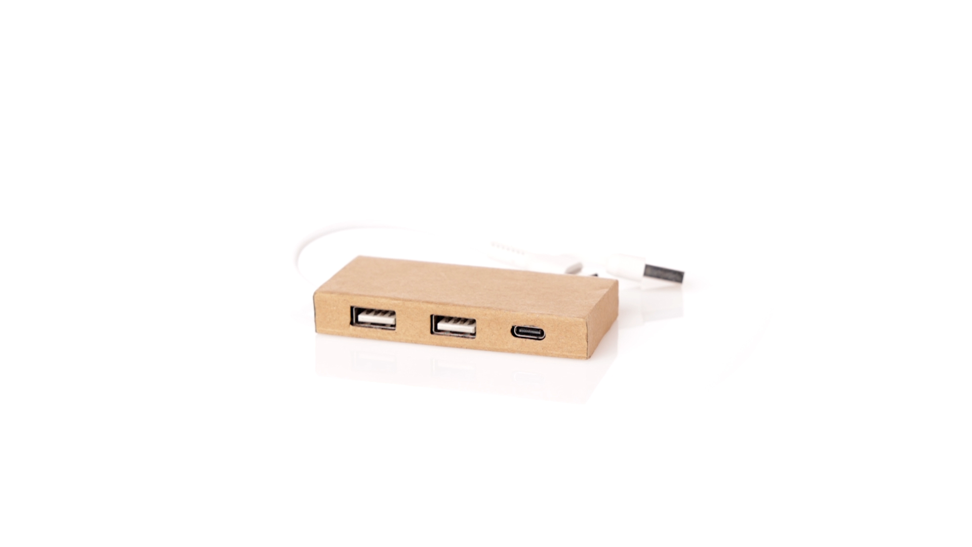 2.0 USB-Hub aus recyceltem Karton. Inklusive Typ-C-Anschluss und 2 USB-Anschlüssen, mit dualem USB/Typ-C-Eingang. Präsentiert in einer individuellen Kraft-Designbox. Hergestellt nach RoHS-Standards, mit Blockiersystem zur Vermeidung von Kurzschlüssen.