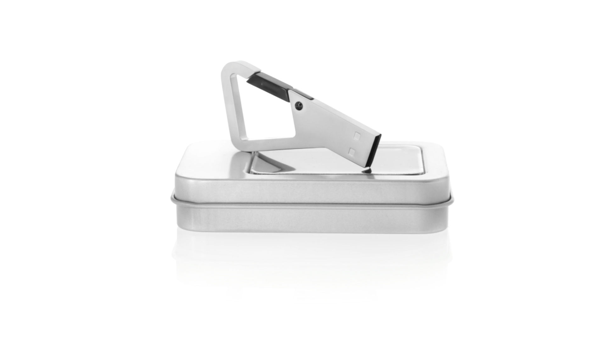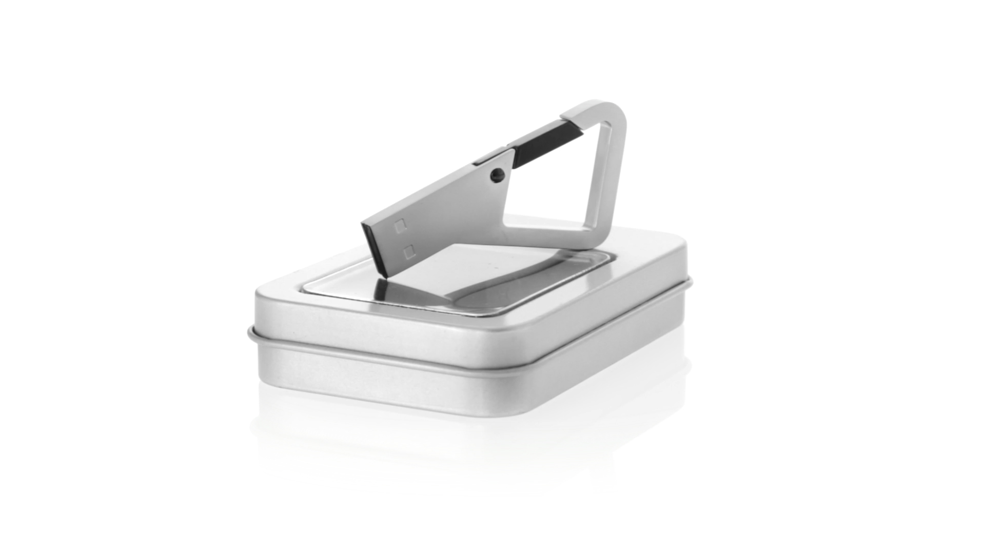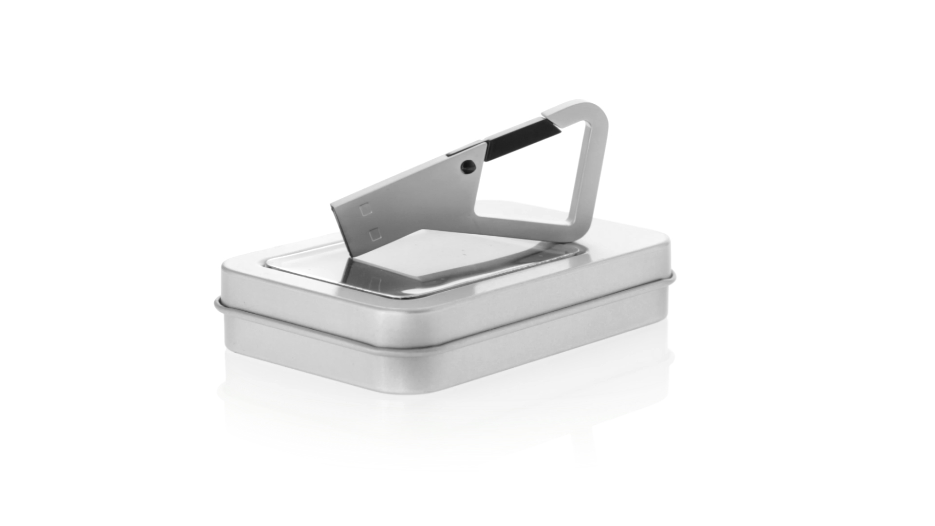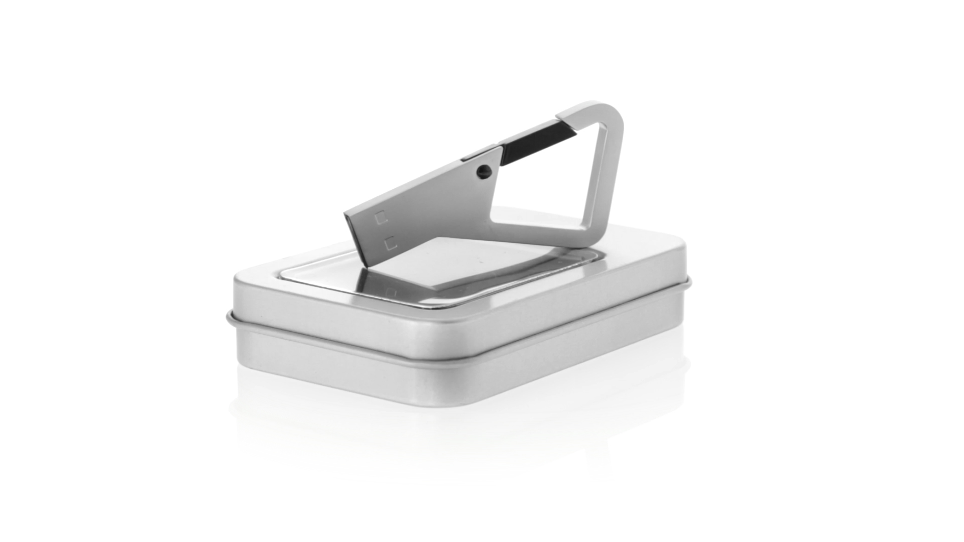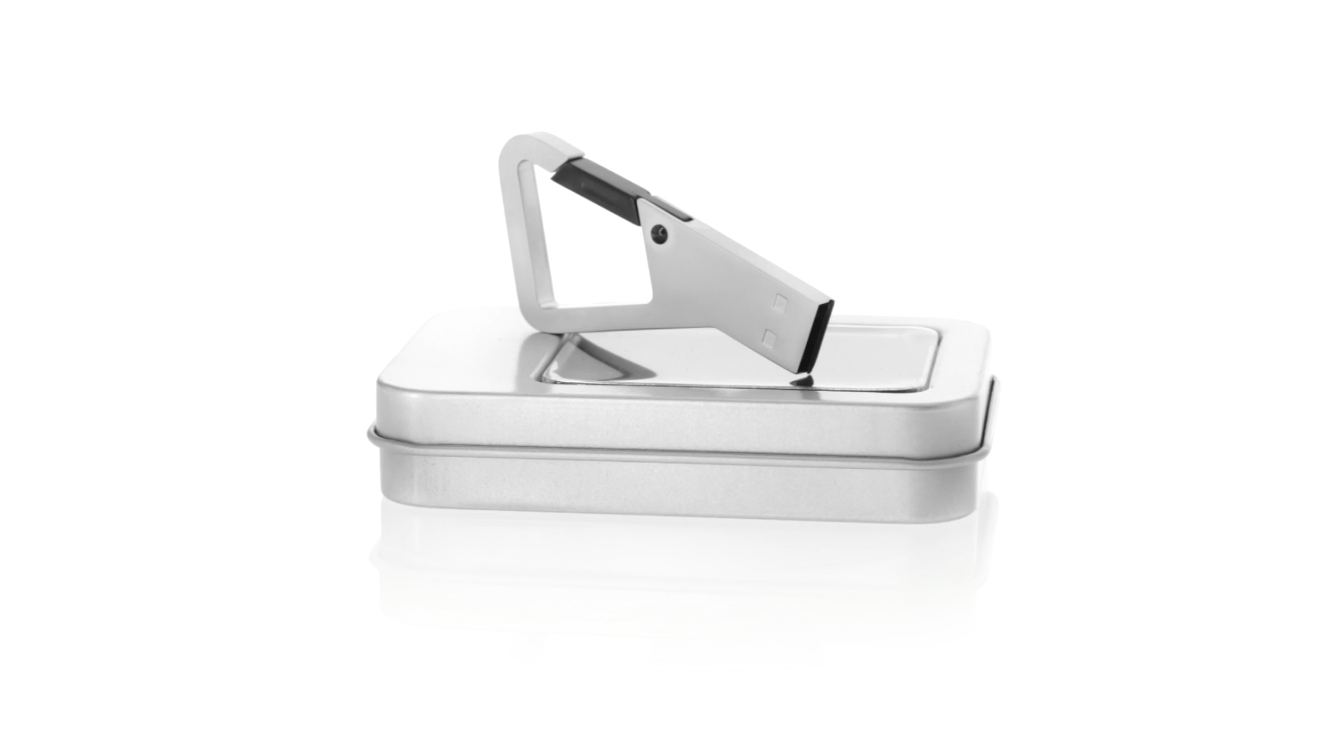 USB-Stick mit 8 GB Speicherkapazität aus Metall. Mit originellem Karabiner-Design mit Verschluss in einer Vielzahl von Farben. Präsentiert in einer individuellen Metallbox mit Fenster und weichem, gestanztem Schaumstoff im Inneren.