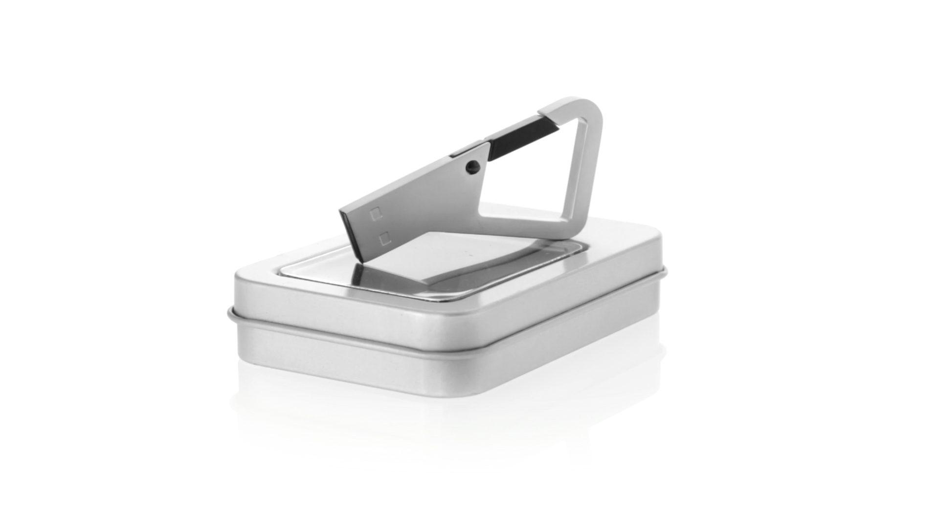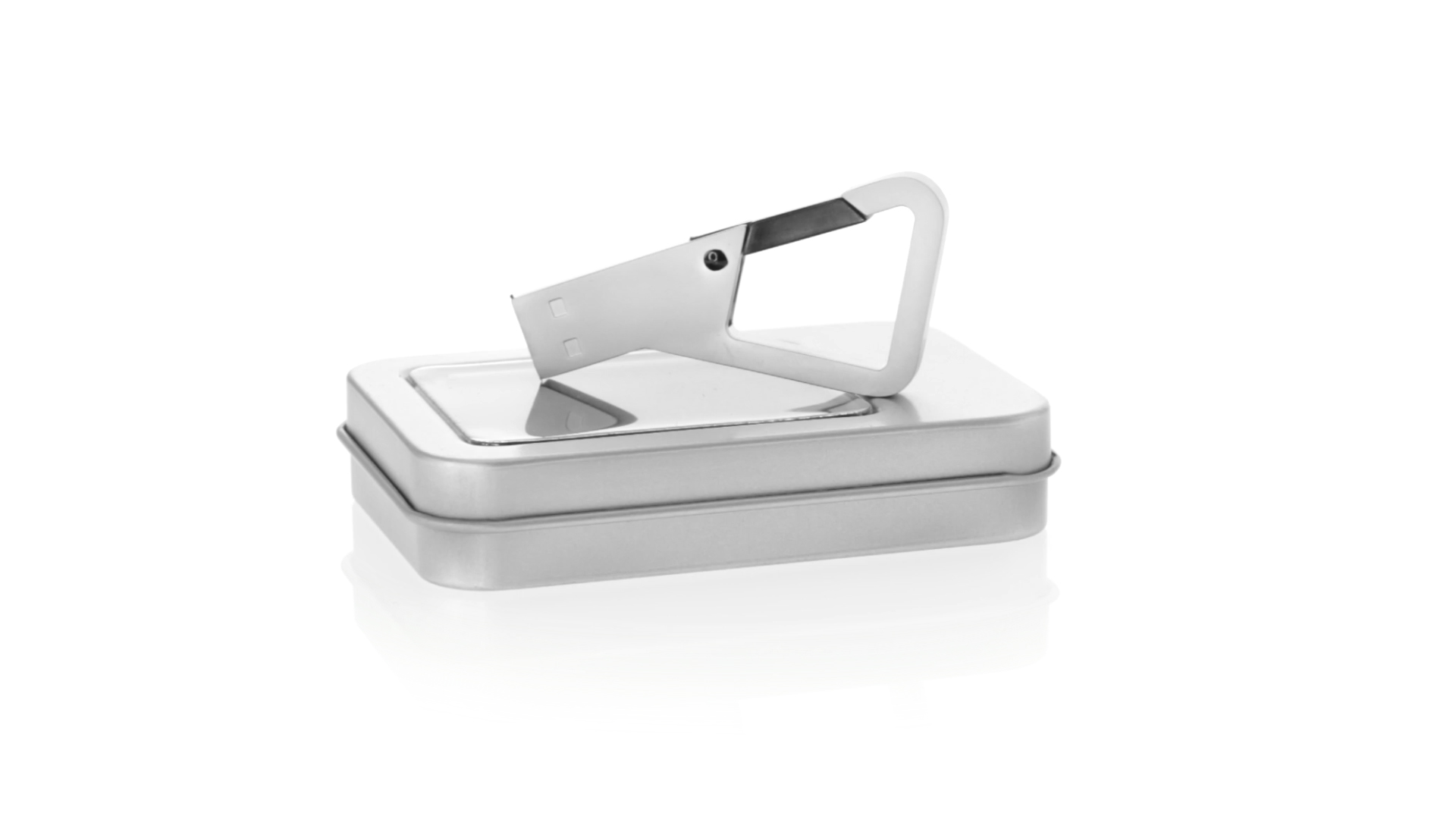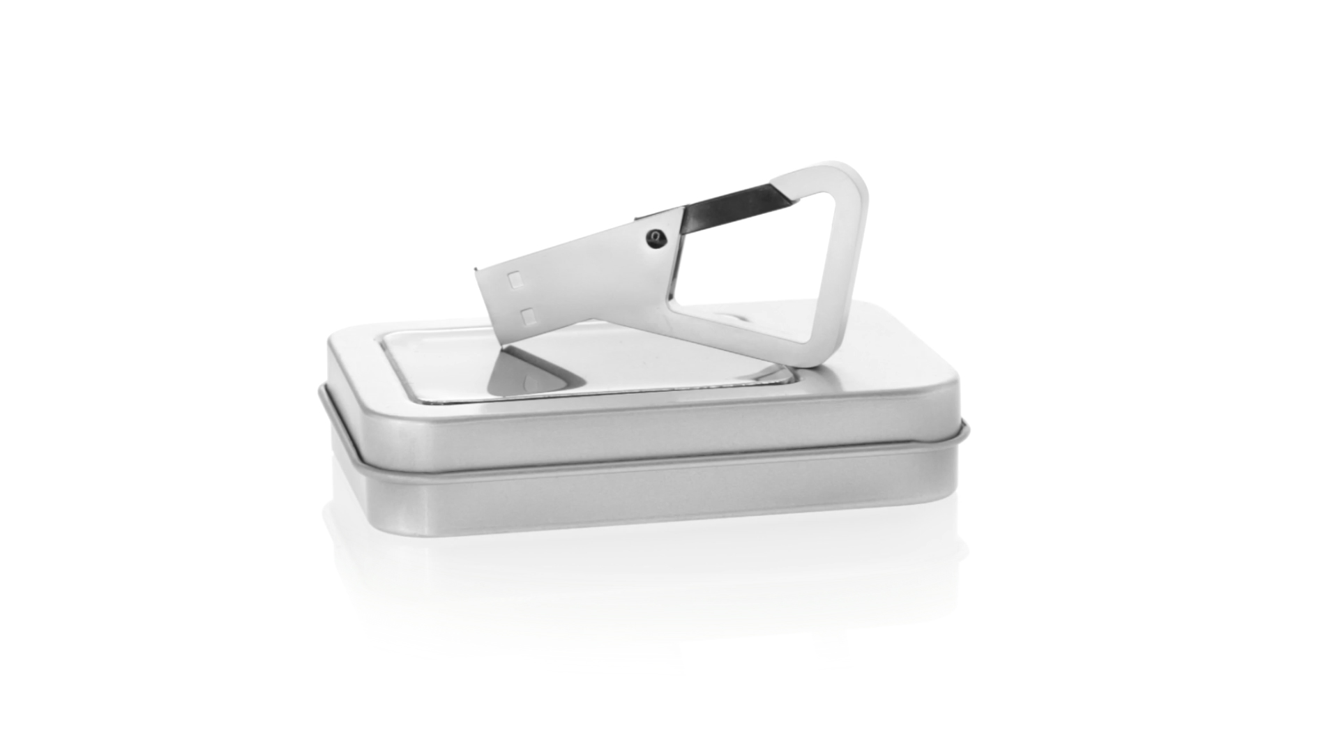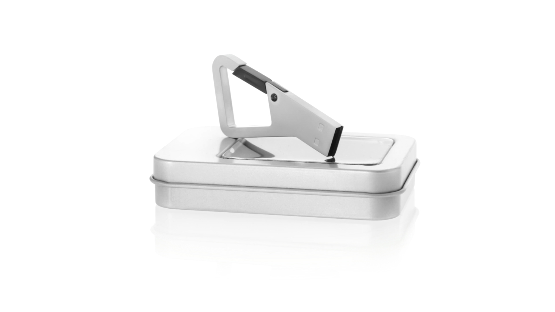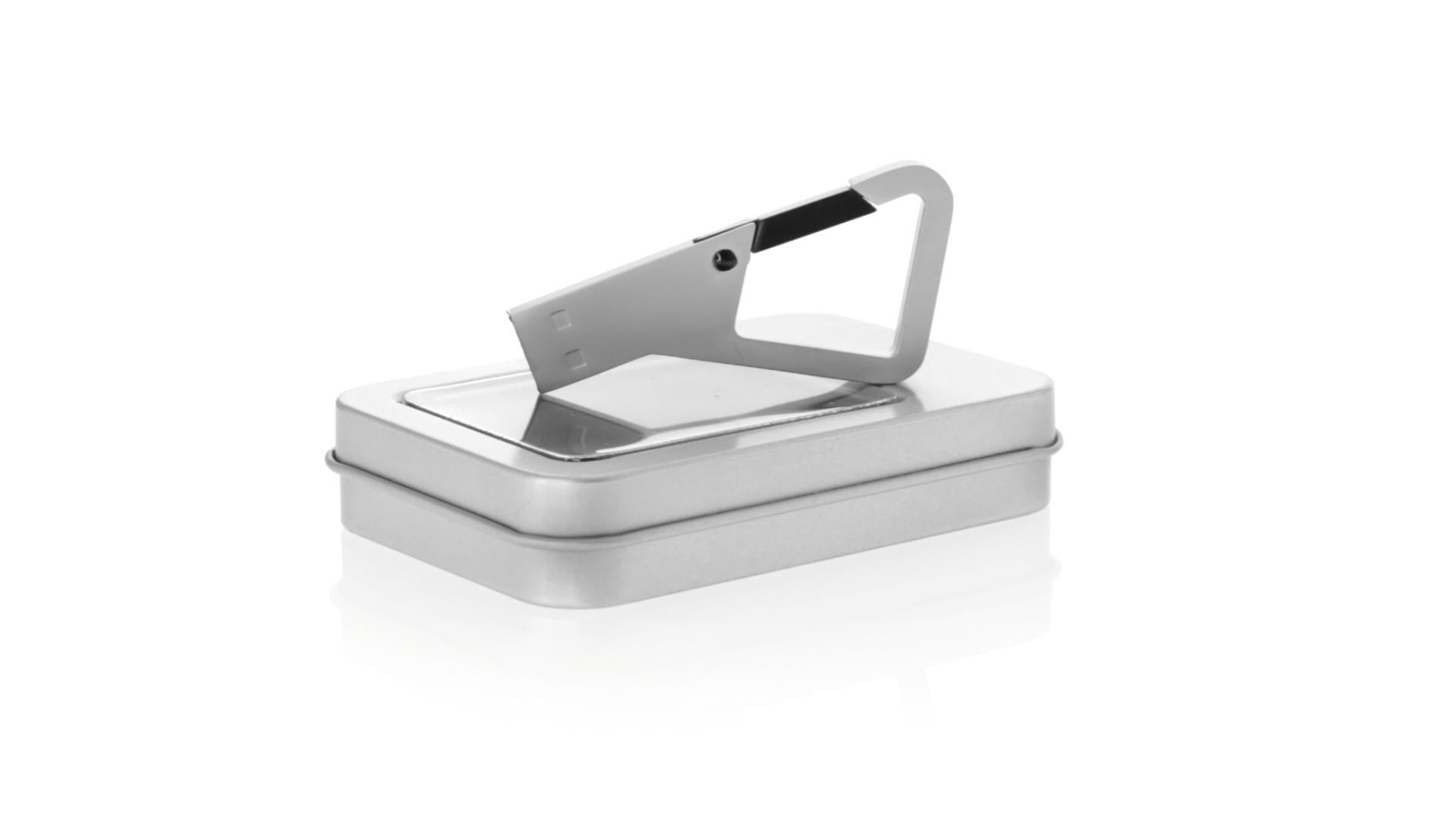 USB-Stick mit 8 GB Speicherkapazität aus Metall. Mit originellem Karabiner-Design mit Verschluss in einer Vielzahl von Farben. Präsentiert in einer individuellen Metallbox mit Fenster und weichem, gestanztem Schaumstoff im Inneren.