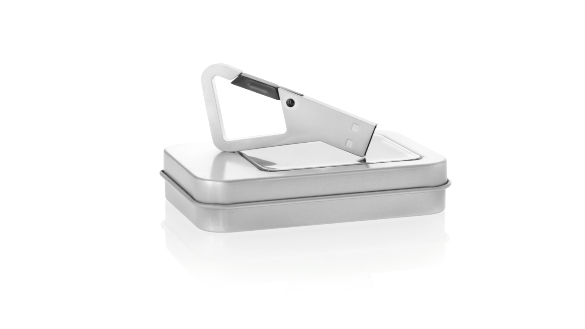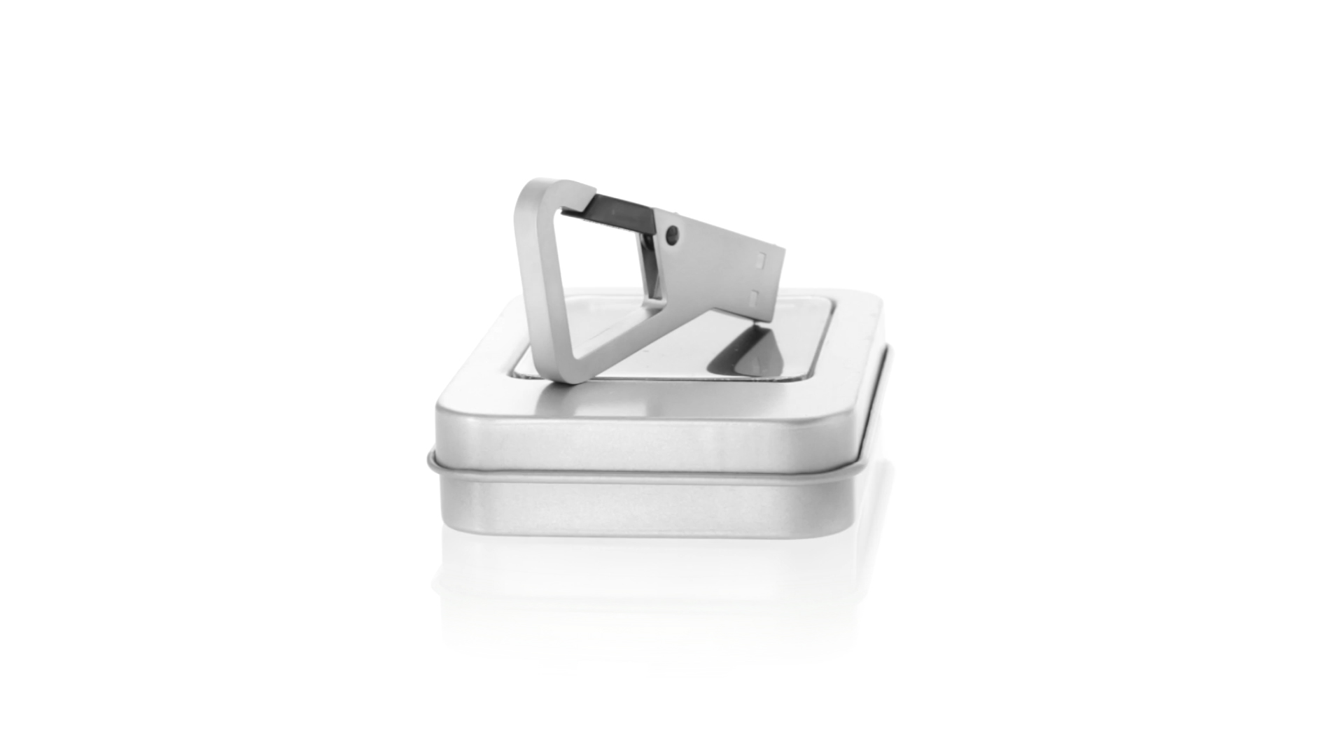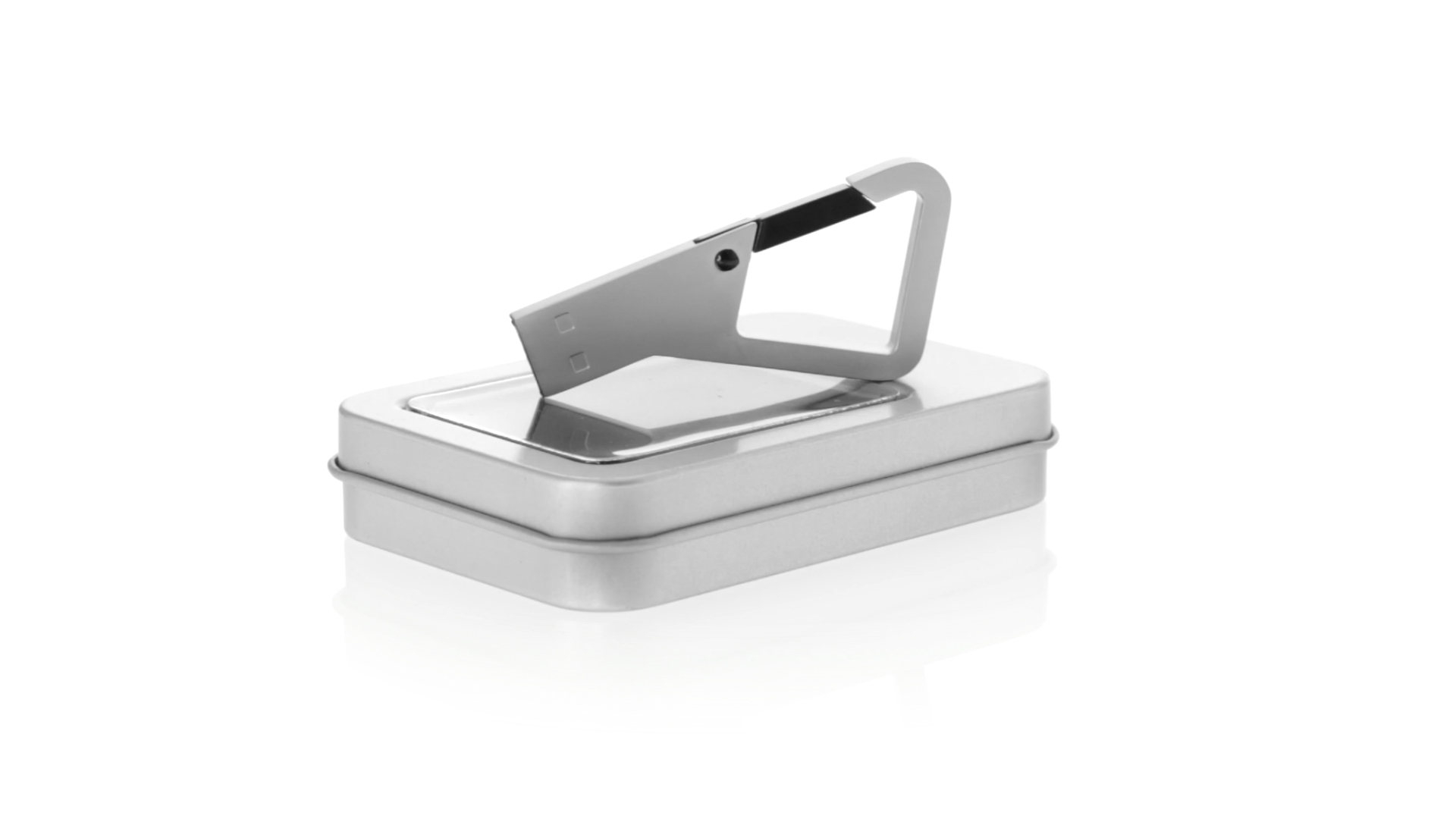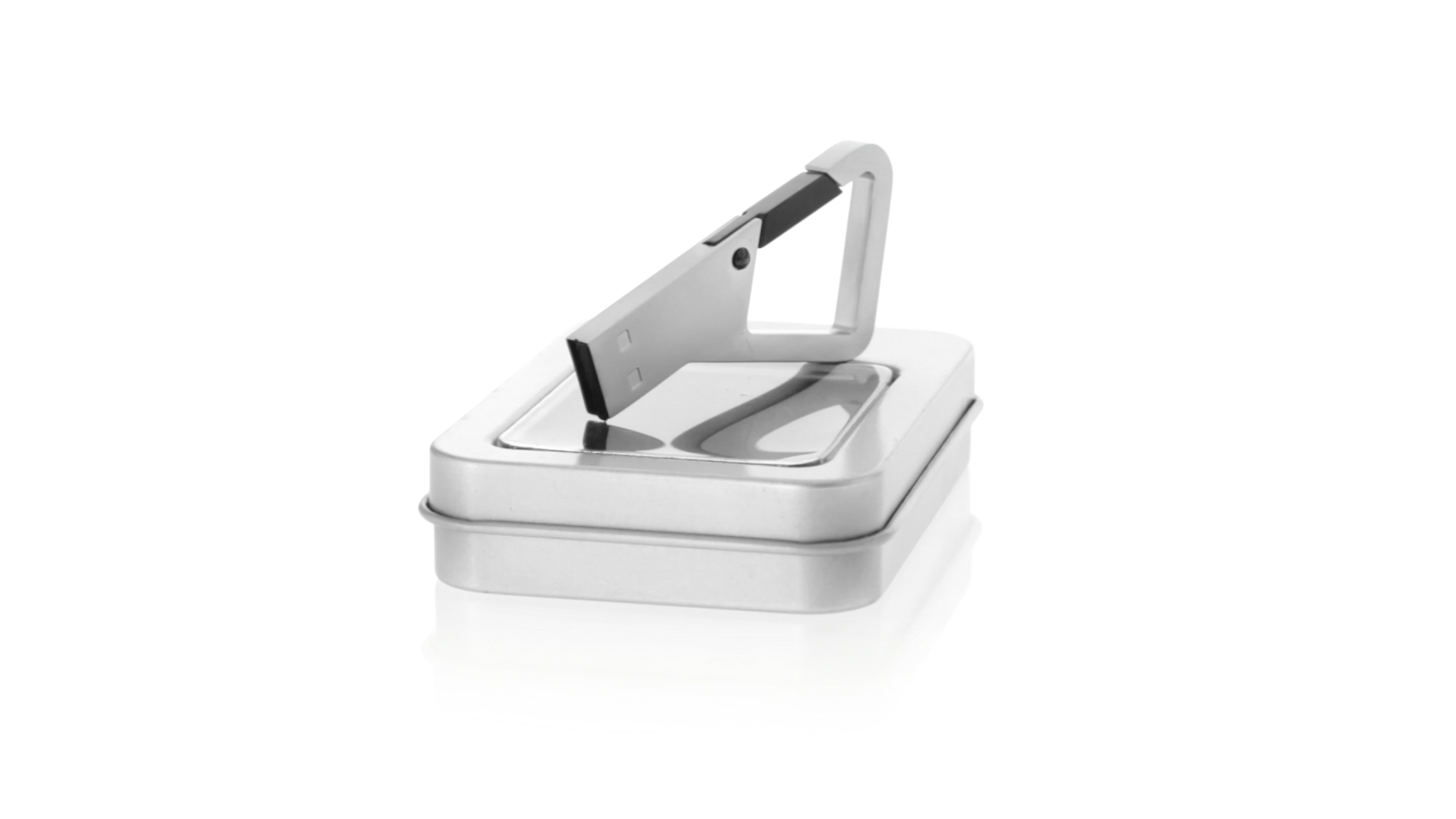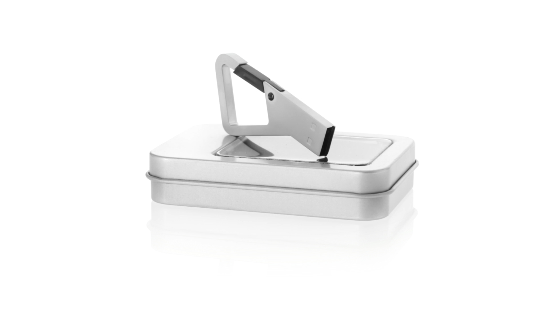 USB-Stick mit 8 GB Speicherkapazität aus Metall. Mit originellem Karabiner-Design mit Verschluss in einer Vielzahl von Farben. Präsentiert in einer individuellen Metallbox mit Fenster und weichem, gestanztem Schaumstoff im Inneren.