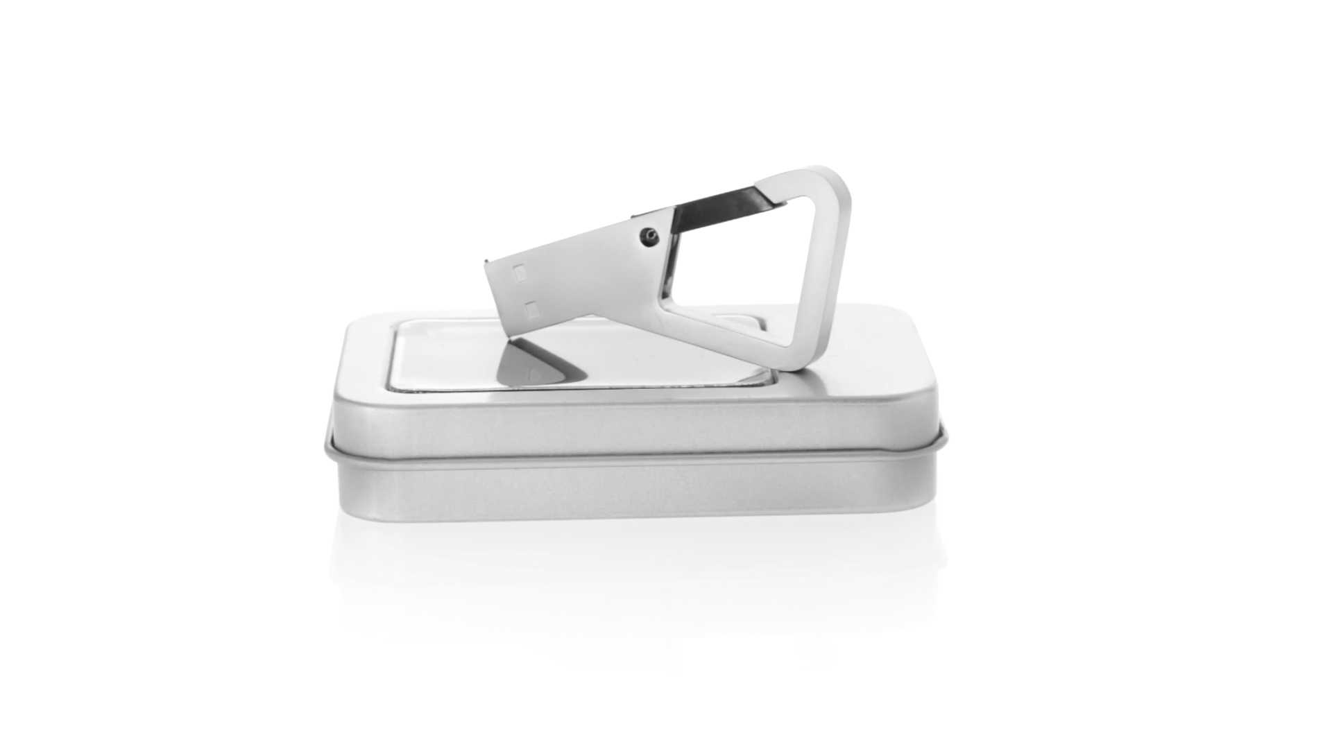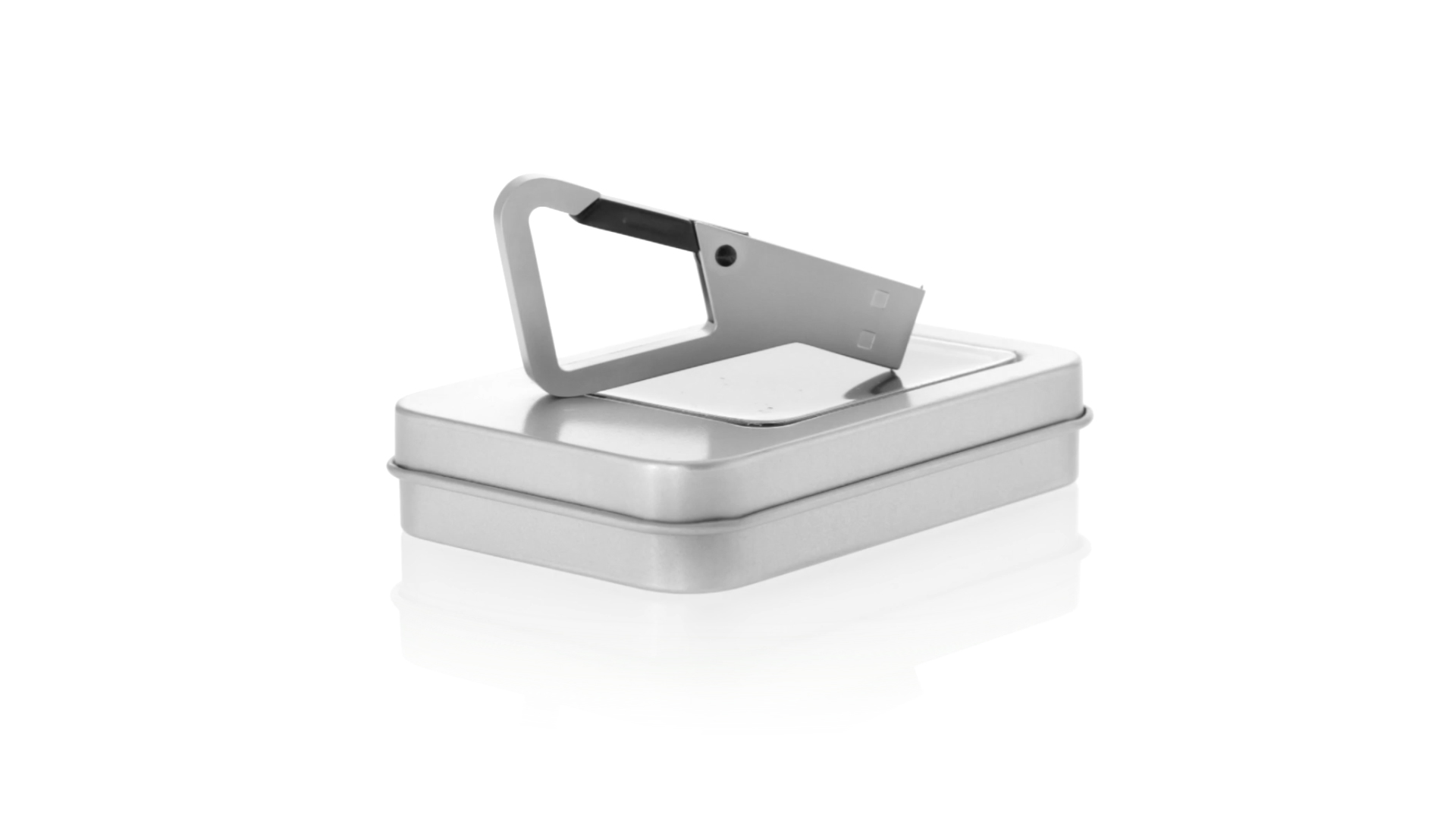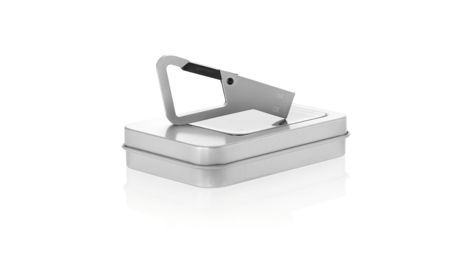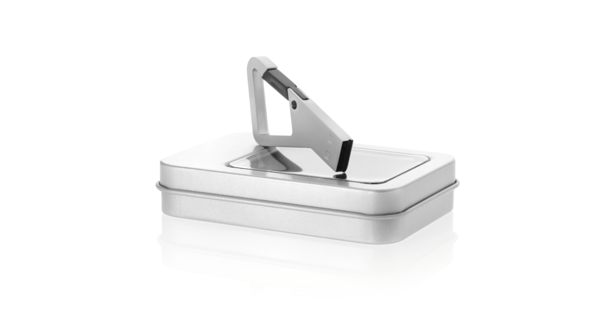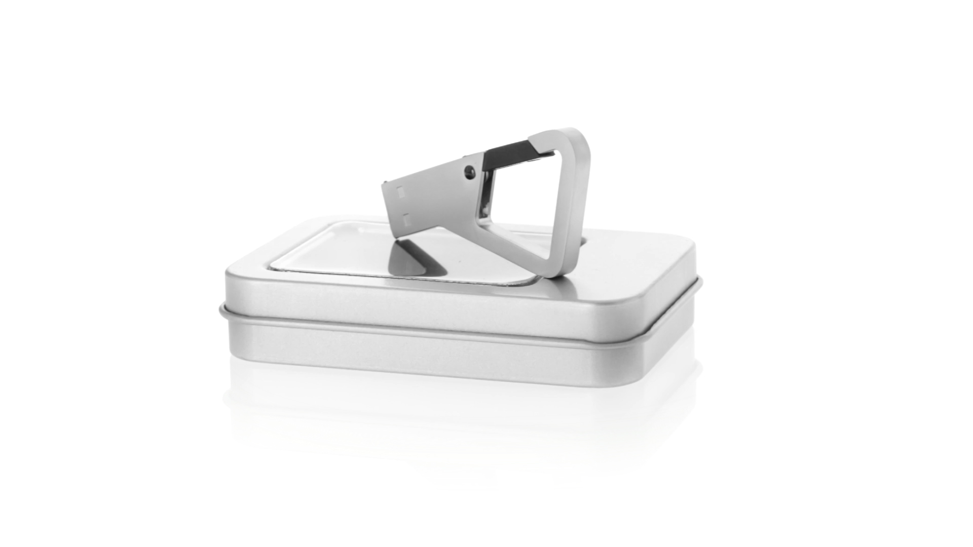 USB-Stick mit 8 GB Speicherkapazität aus Metall. Mit originellem Karabiner-Design mit Verschluss in einer Vielzahl von Farben. Präsentiert in einer individuellen Metallbox mit Fenster und weichem, gestanztem Schaumstoff im Inneren.