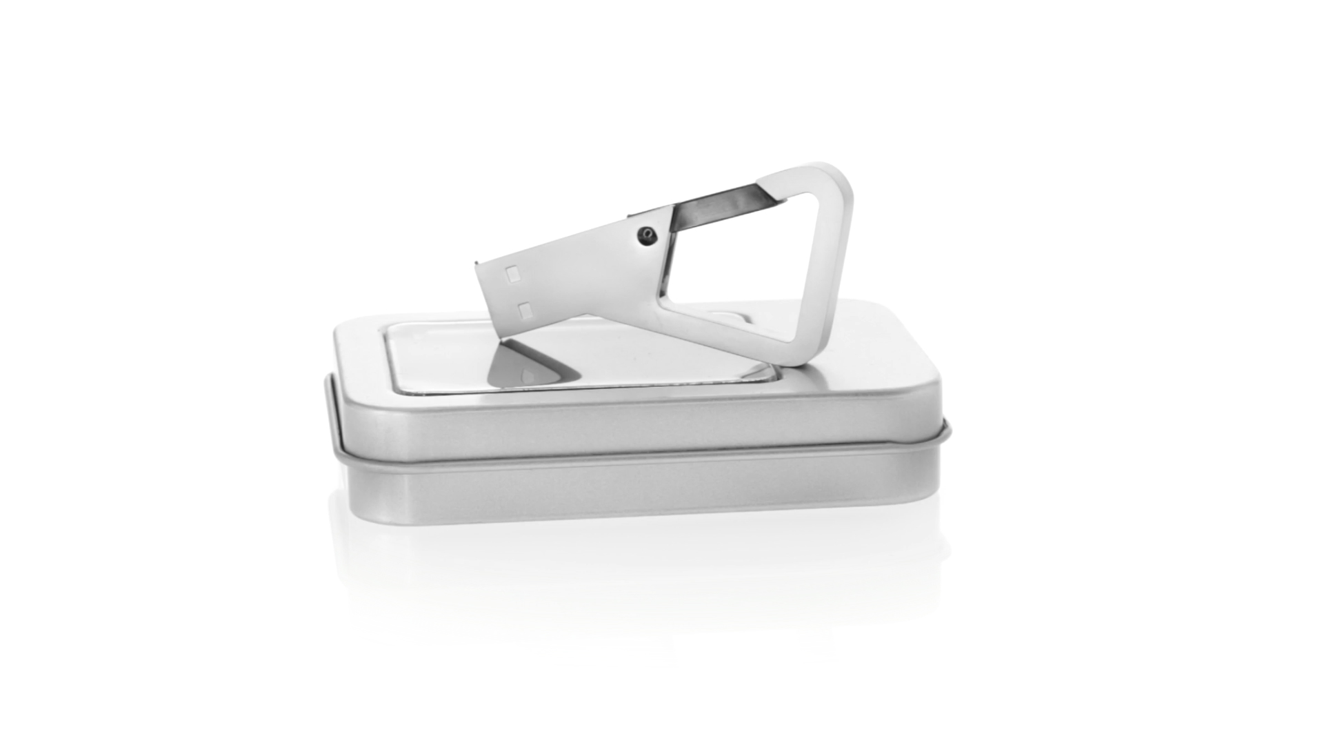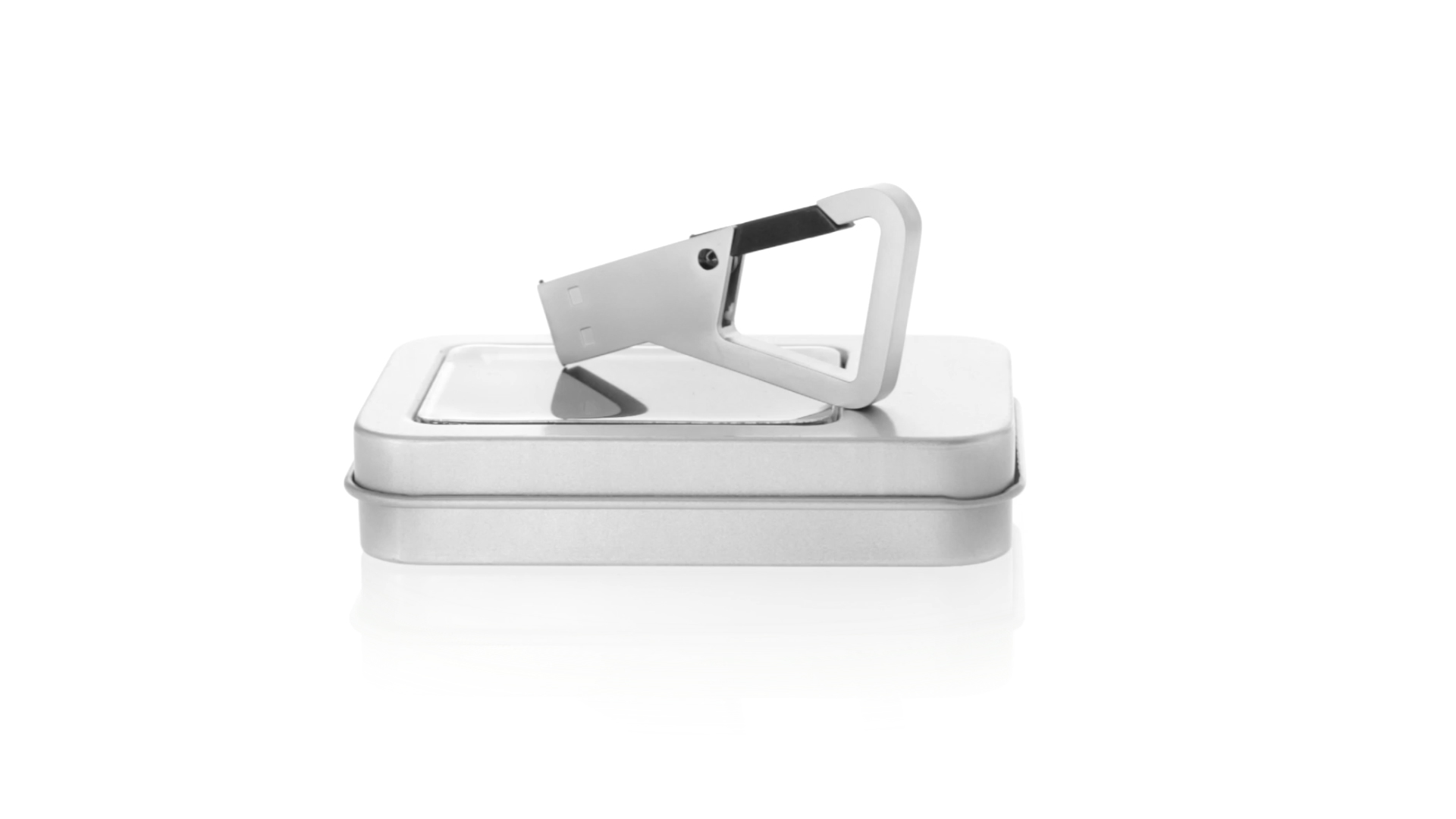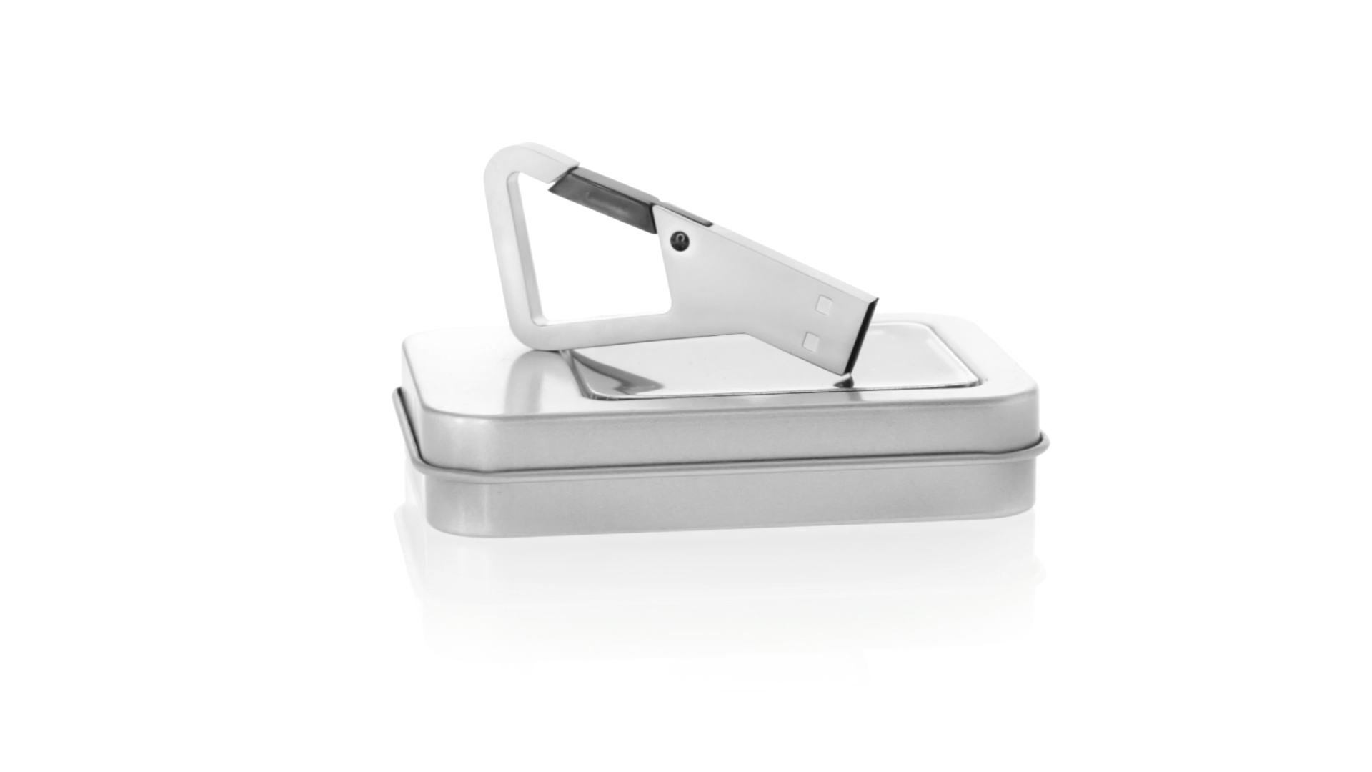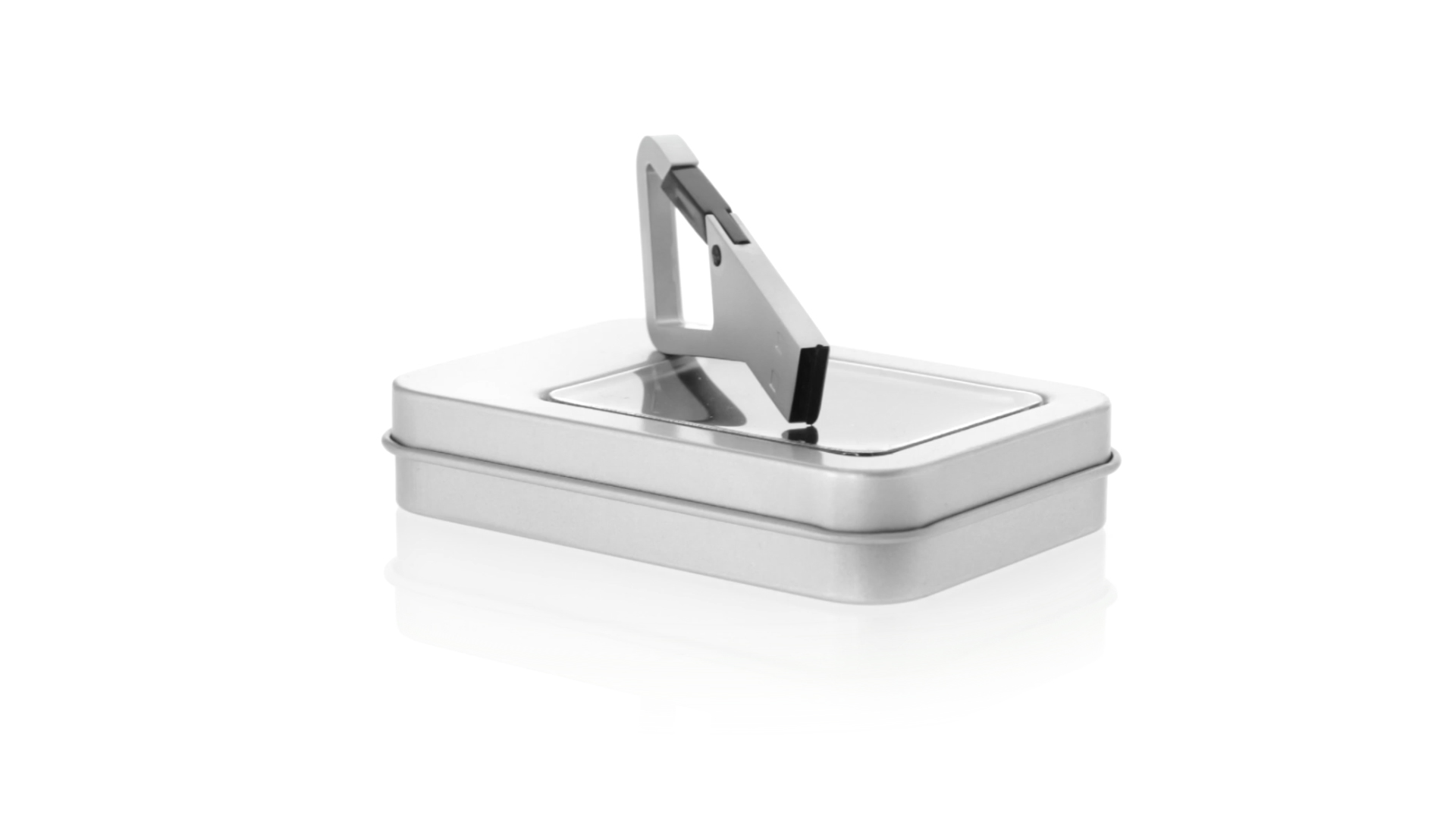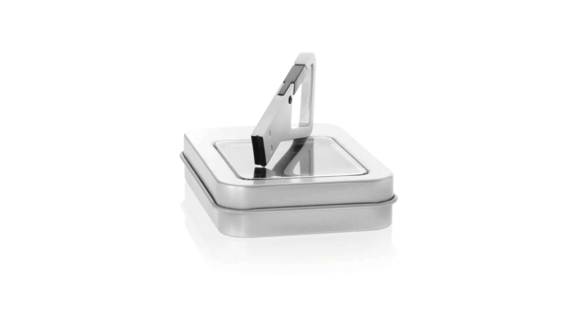 USB-Stick mit 8 GB Speicherkapazität aus Metall. Mit originellem Karabiner-Design mit Verschluss in einer Vielzahl von Farben. Präsentiert in einer individuellen Metallbox mit Fenster und weichem, gestanztem Schaumstoff im Inneren.