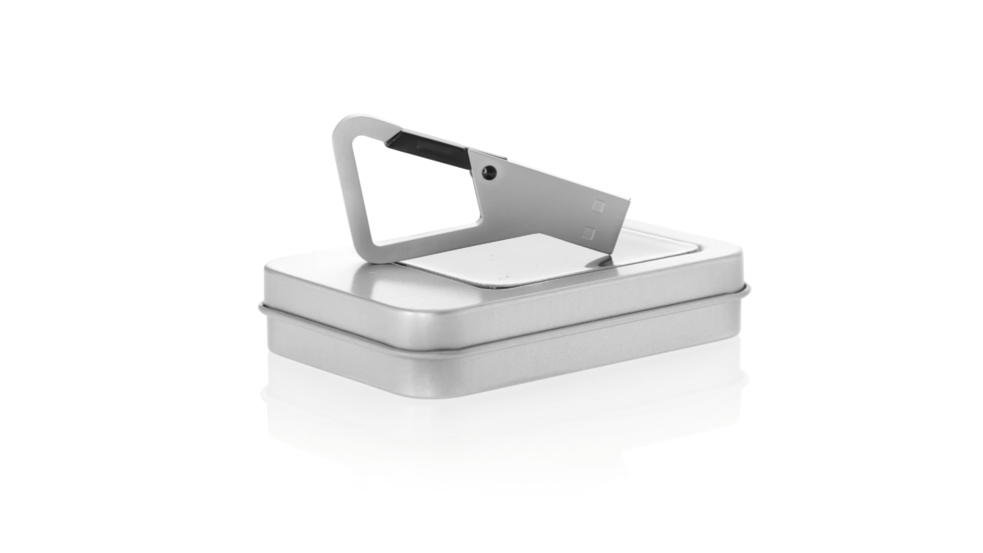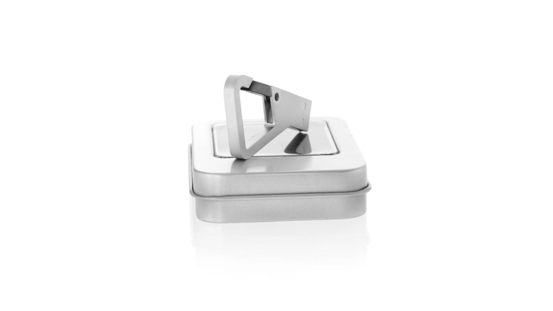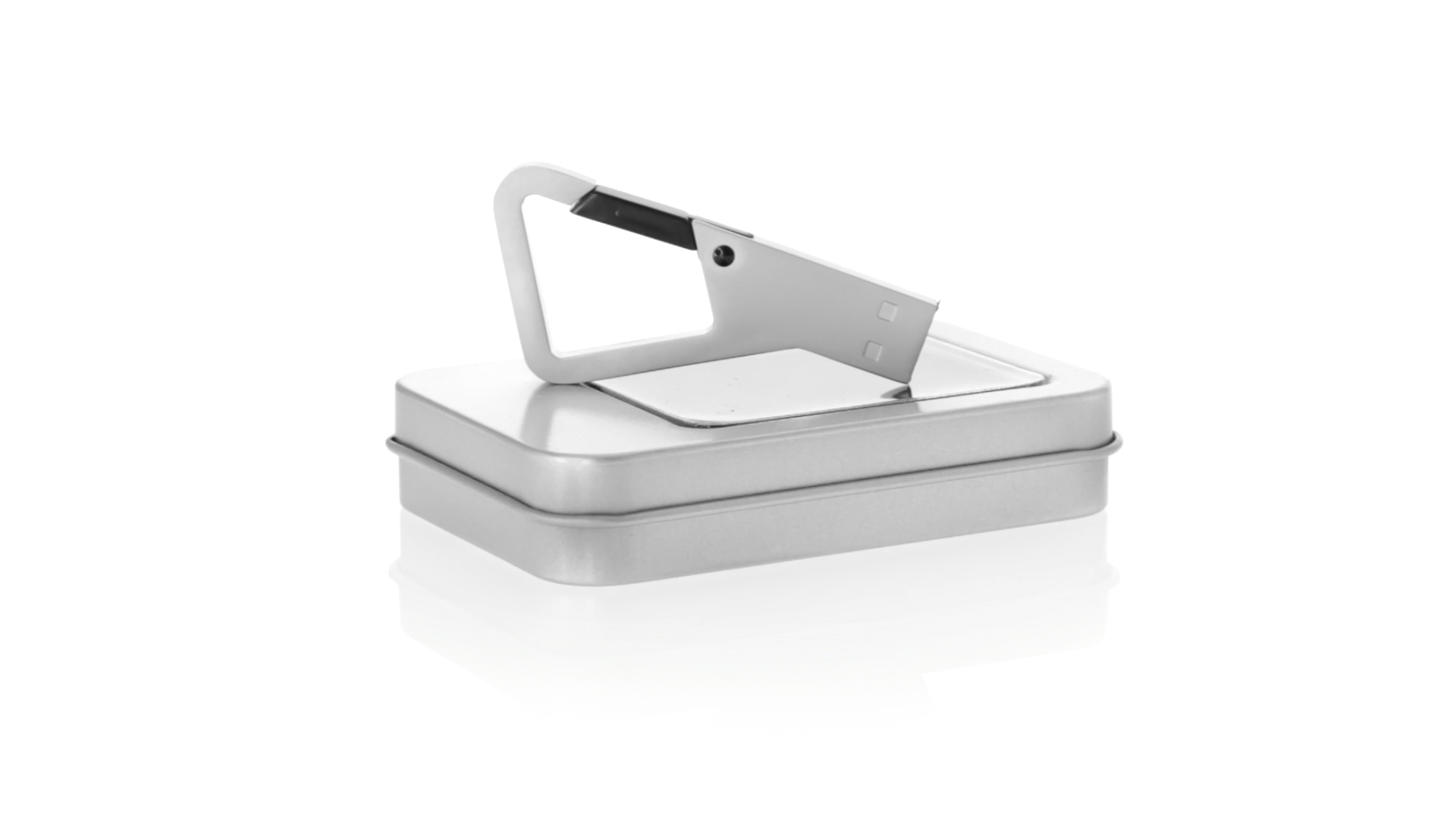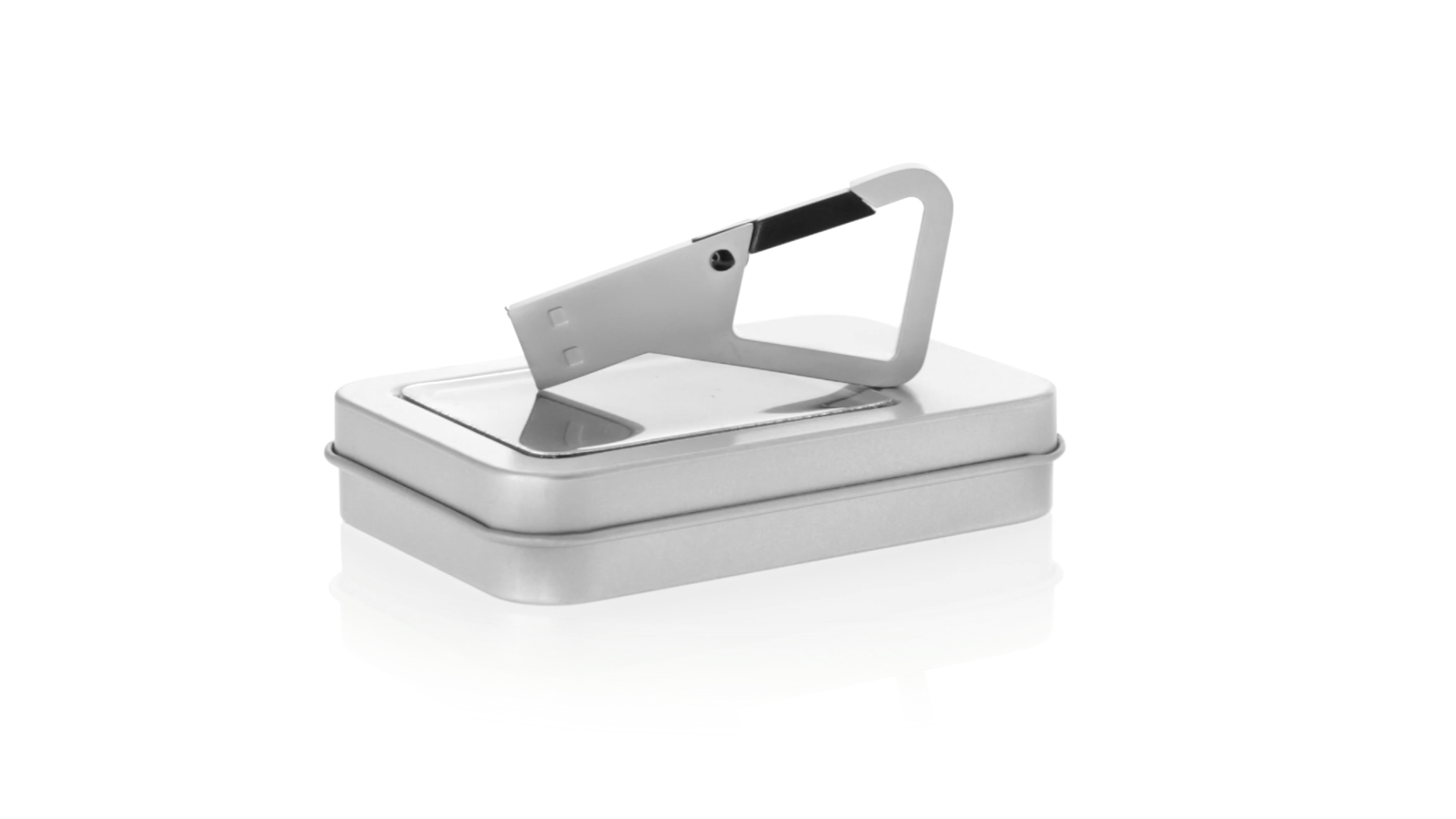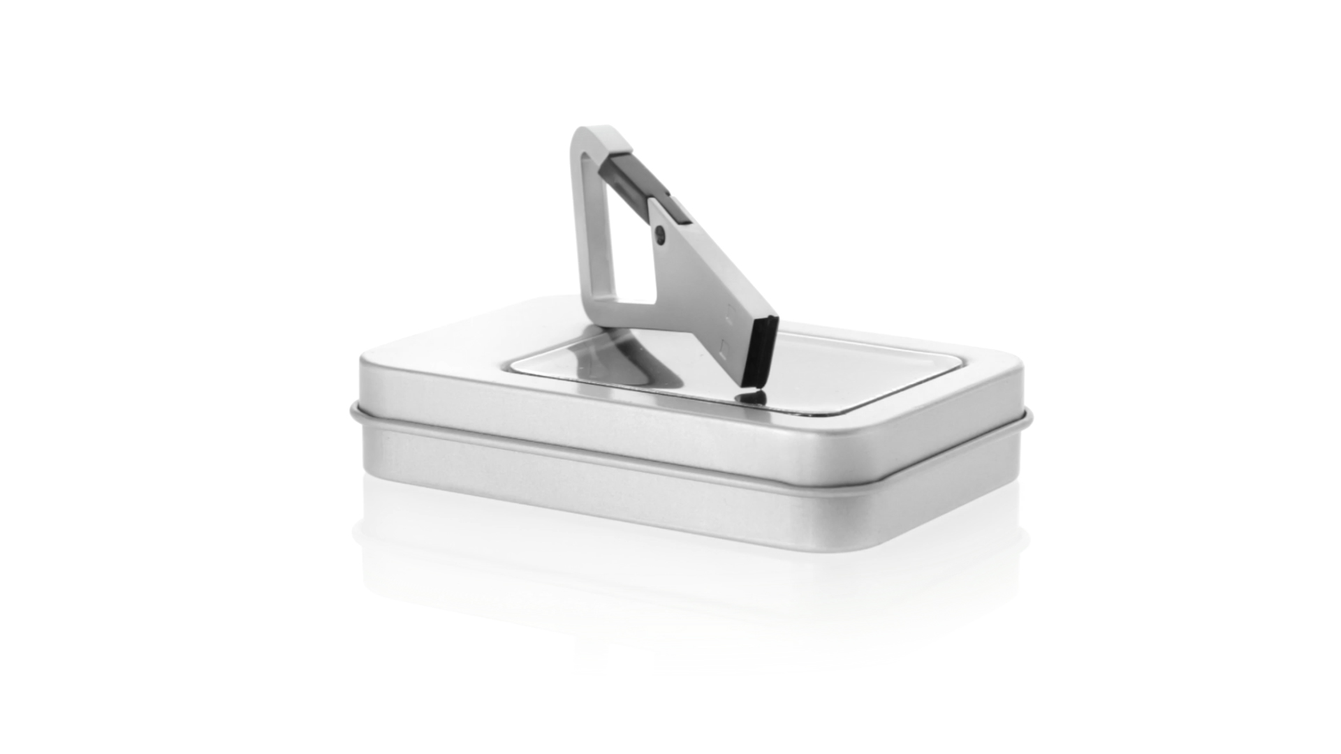 USB-Stick mit 8 GB Speicherkapazität aus Metall. Mit originellem Karabiner-Design mit Verschluss in einer Vielzahl von Farben. Präsentiert in einer individuellen Metallbox mit Fenster und weichem, gestanztem Schaumstoff im Inneren.