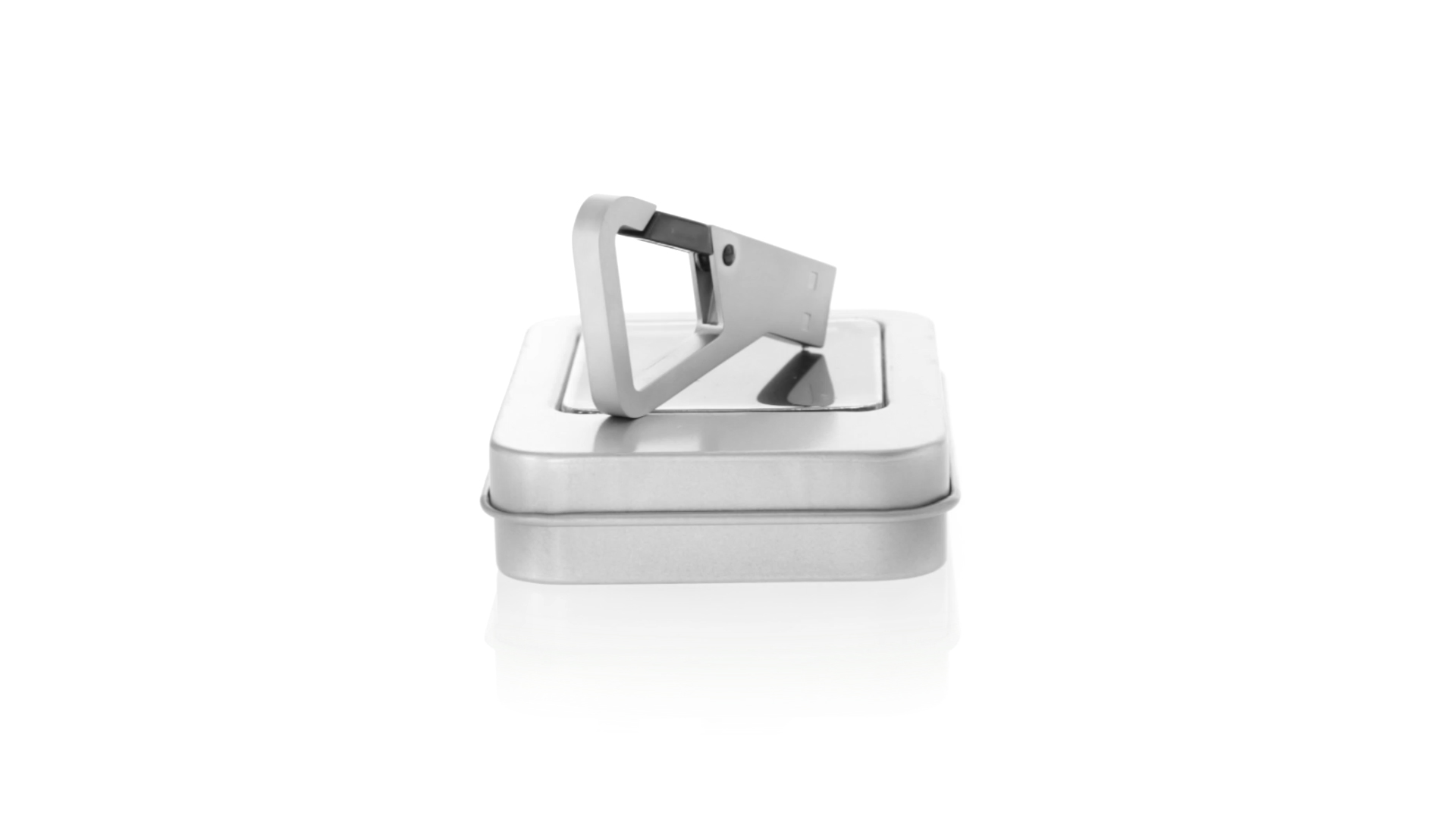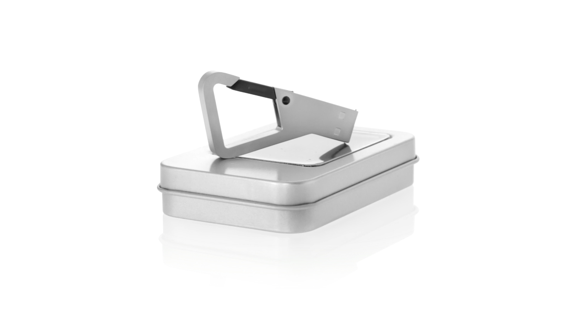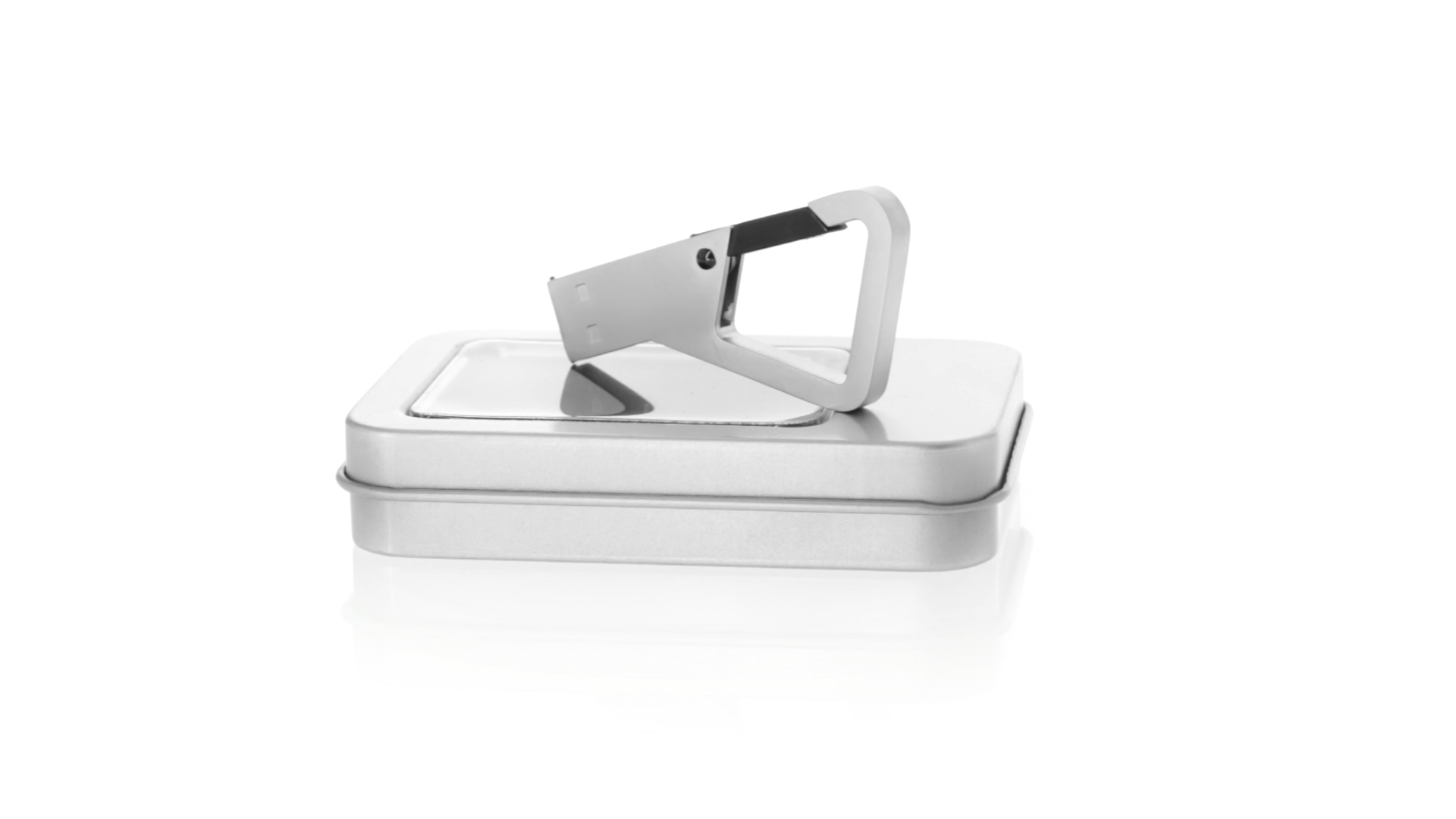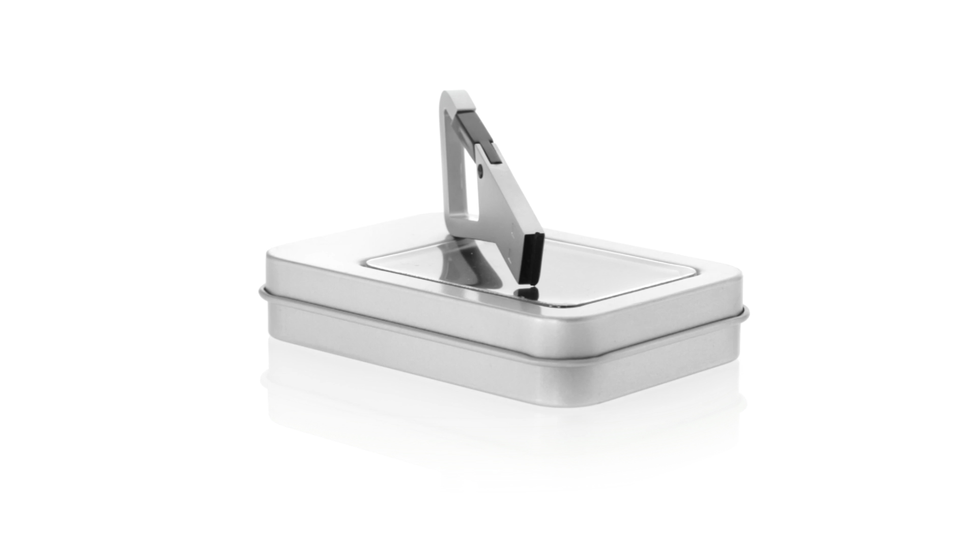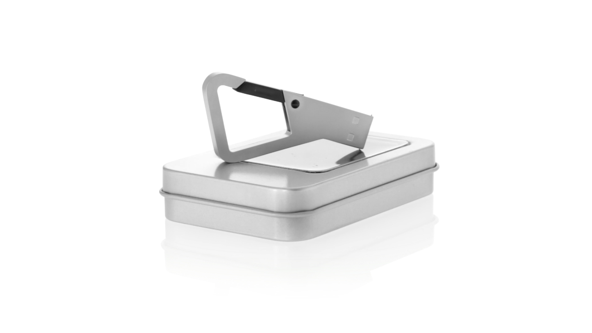 USB-Stick mit 8 GB Speicherkapazität aus Metall. Mit originellem Karabiner-Design mit Verschluss in einer Vielzahl von Farben. Präsentiert in einer individuellen Metallbox mit Fenster und weichem, gestanztem Schaumstoff im Inneren.