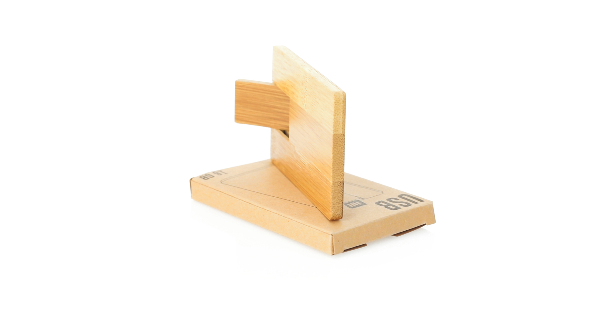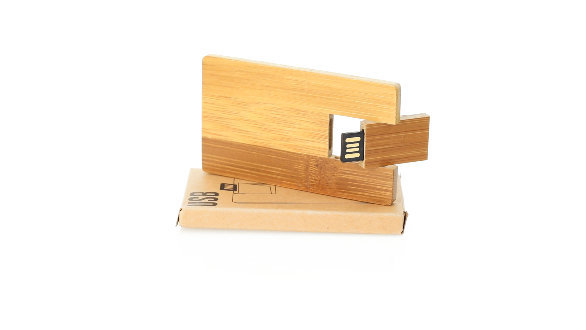 16-GB-USB-Karten-Flash-Laufwerk in Naturausführung. Flaches Design, hergestellt aus natürlich geschnittenen Bambusstücken. Zusammenklappbar und in einer attraktiven, individuellen Ökodesign-Box präsentiert.