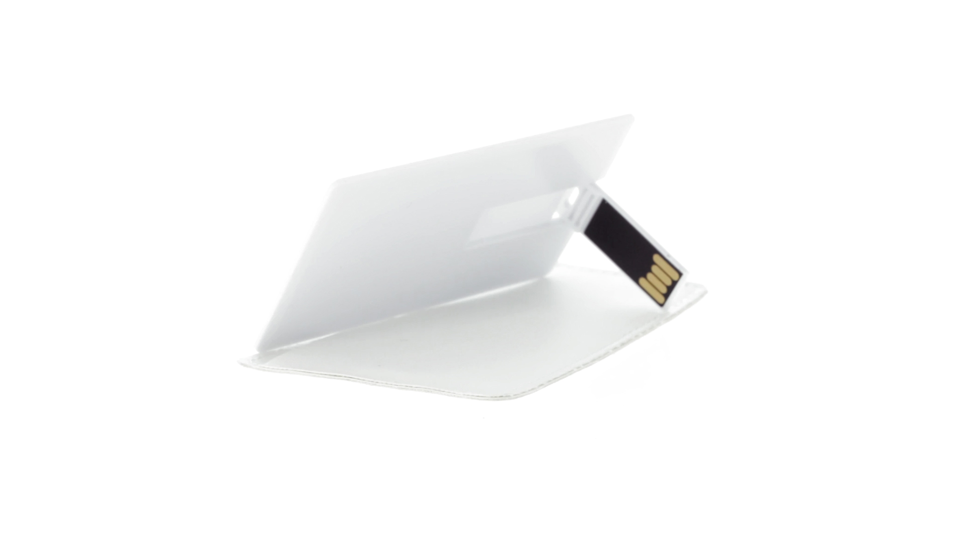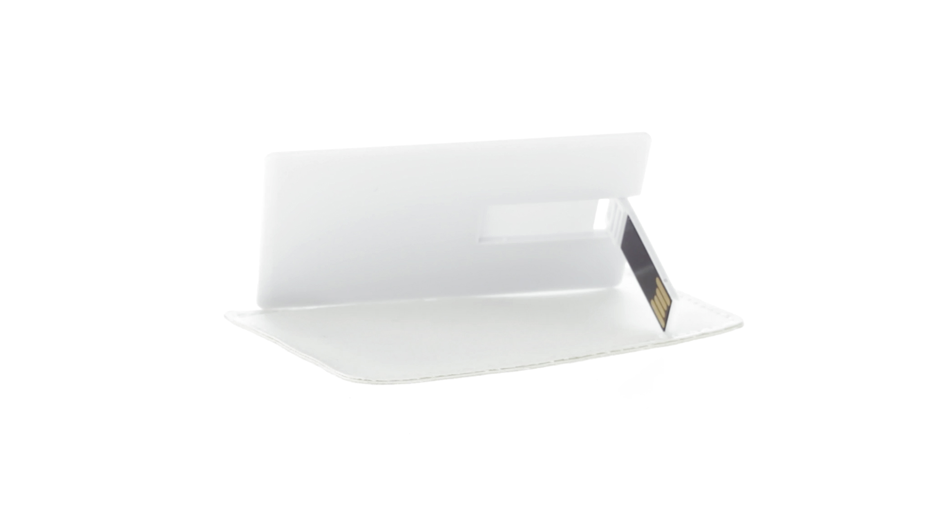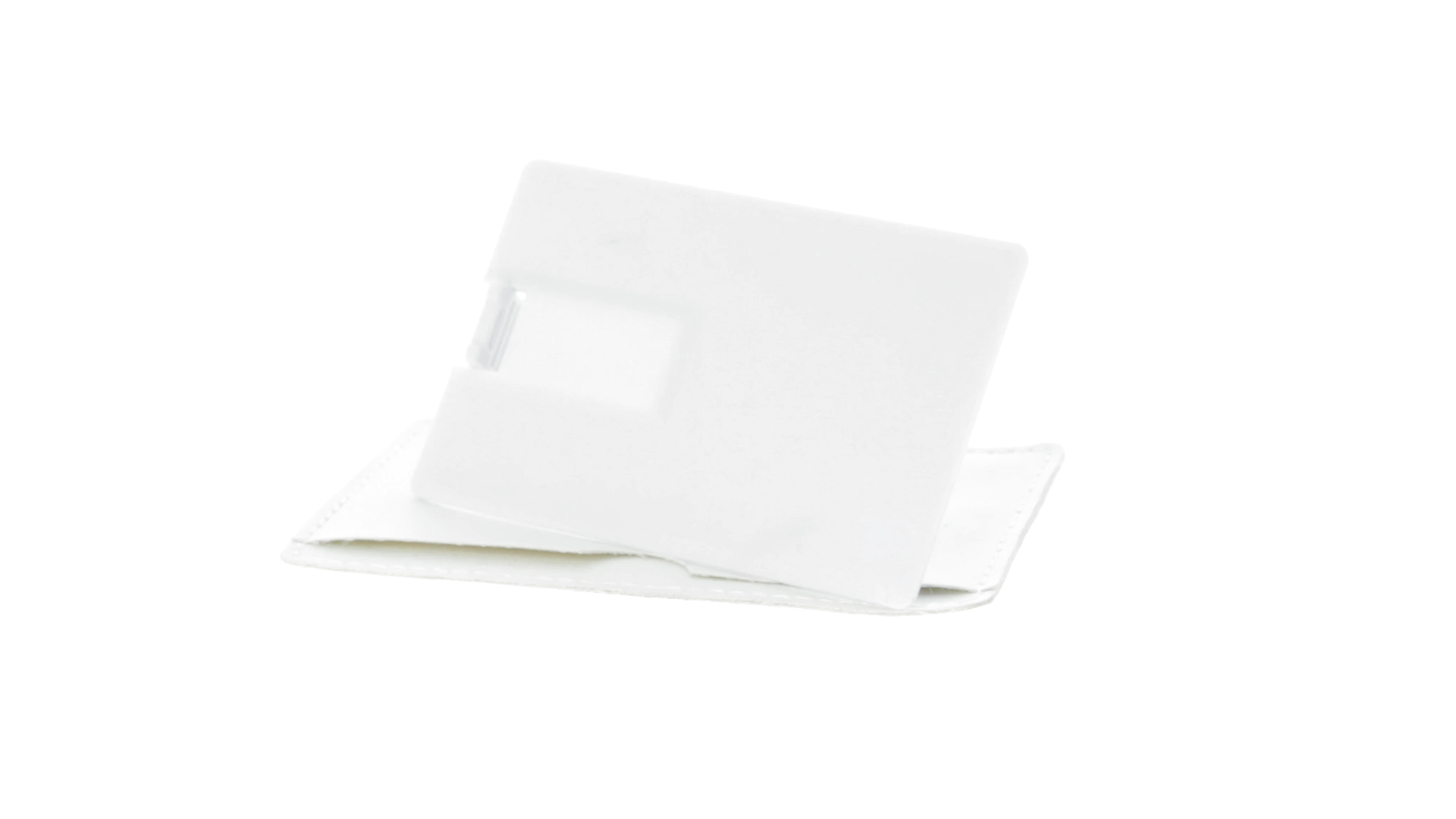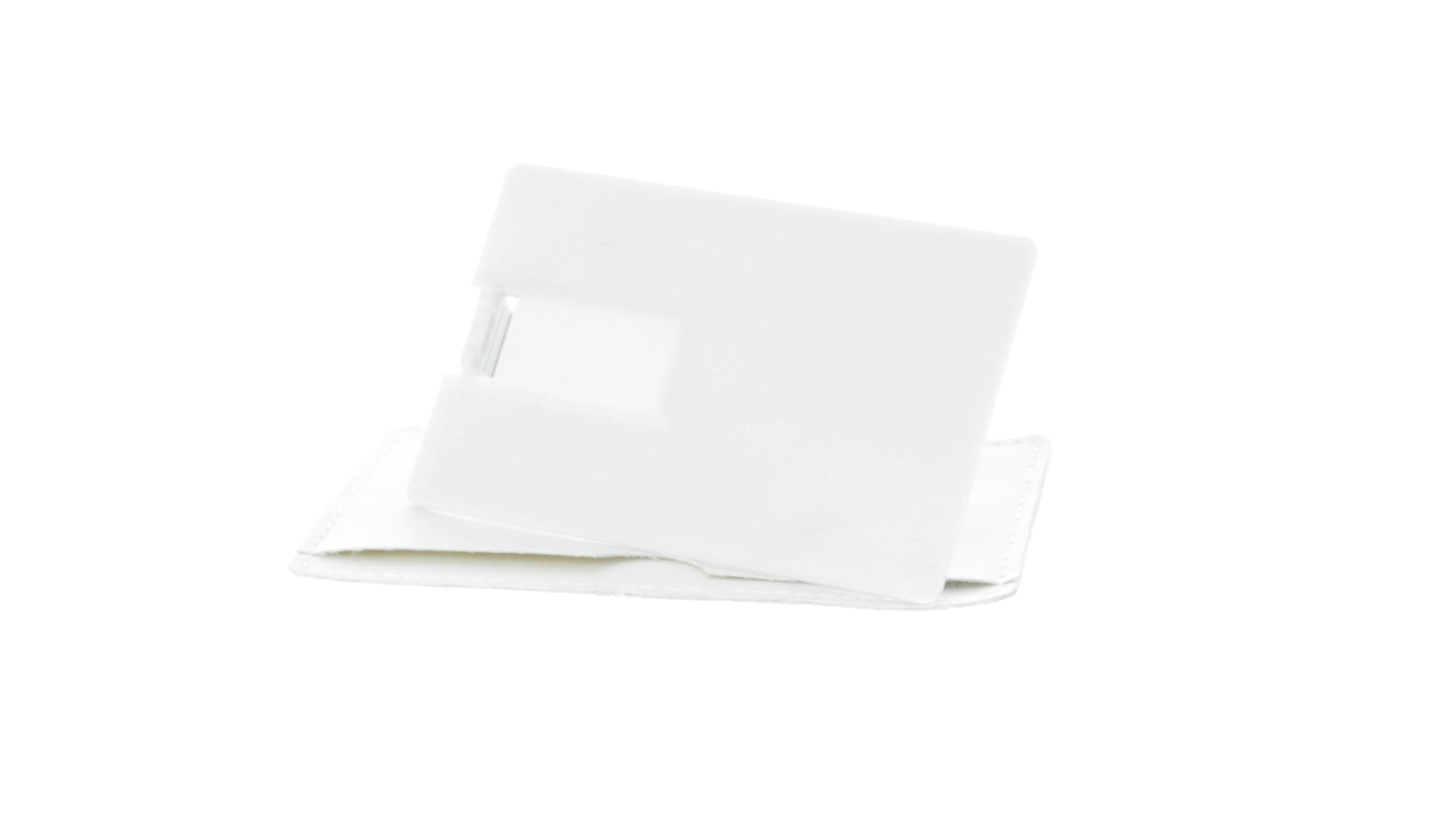 USB-Speicher mit 16 GB Kapazität in Kartenform. Mit ultra flachem Design und Klappmechanismus. Speziell für den digitalen Vollfarbdruck entworfen. Präsentiert in einem eleganten Kunstleder-Etui in Weiss.