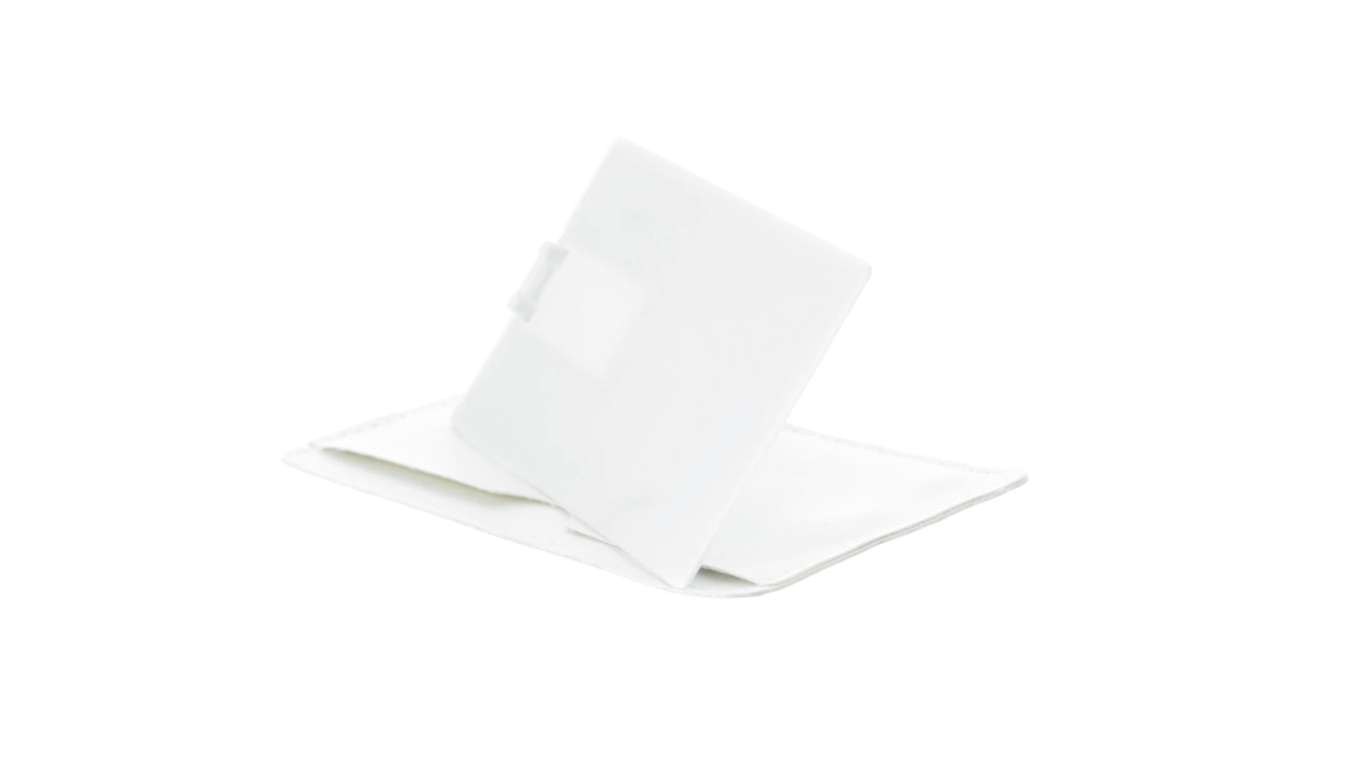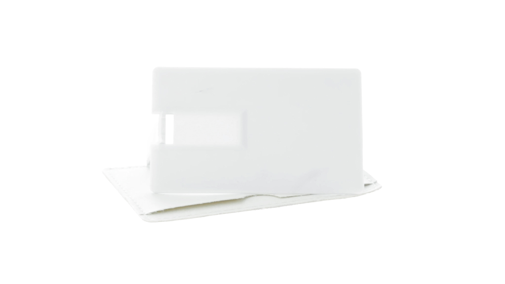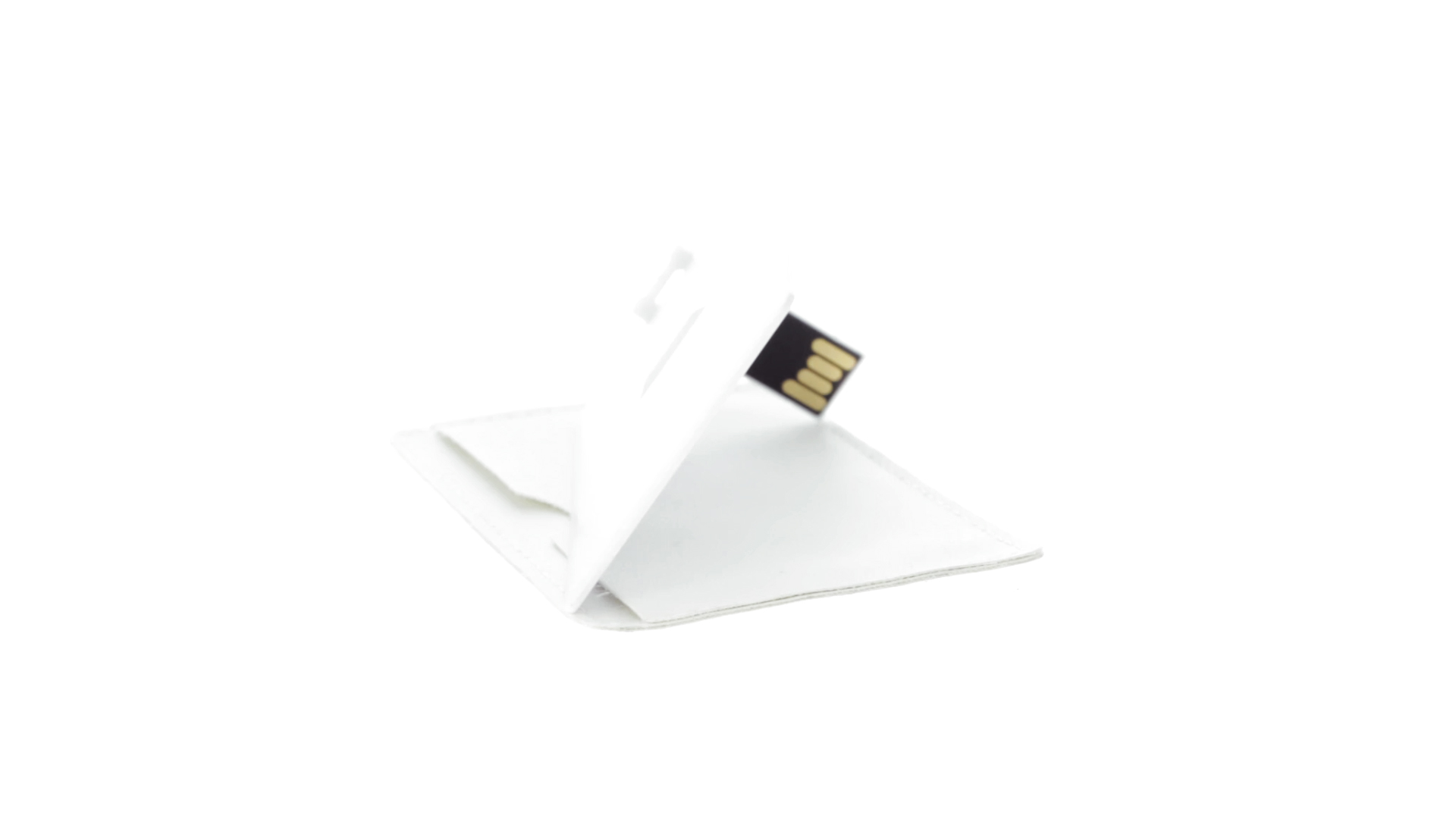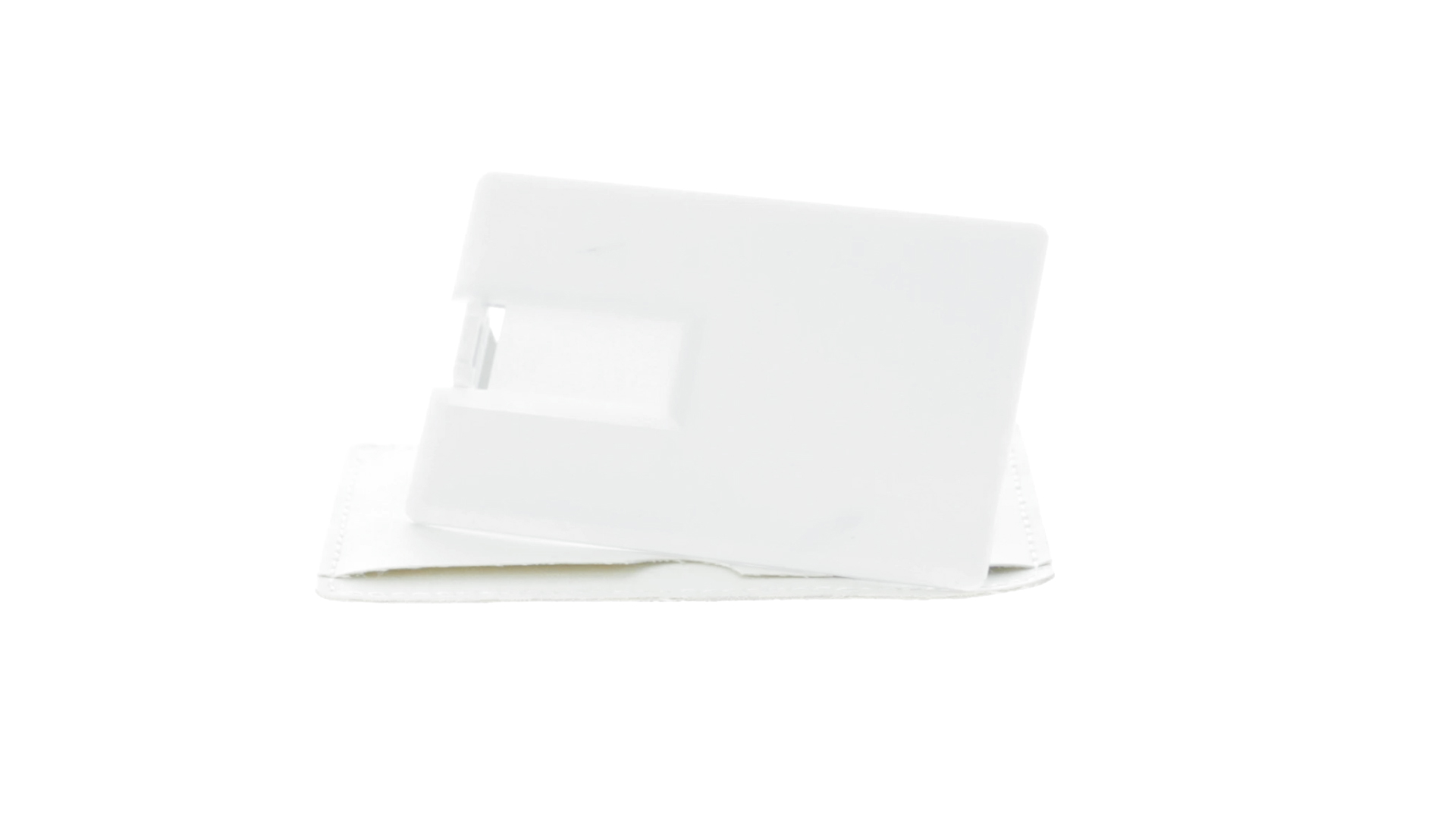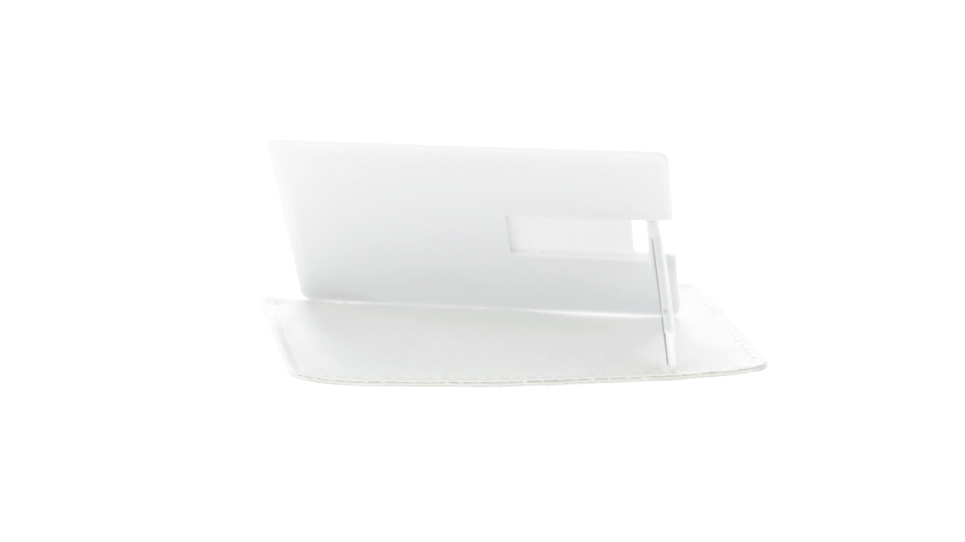USB-Speicher mit 16 GB Kapazität in Kartenform. Mit ultra flachem Design und Klappmechanismus. Speziell für den digitalen Vollfarbdruck entworfen. Präsentiert in einem eleganten Kunstleder-Etui in Weiss.