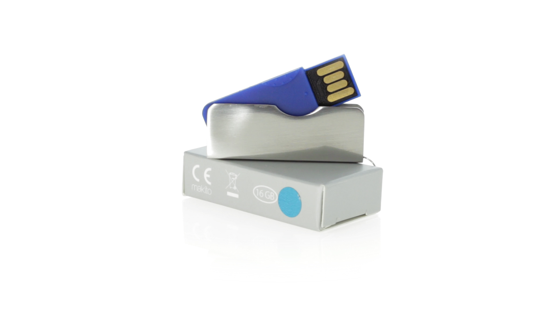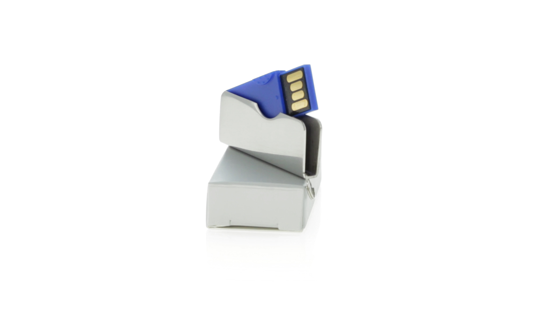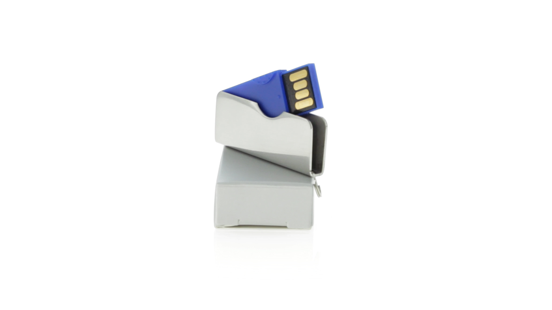 USB-Stick mit 16 GB Speicherkapazität und originellem minimalistischem Design und Drehmechanimus. Metallclip und -körper in verschiedenen Farben. Mit Schlüsselring. Präsentiert in einer individuellen Box.