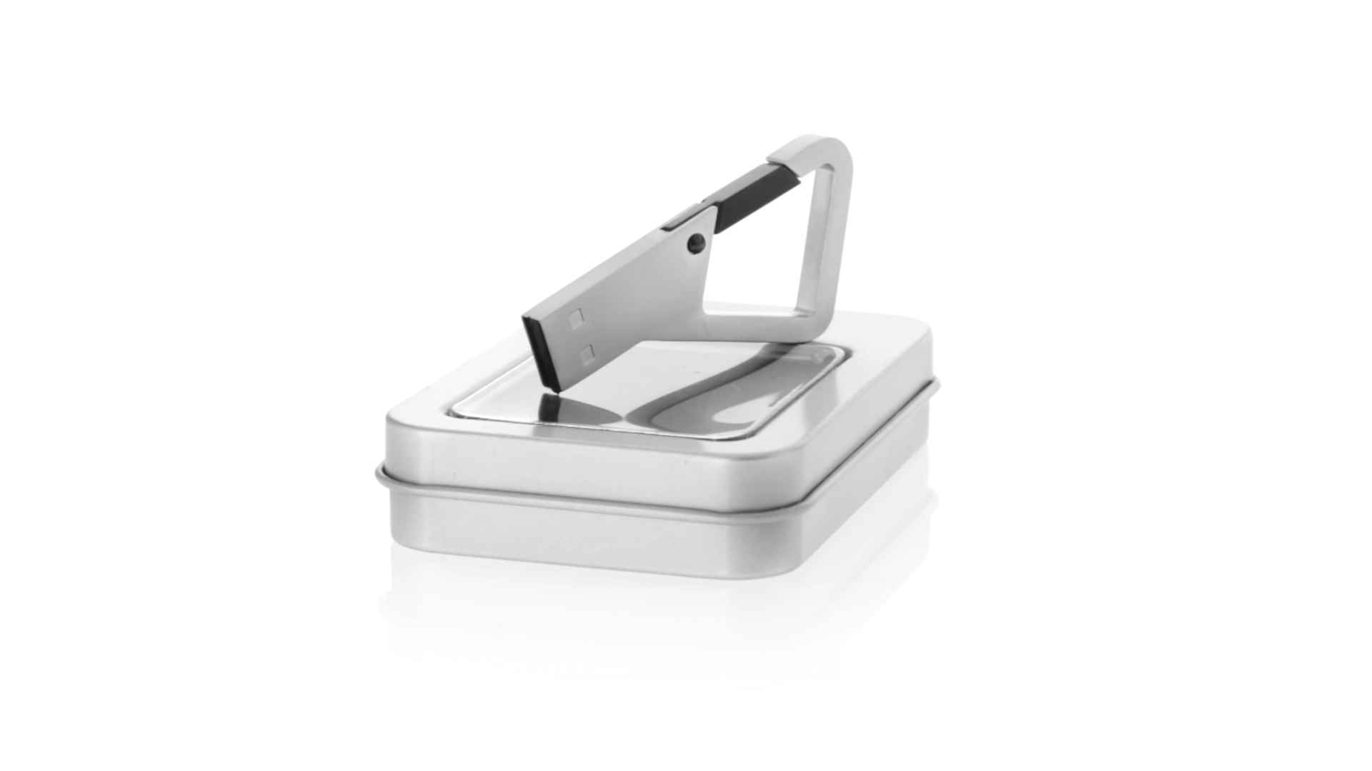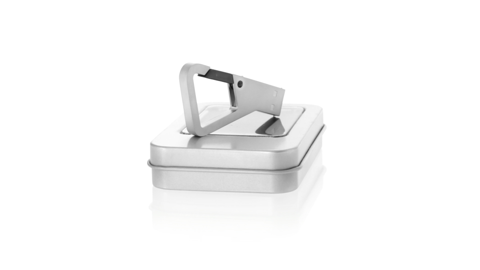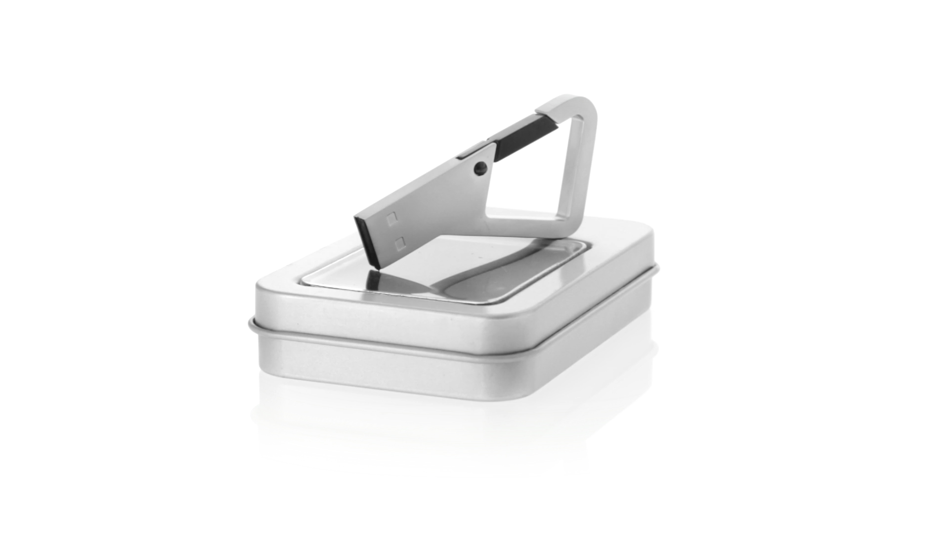 USB-Stick mit 8 GB Speicherkapazität aus Metall. Mit originellem Karabiner-Design mit Verschluss in einer Vielzahl von Farben. Präsentiert in einer individuellen Metallbox mit Fenster und weichem, gestanztem Schaumstoff im Inneren.
