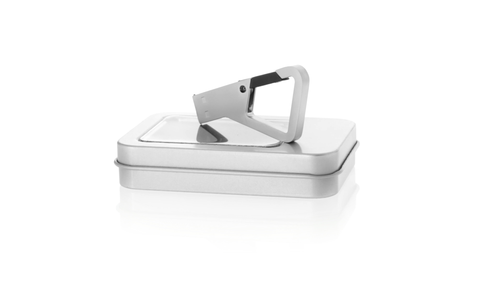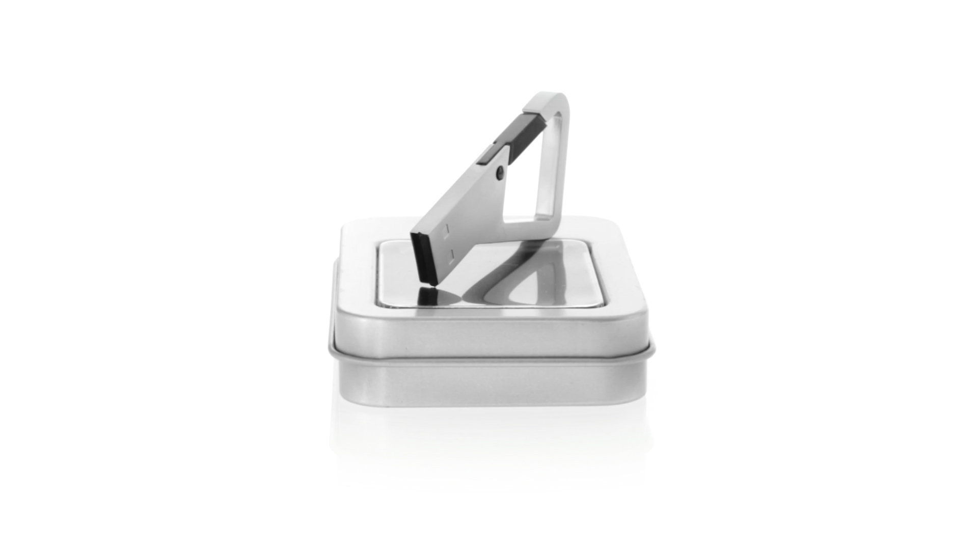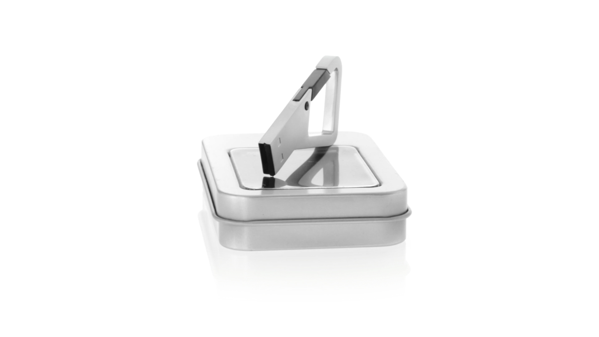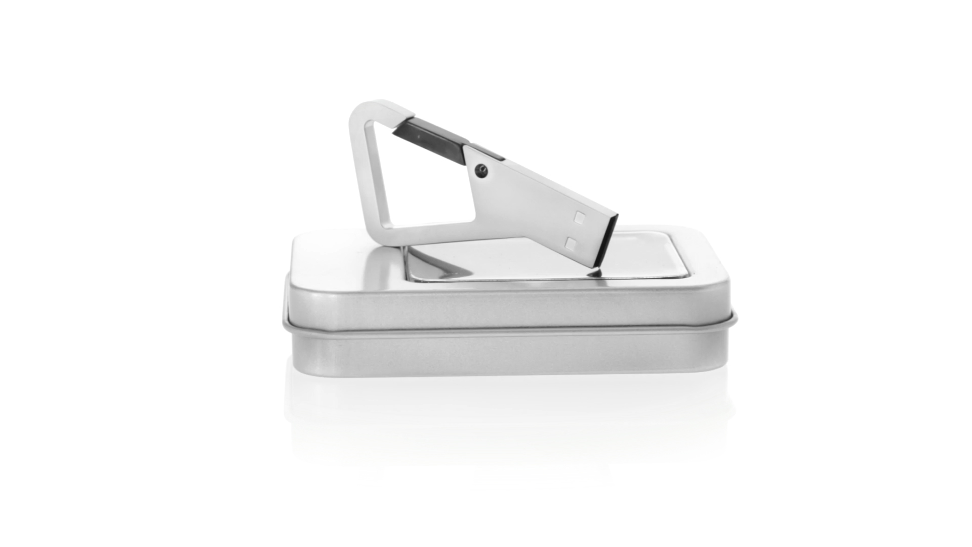 USB-Stick mit 8 GB Speicherkapazität aus Metall. Mit originellem Karabiner-Design mit Verschluss in einer Vielzahl von Farben. Präsentiert in einer individuellen Metallbox mit Fenster und weichem, gestanztem Schaumstoff im Inneren.
