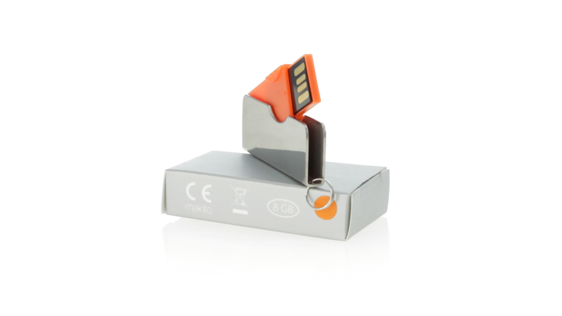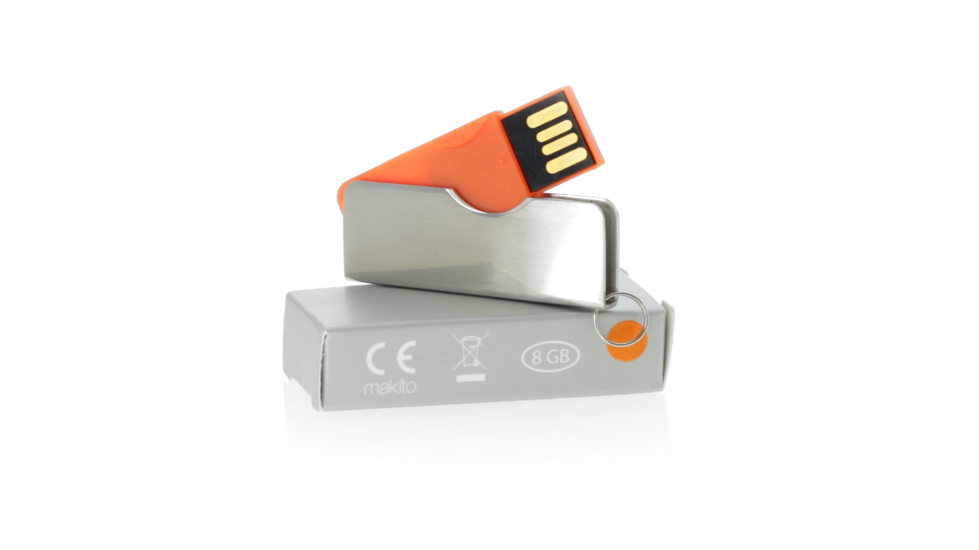 USB-Stick mit 8 GB Speicherkapazität und originellem minimalistischem Dreh-Design. Mit Metallclip und Gehäuse in verschiedenen Farben mit Schlüsselring. Präsentiert in einer individuellen Schachtel.