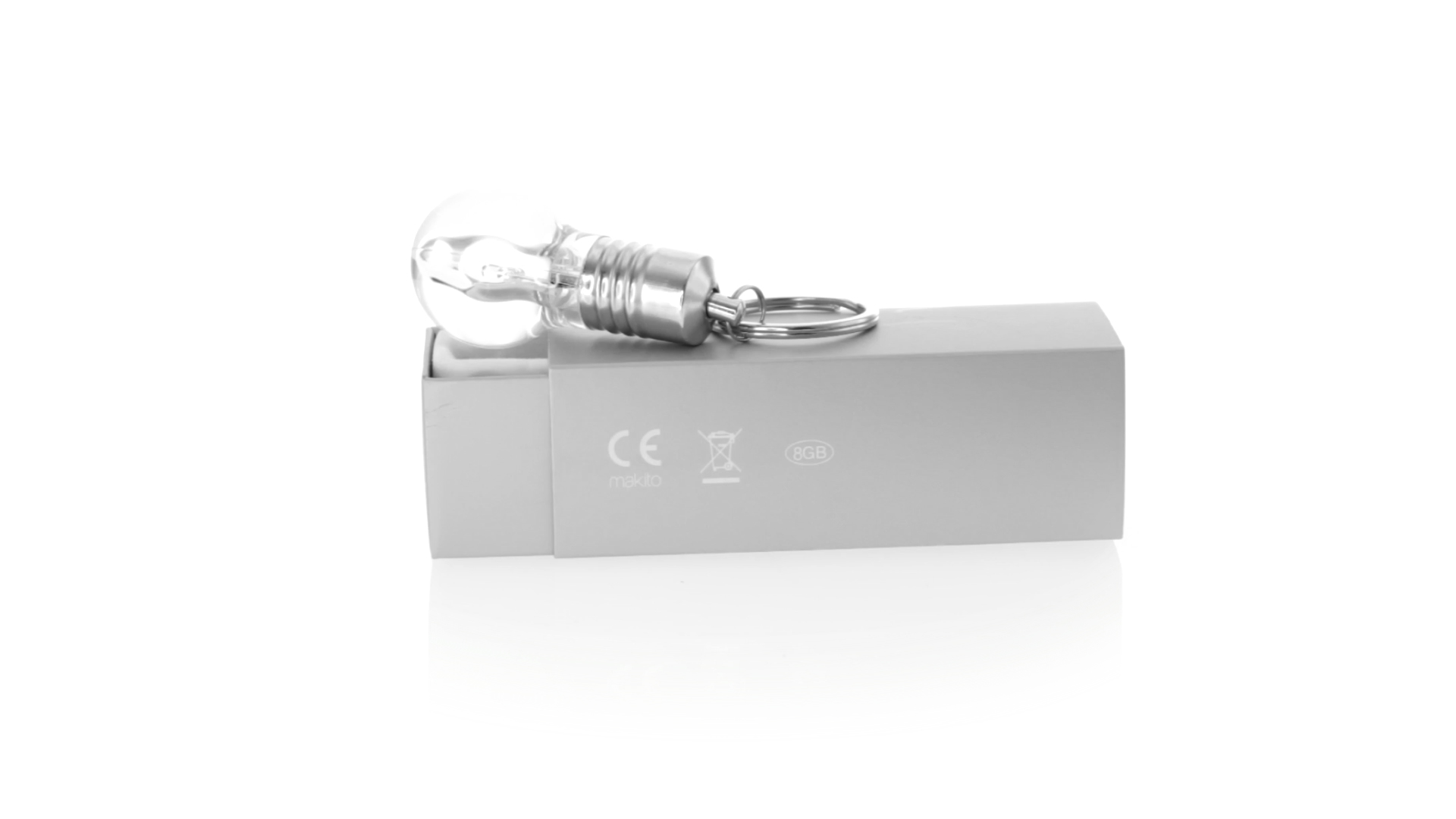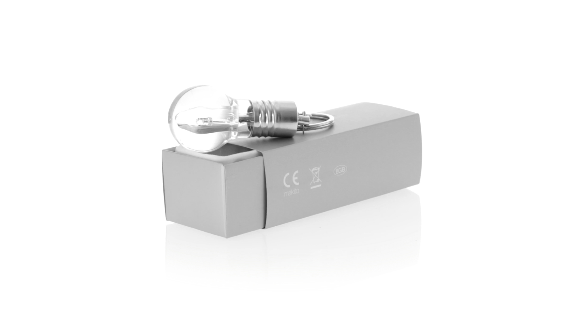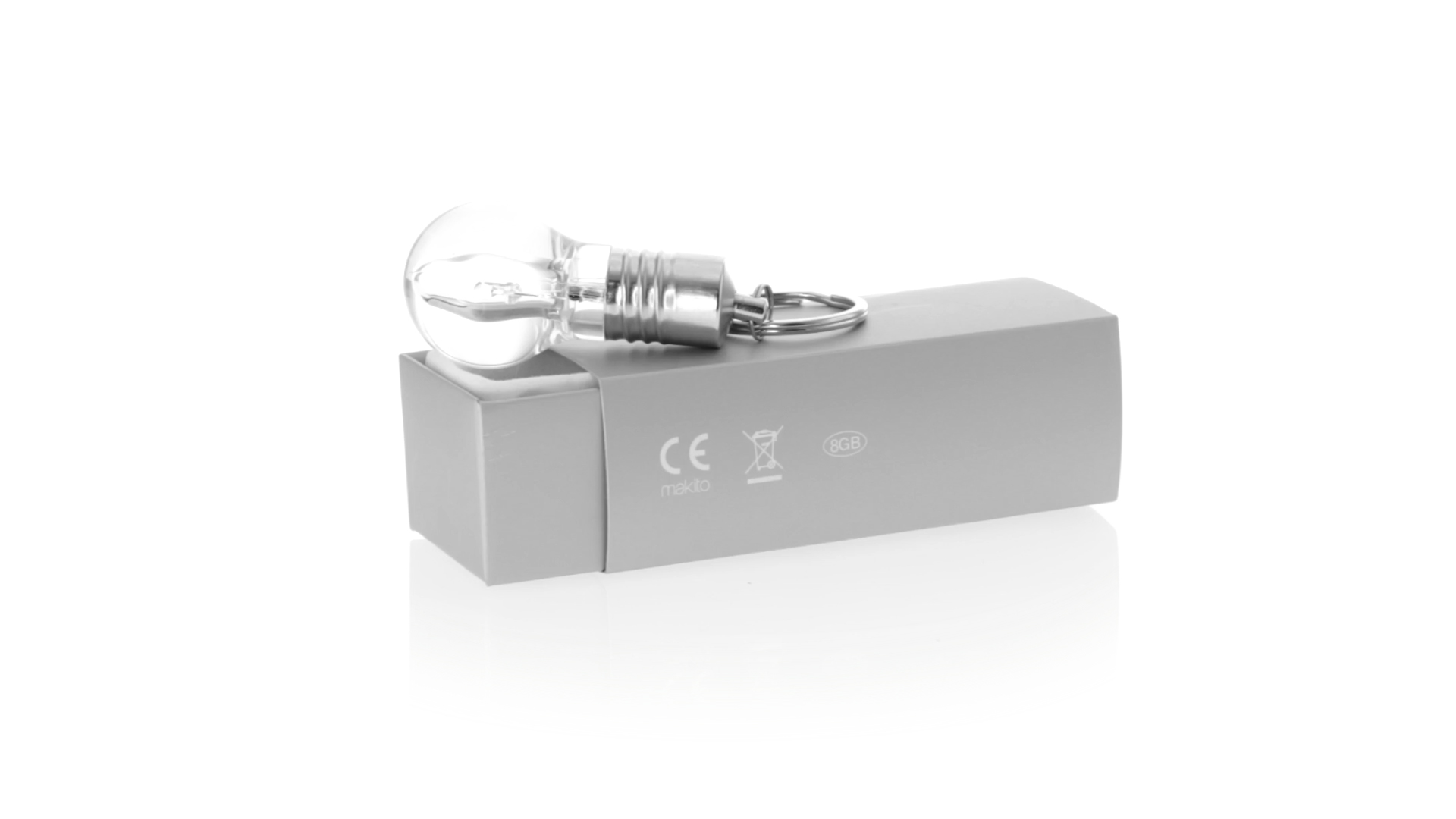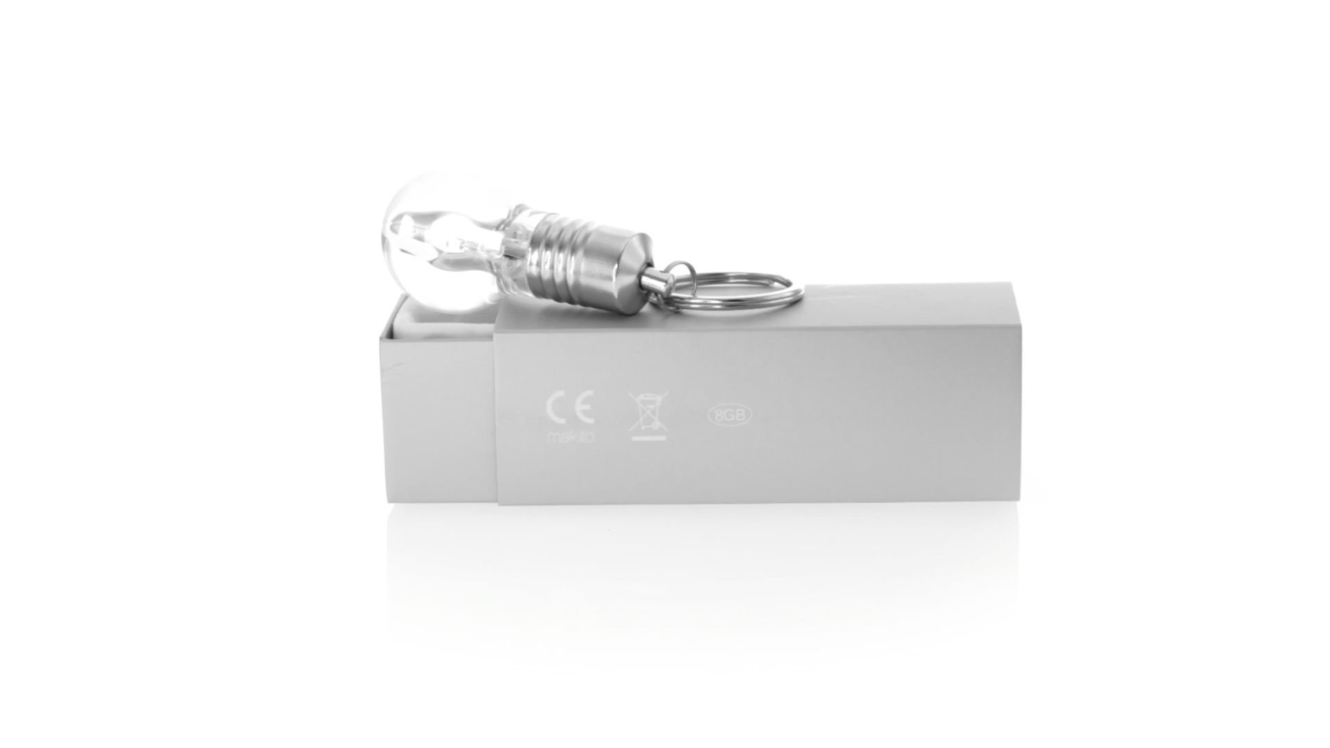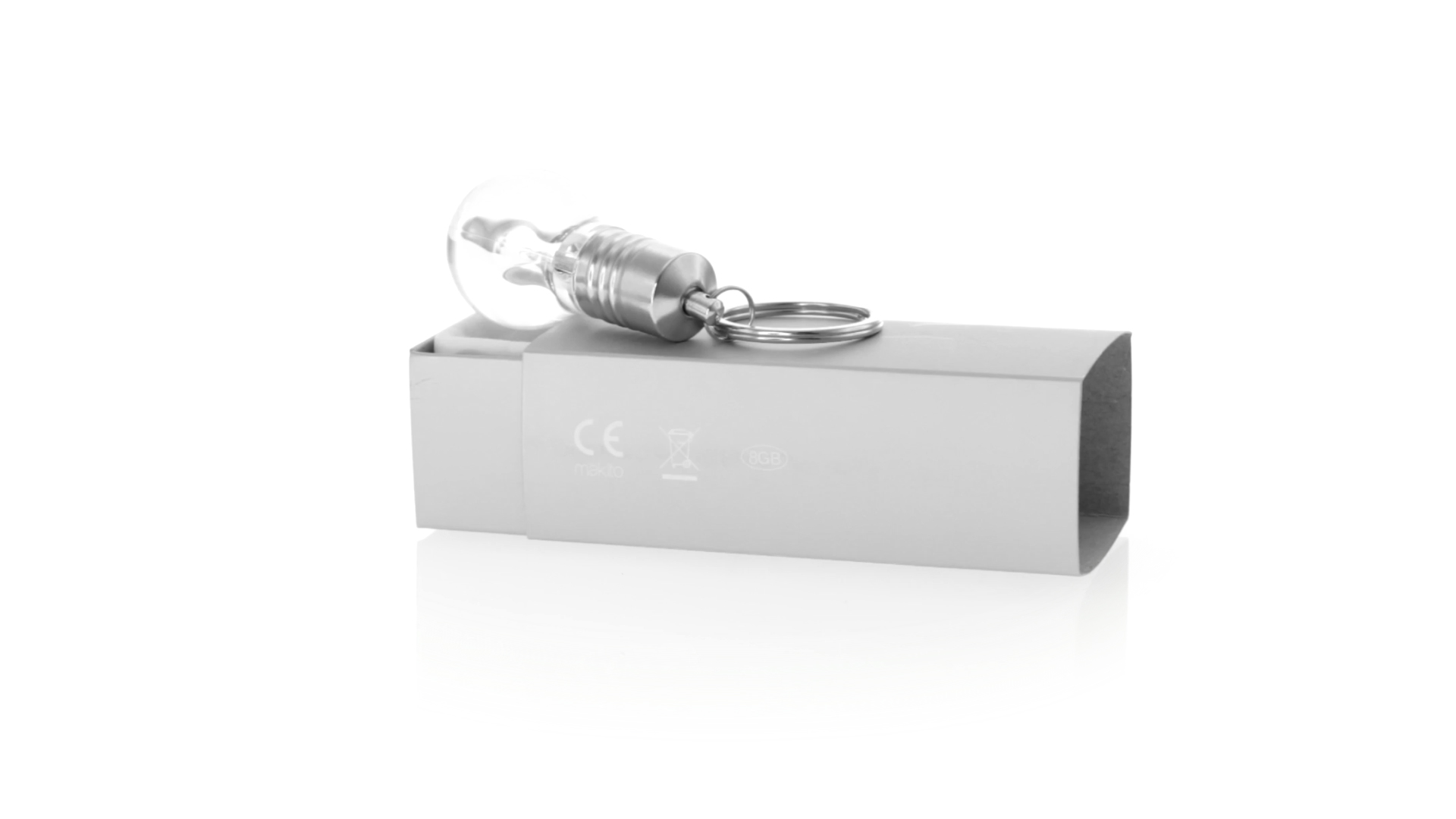 USB-Stick mit 8 GB Speicherkapazität und origineller Glühbirne, die bei Verbindung mit dem USB-Anschluss in Weiss leuchtet. Mit Schlüsselring. Präsentiert in einer individuellen Schachtel.