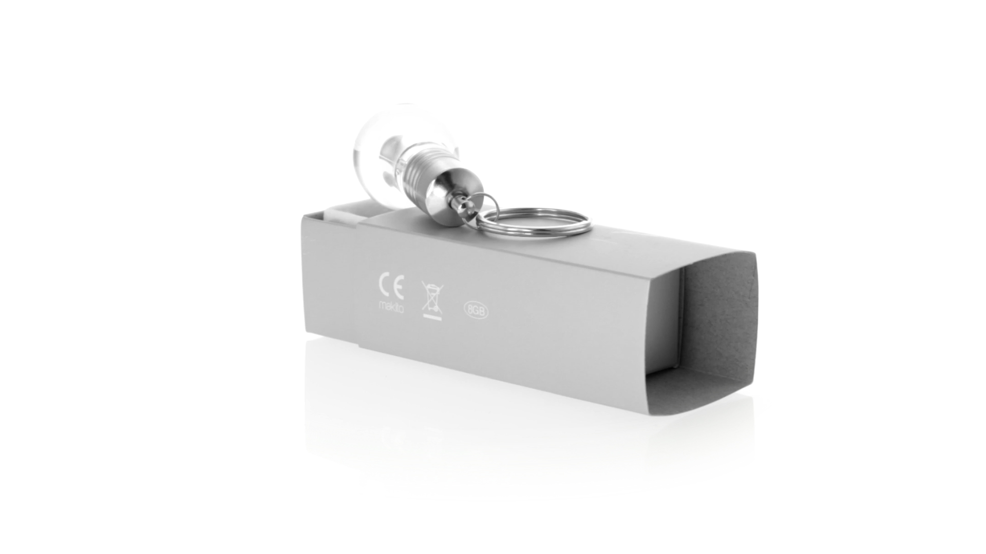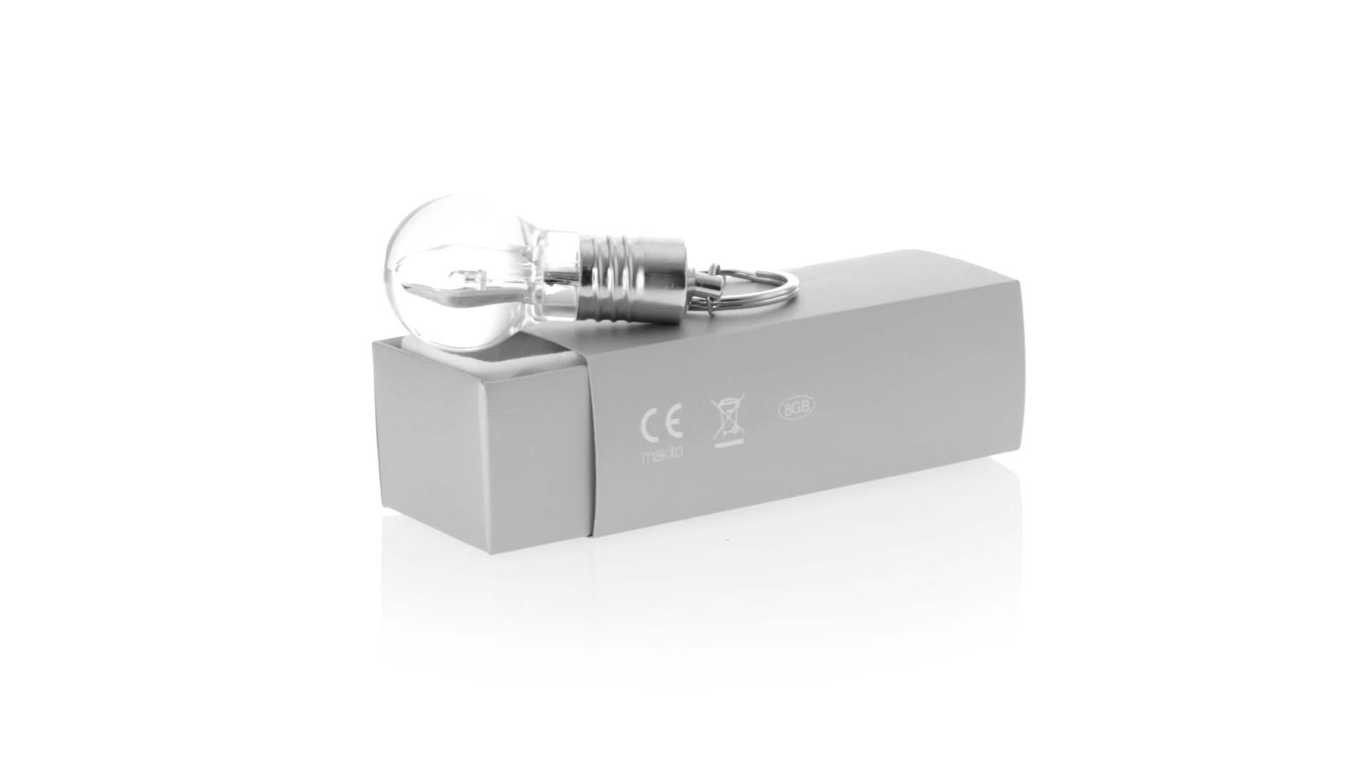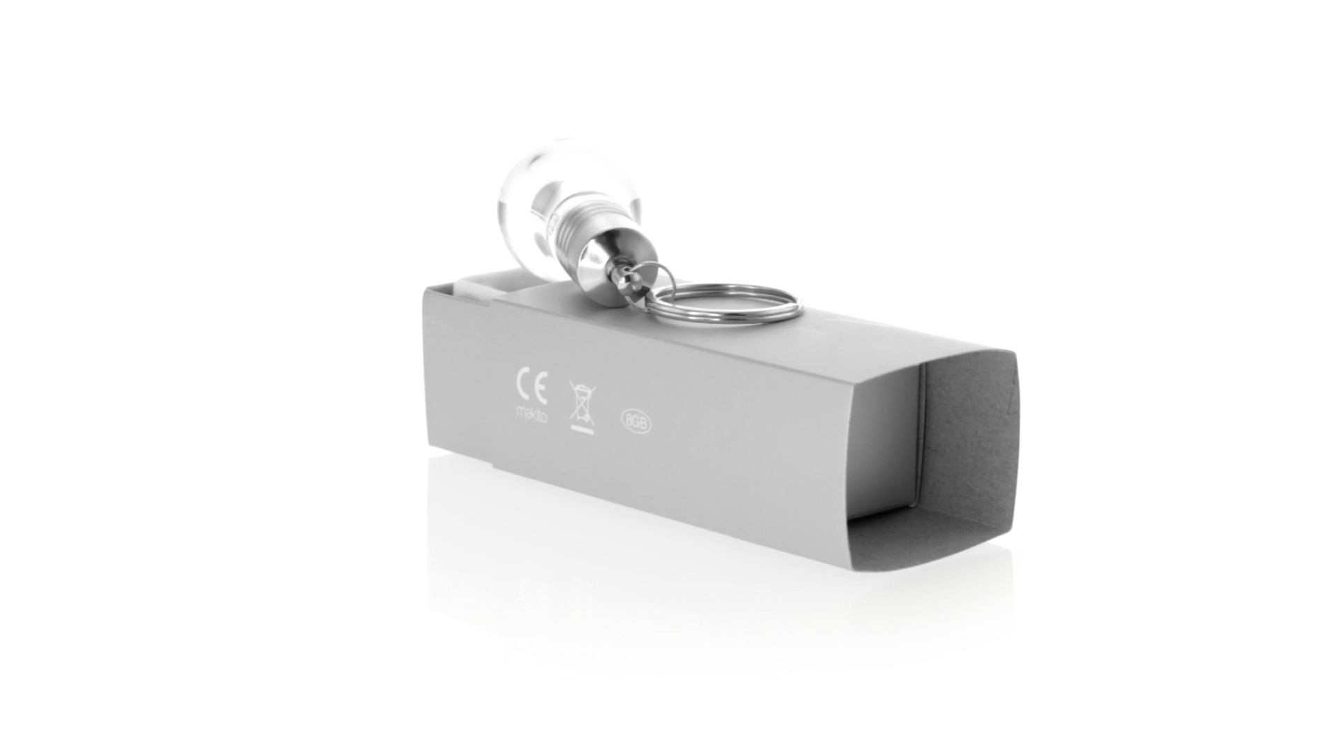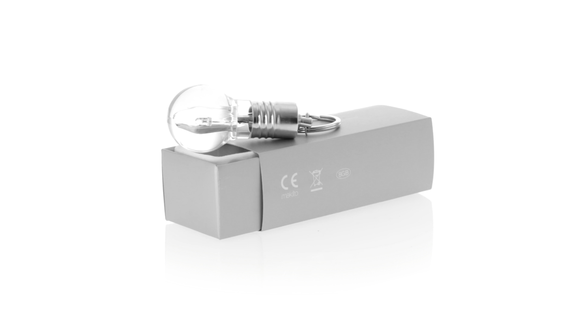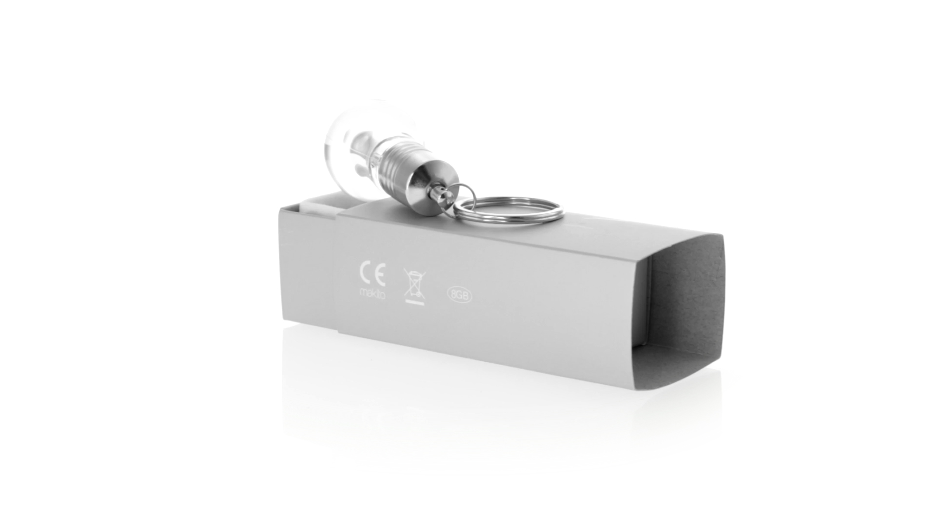 USB-Stick mit 8 GB Speicherkapazität und origineller Glühbirne, die bei Verbindung mit dem USB-Anschluss in Weiss leuchtet. Mit Schlüsselring. Präsentiert in einer individuellen Schachtel.