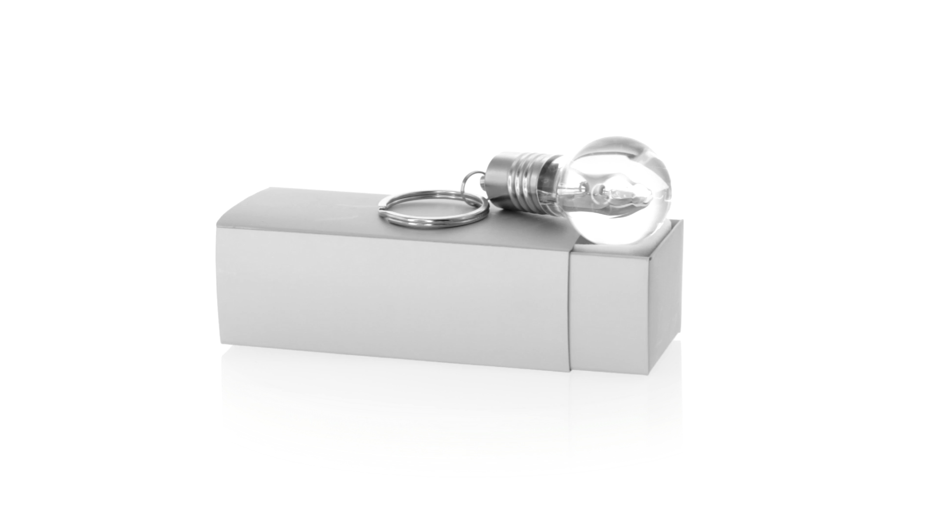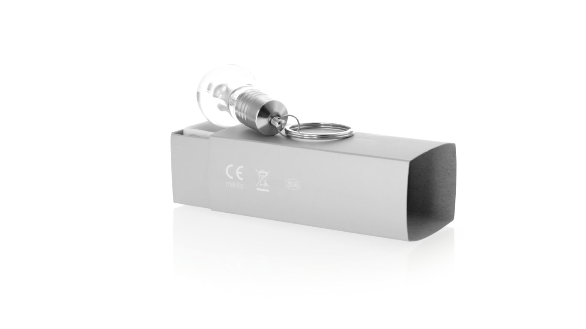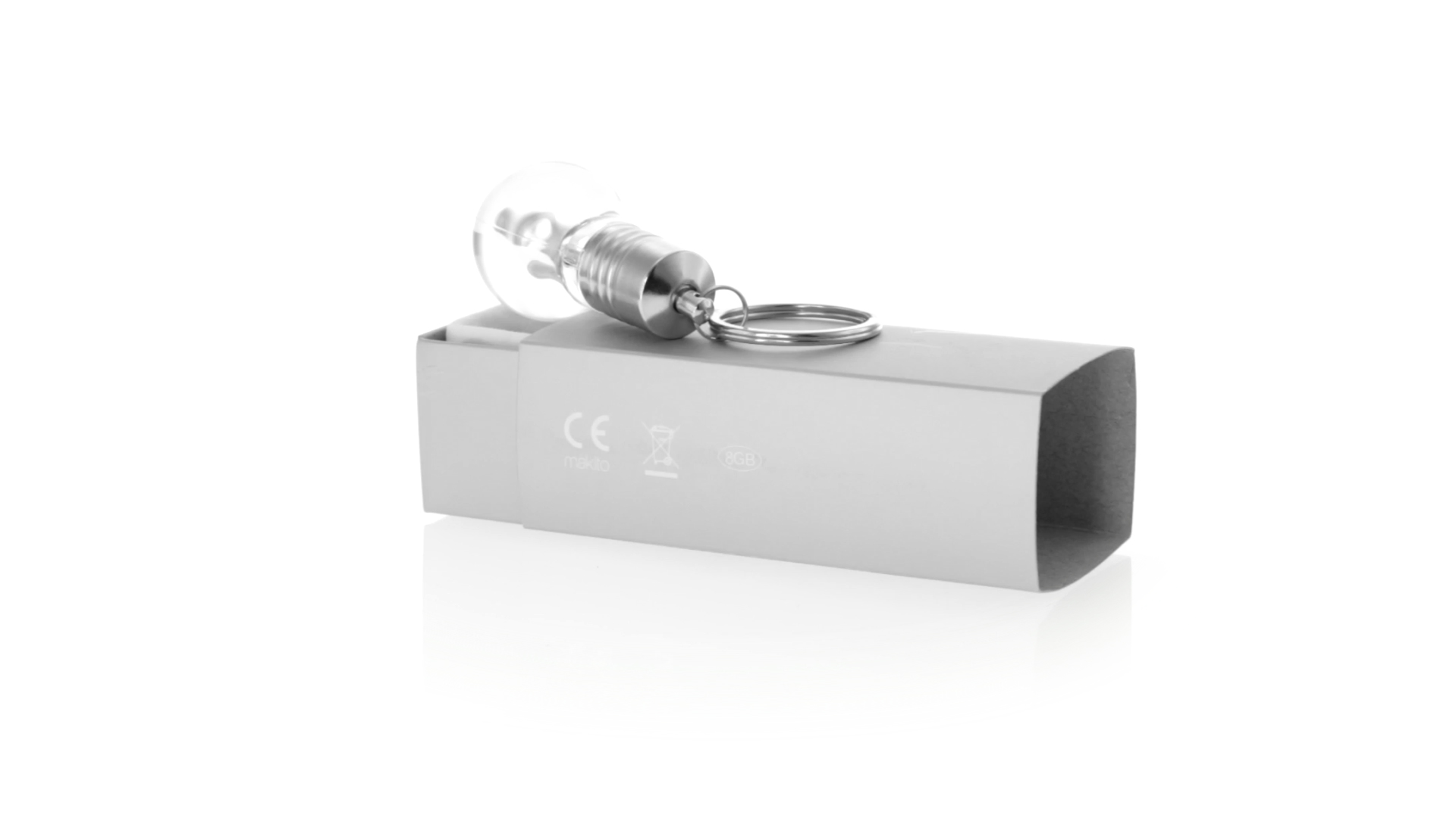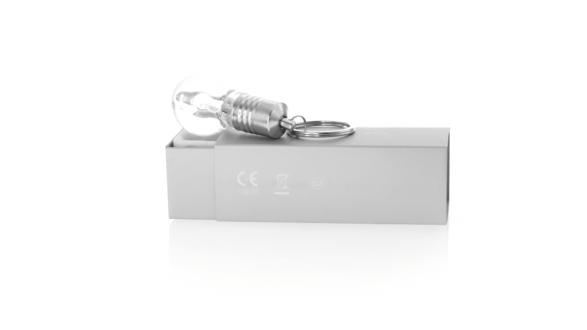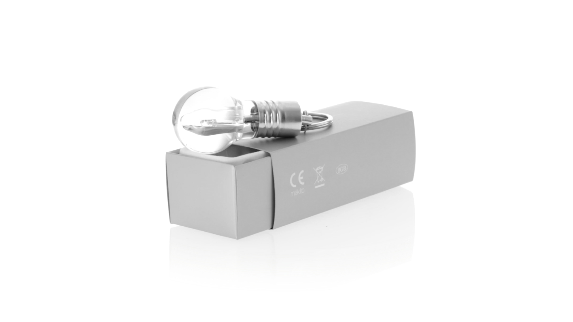 USB-Stick mit 8 GB Speicherkapazität und origineller Glühbirne, die bei Verbindung mit dem USB-Anschluss in Weiss leuchtet. Mit Schlüsselring. Präsentiert in einer individuellen Schachtel.
