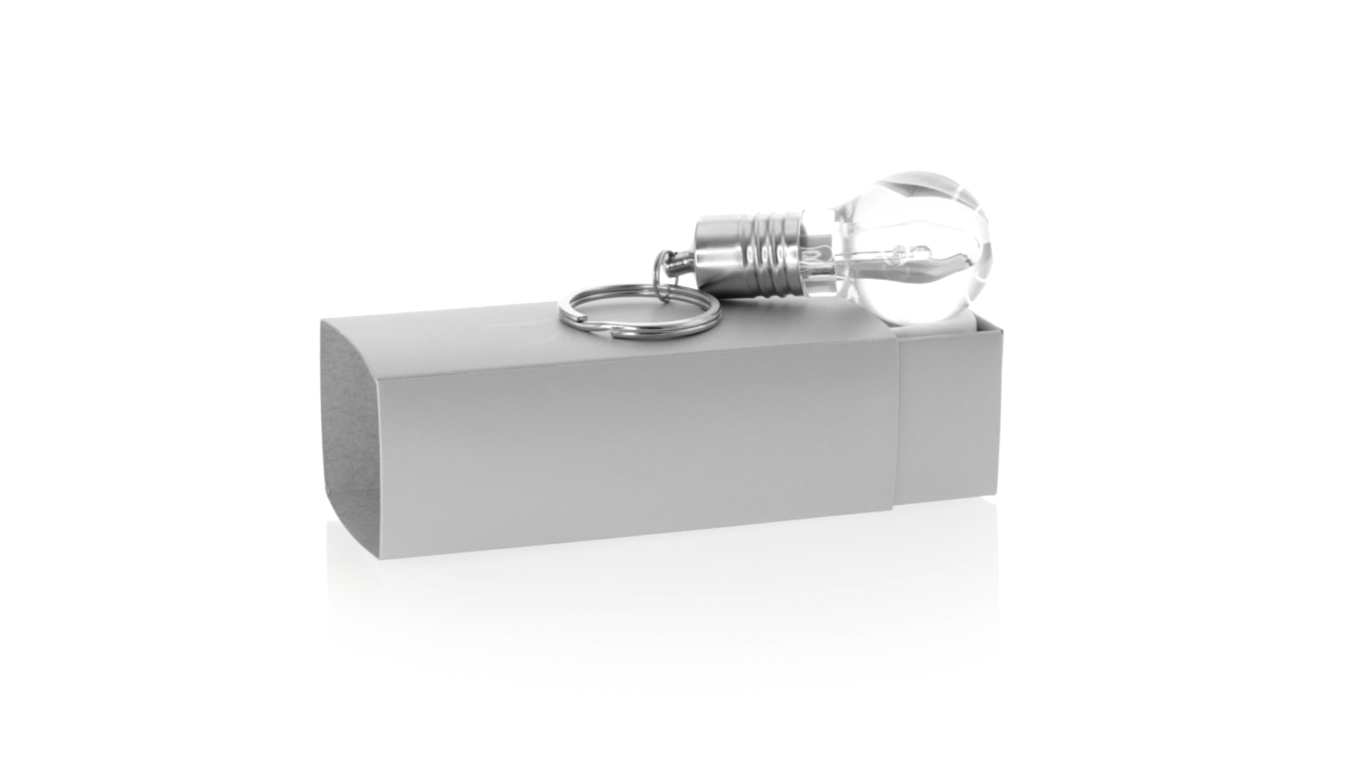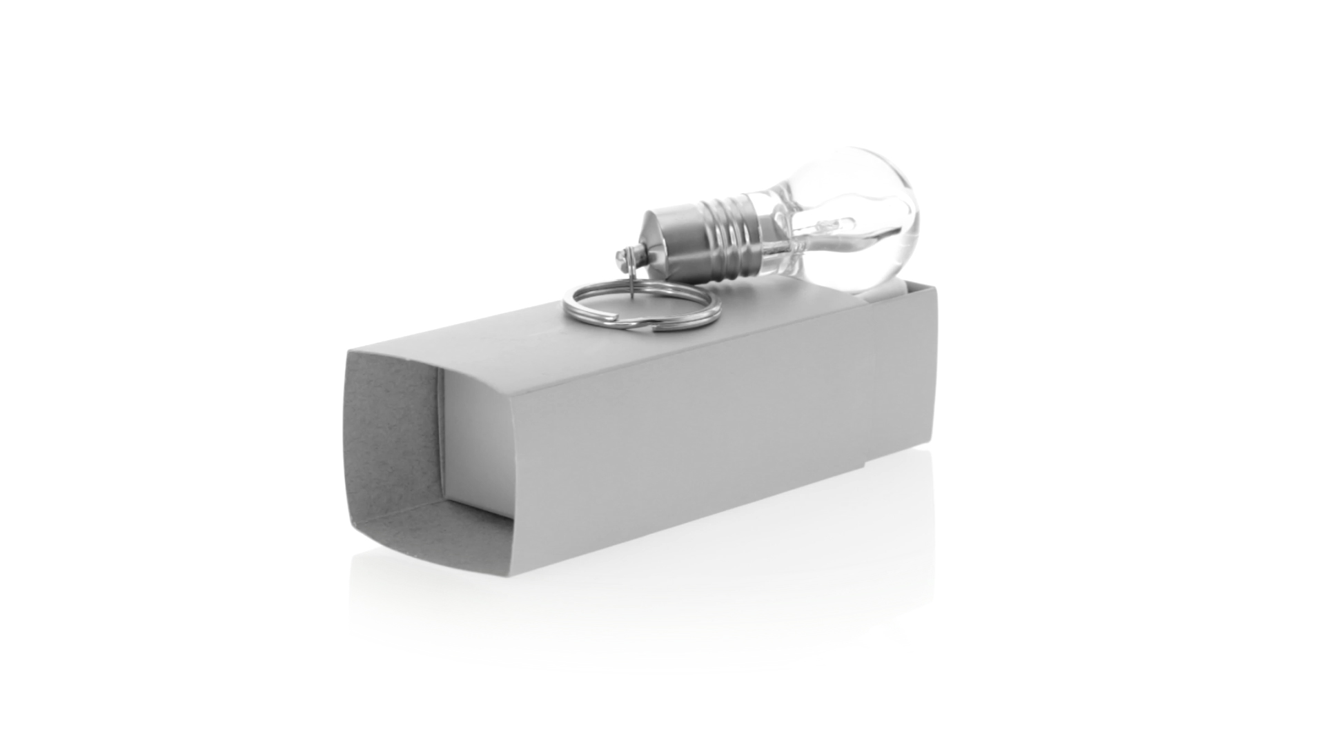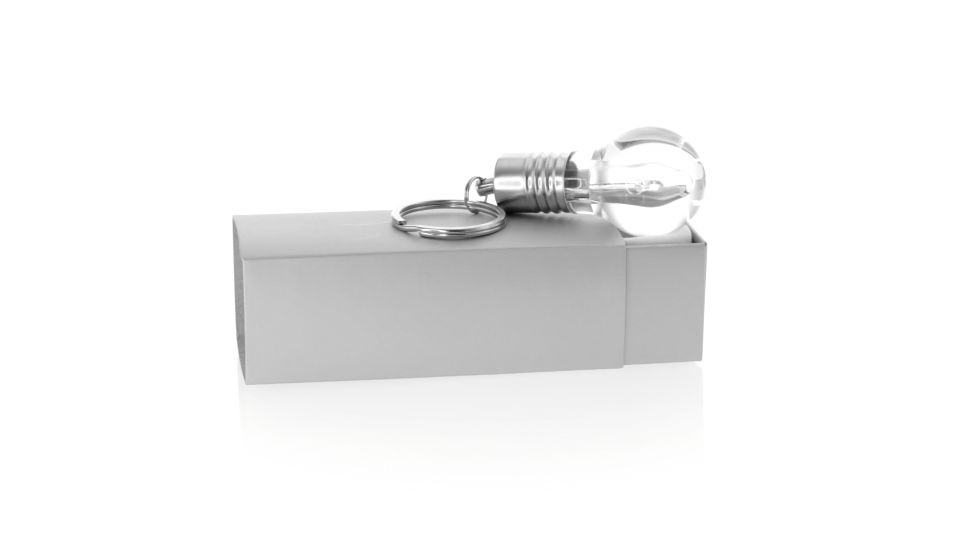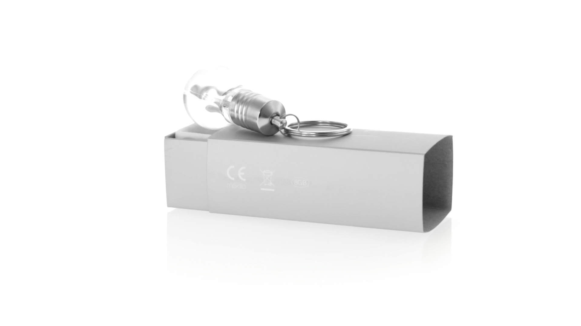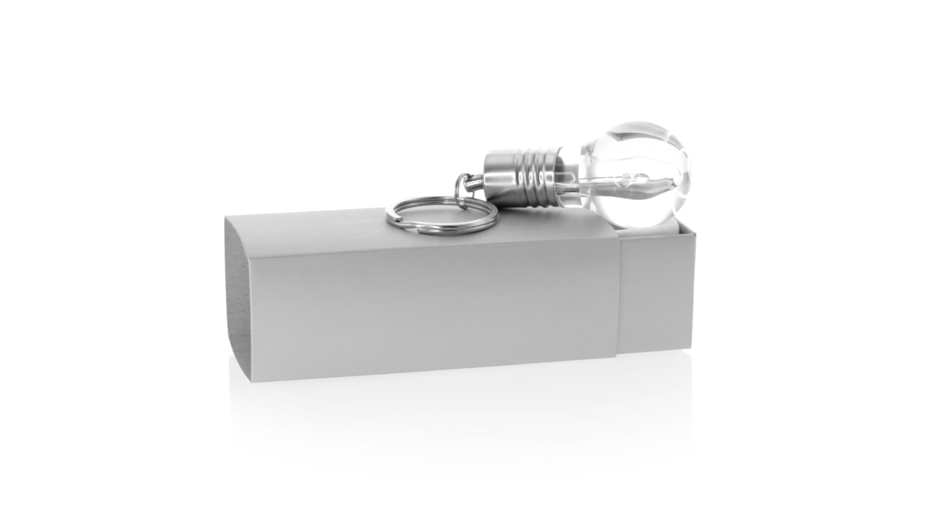 USB-Stick mit 8 GB Speicherkapazität und origineller Glühbirne, die bei Verbindung mit dem USB-Anschluss in Weiss leuchtet. Mit Schlüsselring. Präsentiert in einer individuellen Schachtel.