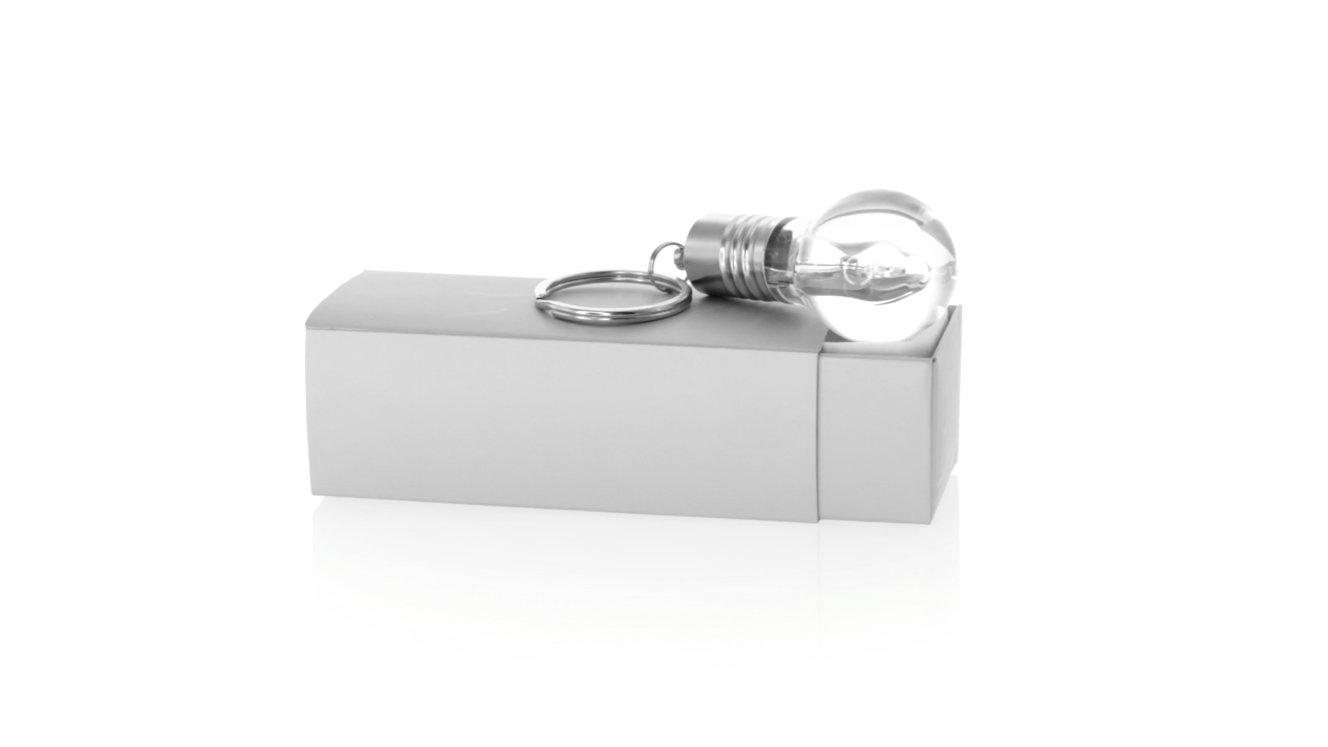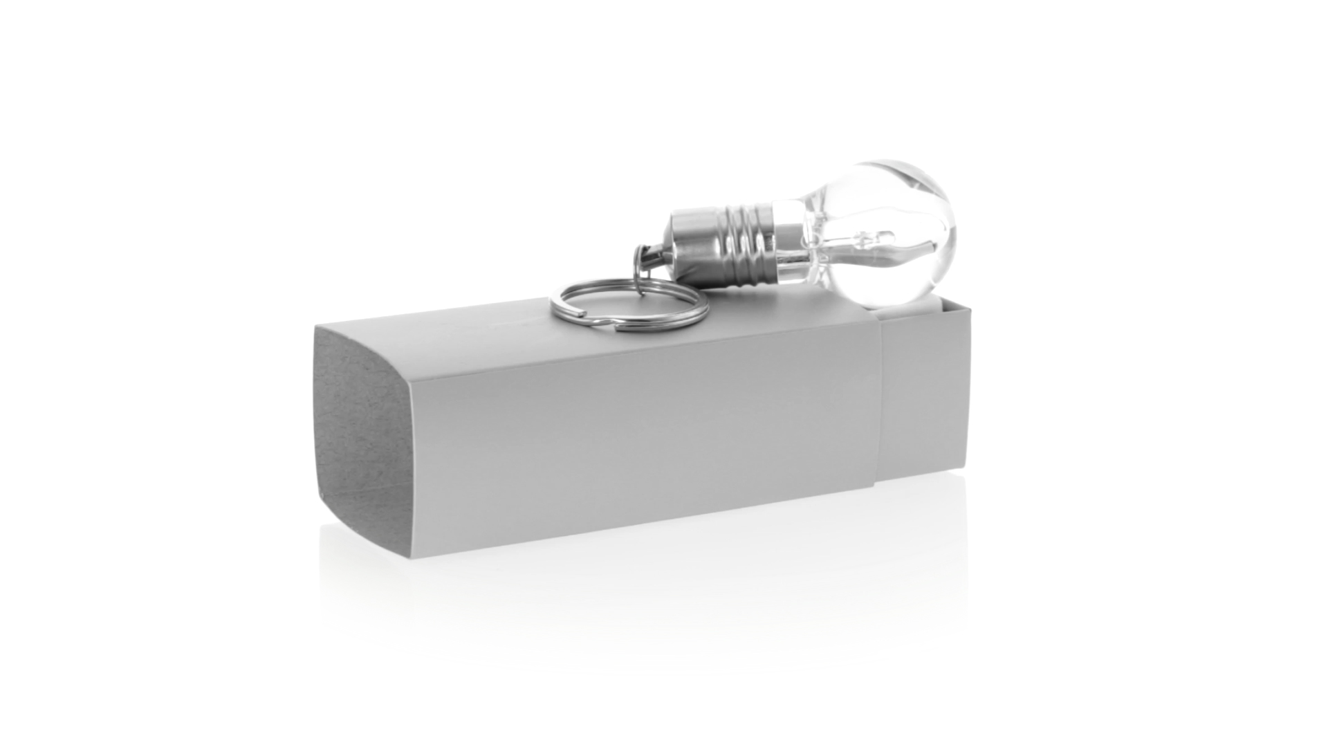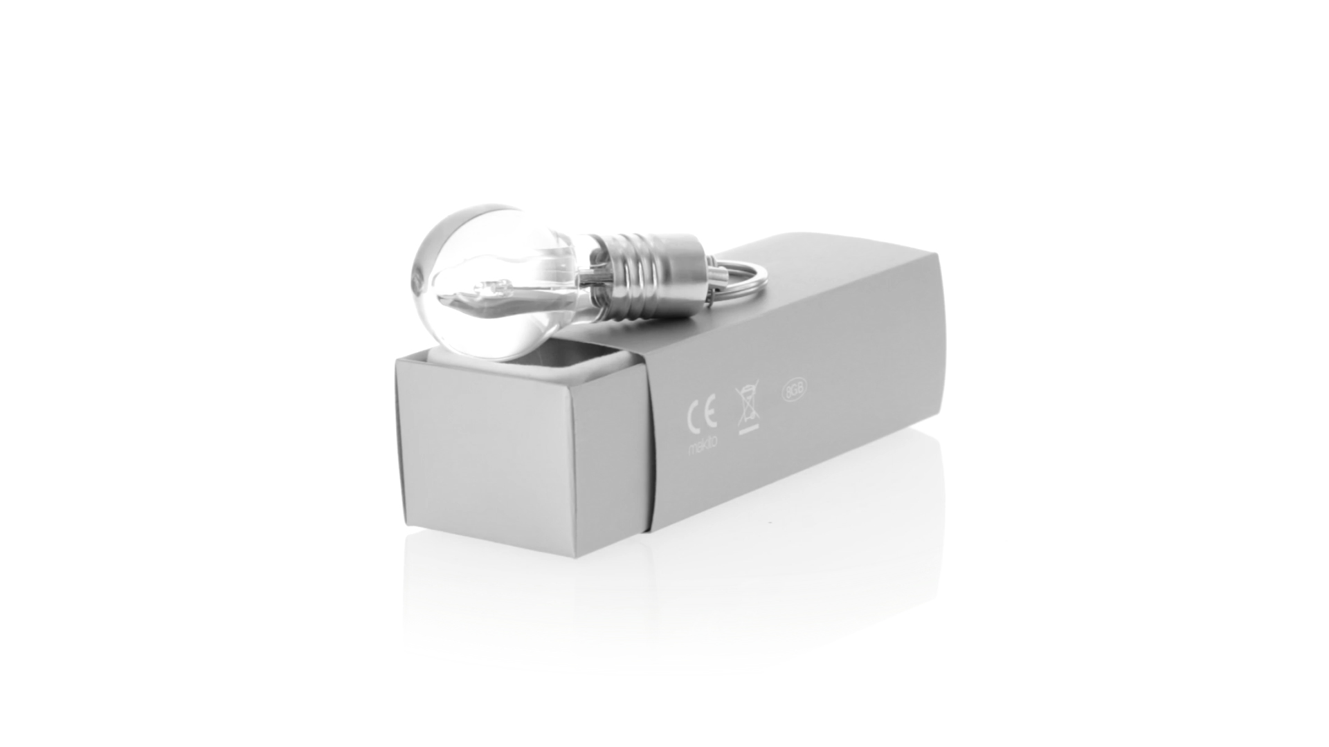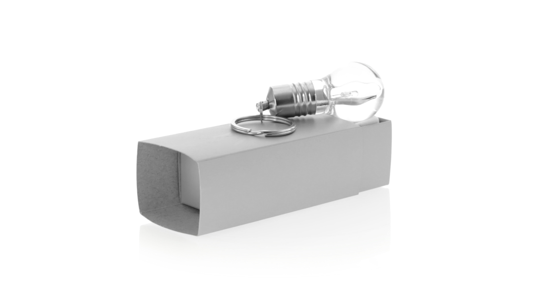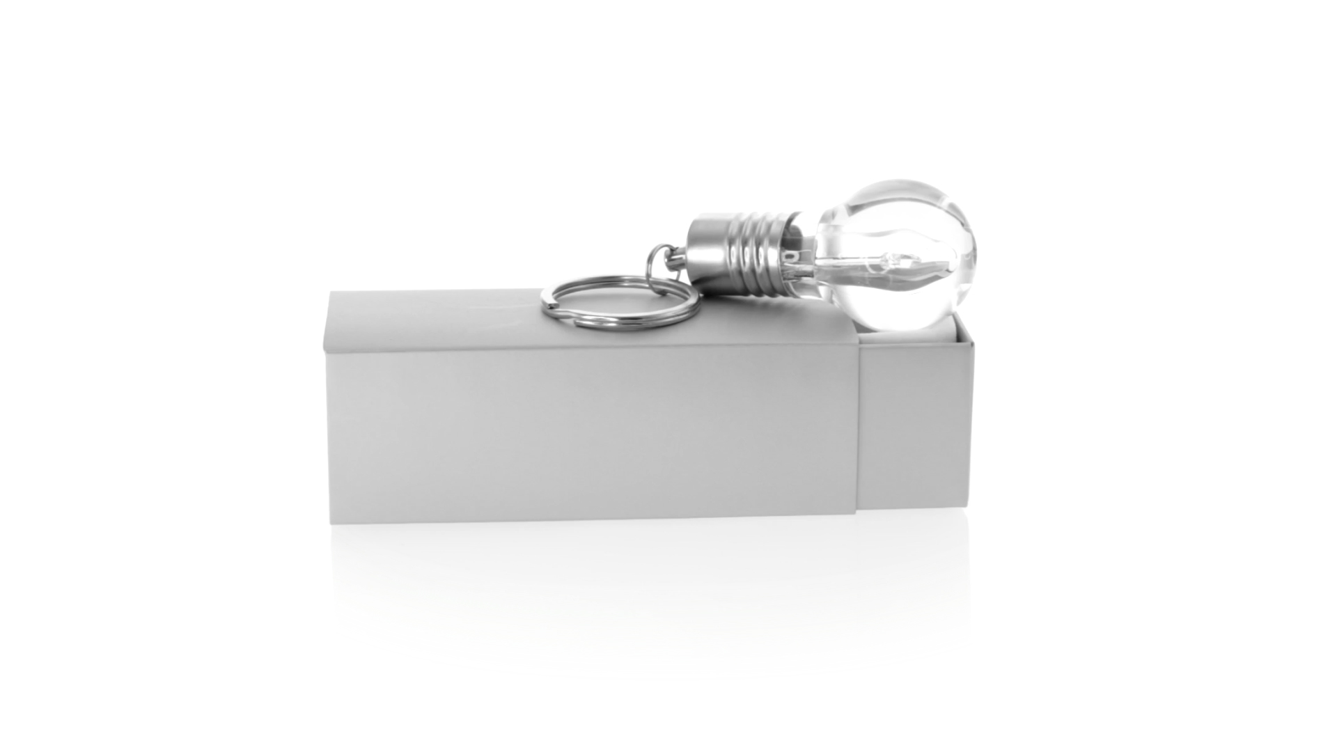 USB-Stick mit 8 GB Speicherkapazität und origineller Glühbirne, die bei Verbindung mit dem USB-Anschluss in Weiss leuchtet. Mit Schlüsselring. Präsentiert in einer individuellen Schachtel.