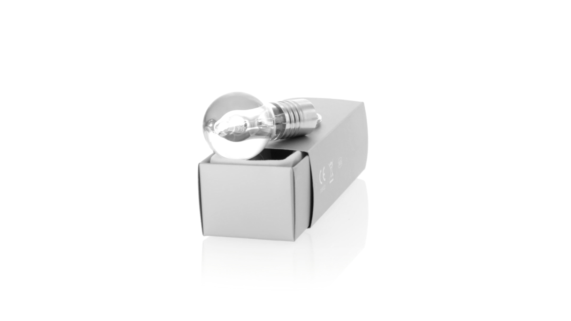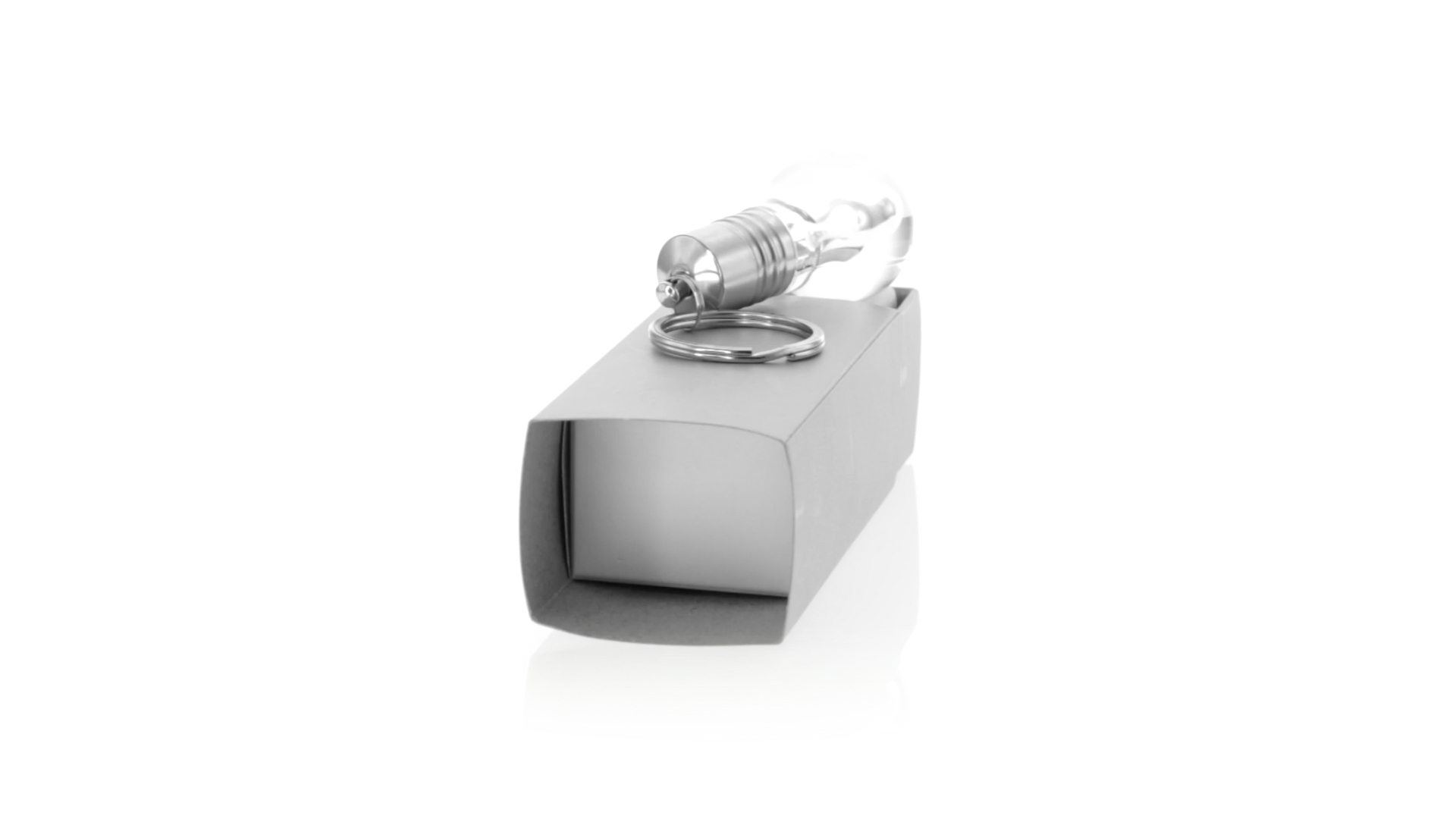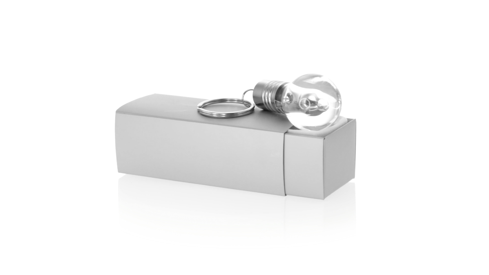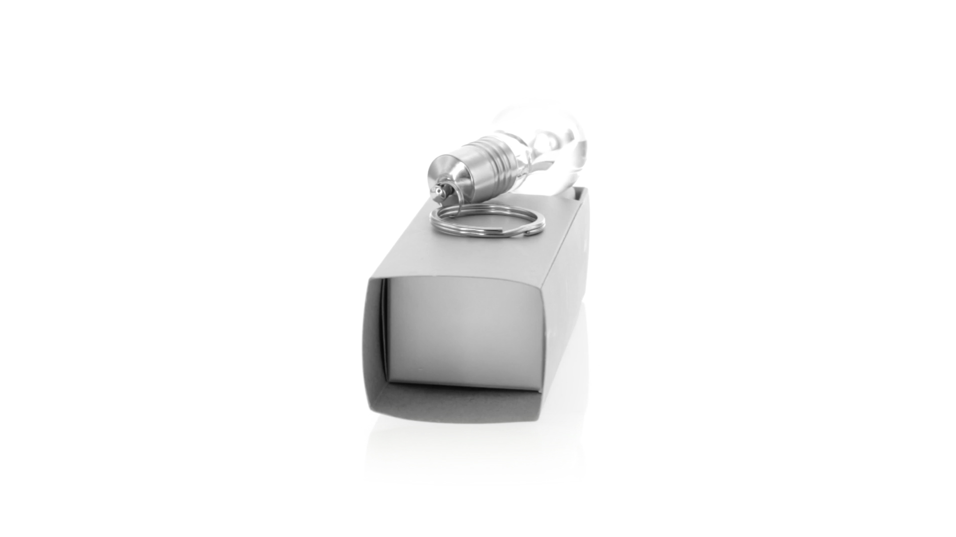 USB-Stick mit 8 GB Speicherkapazität und origineller Glühbirne, die bei Verbindung mit dem USB-Anschluss in Weiss leuchtet. Mit Schlüsselring. Präsentiert in einer individuellen Schachtel.