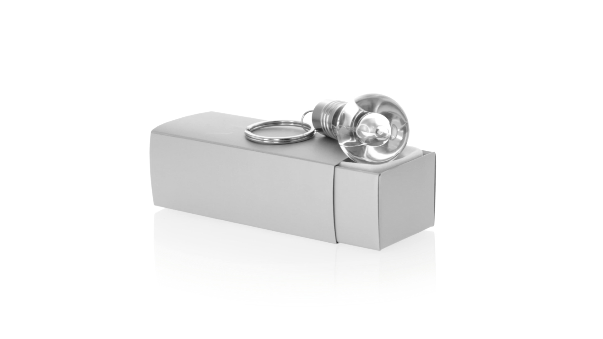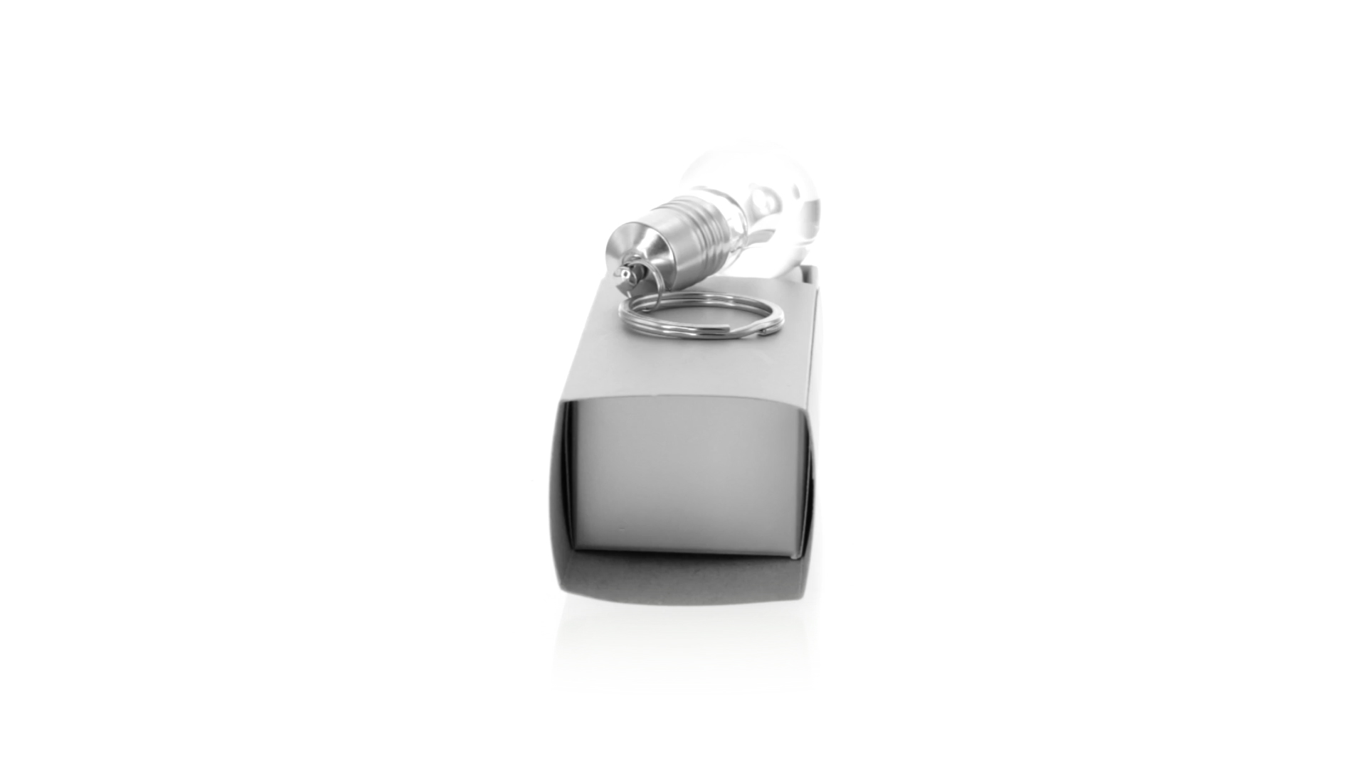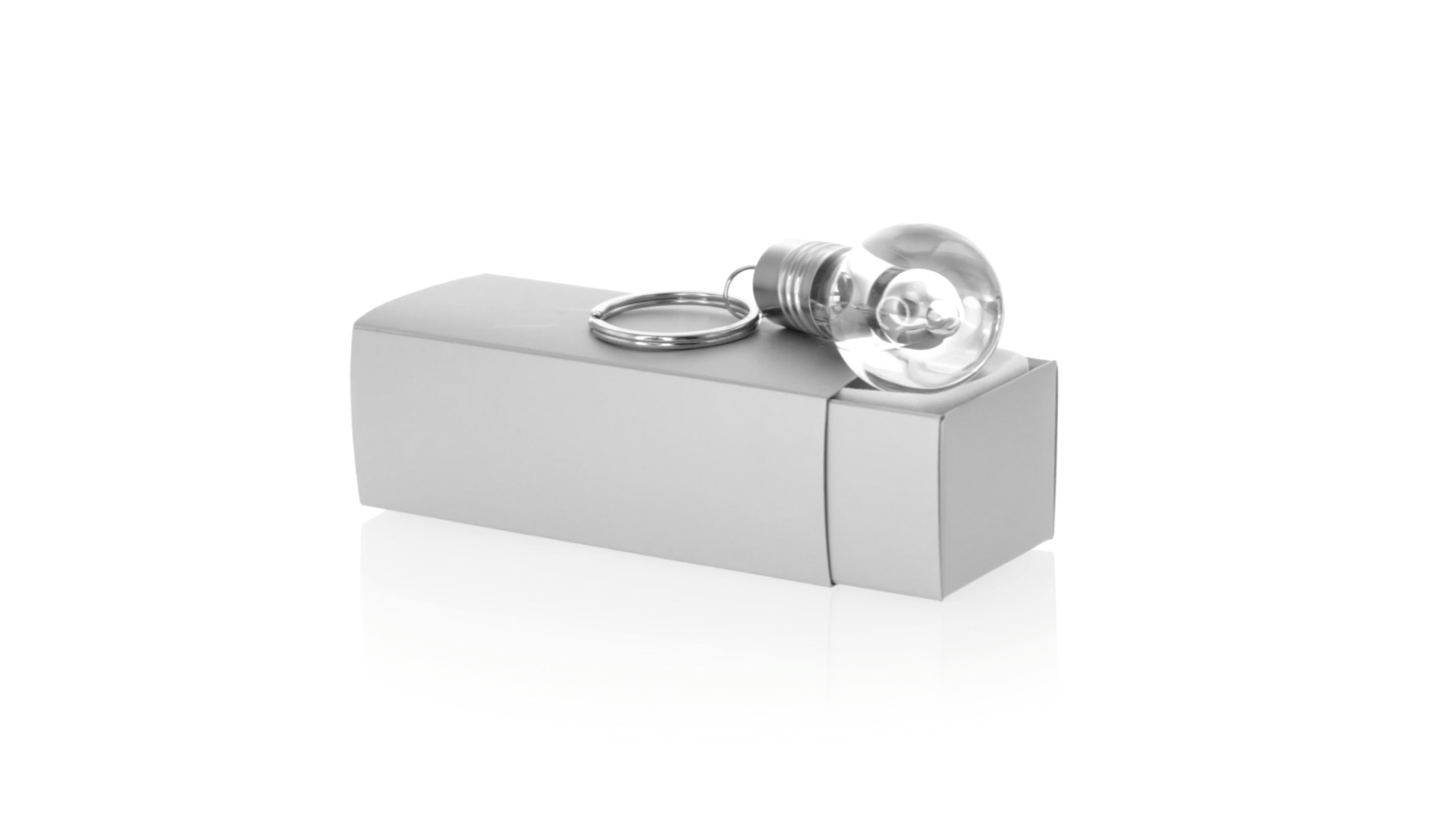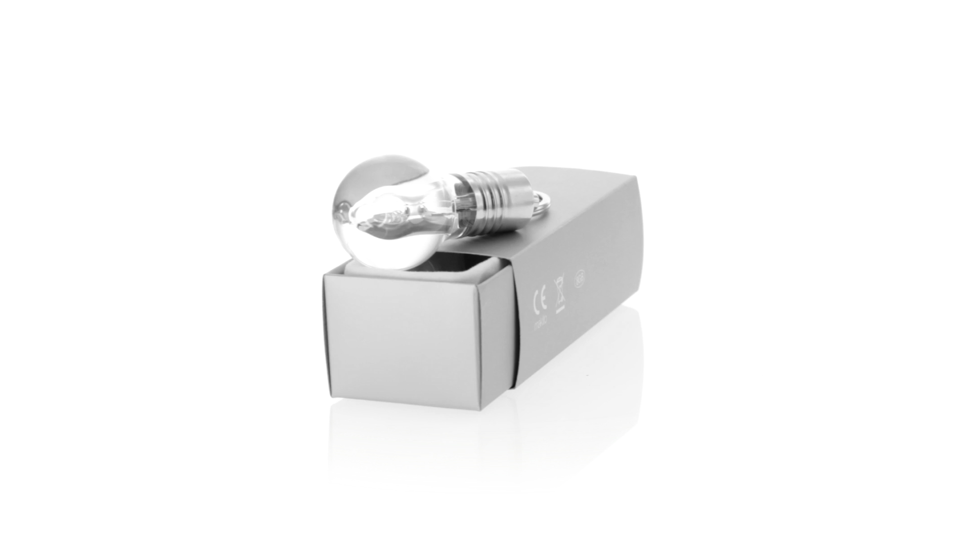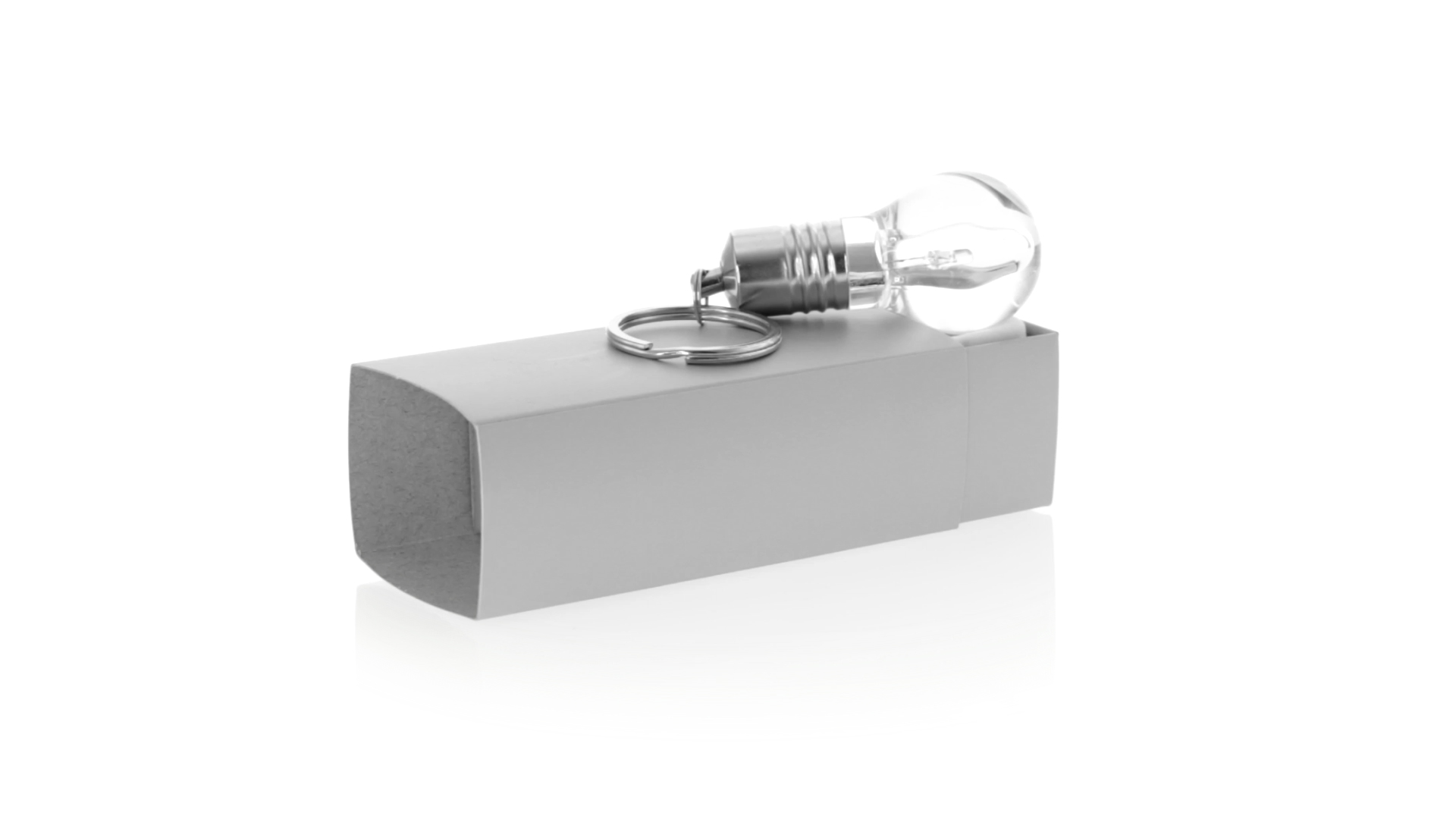 USB-Stick mit 8 GB Speicherkapazität und origineller Glühbirne, die bei Verbindung mit dem USB-Anschluss in Weiss leuchtet. Mit Schlüsselring. Präsentiert in einer individuellen Schachtel.