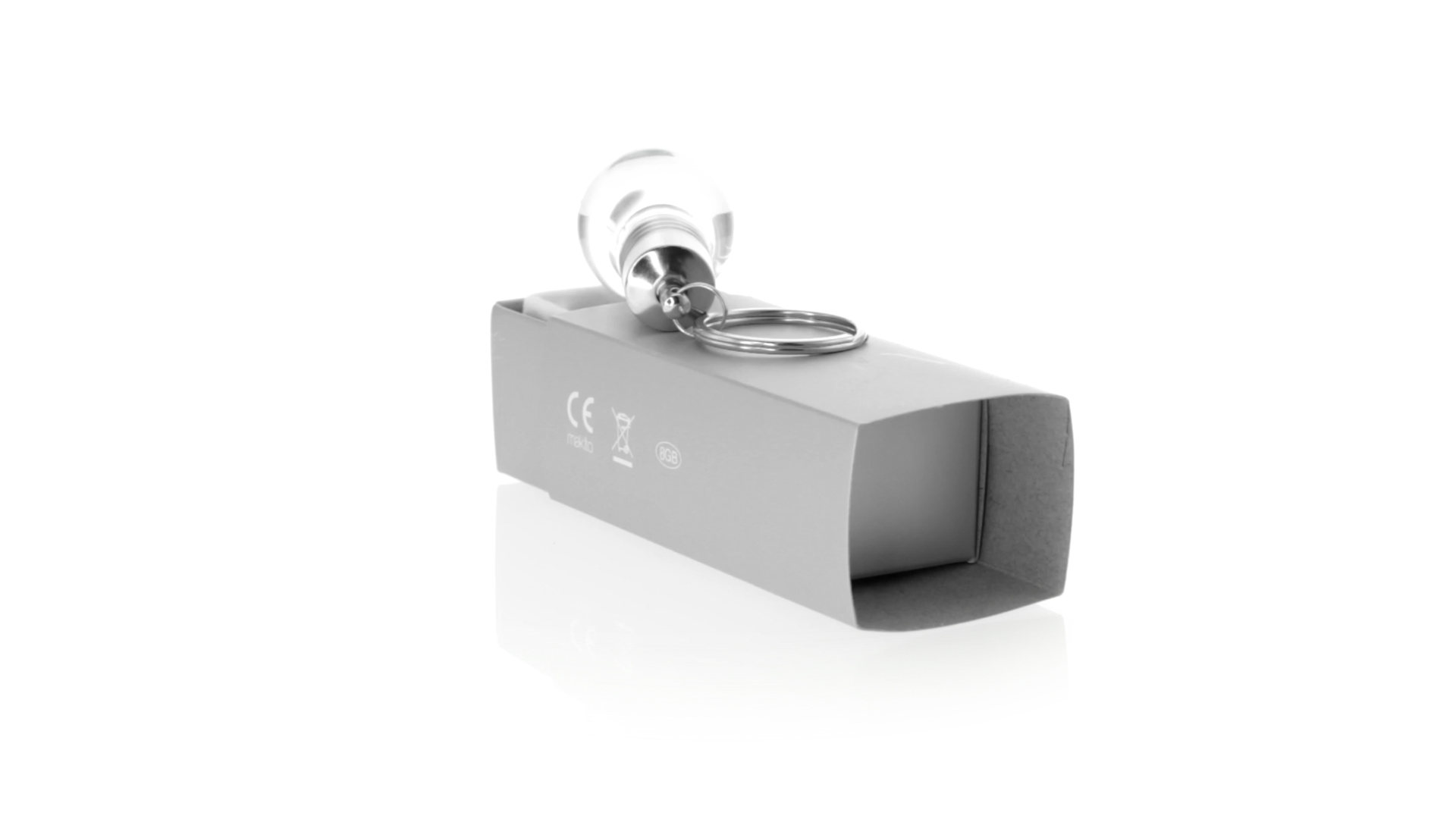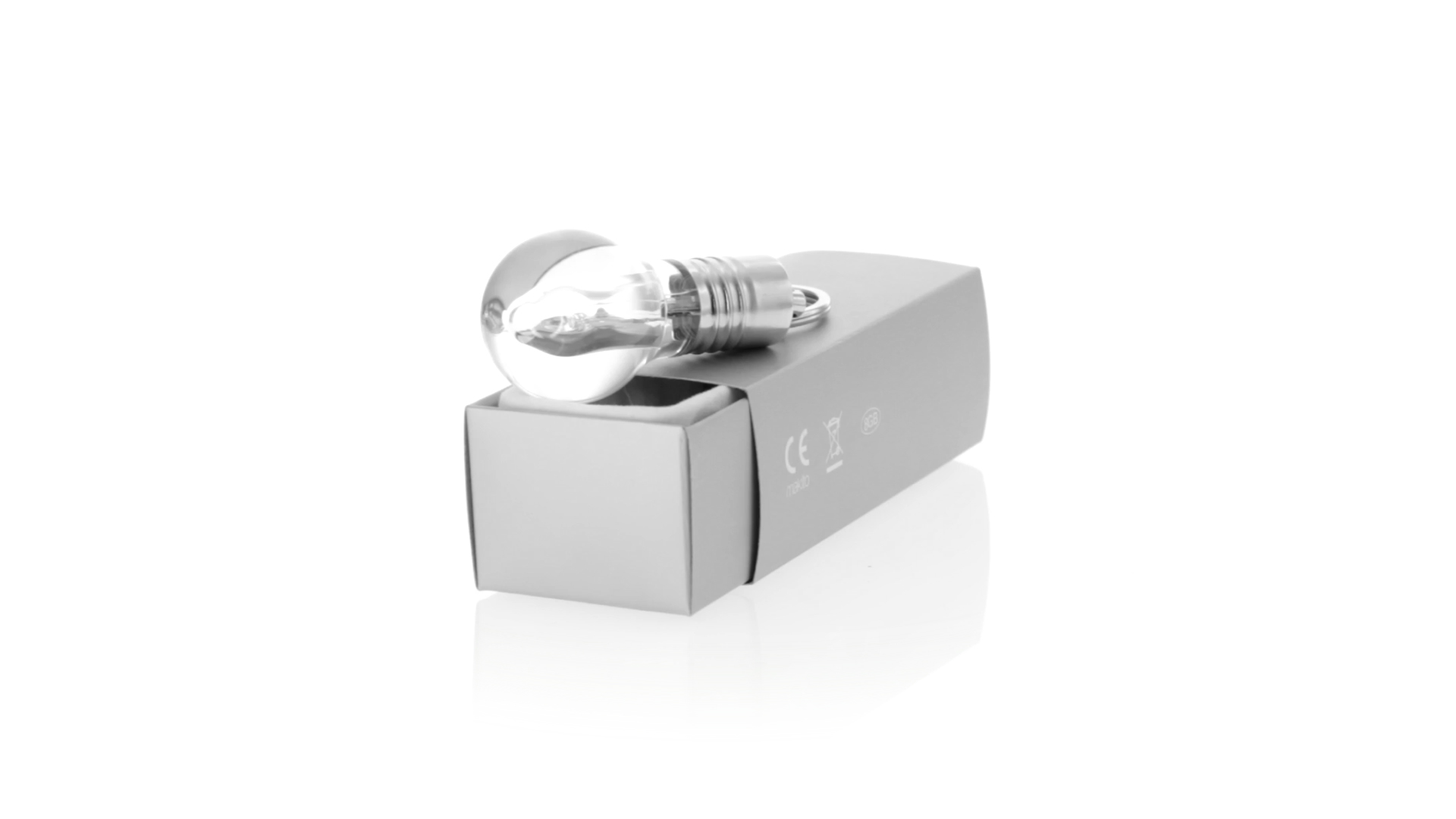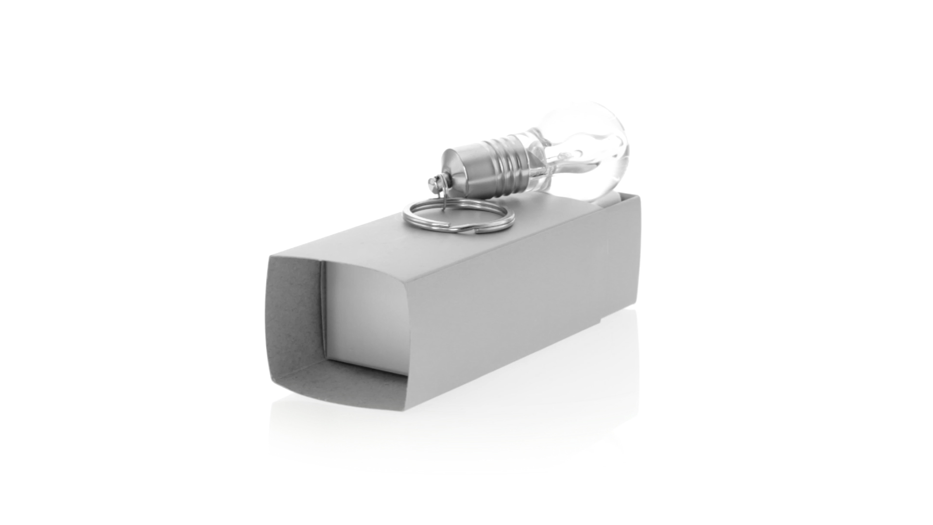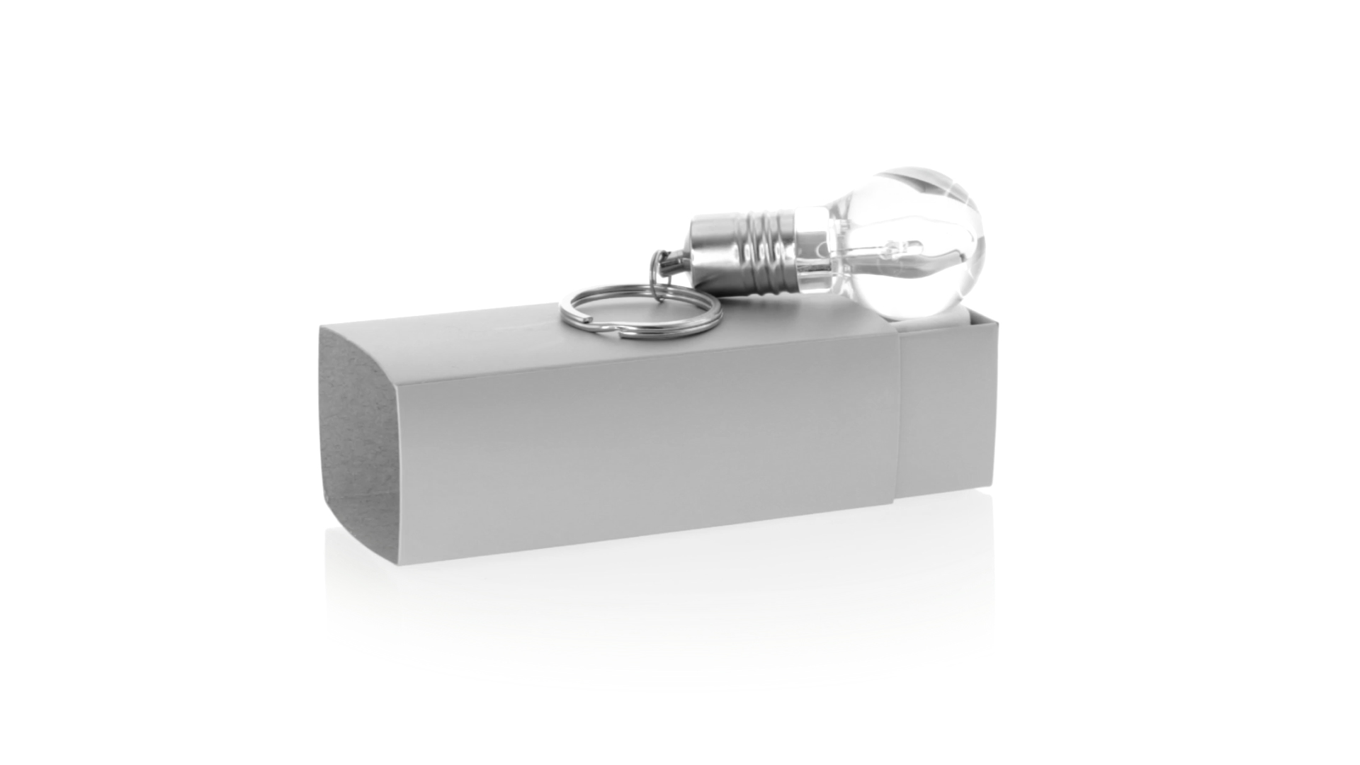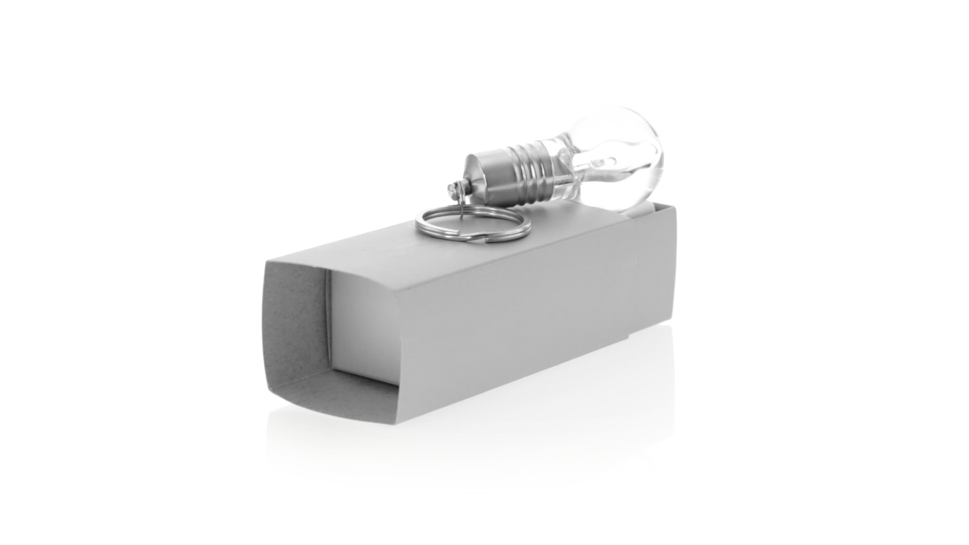 USB-Stick mit 8 GB Speicherkapazität und origineller Glühbirne, die bei Verbindung mit dem USB-Anschluss in Weiss leuchtet. Mit Schlüsselring. Präsentiert in einer individuellen Schachtel.