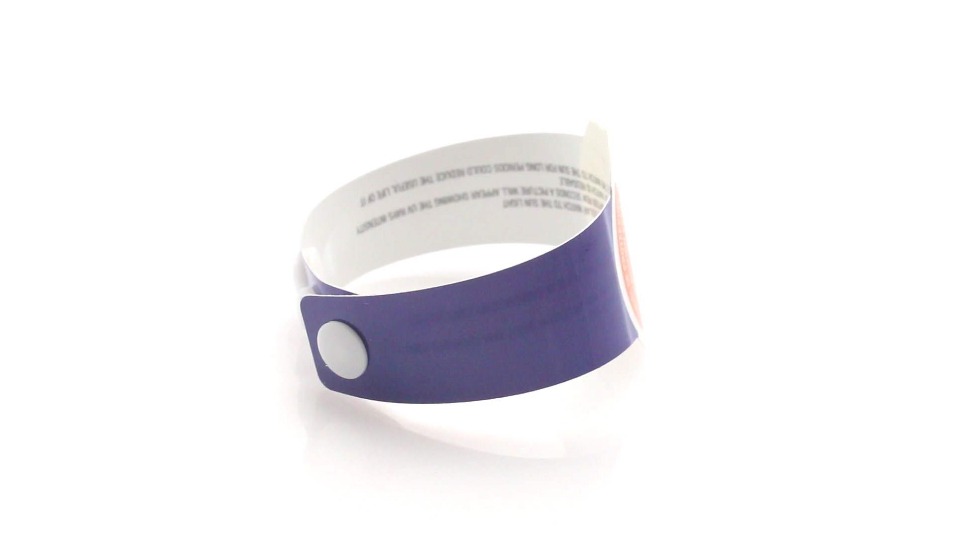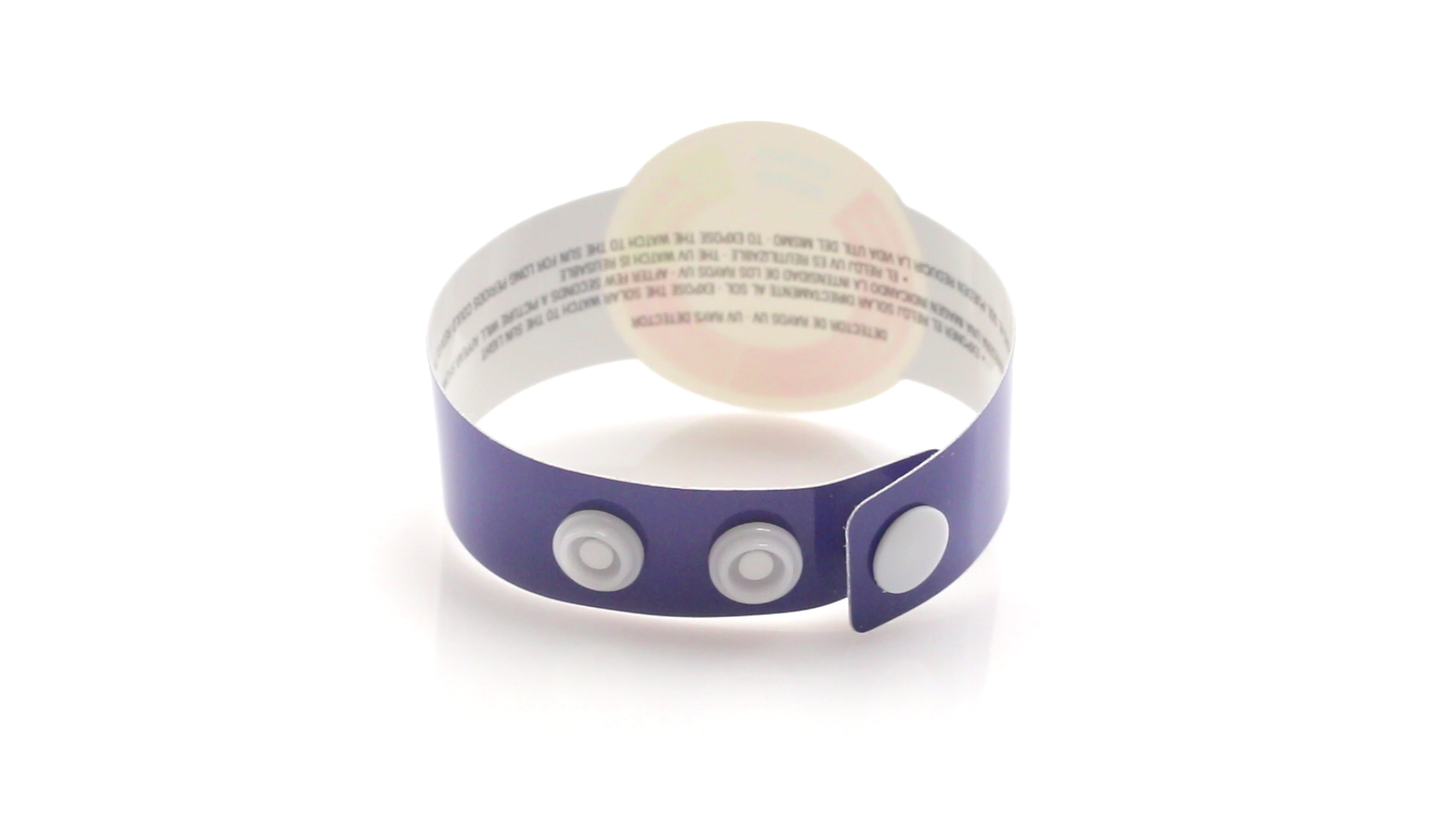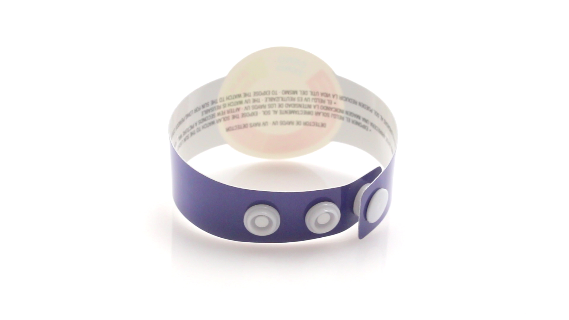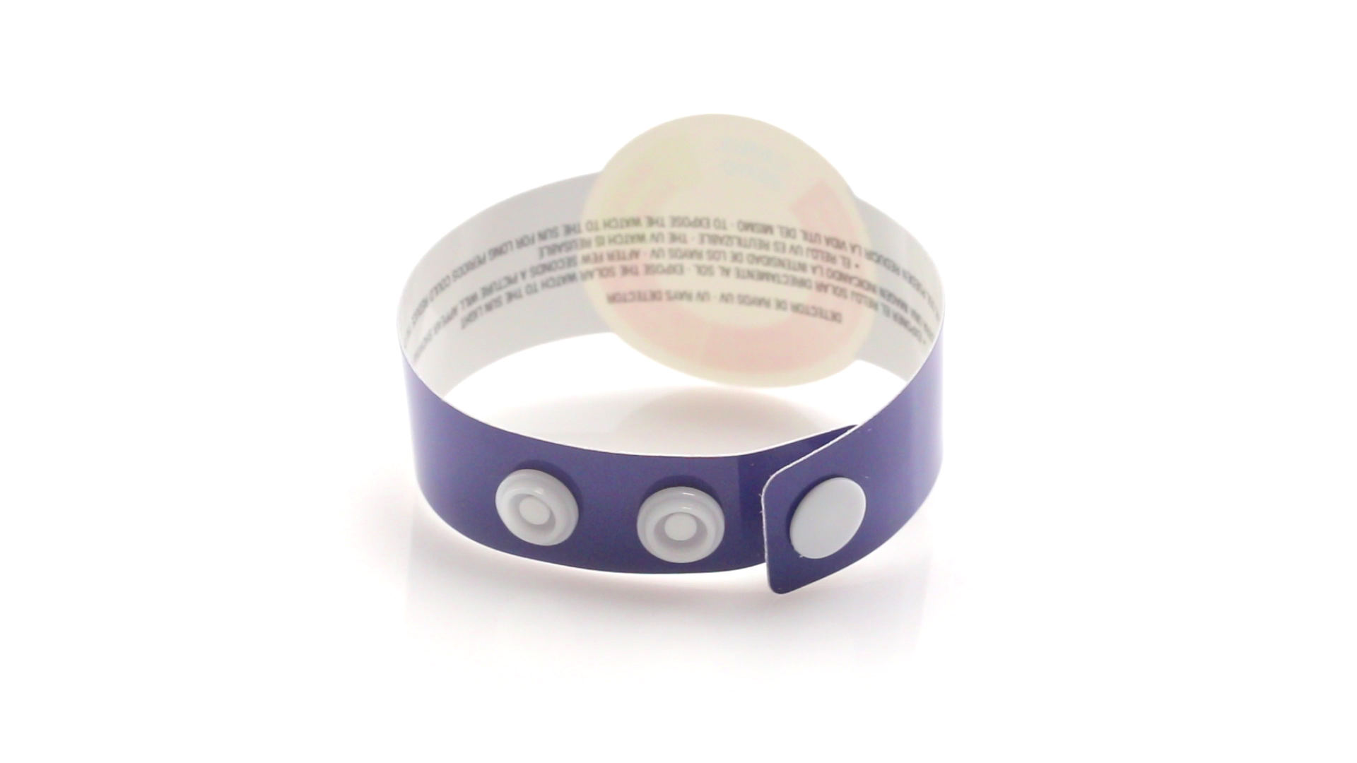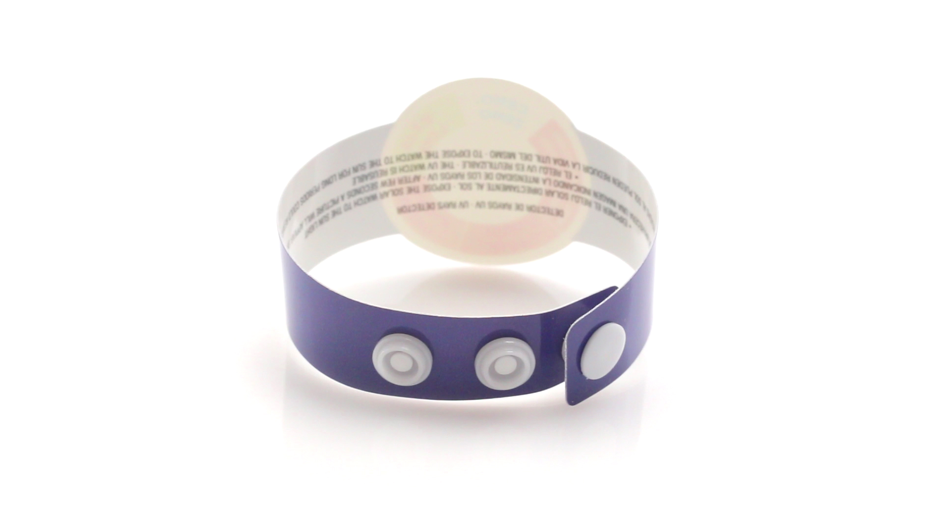 Verstellbares Armband mit UV-Strahlungsmesser in verschiedenen kräftigen Farben. Mit Druckknopfverschluss.