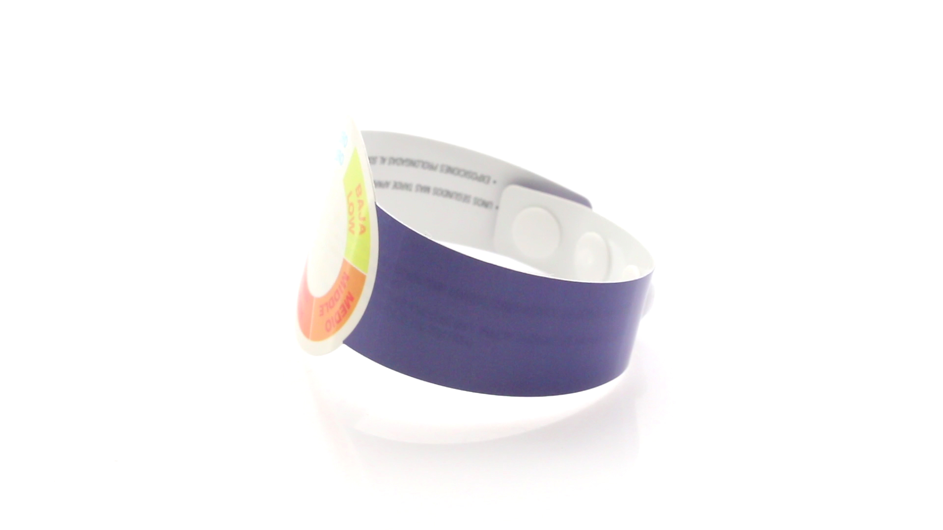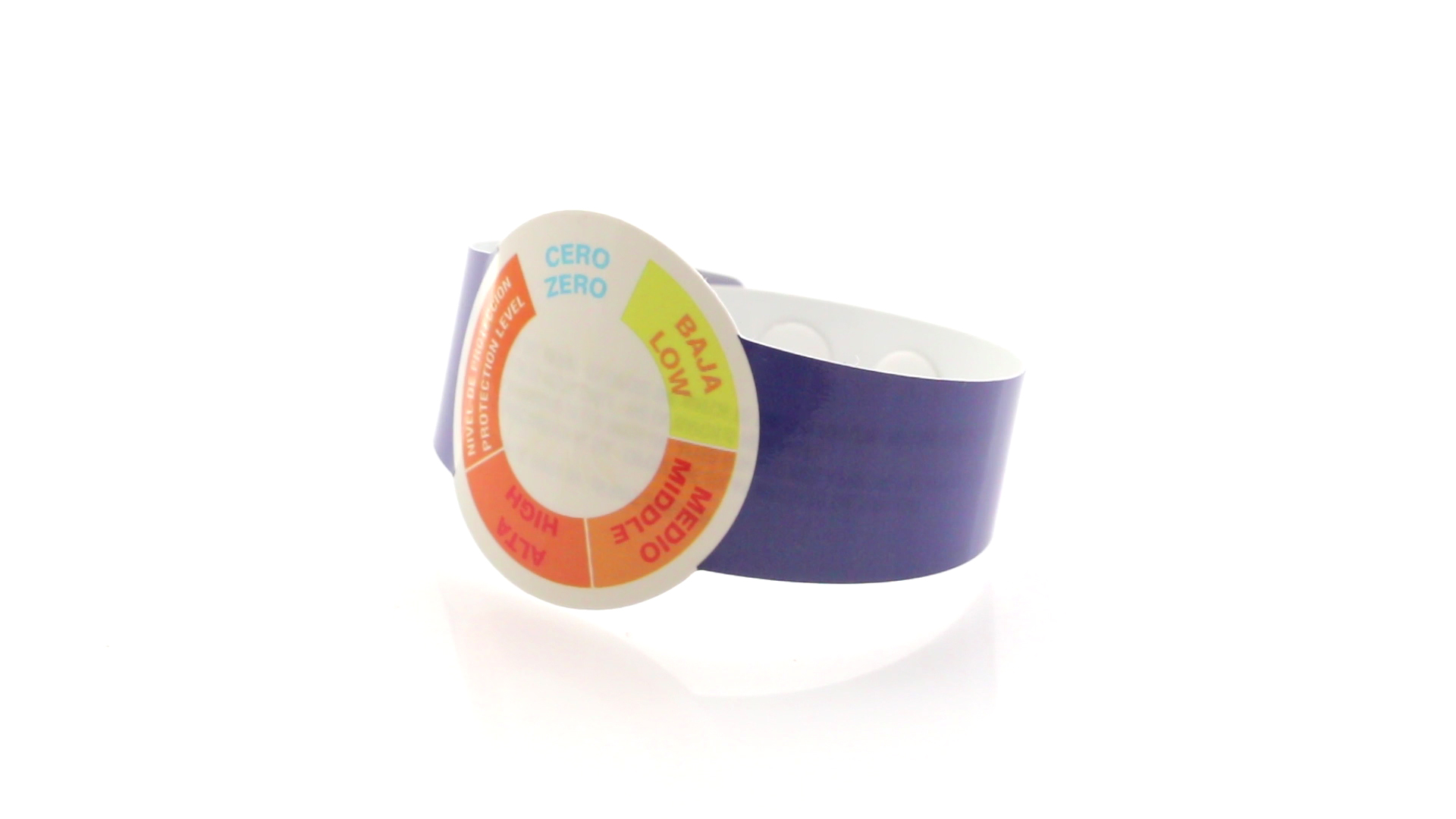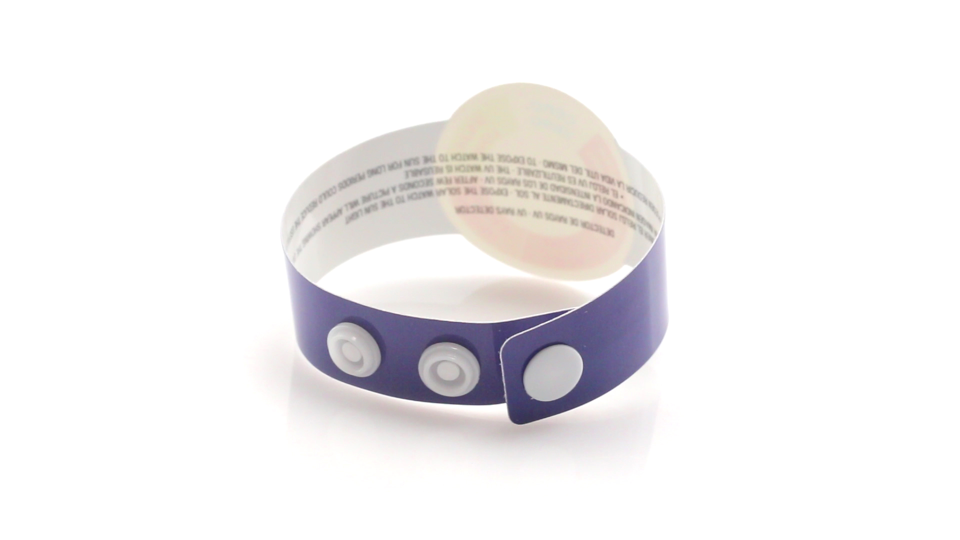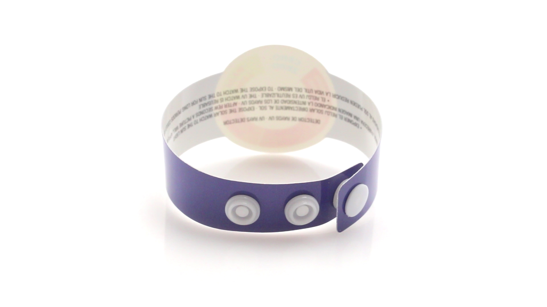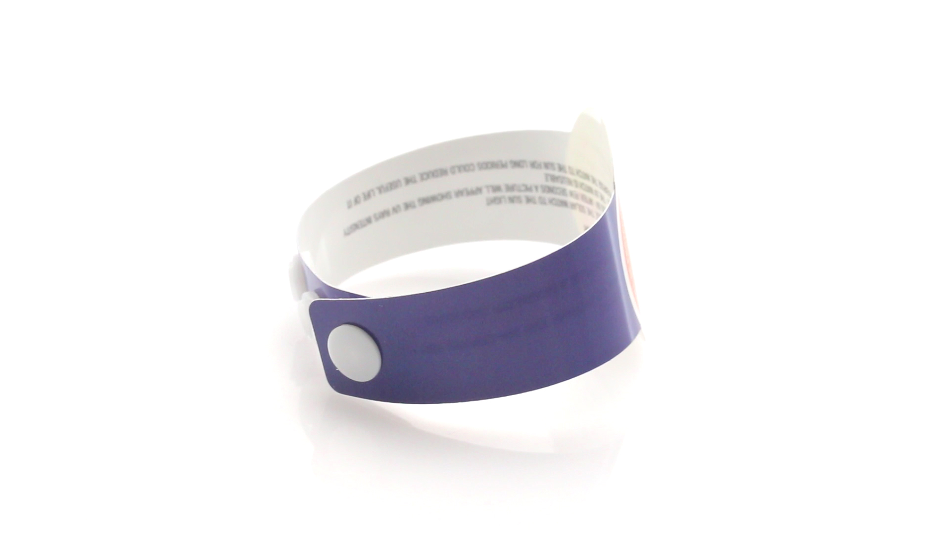 Verstellbares Armband mit UV-Strahlungsmesser in verschiedenen kräftigen Farben. Mit Druckknopfverschluss.