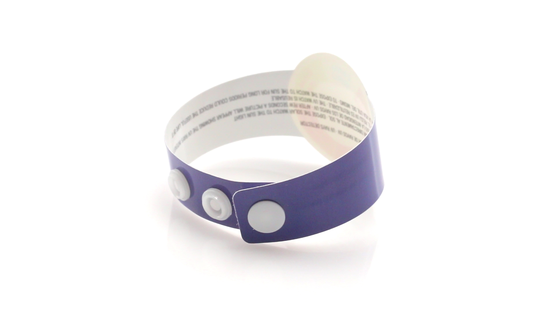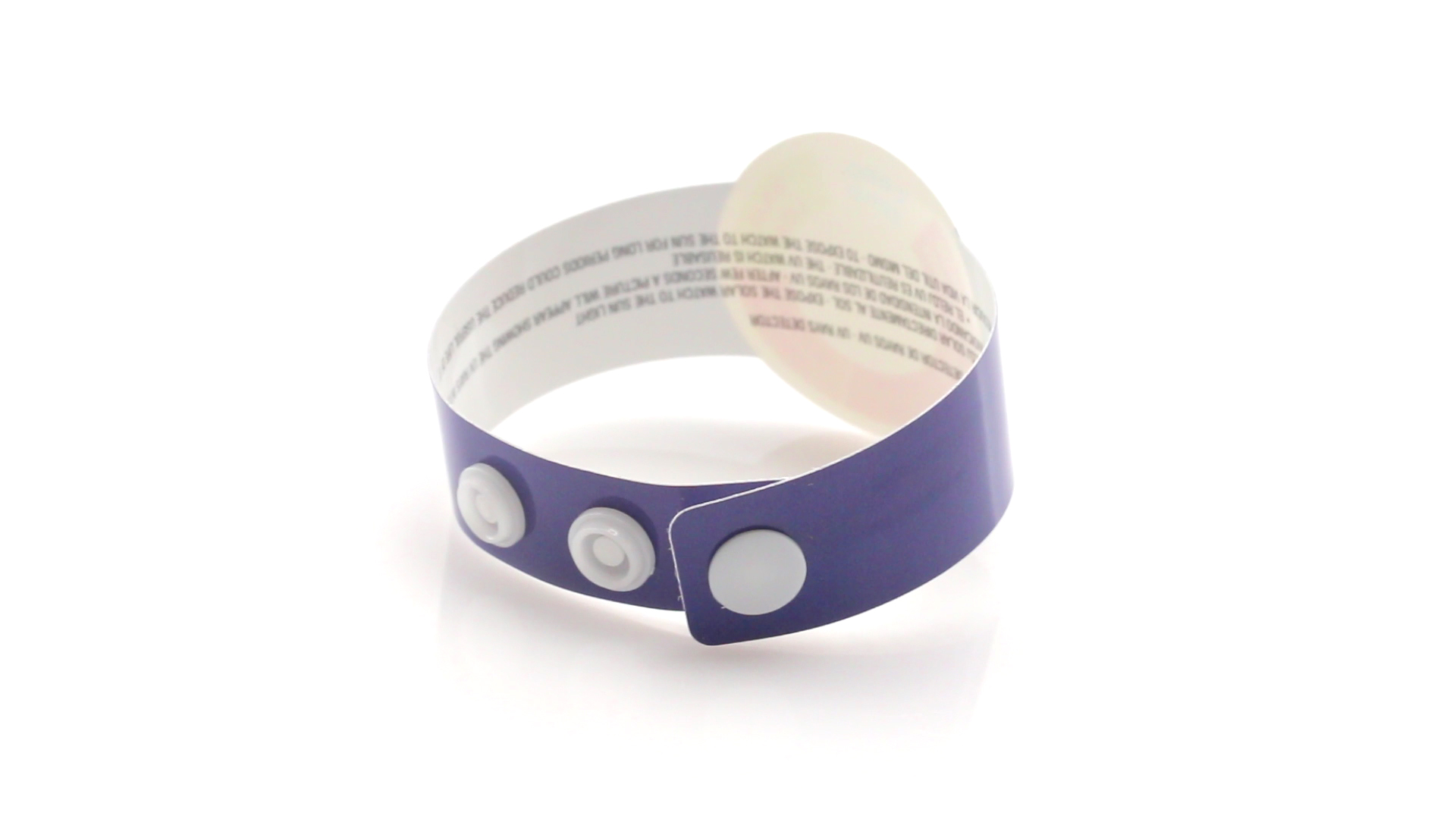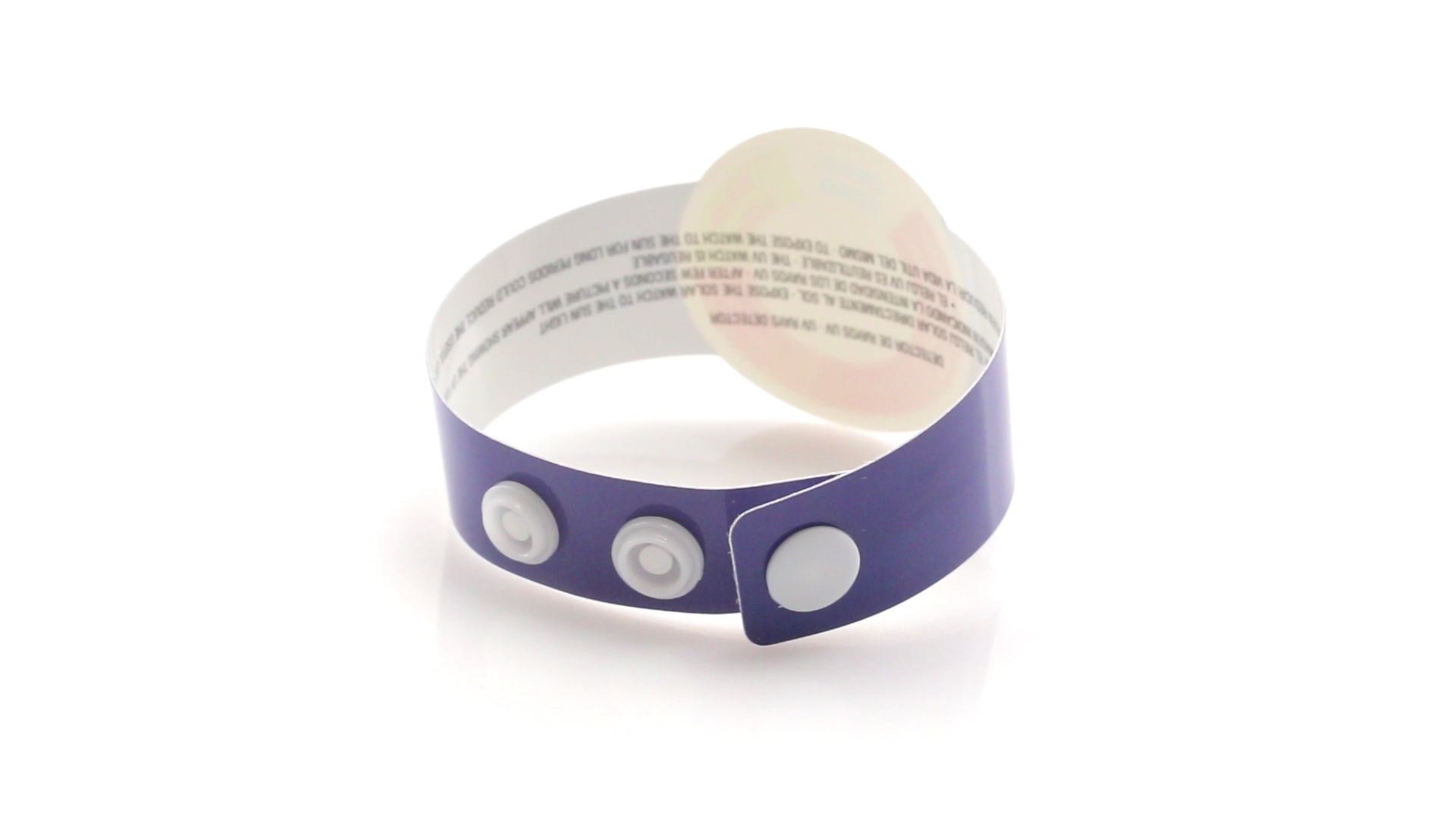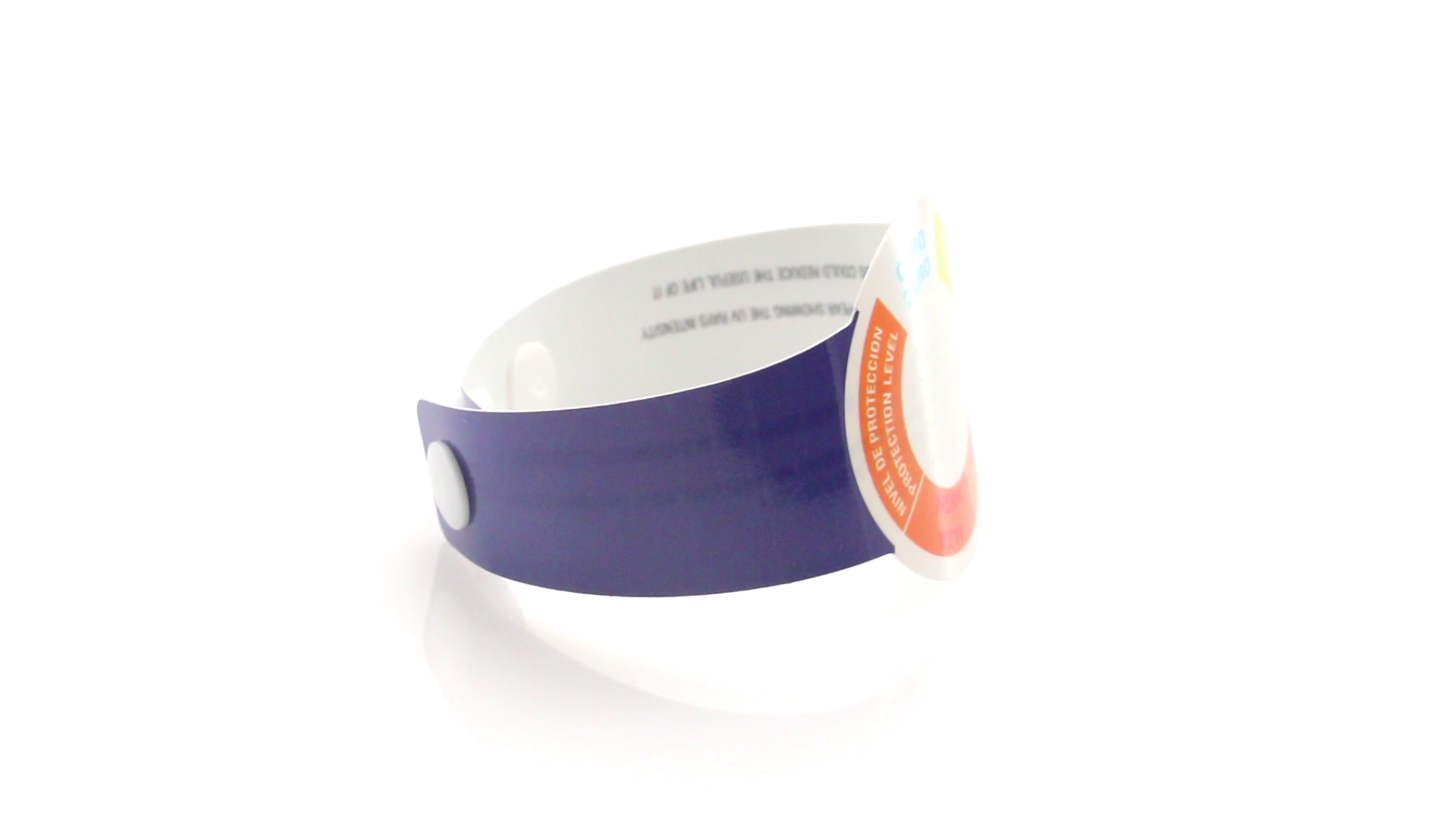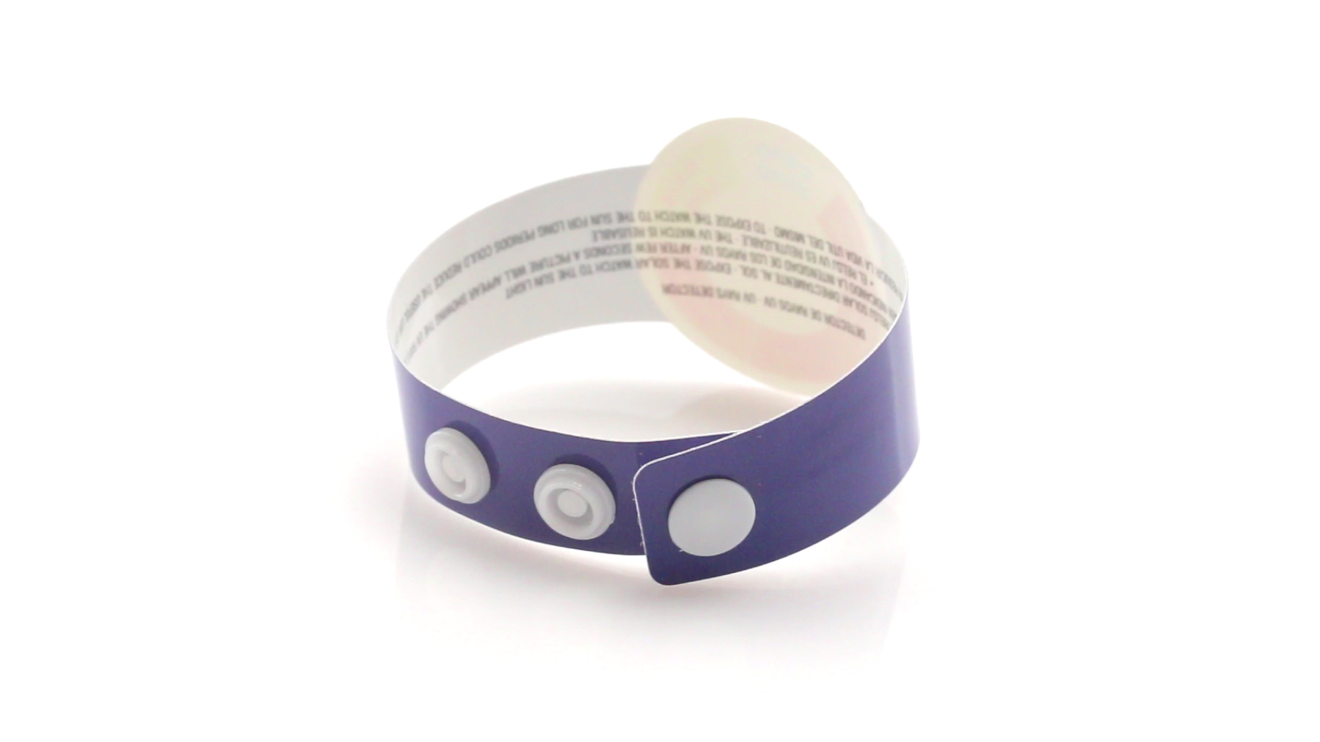 Verstellbares Armband mit UV-Strahlungsmesser in verschiedenen kräftigen Farben. Mit Druckknopfverschluss.