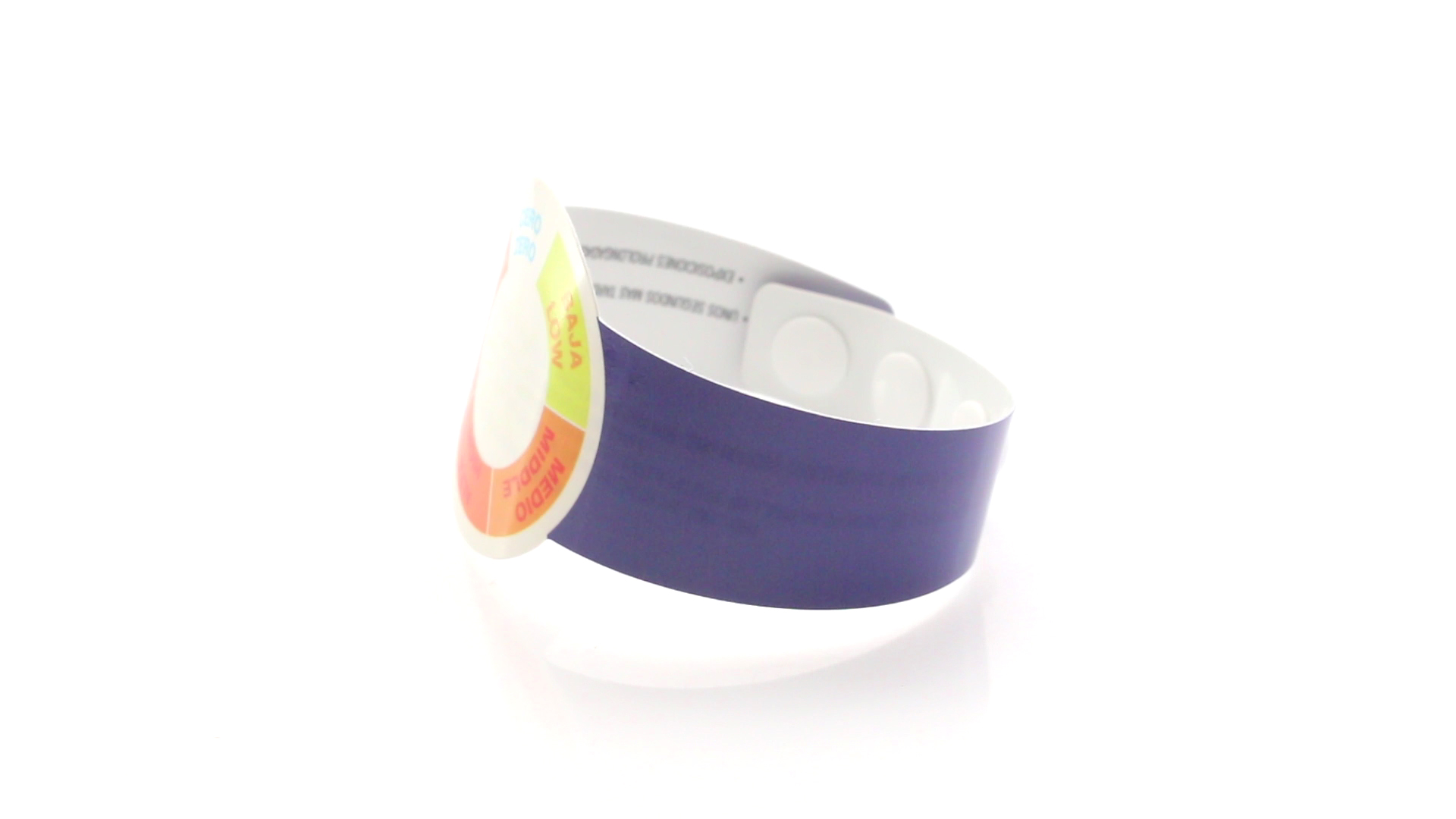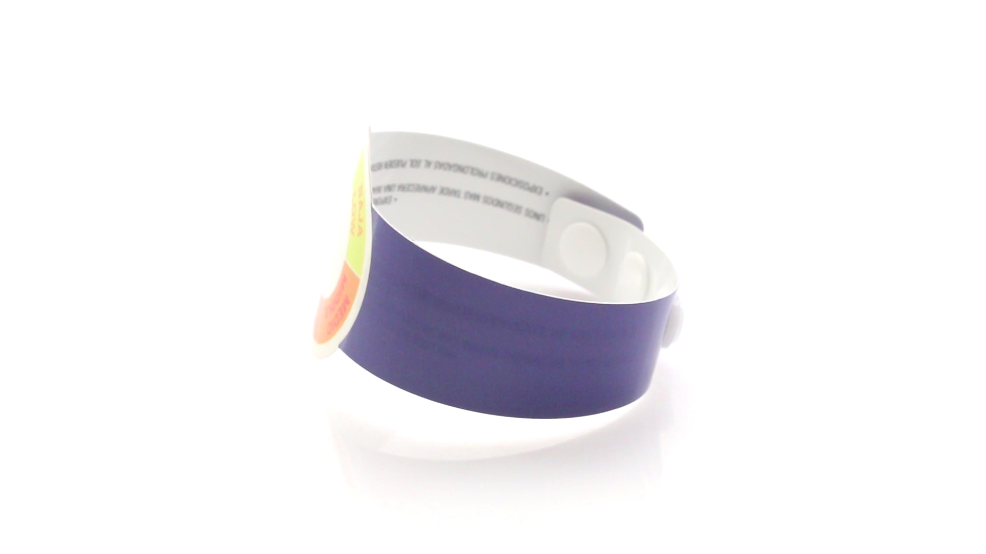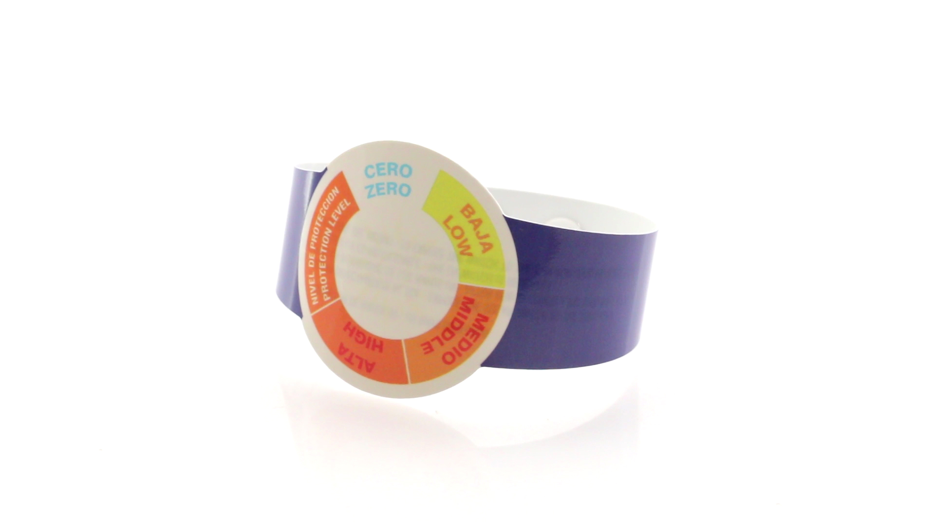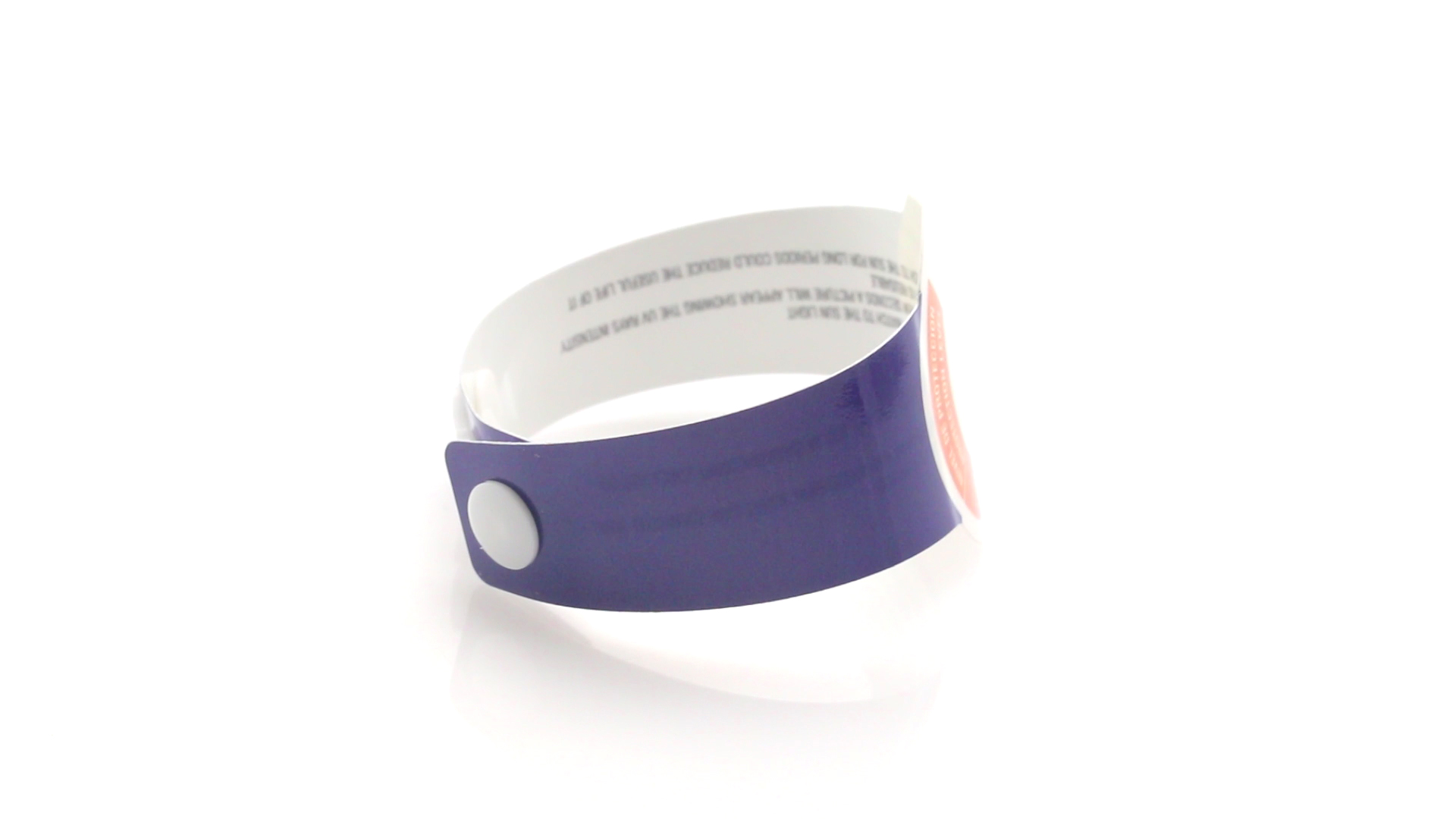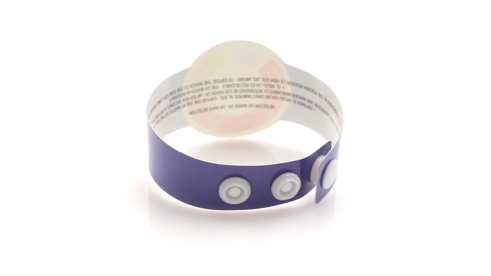 Verstellbares Armband mit UV-Strahlungsmesser in verschiedenen kräftigen Farben. Mit Druckknopfverschluss.