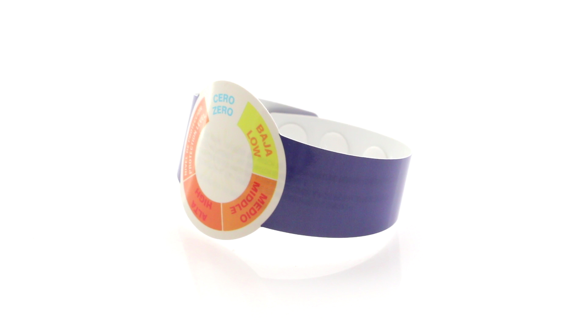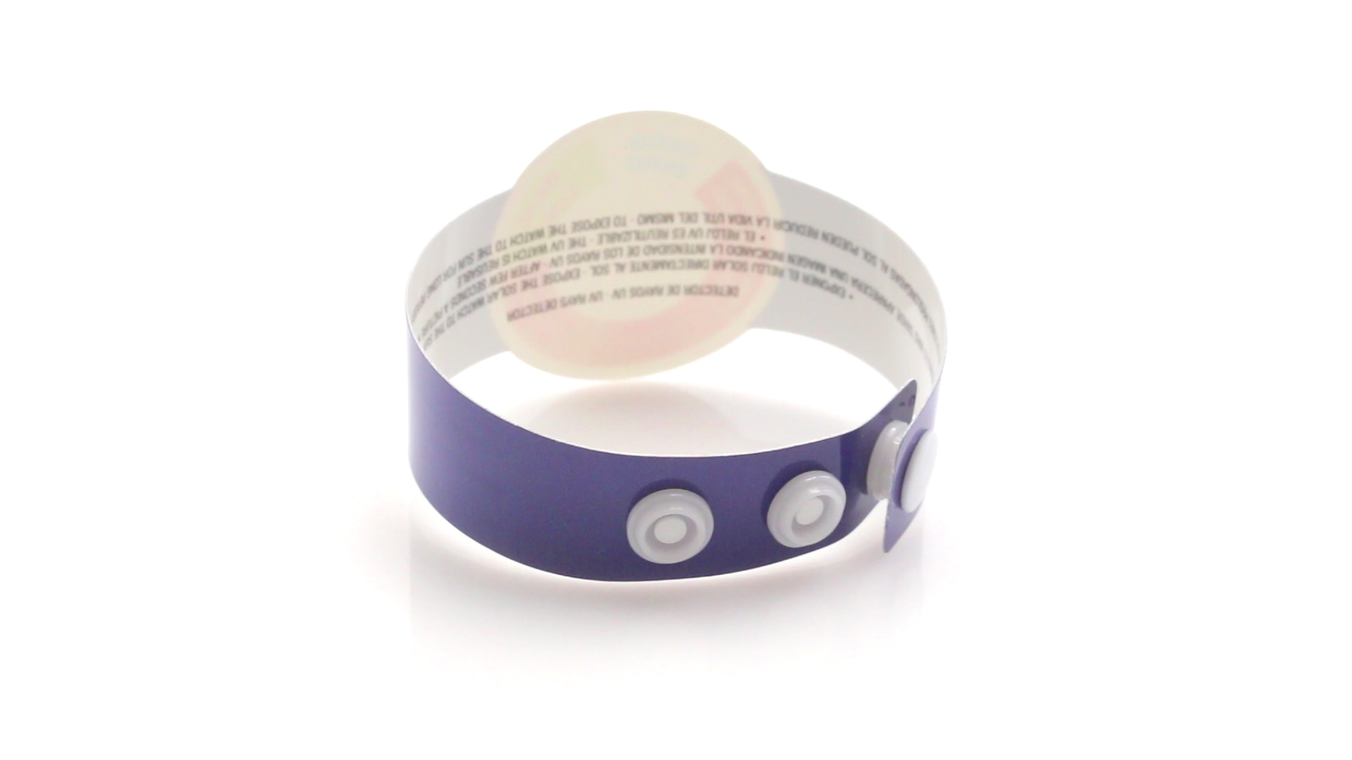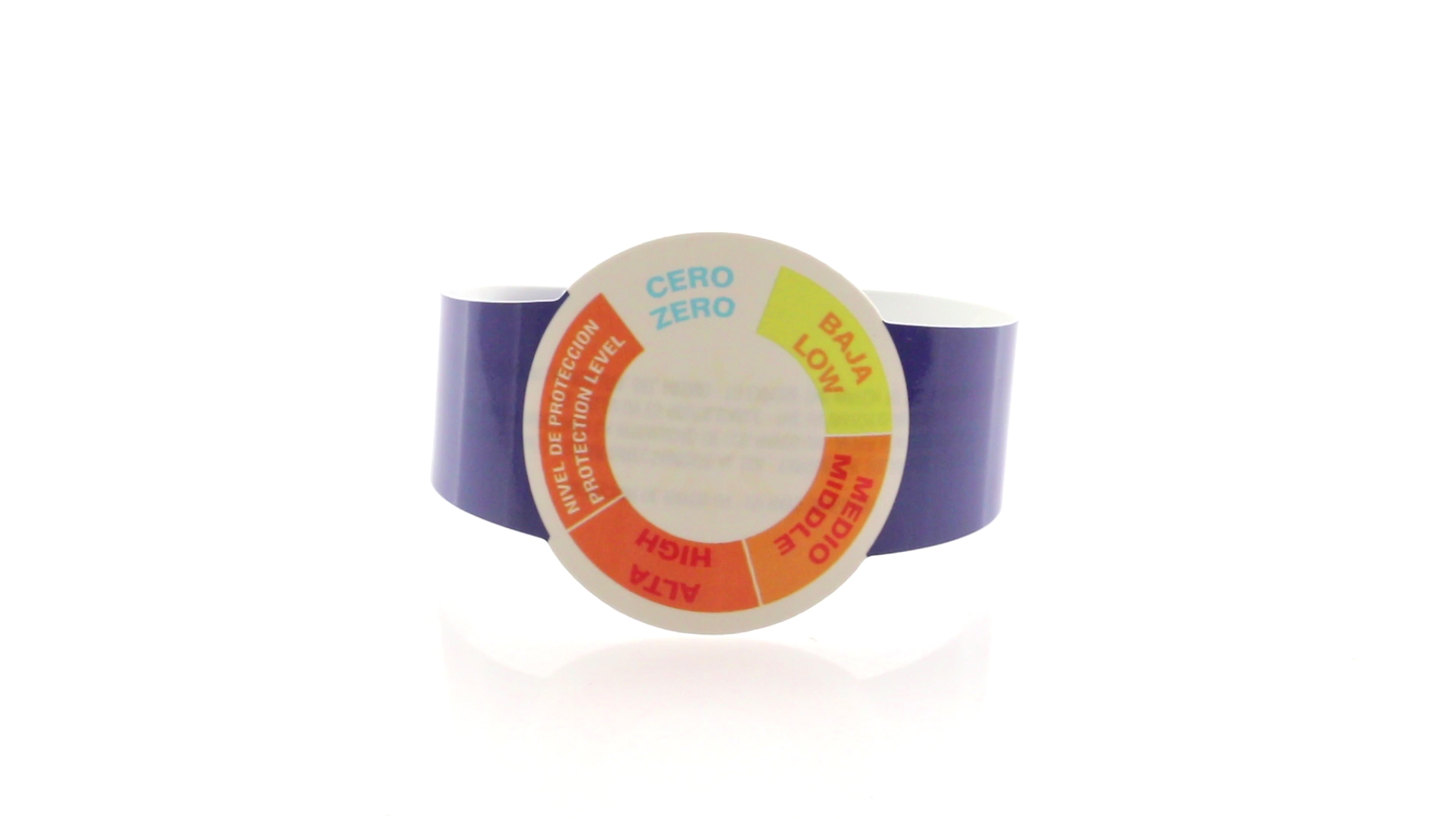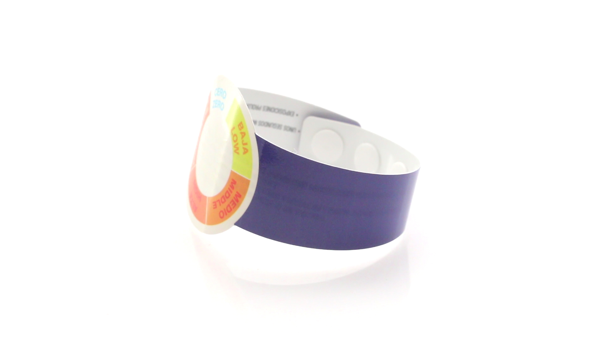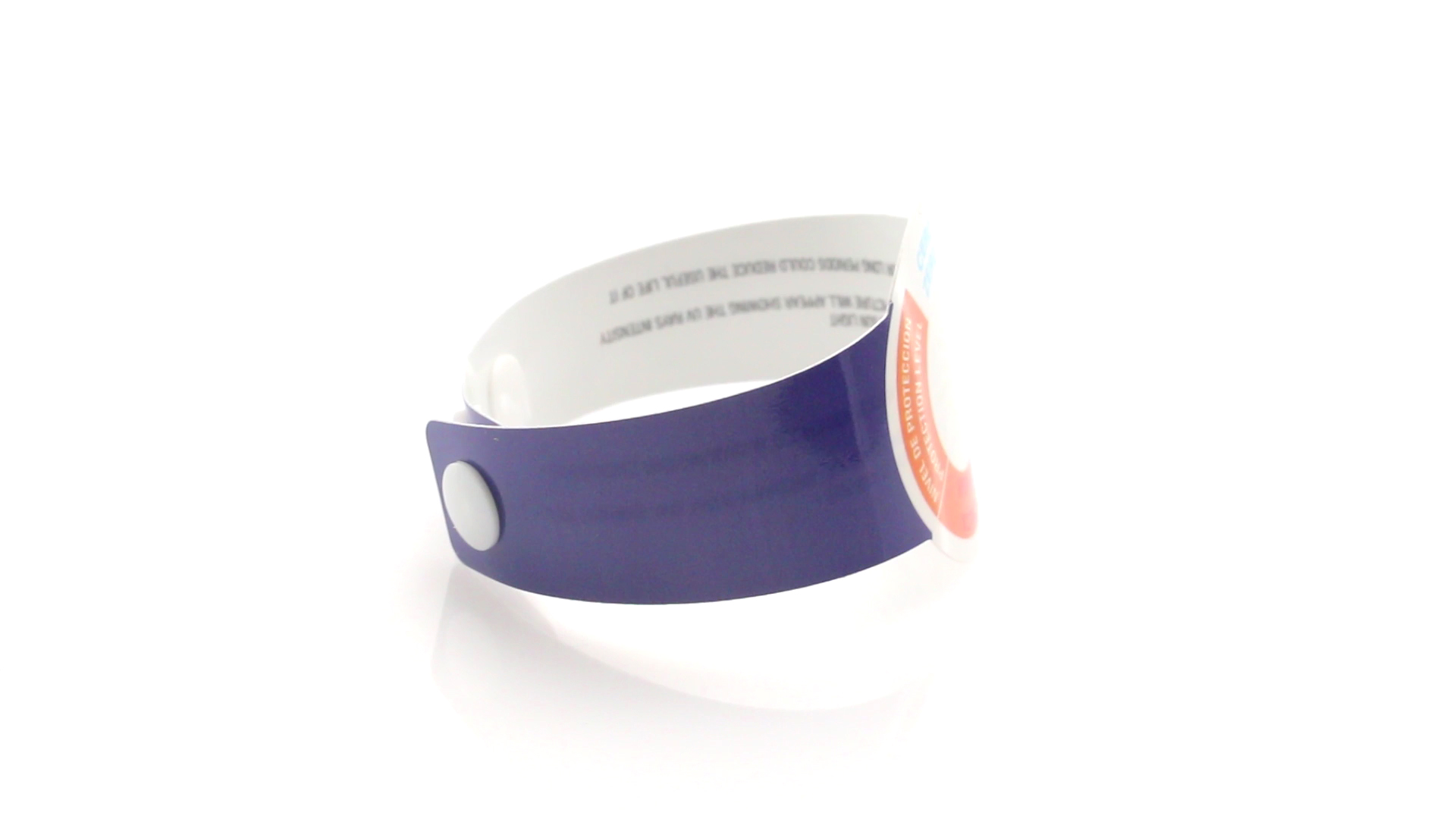 Verstellbares Armband mit UV-Strahlungsmesser in verschiedenen kräftigen Farben. Mit Druckknopfverschluss.