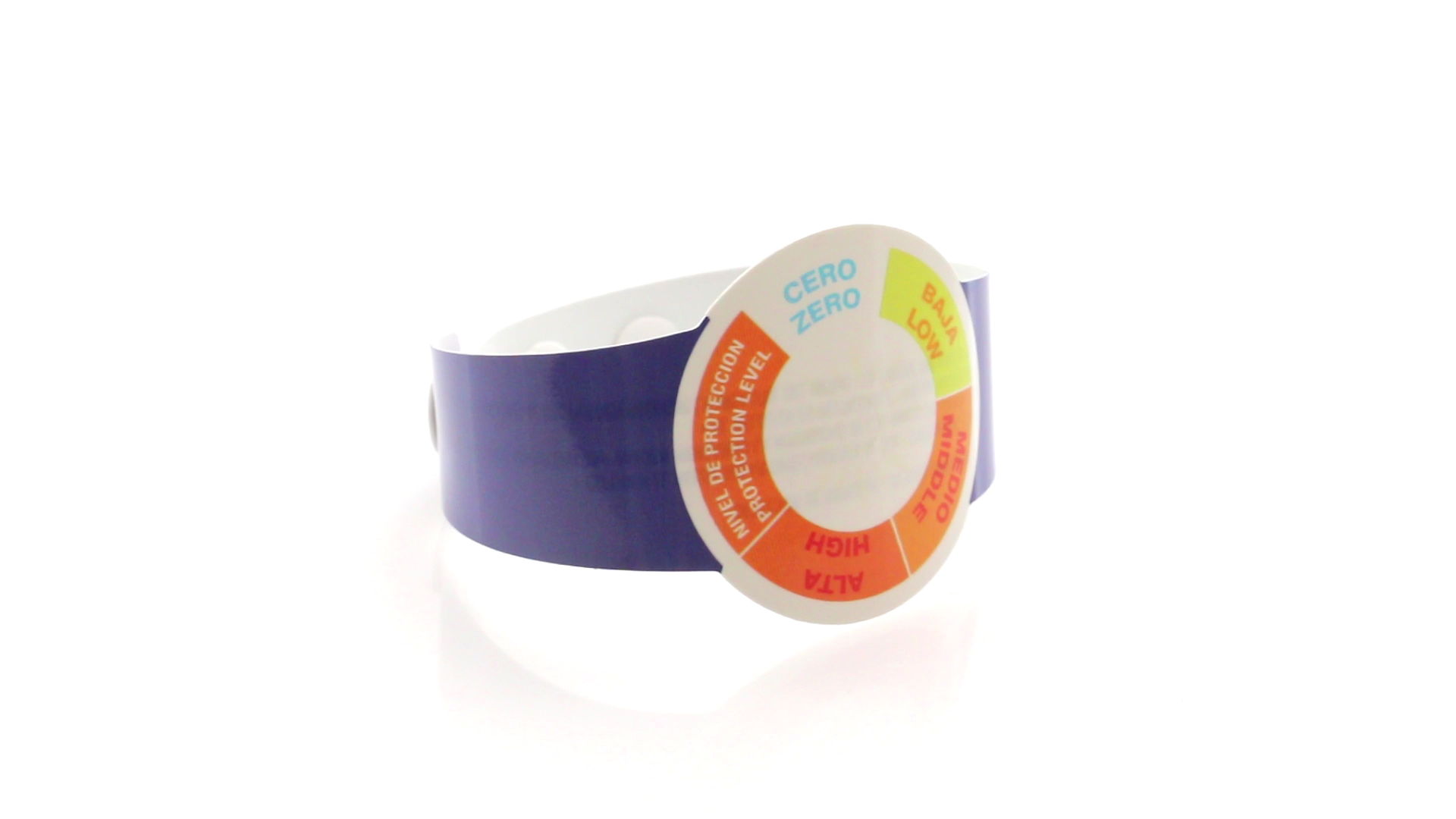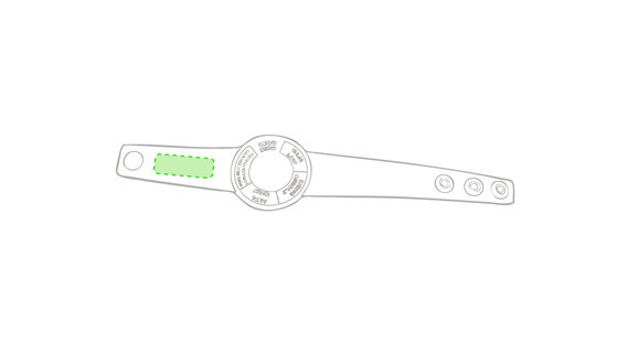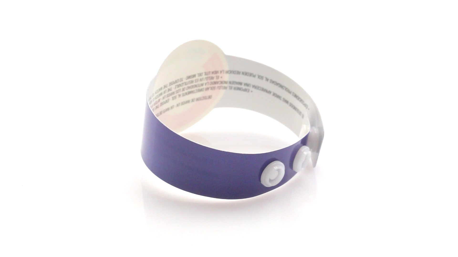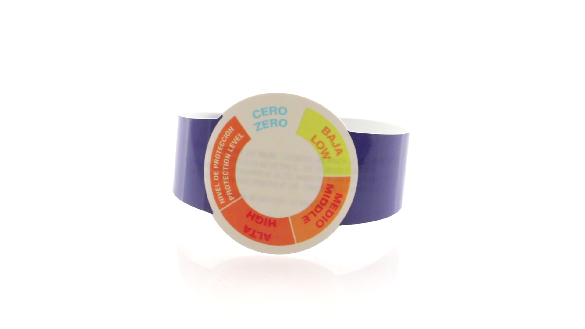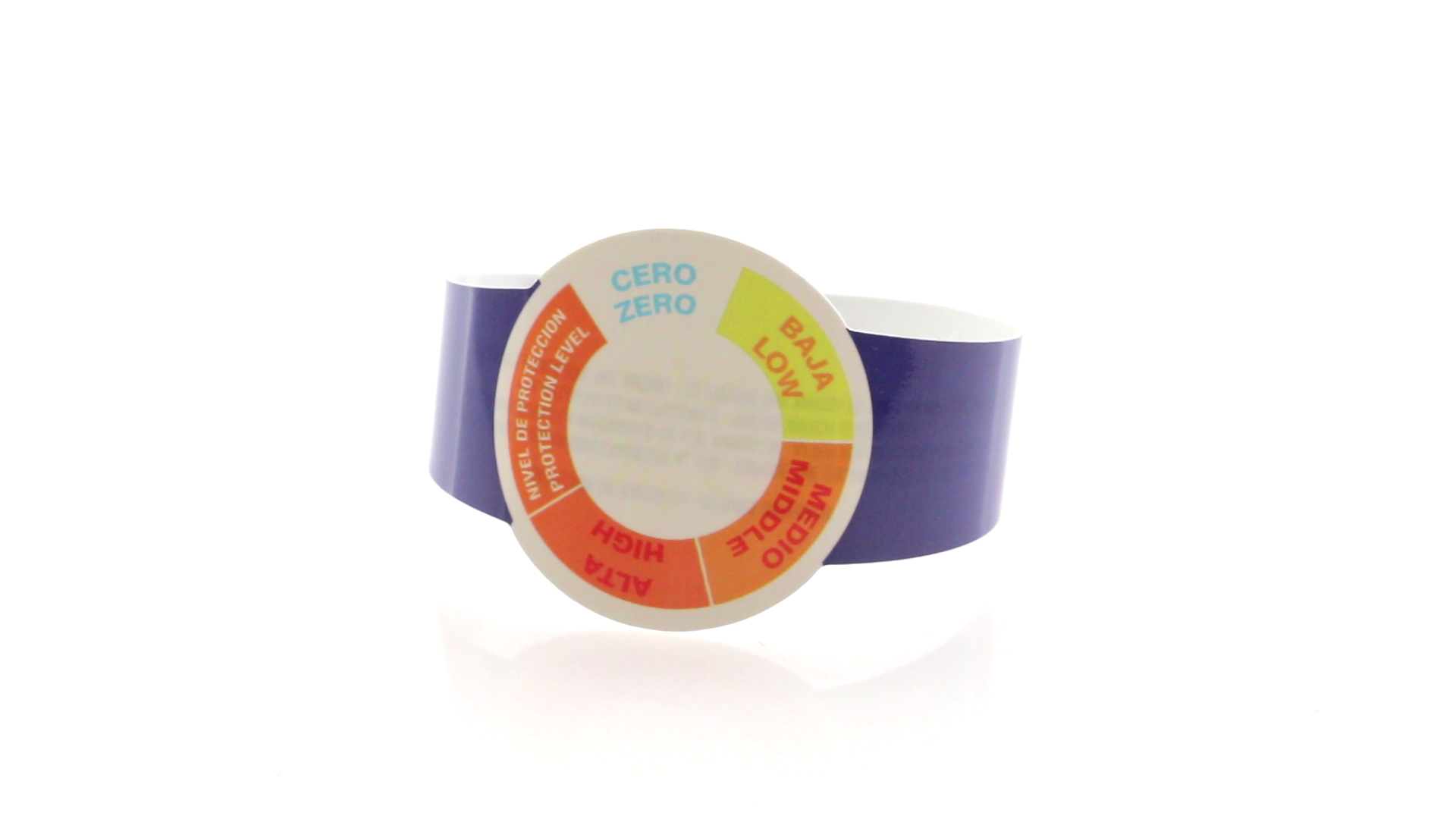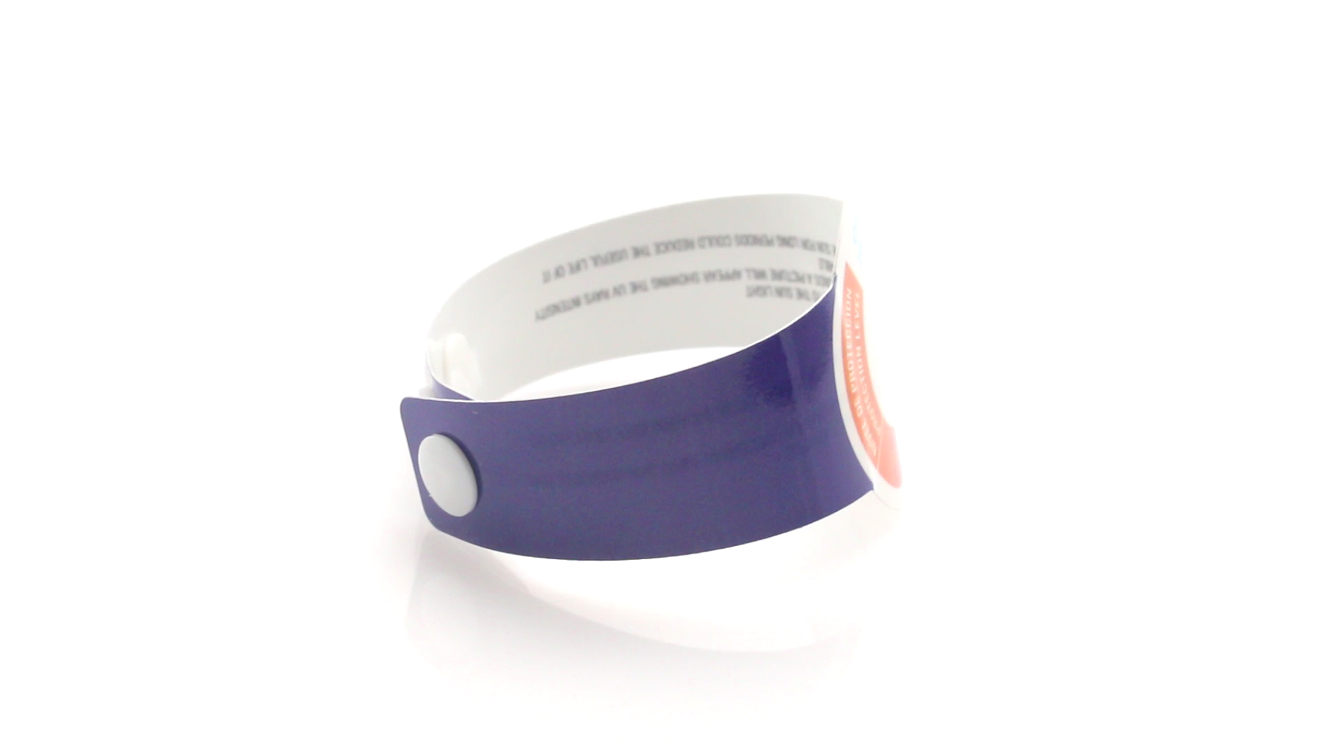 Verstellbares Armband mit UV-Strahlungsmesser in verschiedenen kräftigen Farben. Mit Druckknopfverschluss.