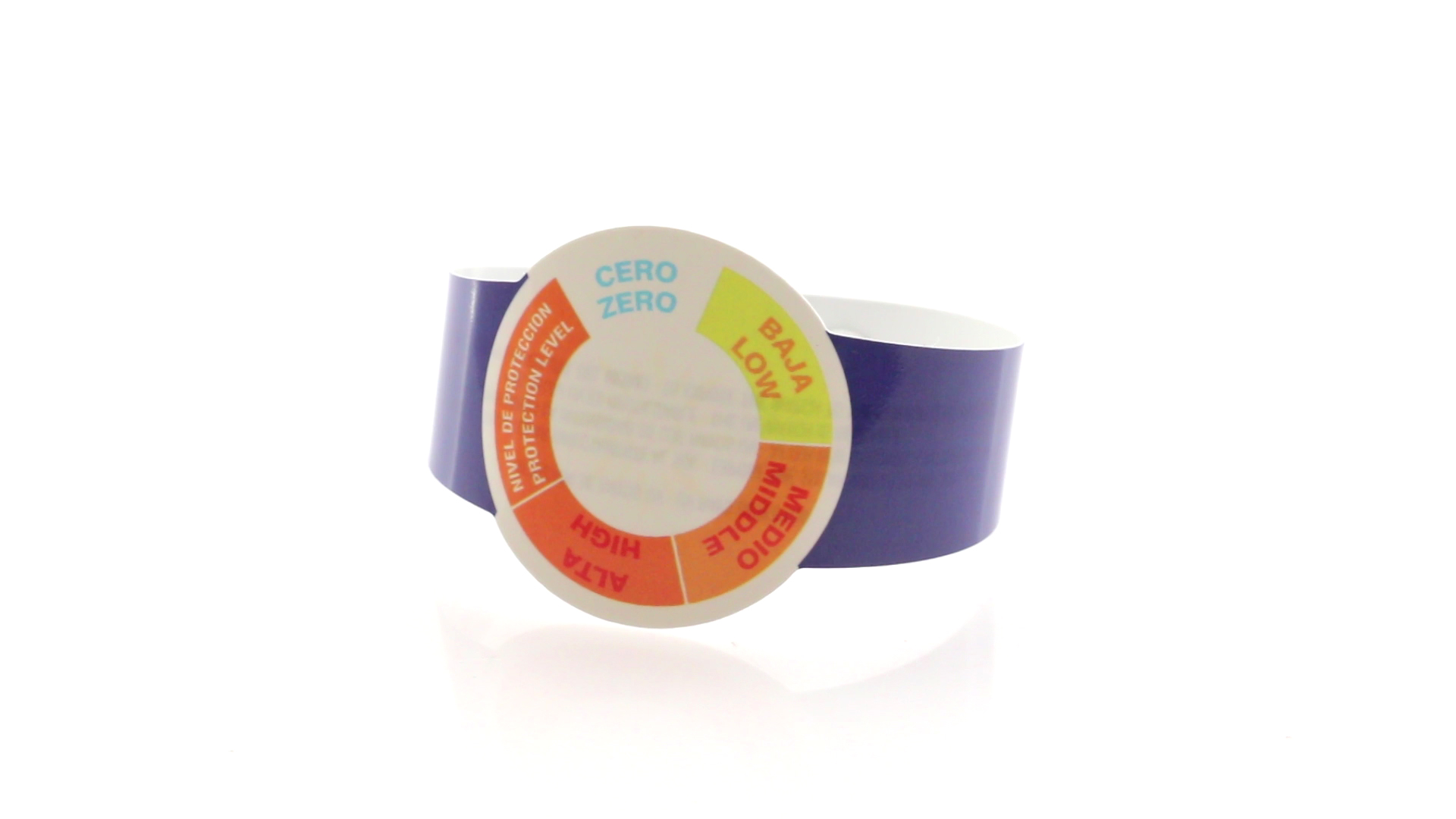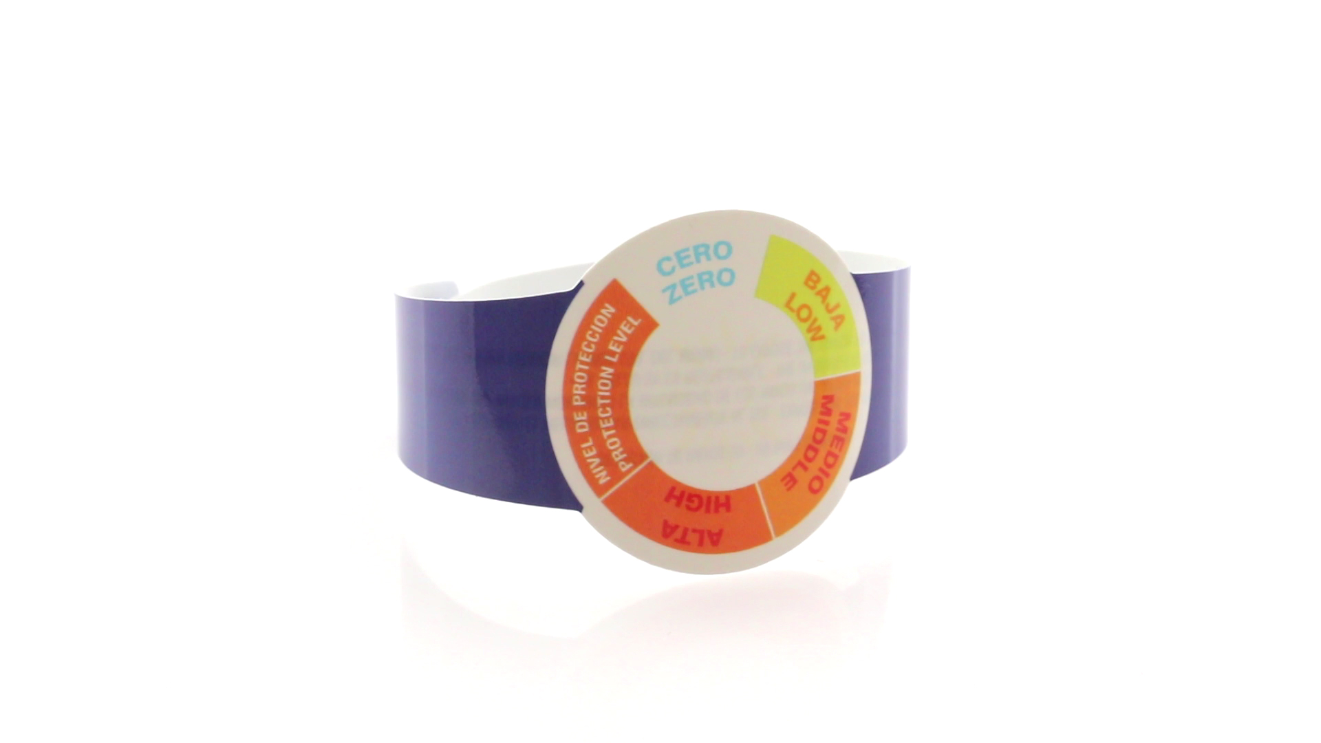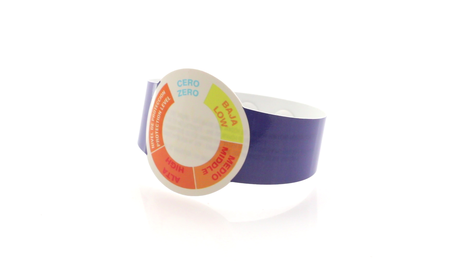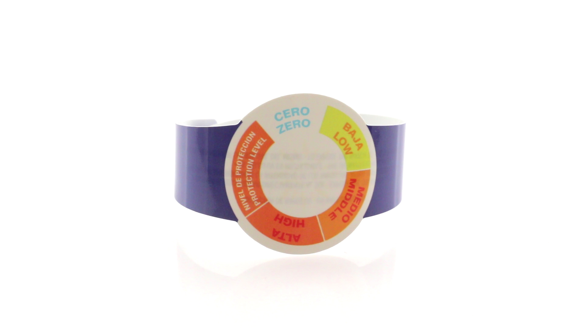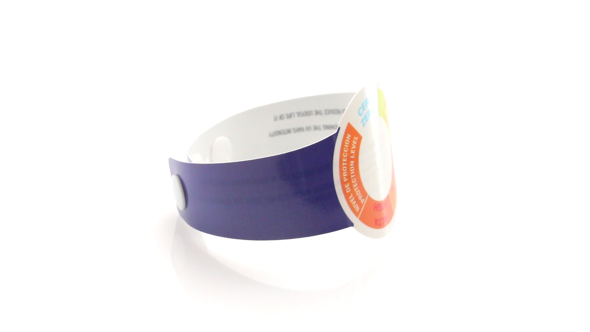Verstellbares Armband mit UV-Strahlungsmesser in verschiedenen kräftigen Farben. Mit Druckknopfverschluss.