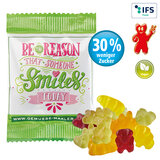Fruchtgummi ohne Gelatine mit 30 % weniger Zucker, im Vergleich zu herkömmlichem Fruchtgummi, mit Aromen und färbenden Pflanzenauszügen, farblich und geschmacklich bunt gemischt, in glänzend- oder matt-kaschiertem transparentem alternativ weissem Werbetütchen verpackt.