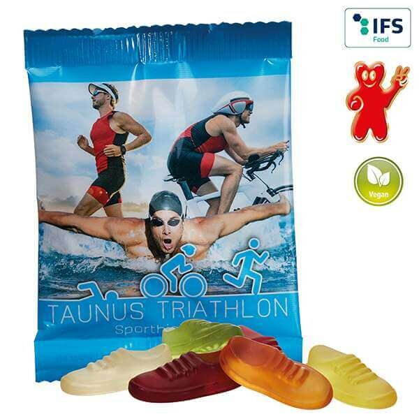 Fruchtgummi-Joggingschuhe ohne Gelatine, mit Aromen und färbenden Pflanzenauszügen, farblich und geschmacklich bunt gemischt, in transparentem alternativ weissem Werbetütchen verpackt.