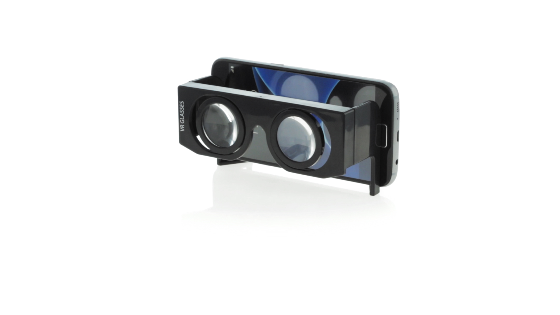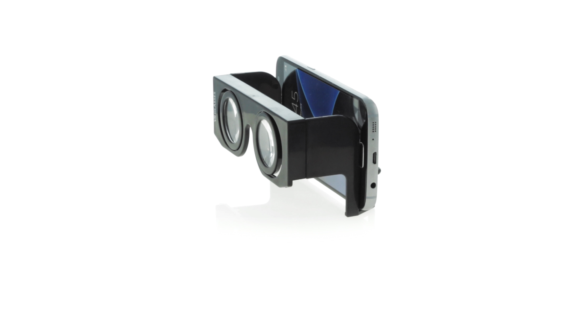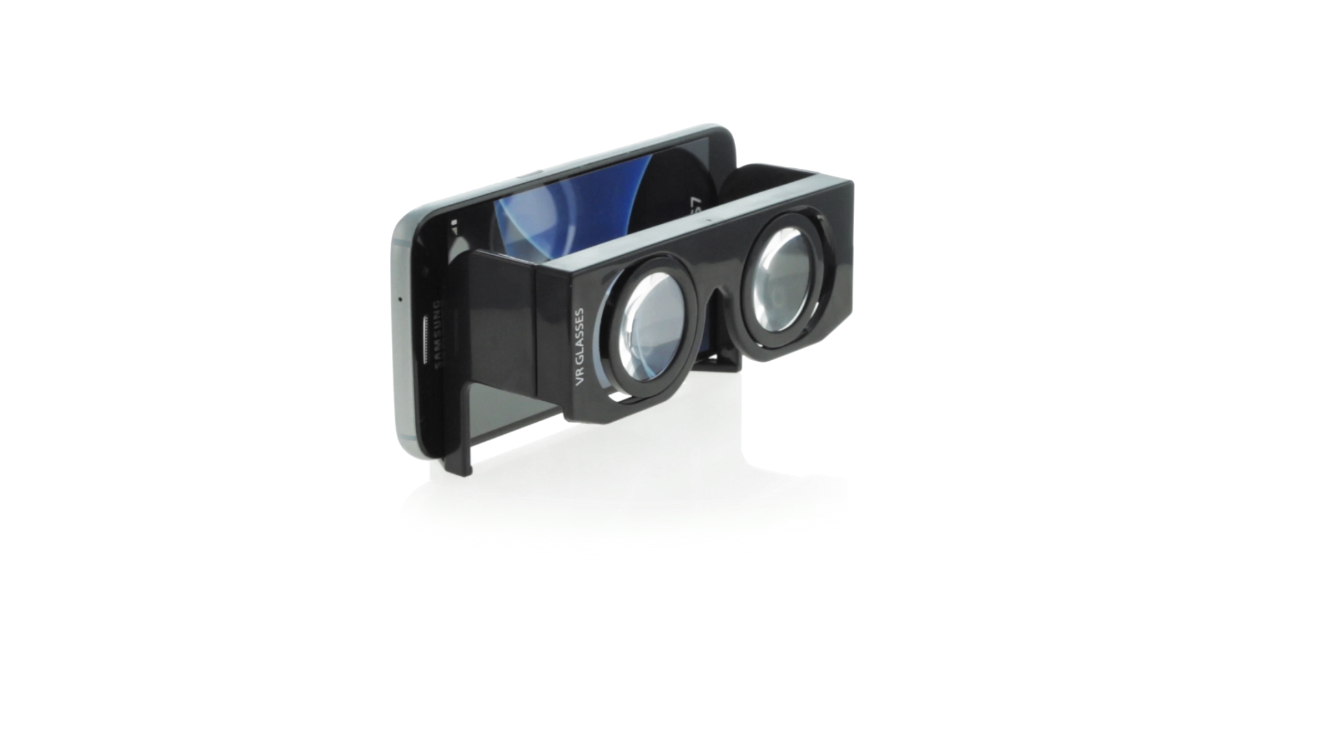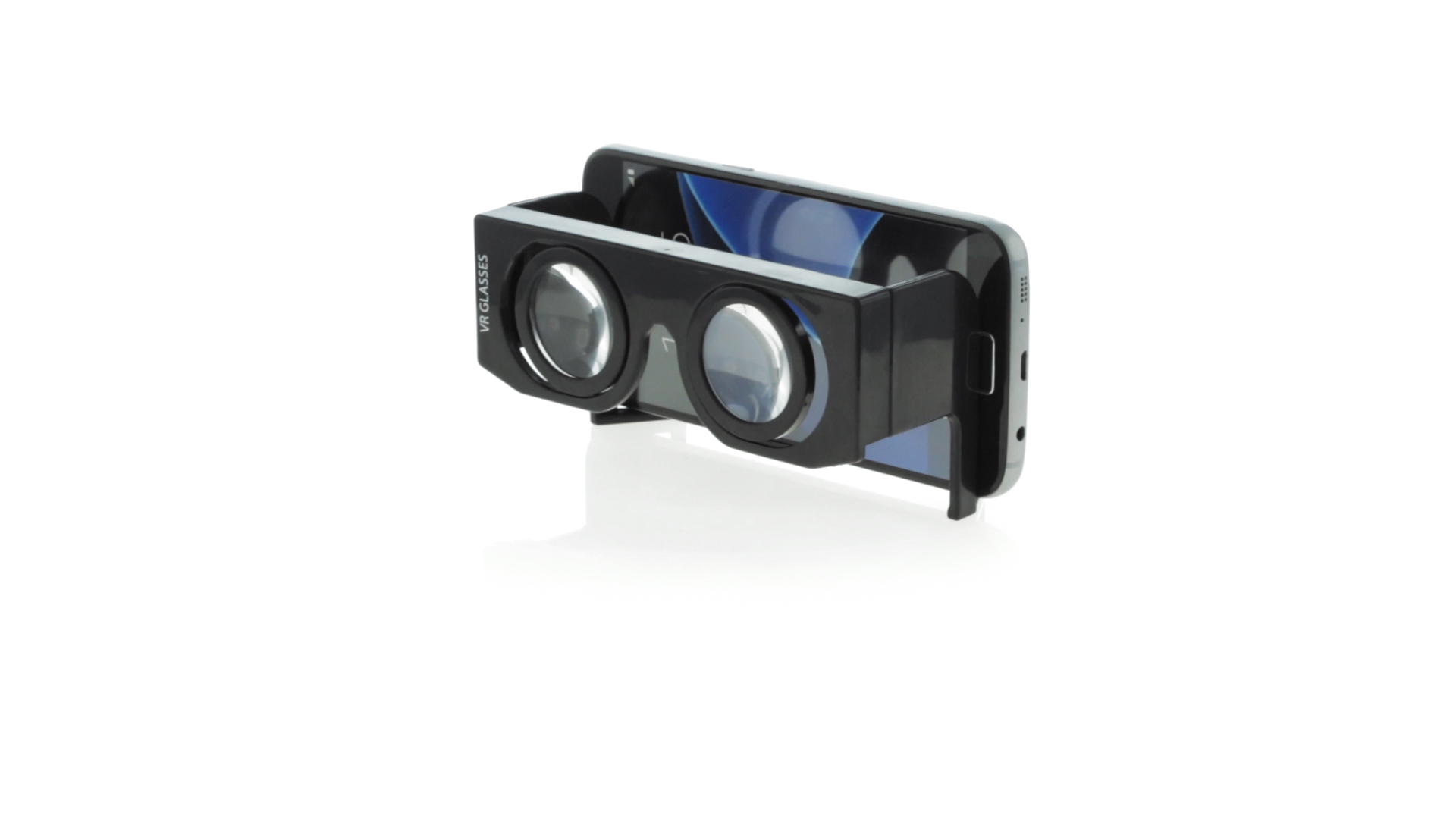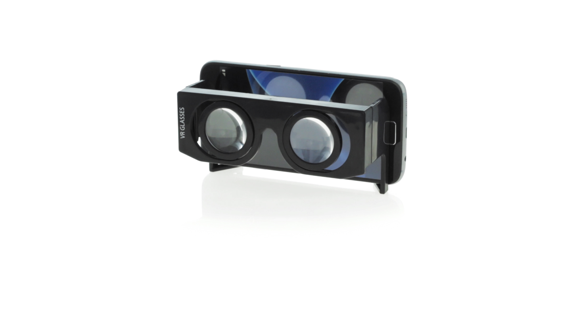 Faltbare Virtual-Reality-Brille mit verstellbaren Gläsern. Kompatibel mit allen Arten von Smartphones. Geeignet für 3D- und 360º-Videos. Präsentiert in einer individuellen Kunststoffhülle mit grosser Druckfläche.