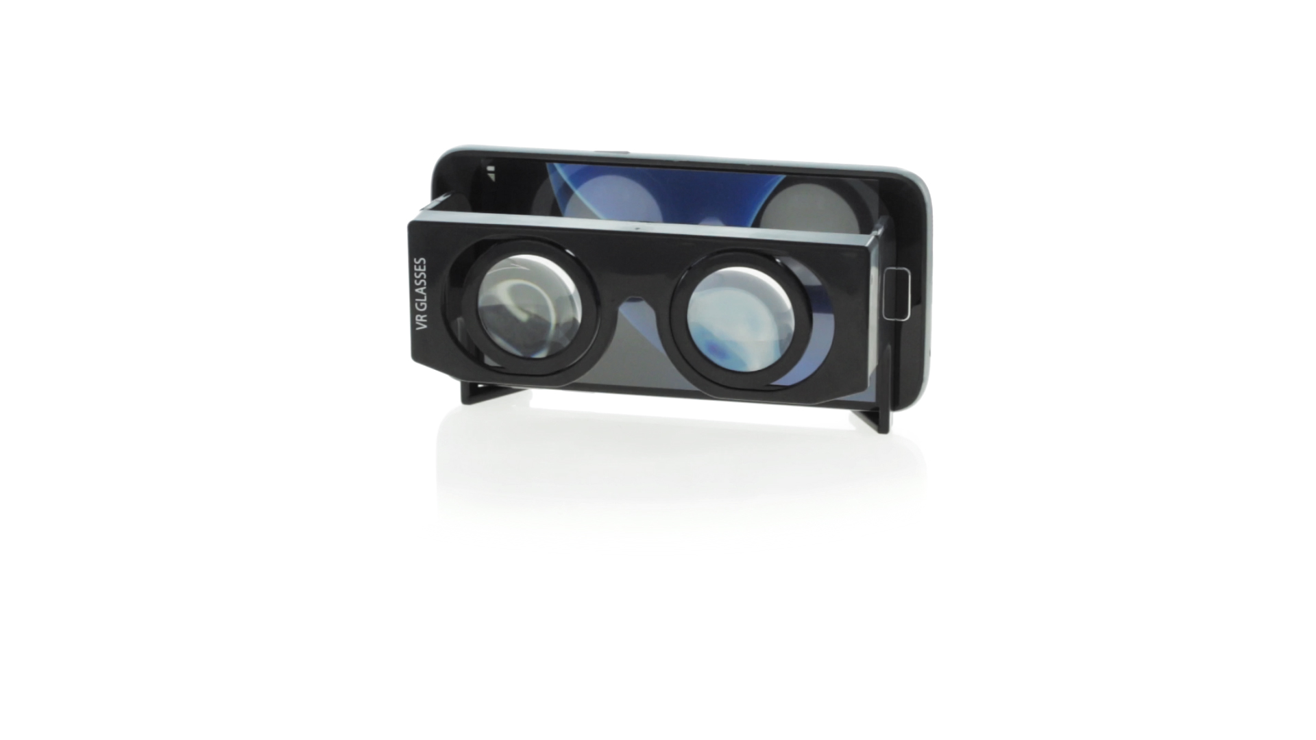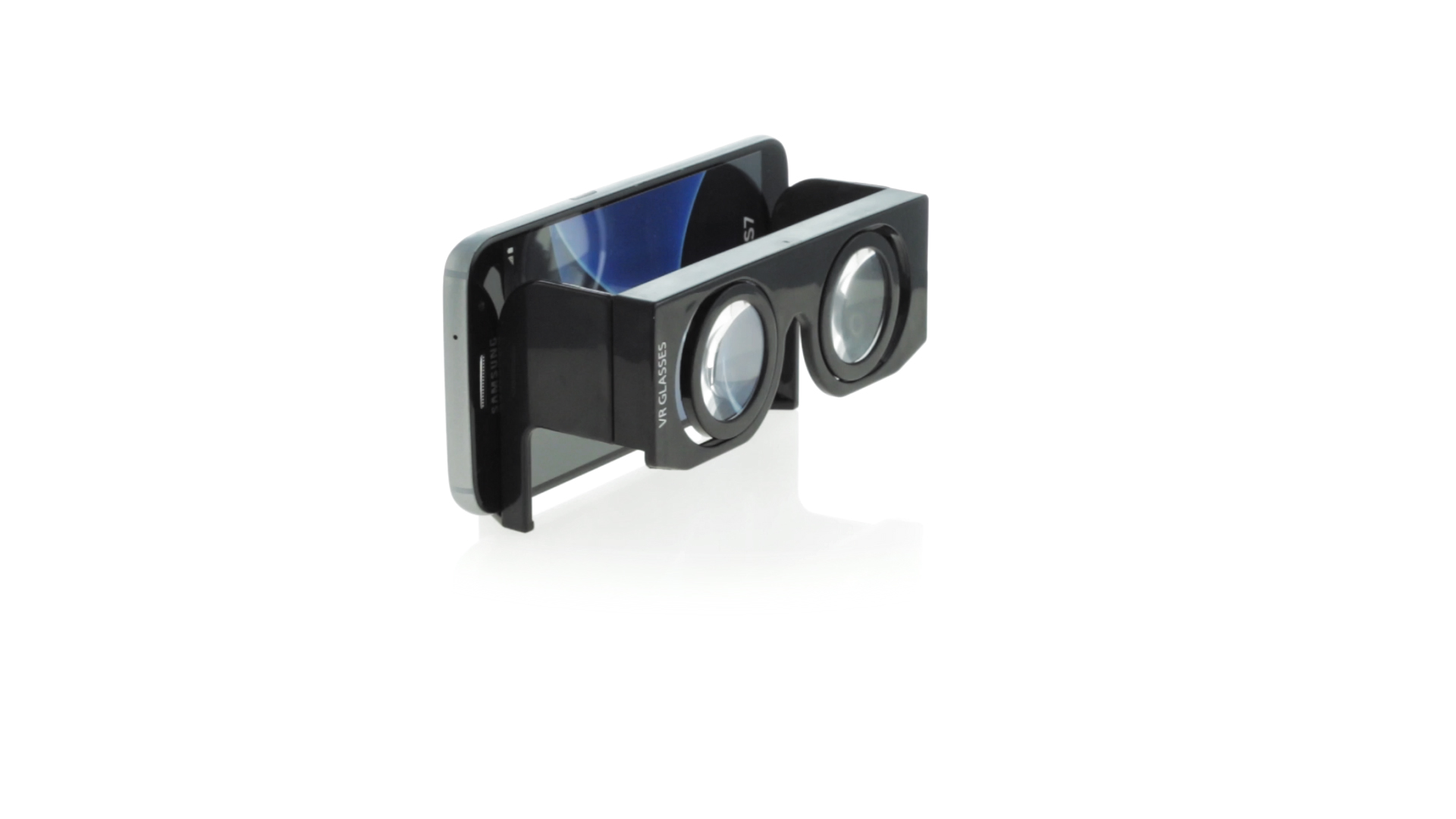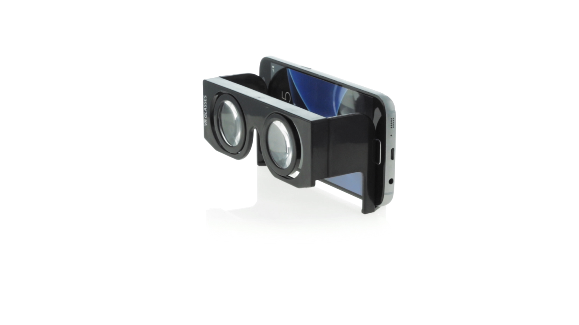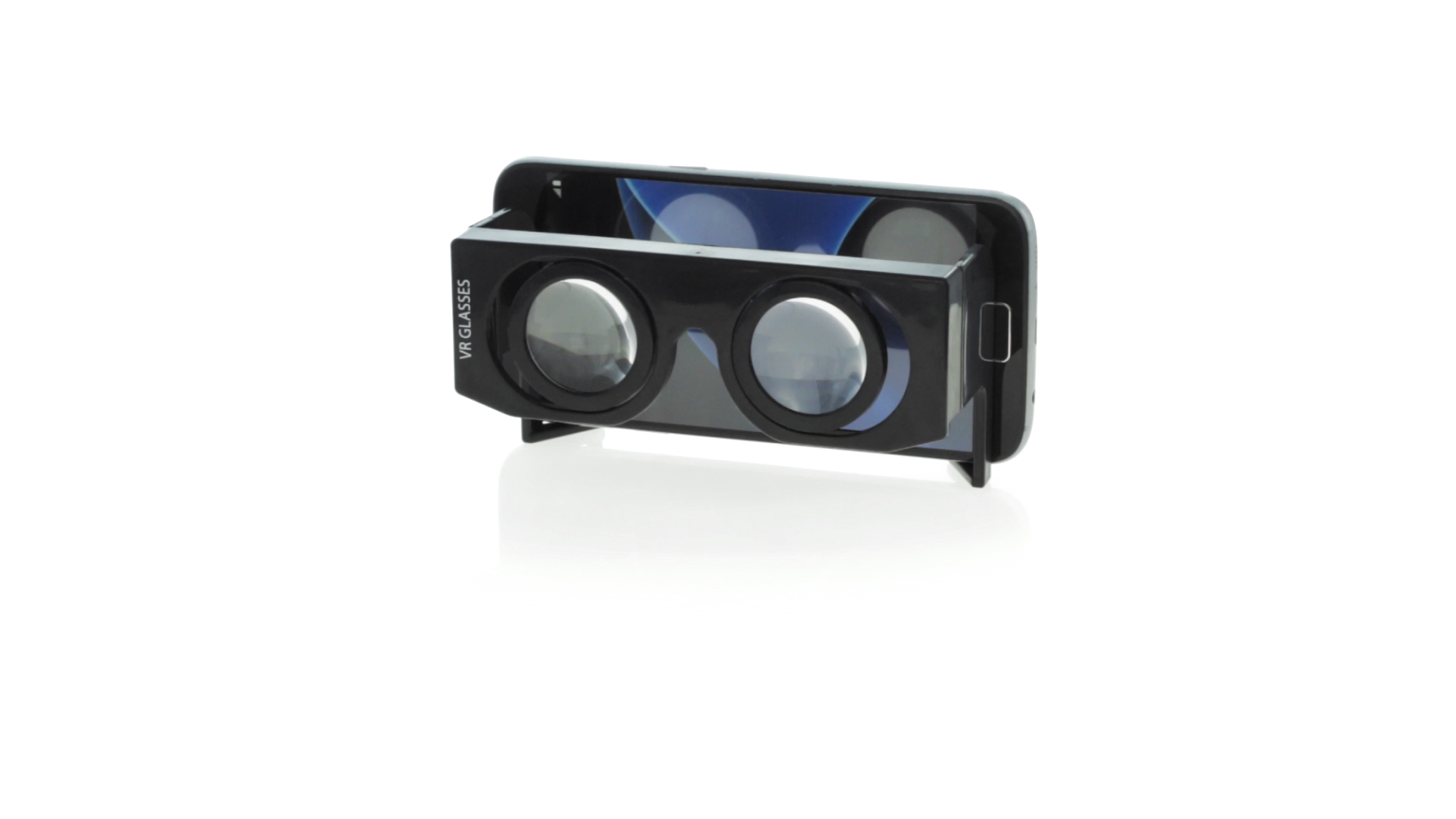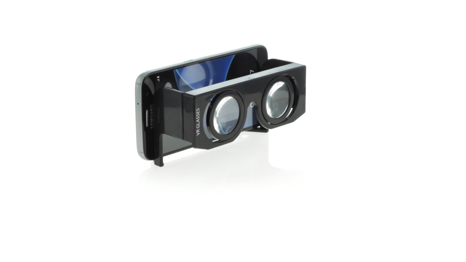 Faltbare Virtual-Reality-Brille mit verstellbaren Gläsern. Kompatibel mit allen Arten von Smartphones. Geeignet für 3D- und 360º-Videos. Präsentiert in einer individuellen Kunststoffhülle mit grosser Druckfläche.
