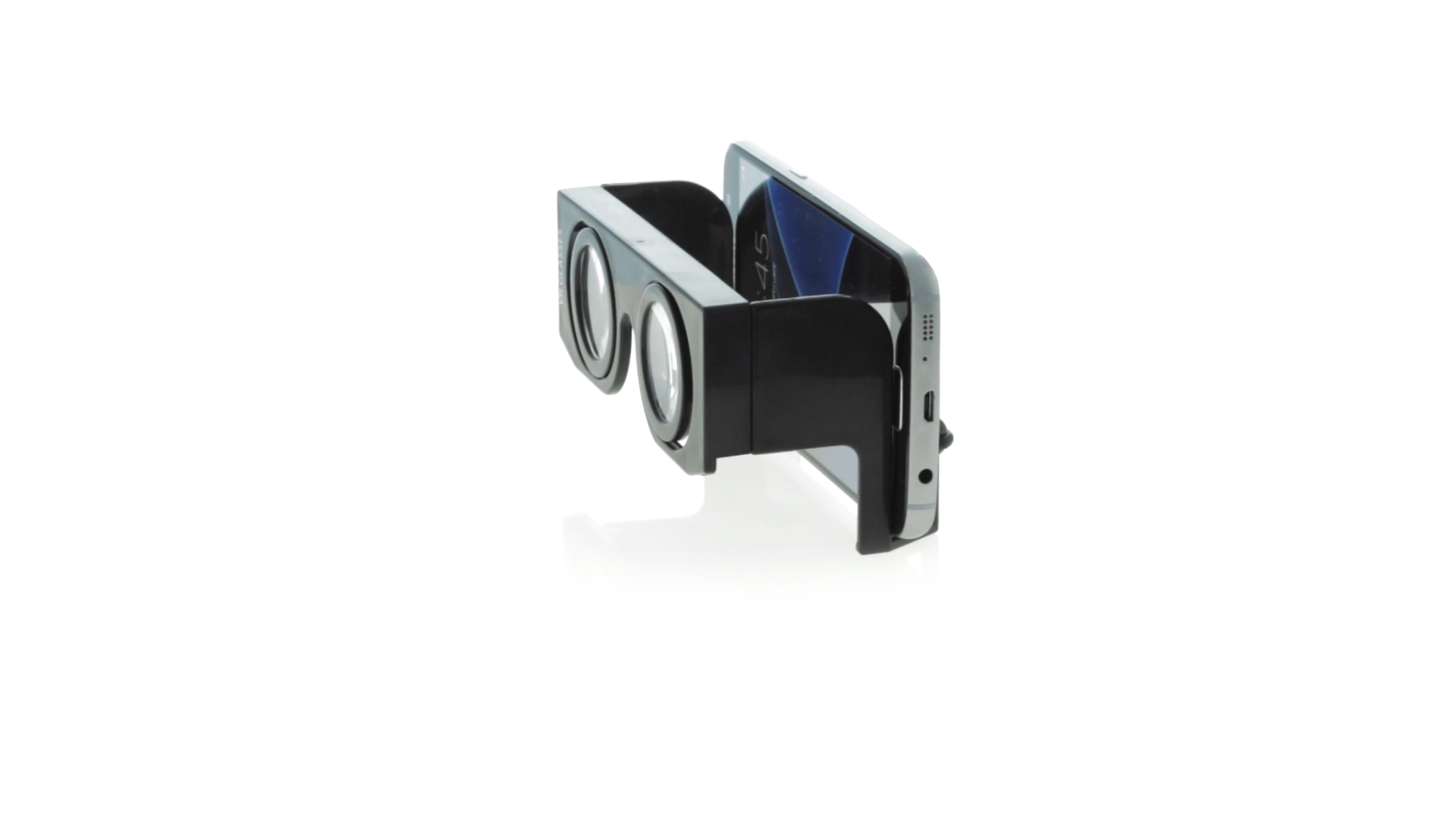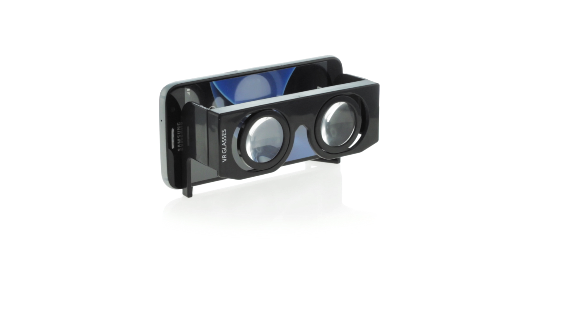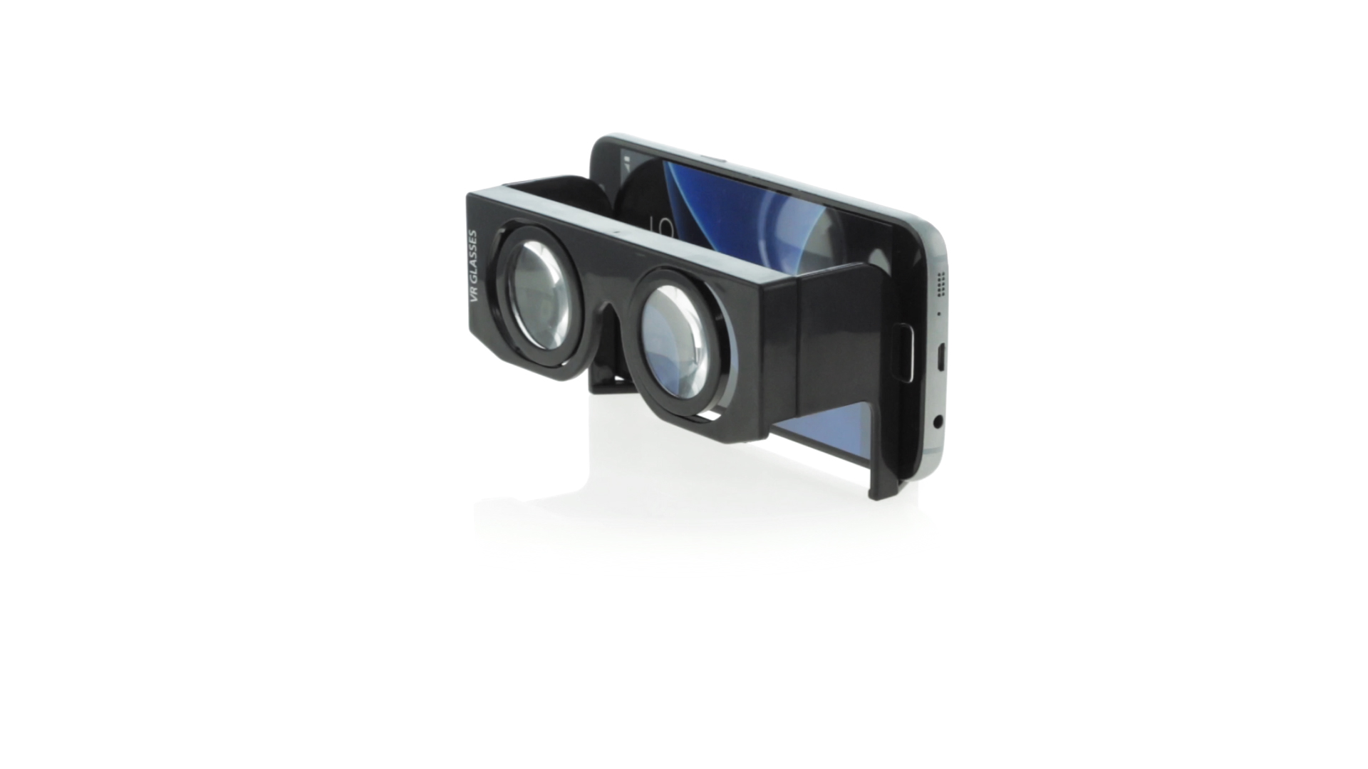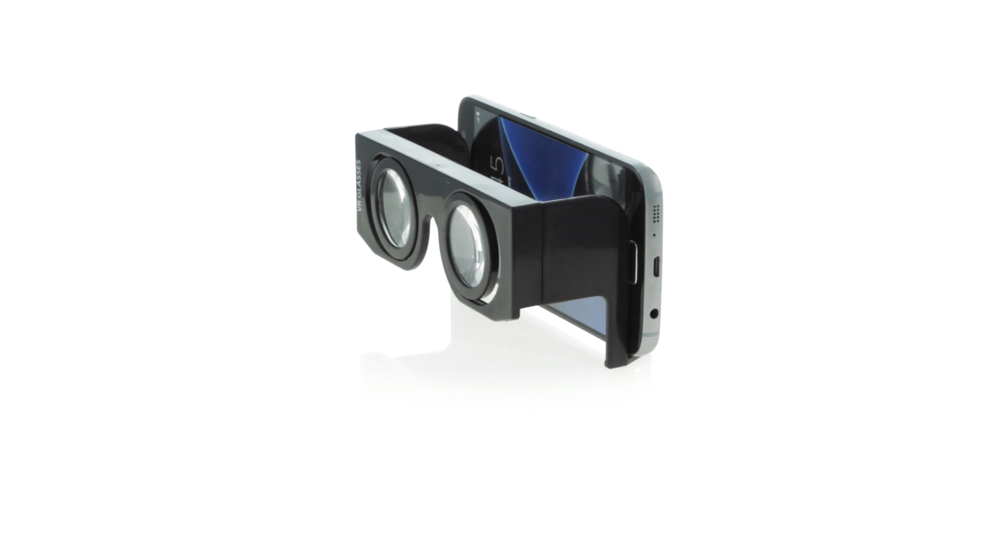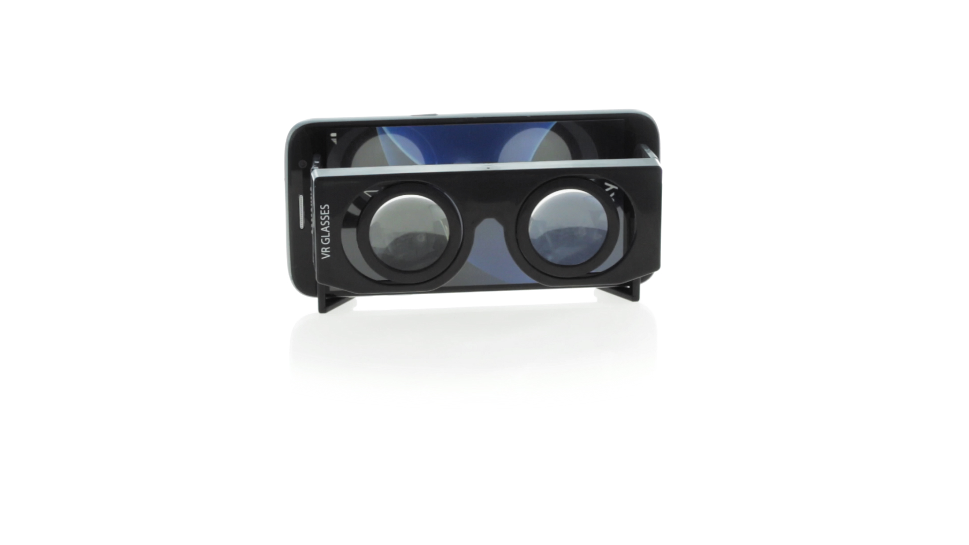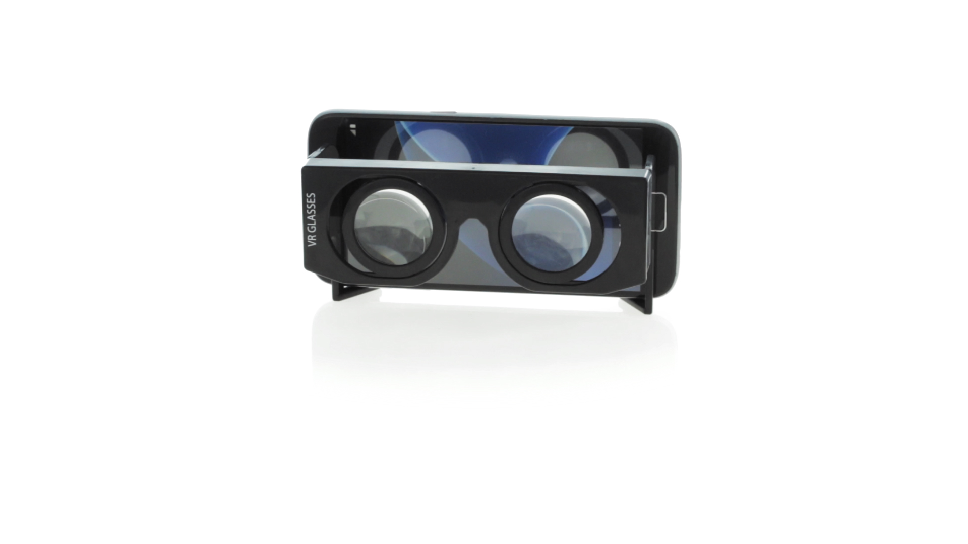 Faltbare Virtual-Reality-Brille mit verstellbaren Gläsern. Kompatibel mit allen Arten von Smartphones. Geeignet für 3D- und 360º-Videos. Präsentiert in einer individuellen Kunststoffhülle mit grosser Druckfläche.