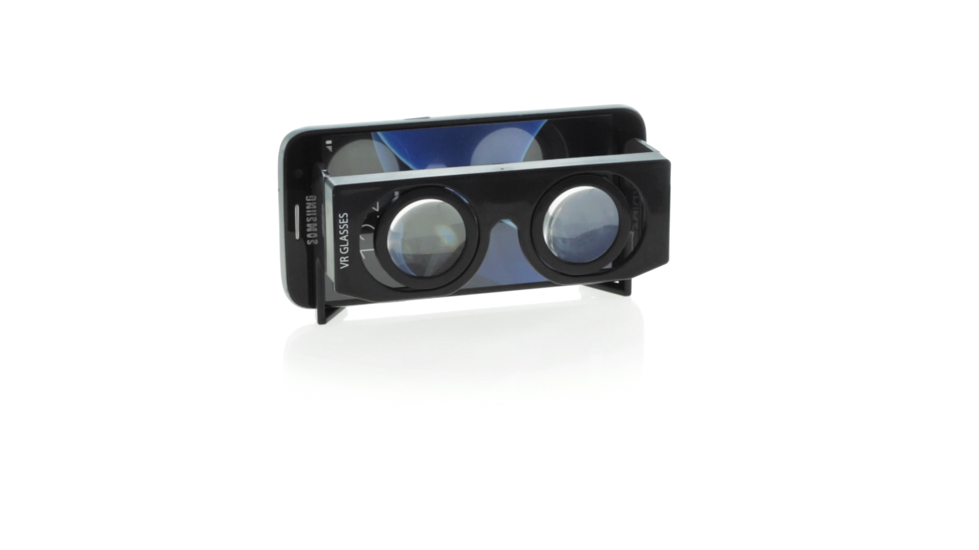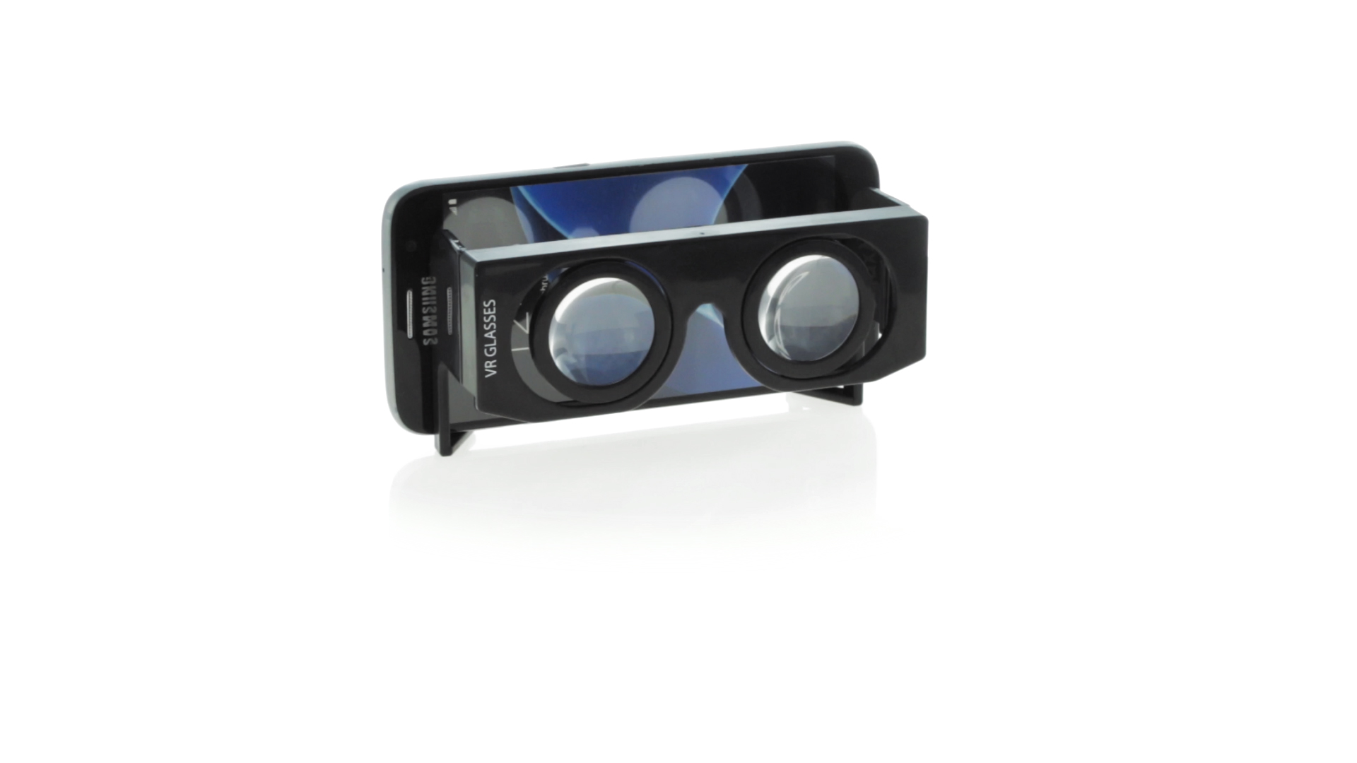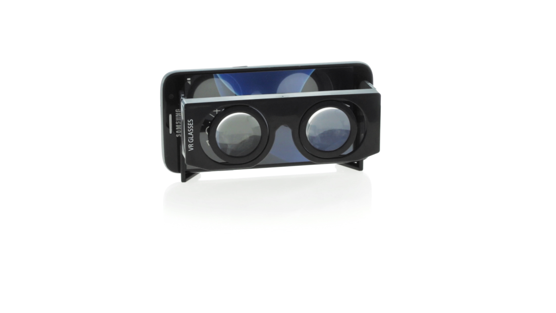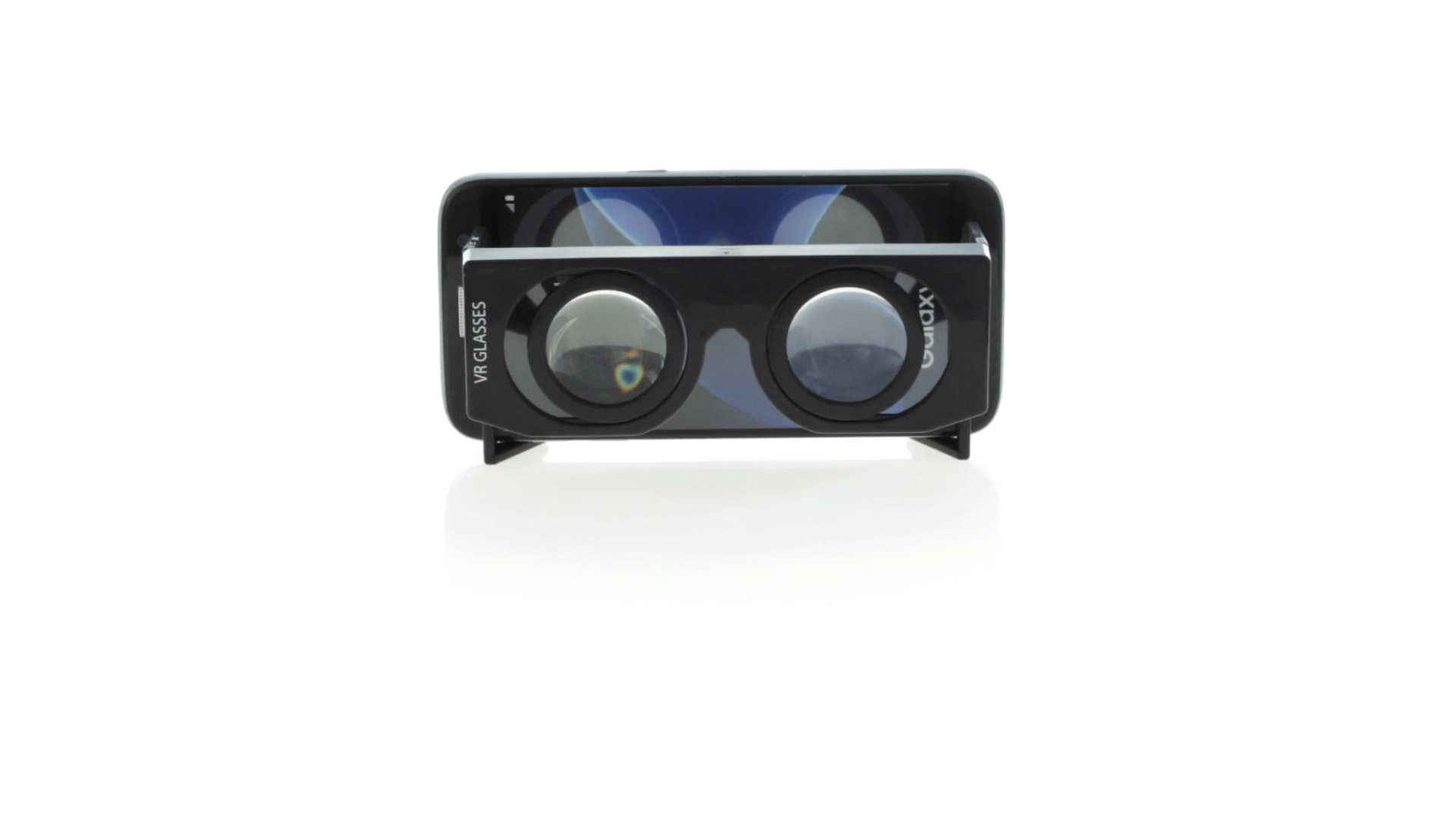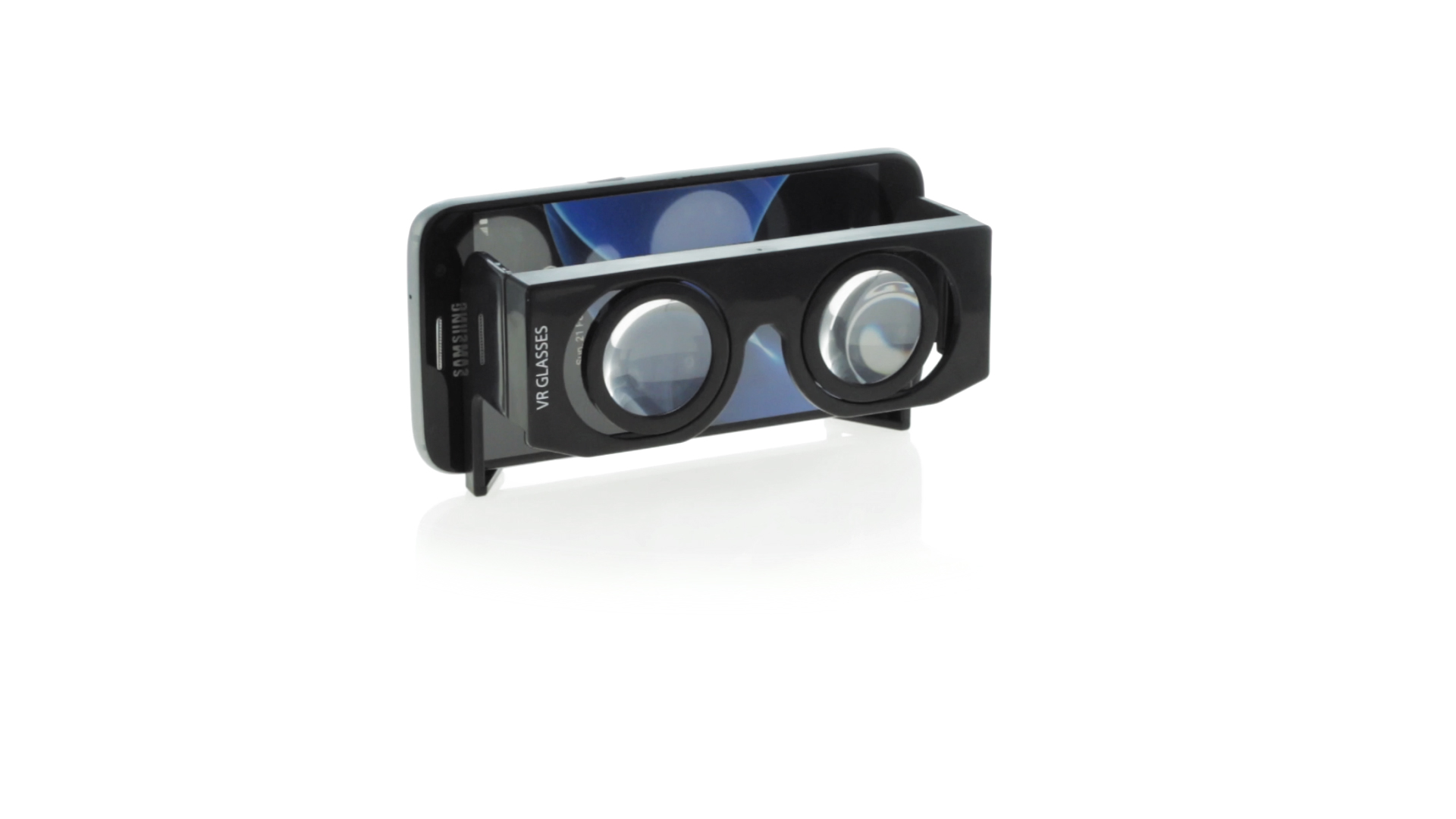 Faltbare Virtual-Reality-Brille mit verstellbaren Gläsern. Kompatibel mit allen Arten von Smartphones. Geeignet für 3D- und 360º-Videos. Präsentiert in einer individuellen Kunststoffhülle mit grosser Druckfläche.