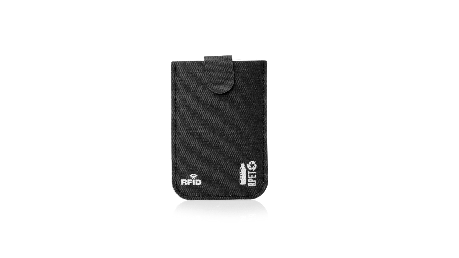 Elegant wallet and card holder made of RPET polyester with black finish. With magnet closure and capacity for 5 cards. Release mechanism by pulling the closure strap. RFID (Radio Frequency Identification) security technology that keeps card data safe. With the distinctive of RPET and RIFD outside.RPET material is made from recycled plastic, to encourage the reuse of plastic waste and help the sustainability of the planet.
