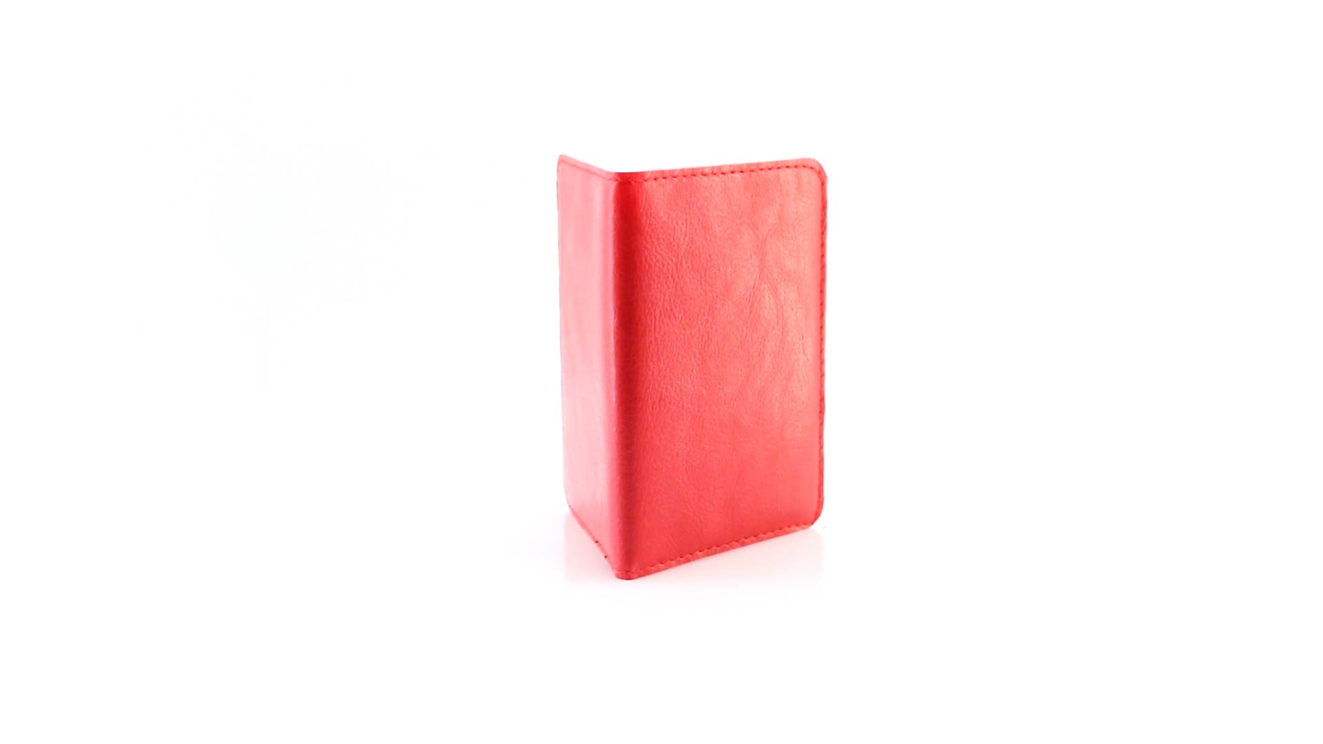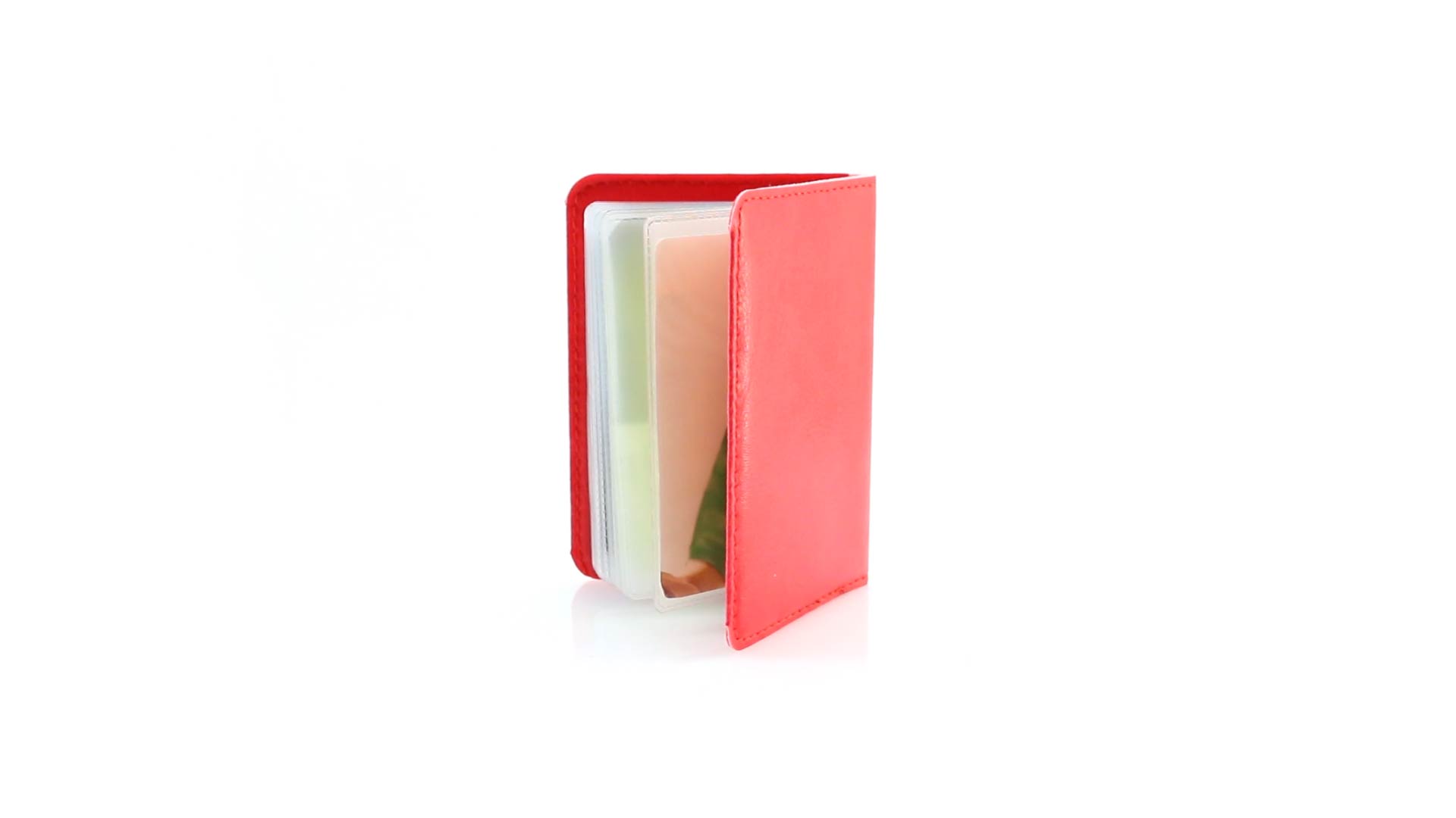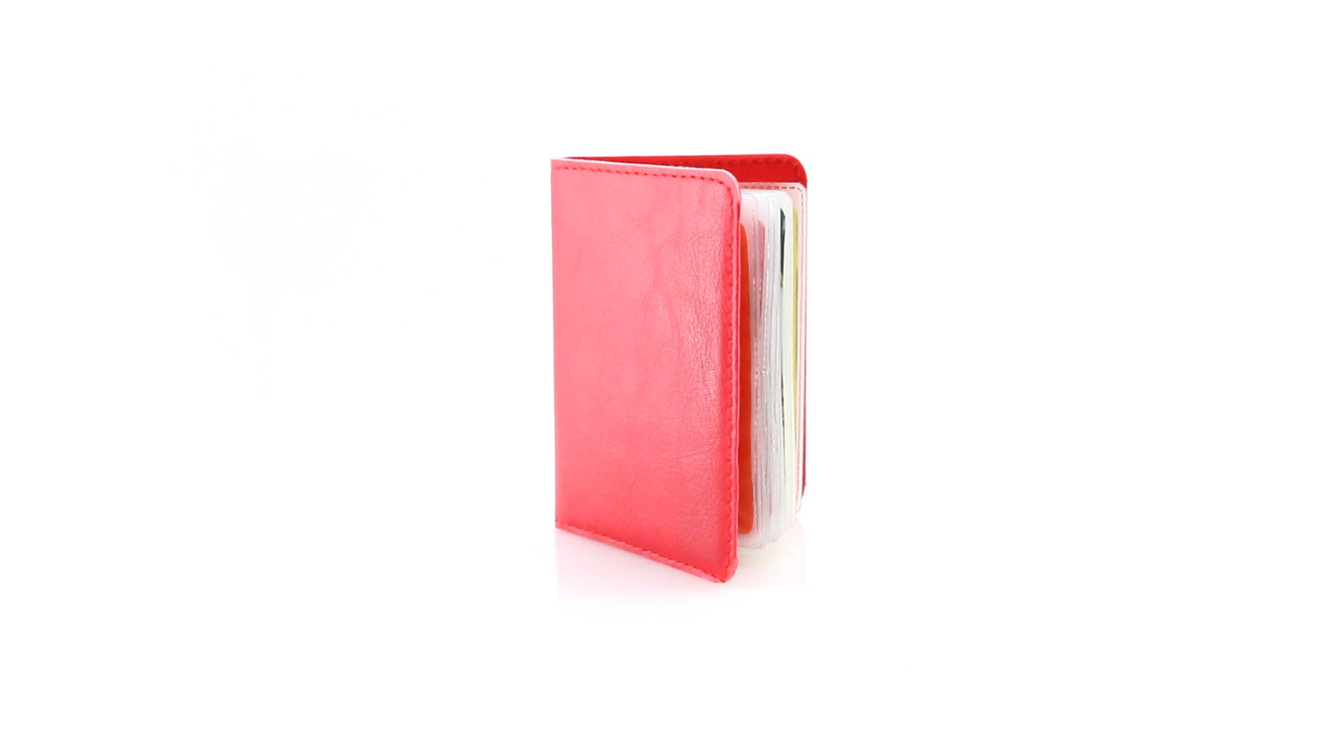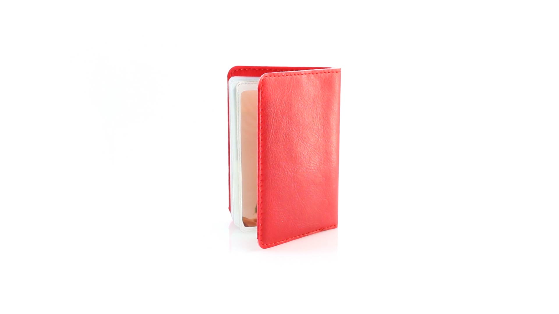 Kartenhalter aus weichem, glänzendem Kunstleder in auffälligen Farben mit 12 Innenfächer aus robustem, transparentem PVC.