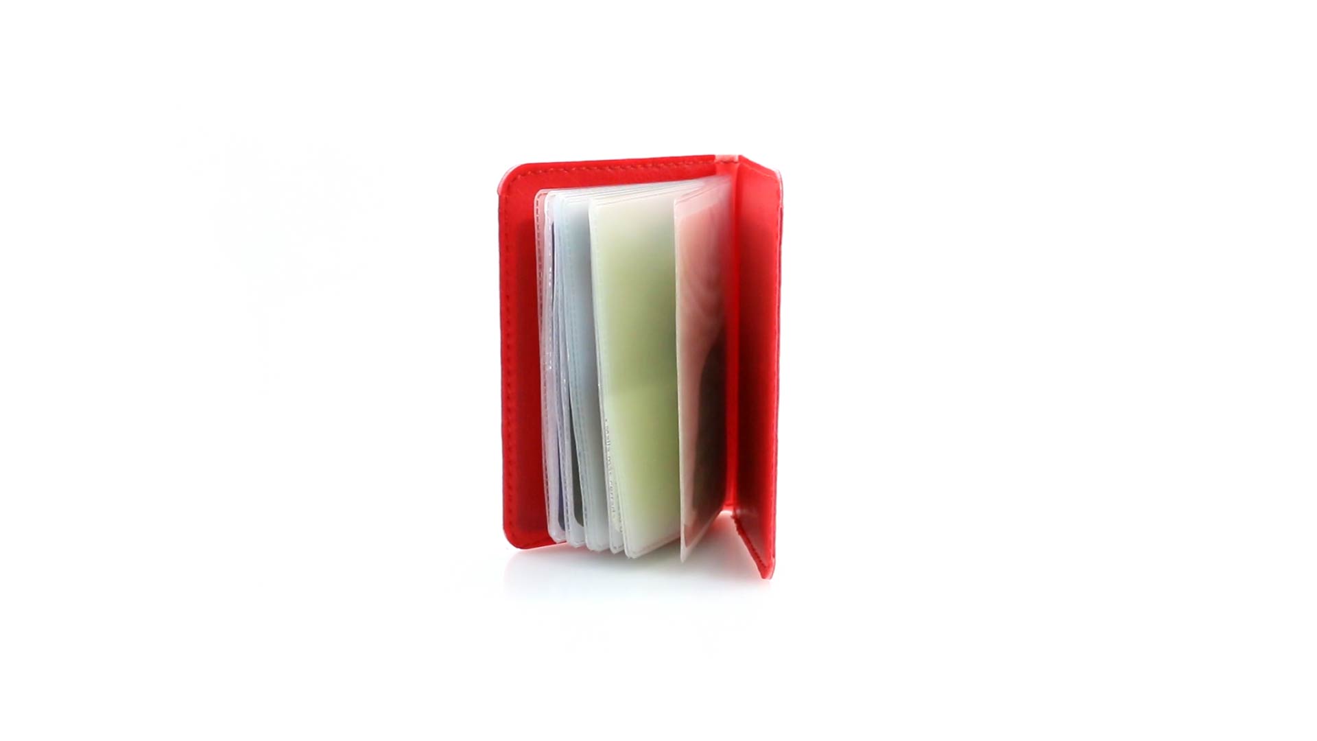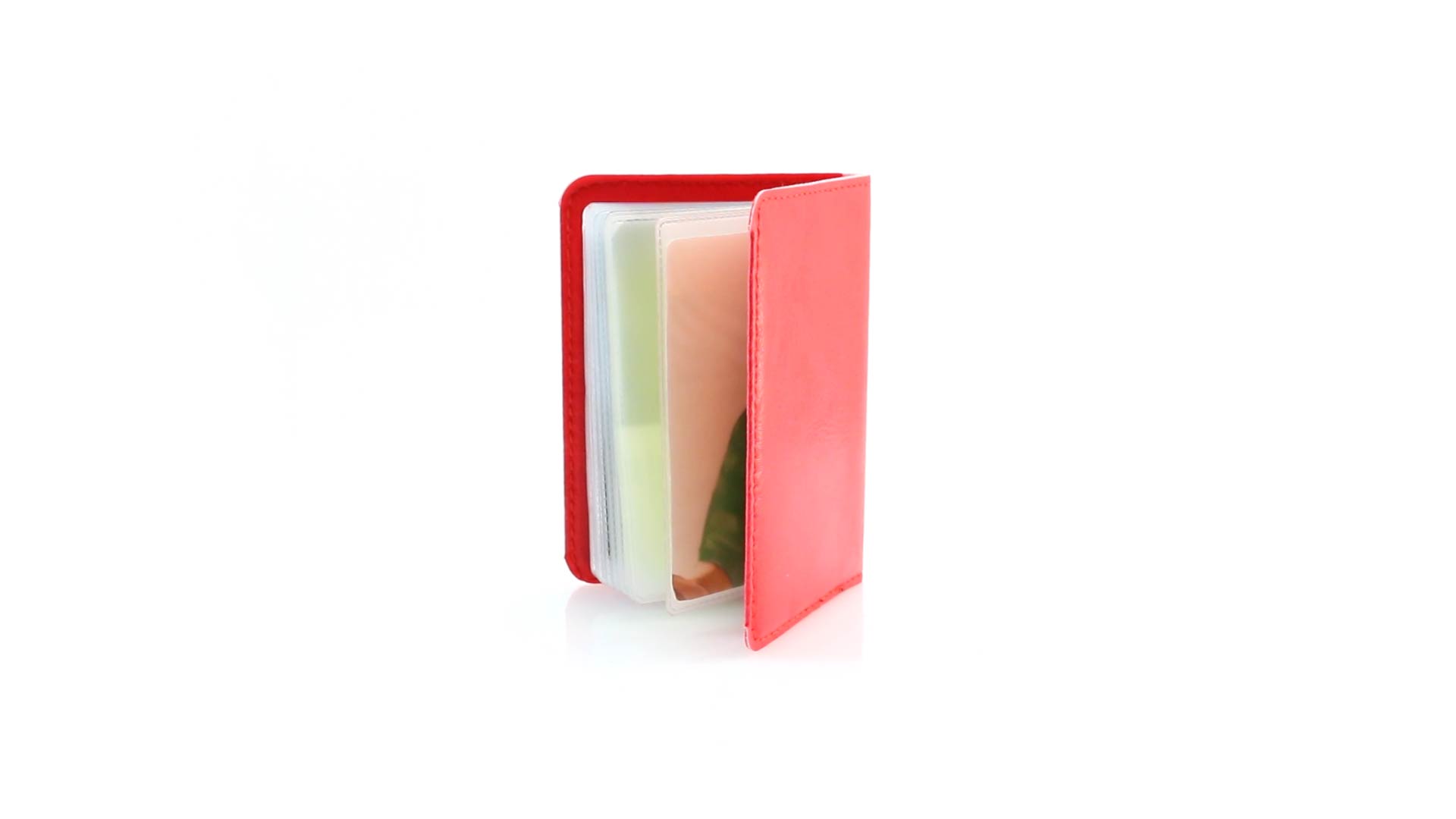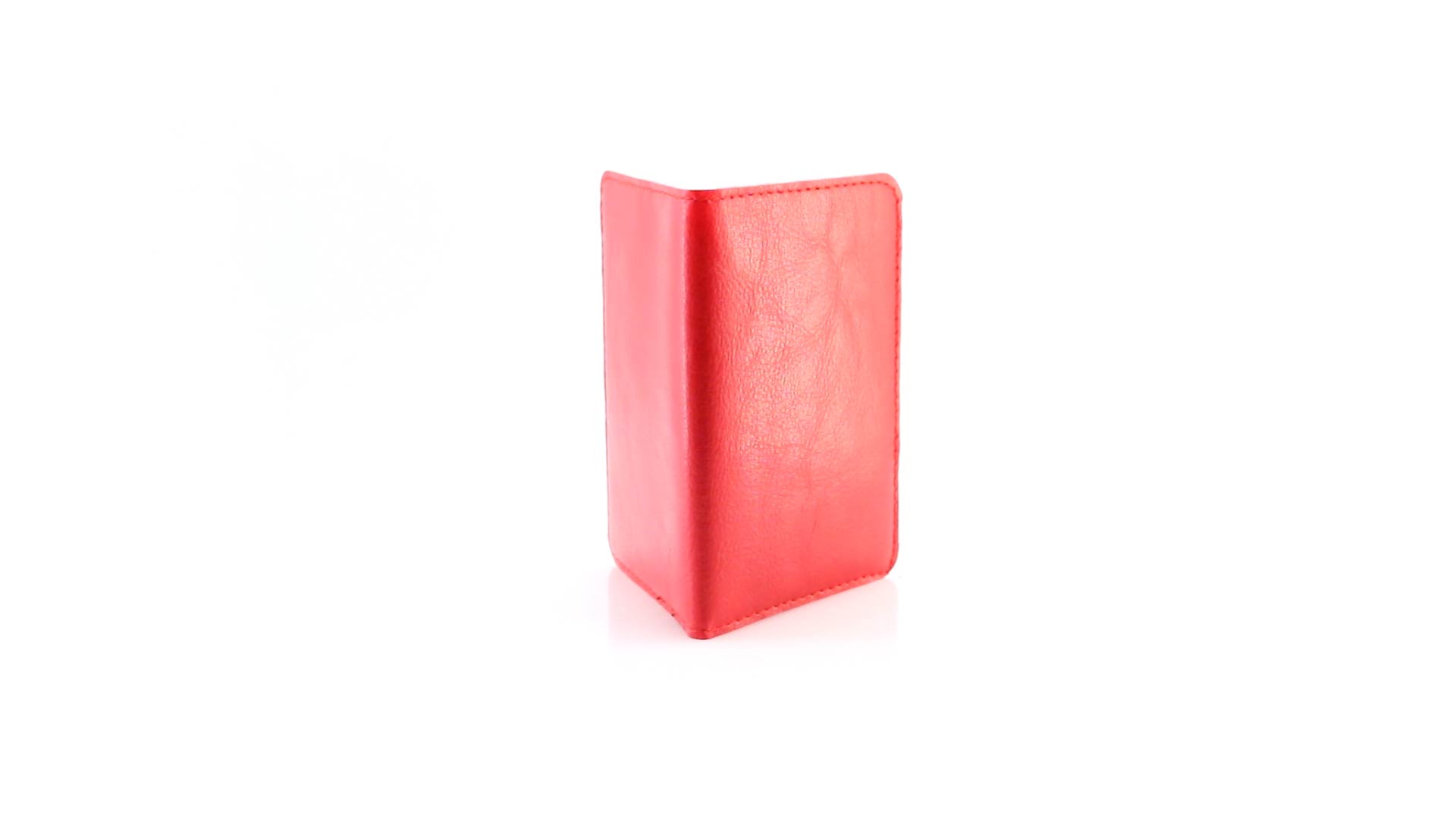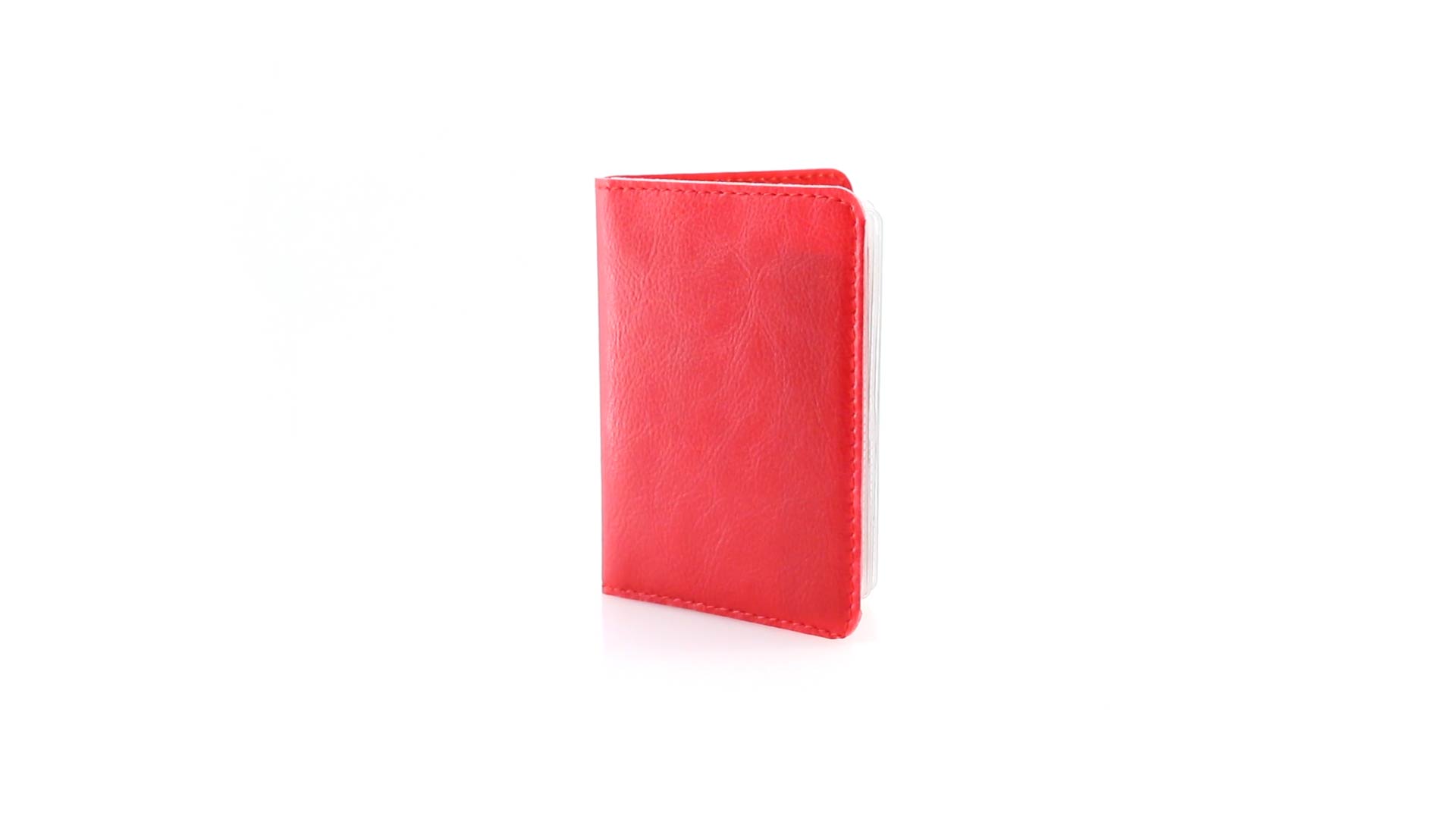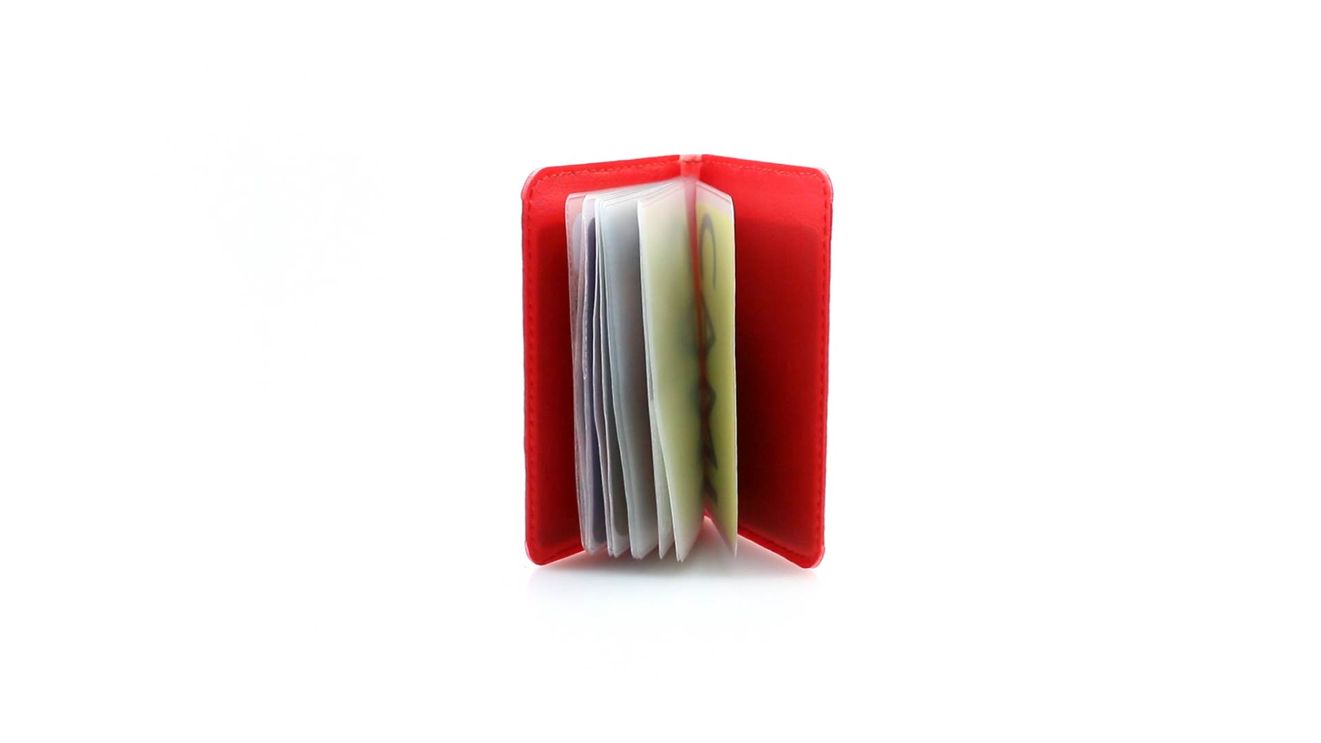 Kartenhalter aus weichem, glänzendem Kunstleder in auffälligen Farben mit 12 Innenfächer aus robustem, transparentem PVC.