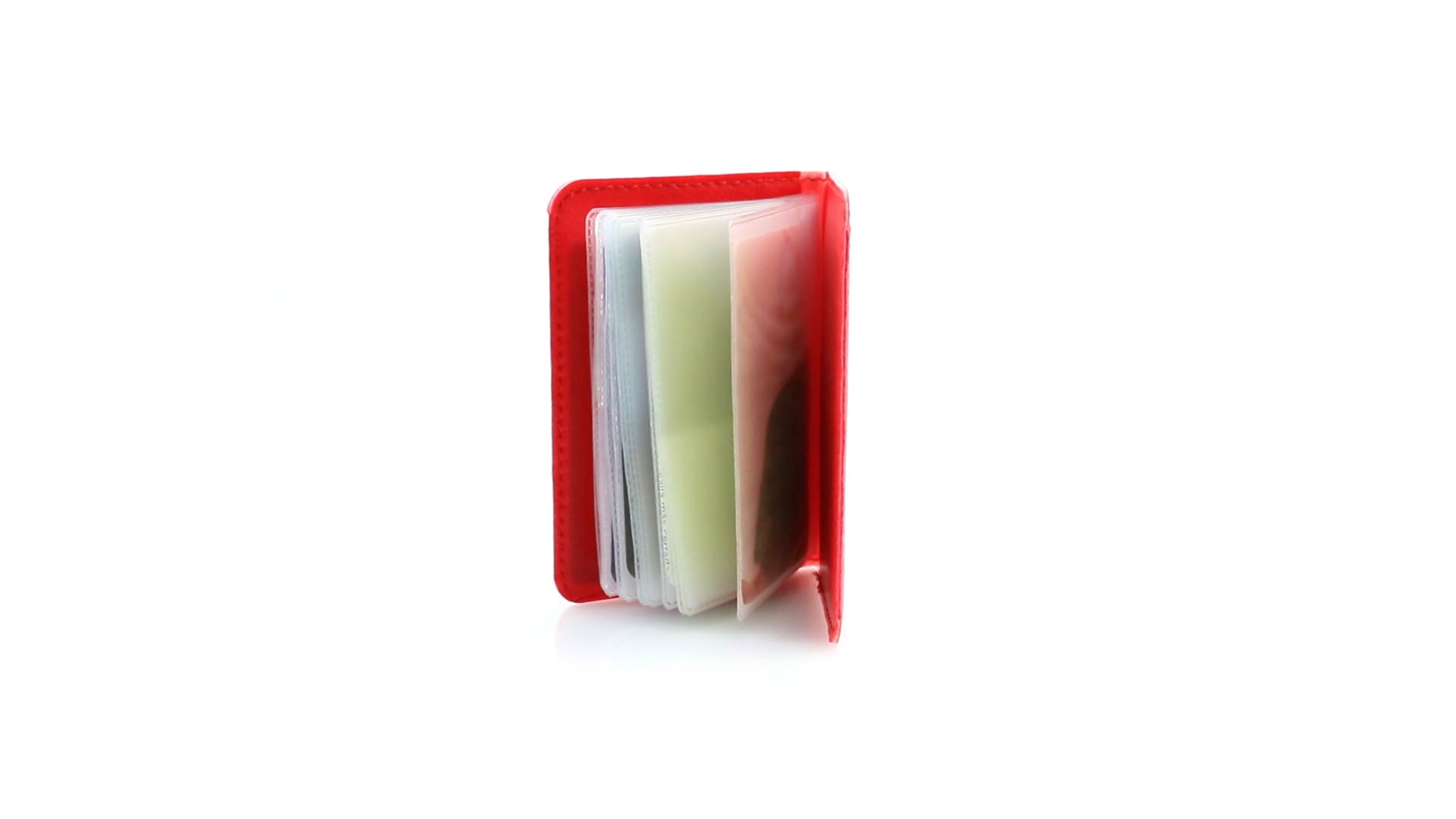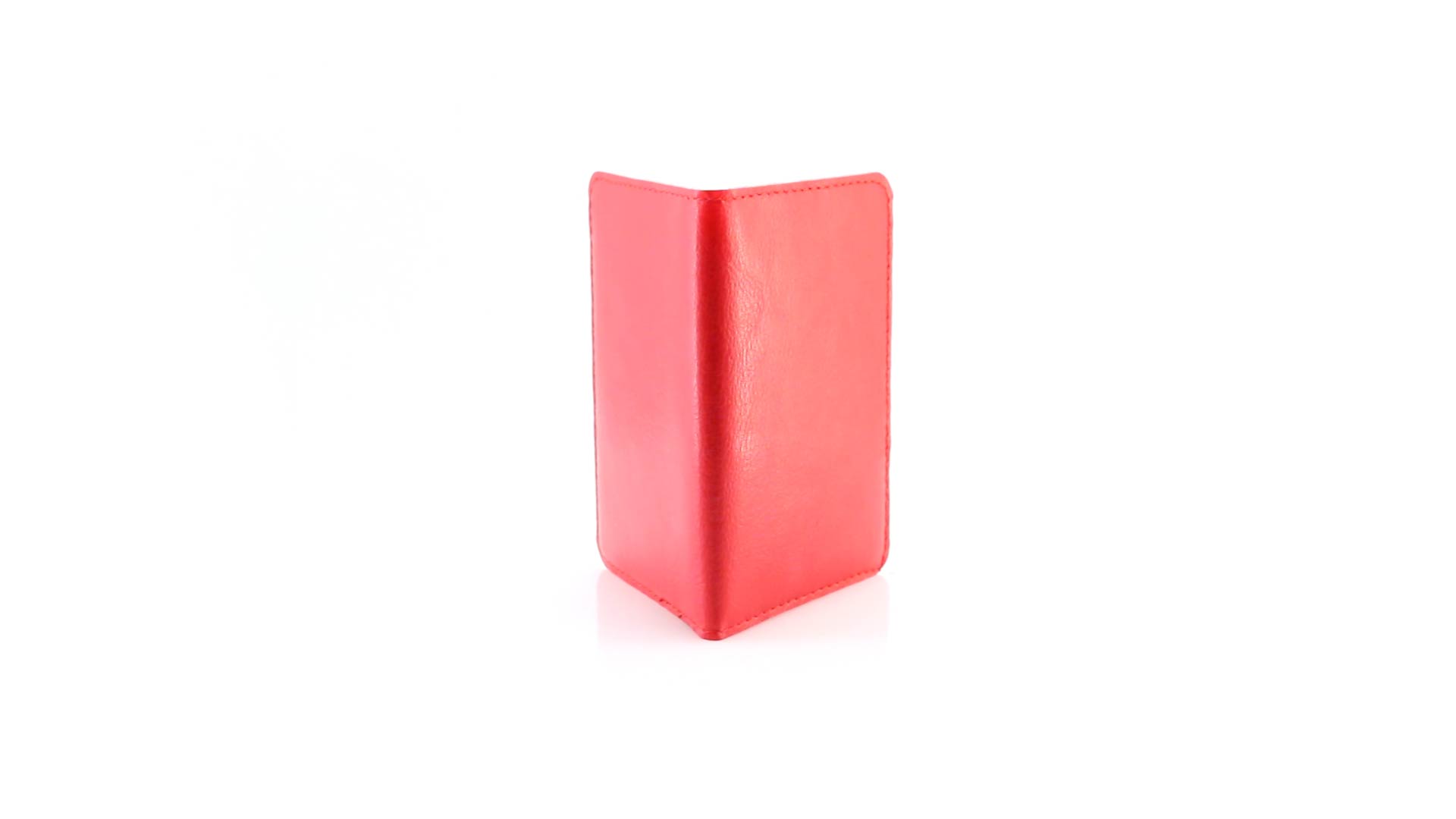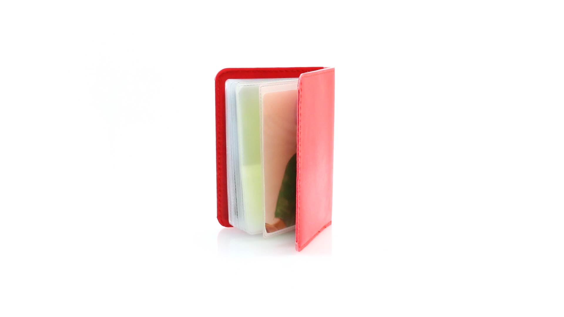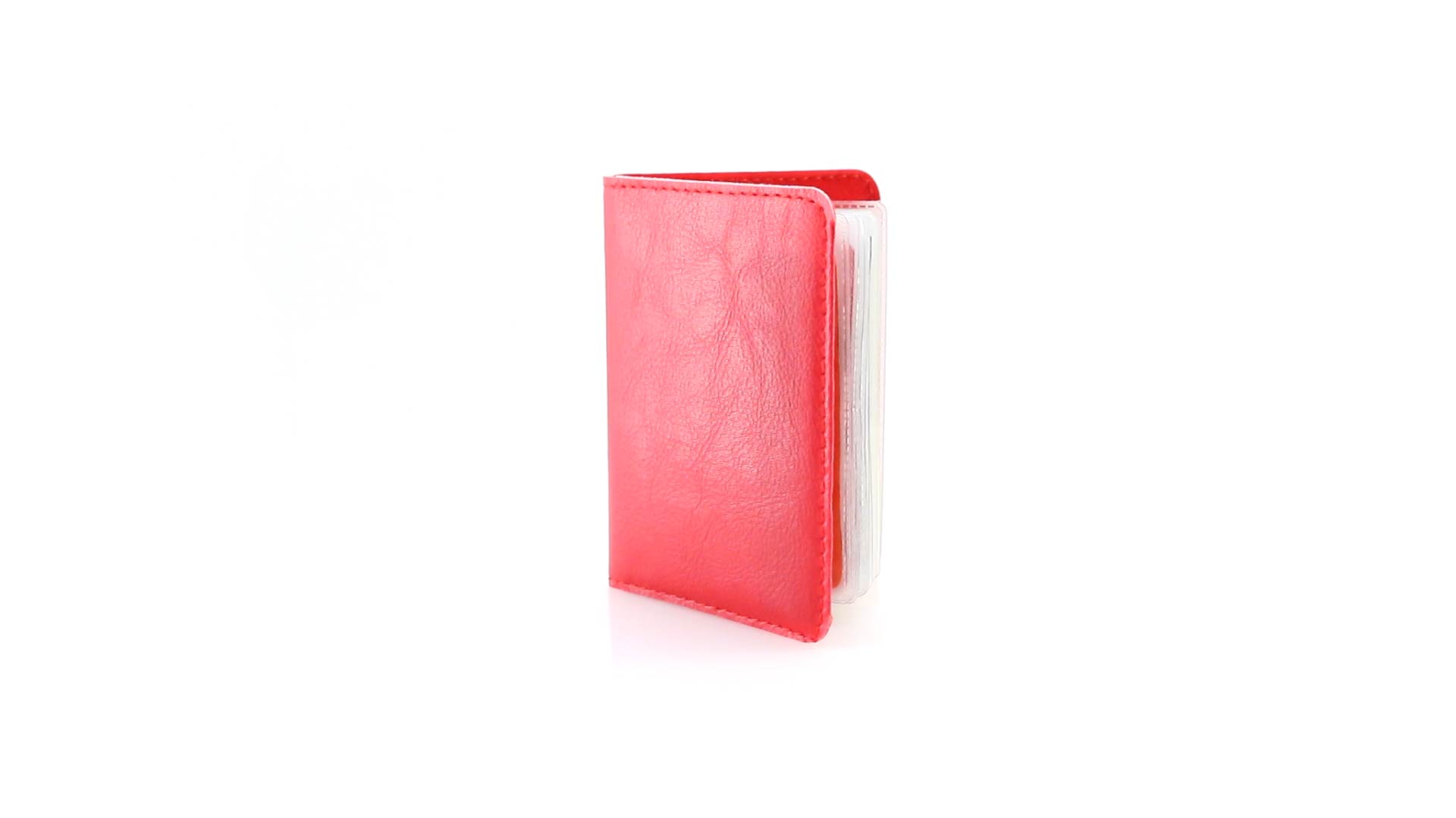 Kartenhalter aus weichem, glänzendem Kunstleder in auffälligen Farben mit 12 Innenfächer aus robustem, transparentem PVC.