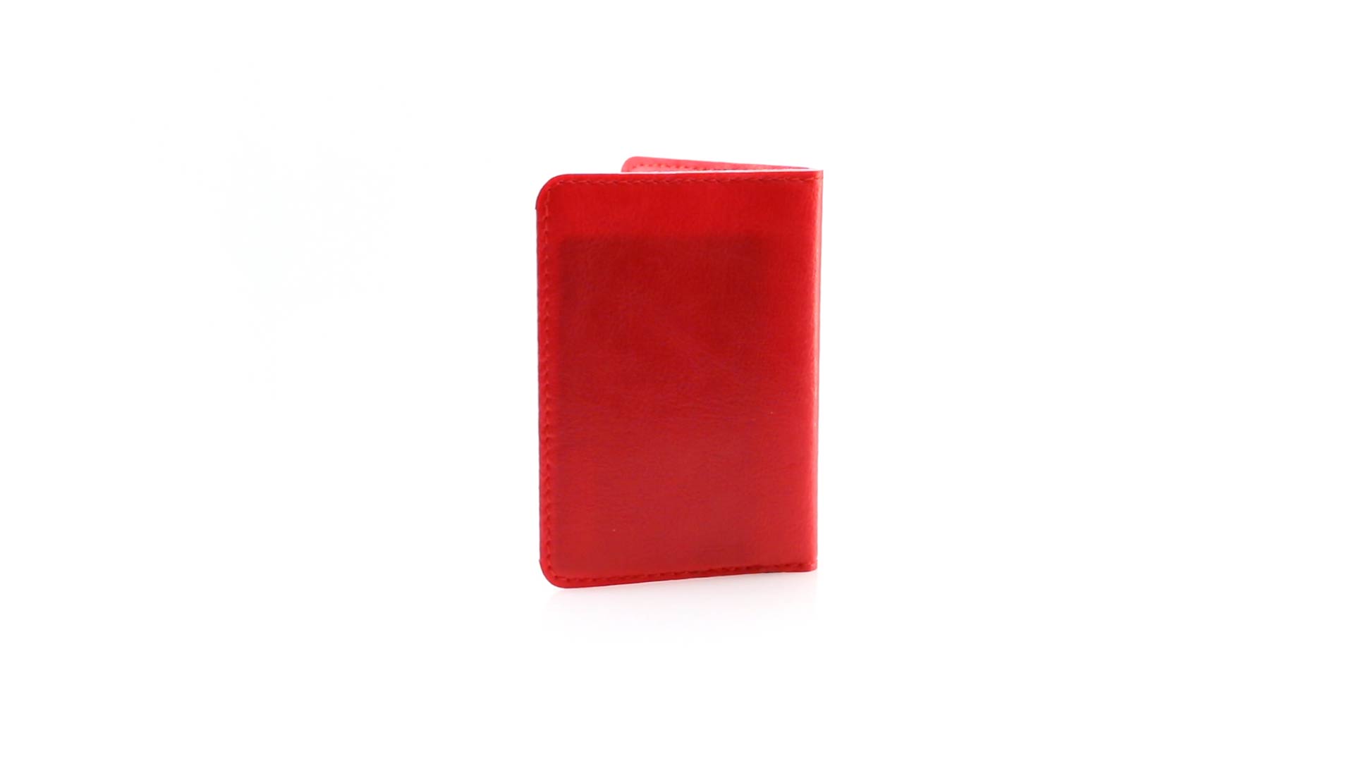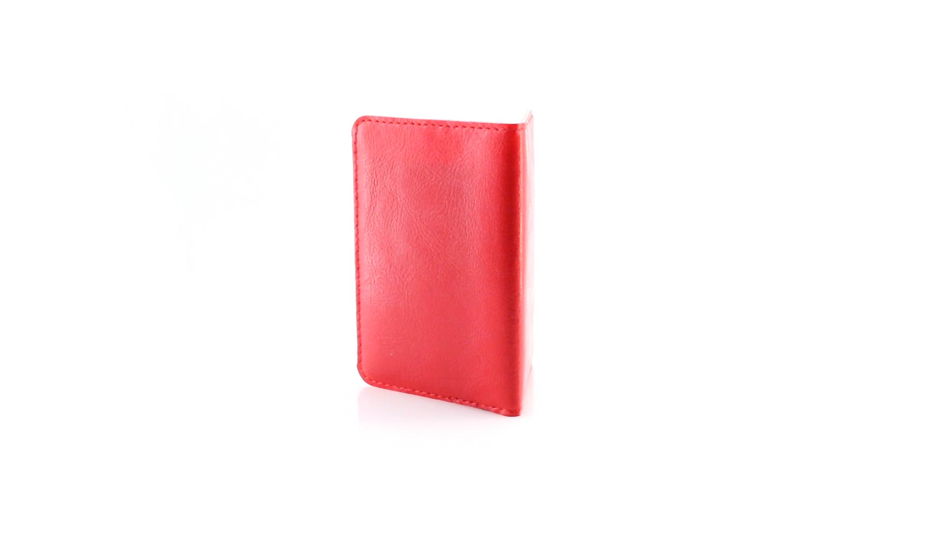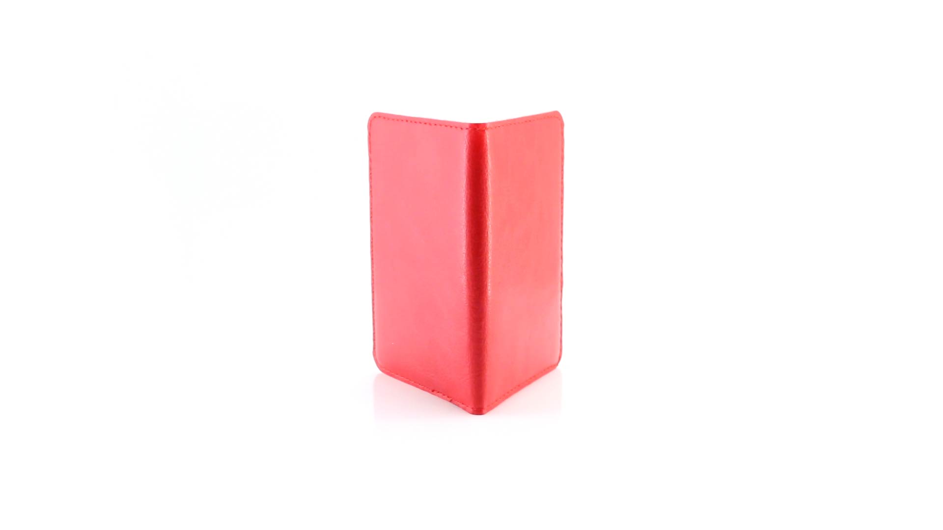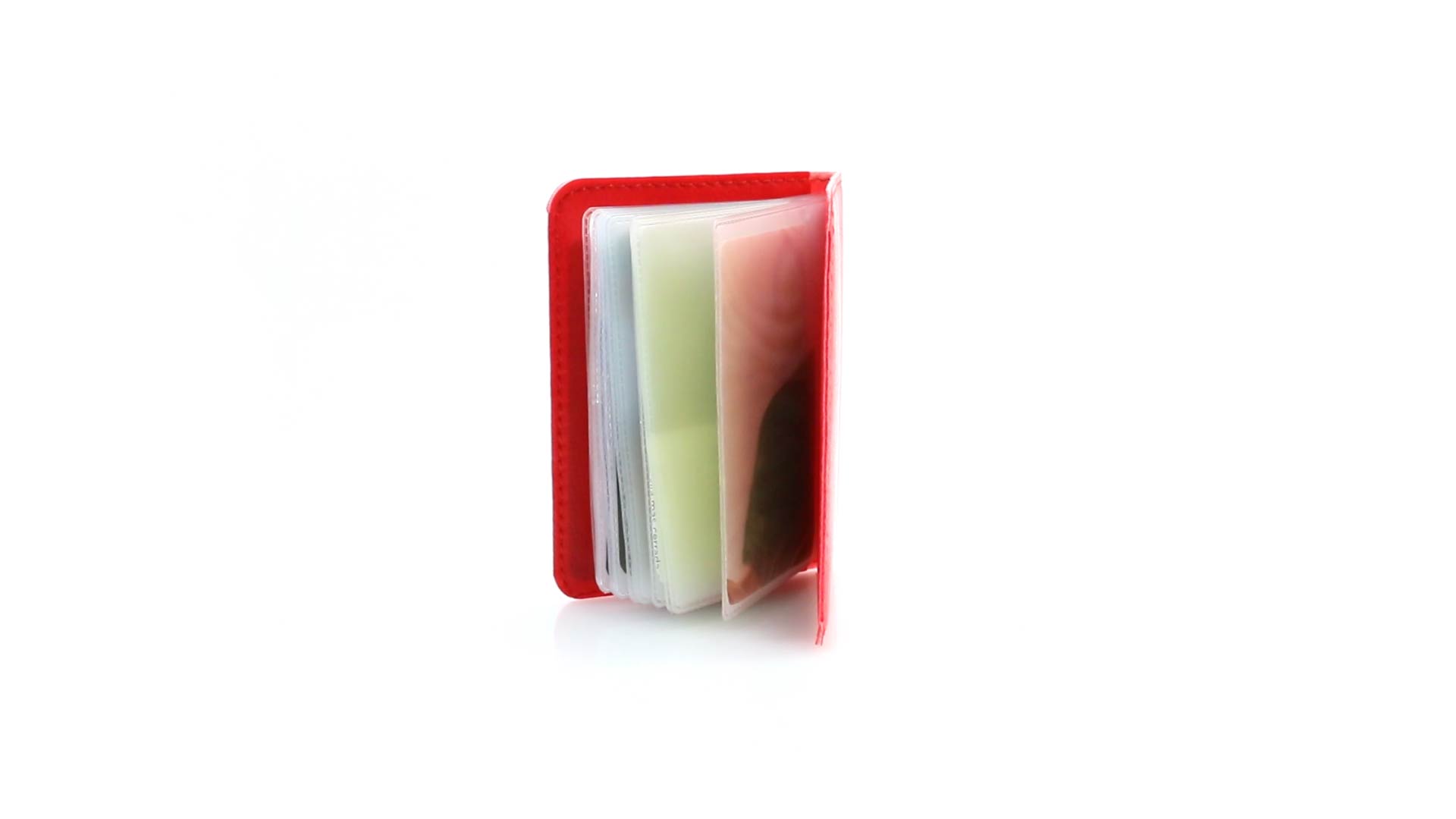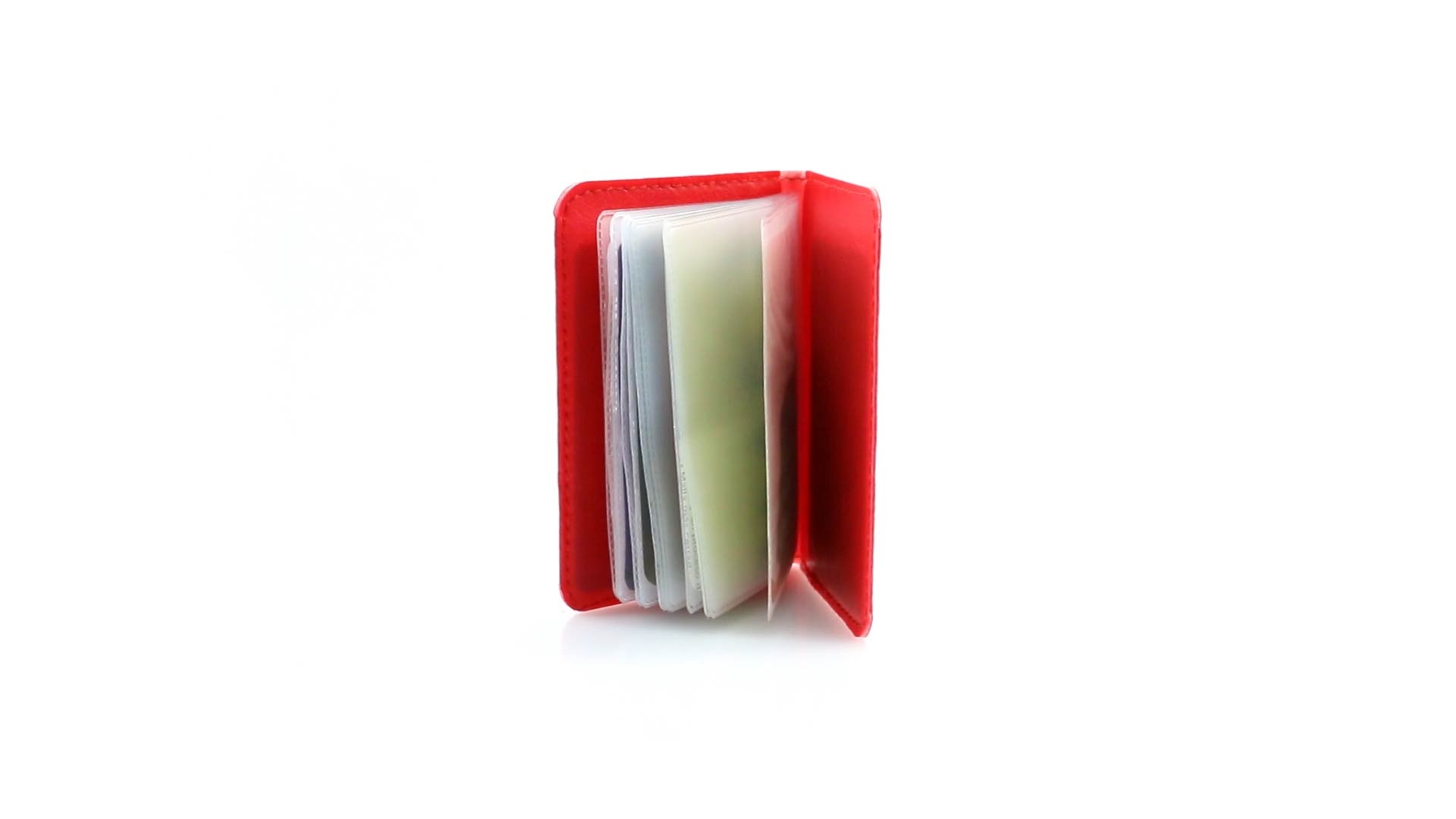 Kartenhalter aus weichem, glänzendem Kunstleder in auffälligen Farben mit 12 Innenfächer aus robustem, transparentem PVC.