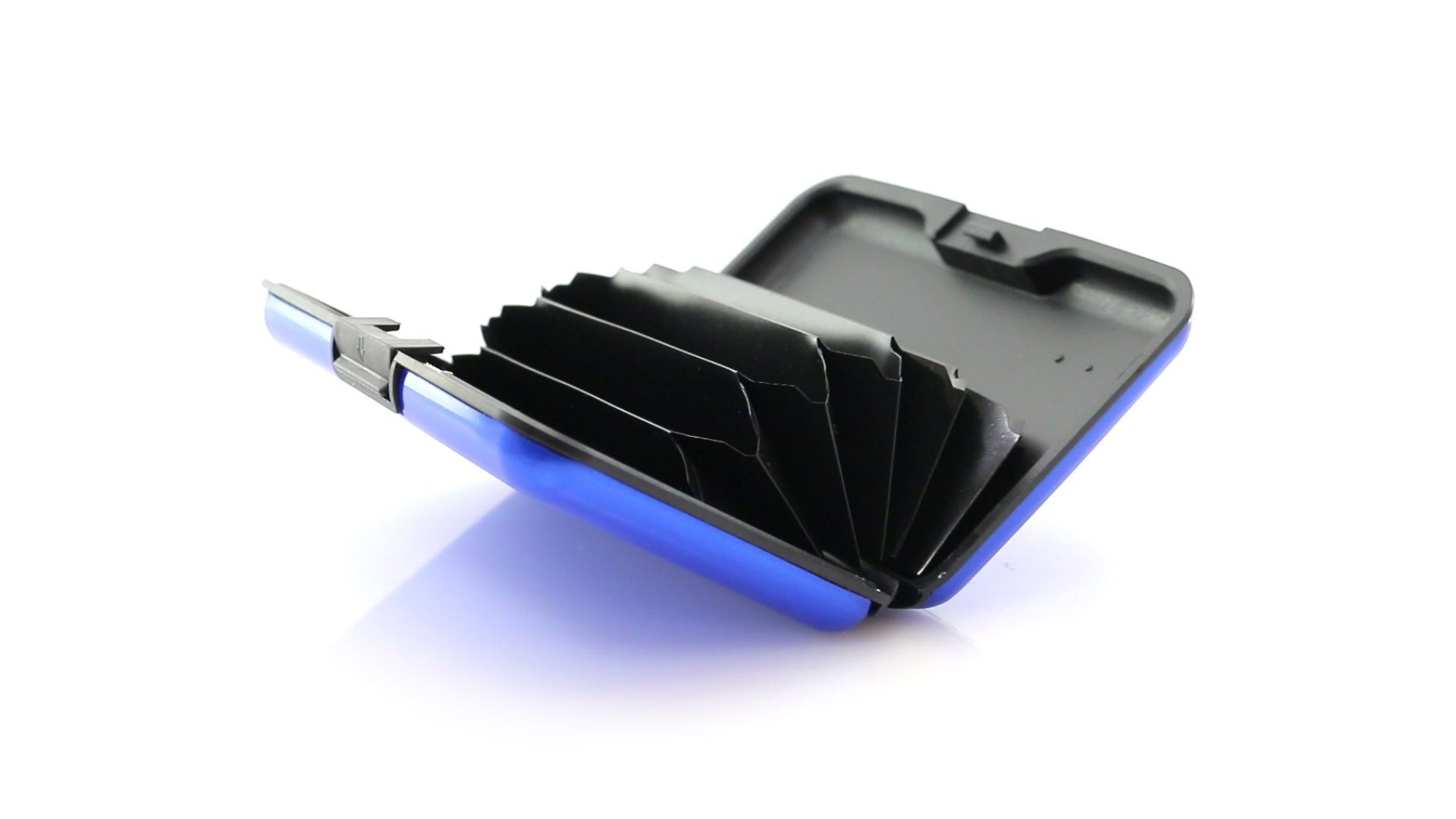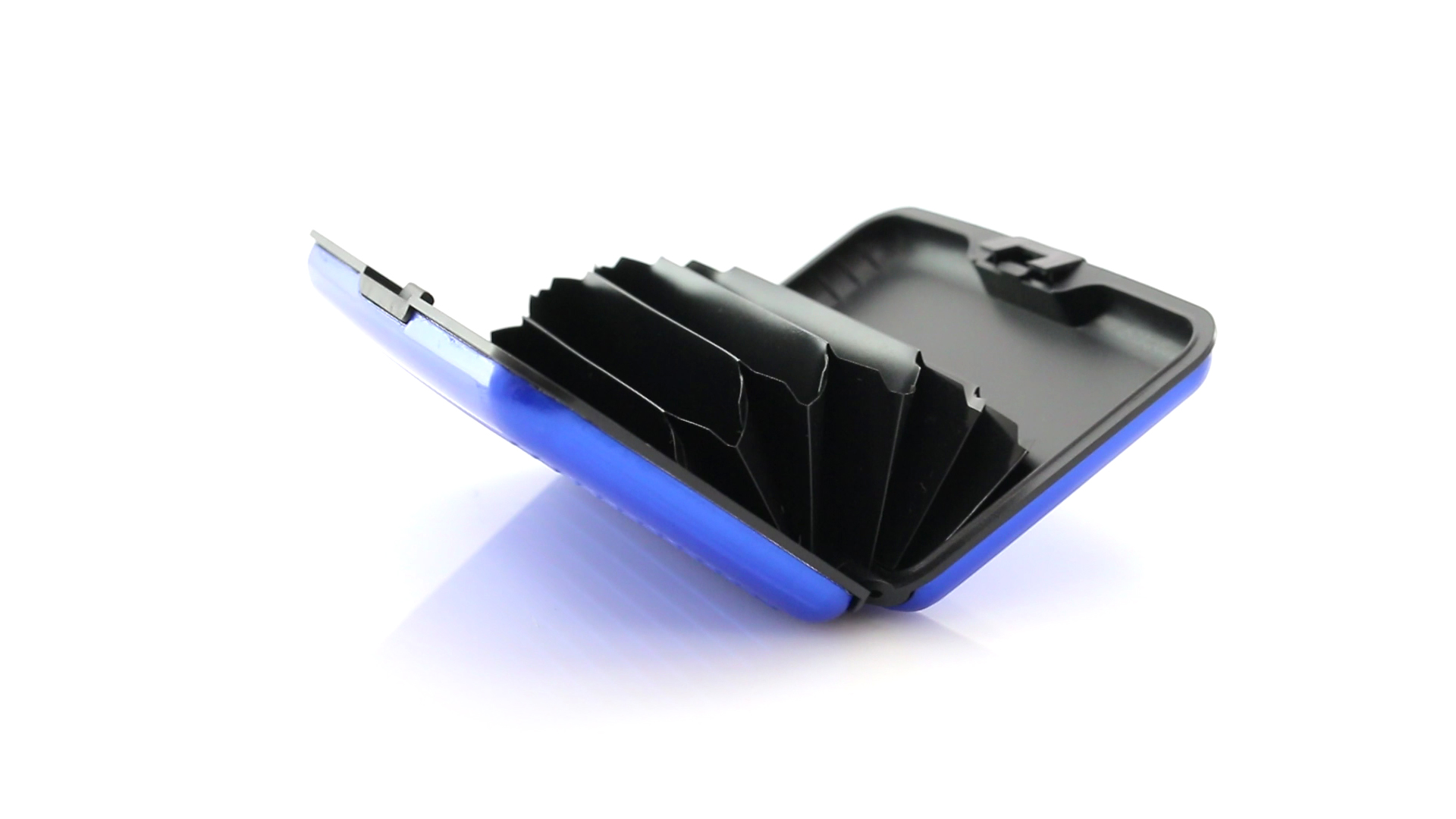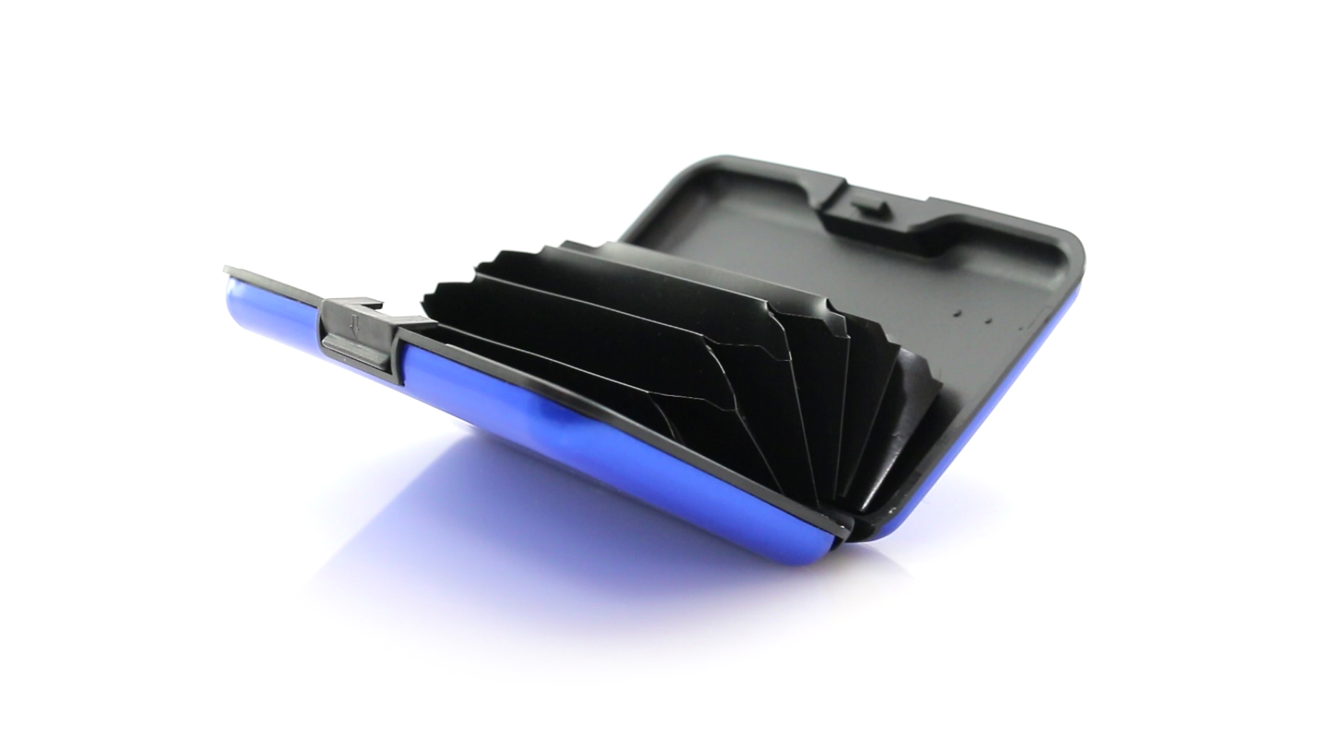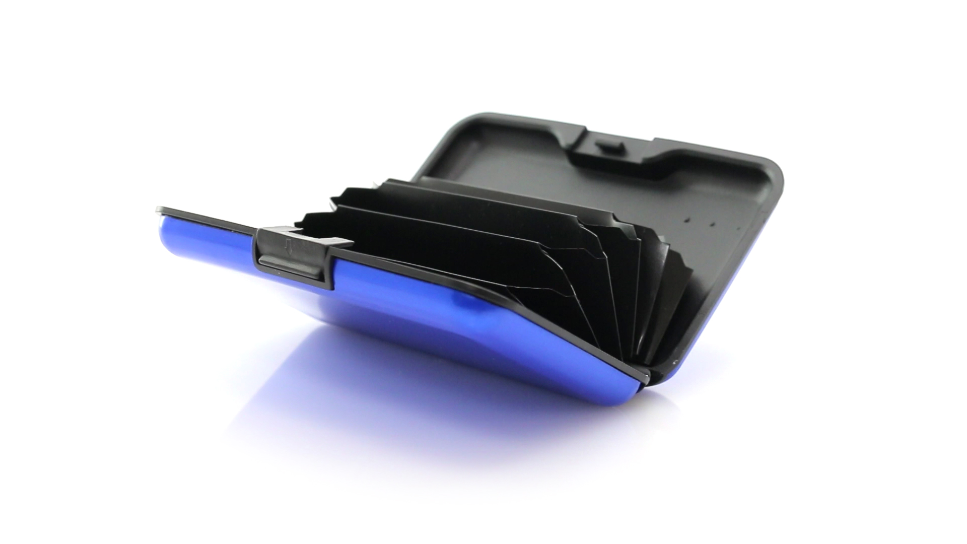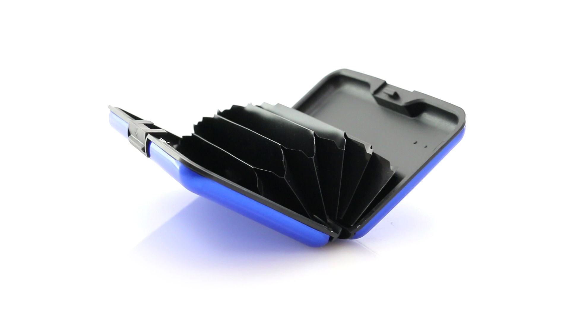 Elegantes Kartenetui in Aluminium-Ausführung in eleganten Farben. Mit 6 Innenfächern im Akkordeon-Stil, Klickverschluss und glatter Druckfläche an der Aussenseite - geeignet für die Personalisierung mittels Laserdruck. Präsentiert in einer individuellen Box in Silber.