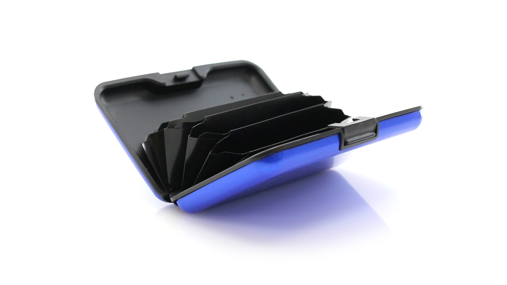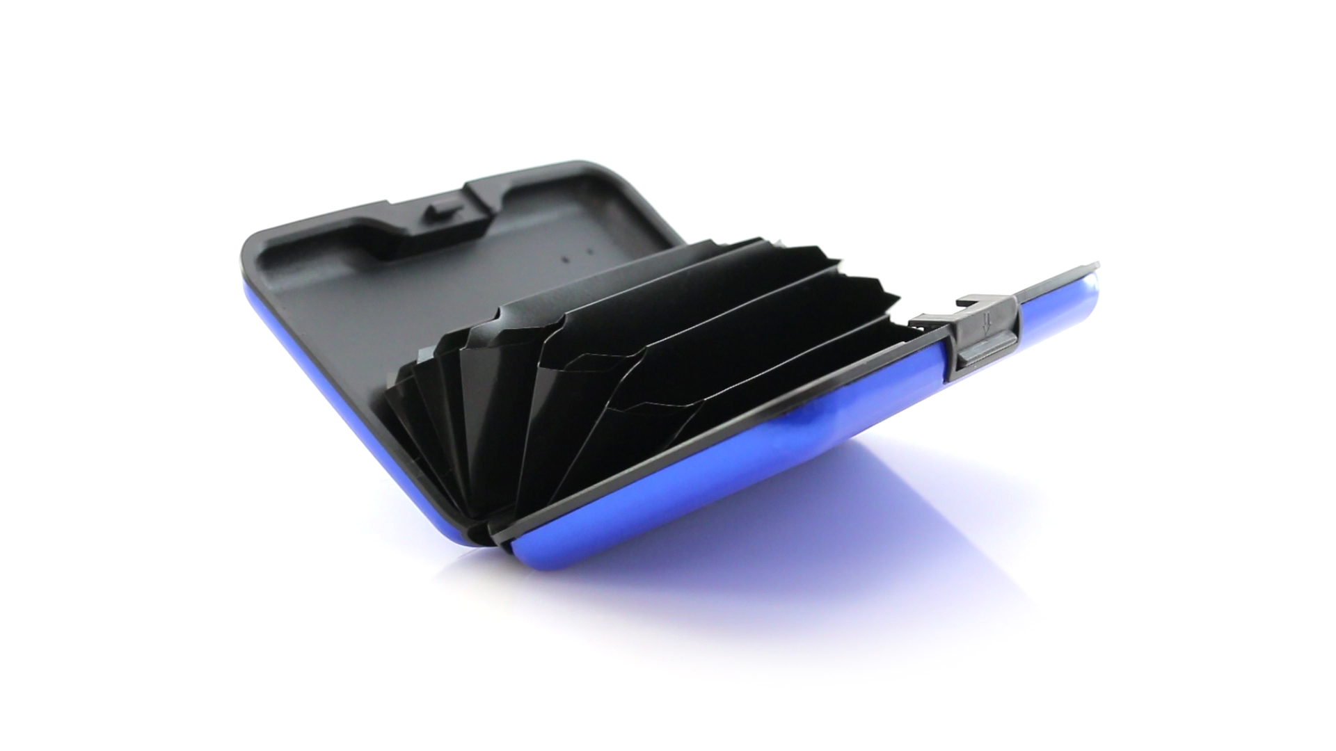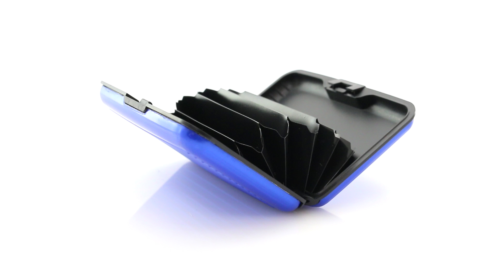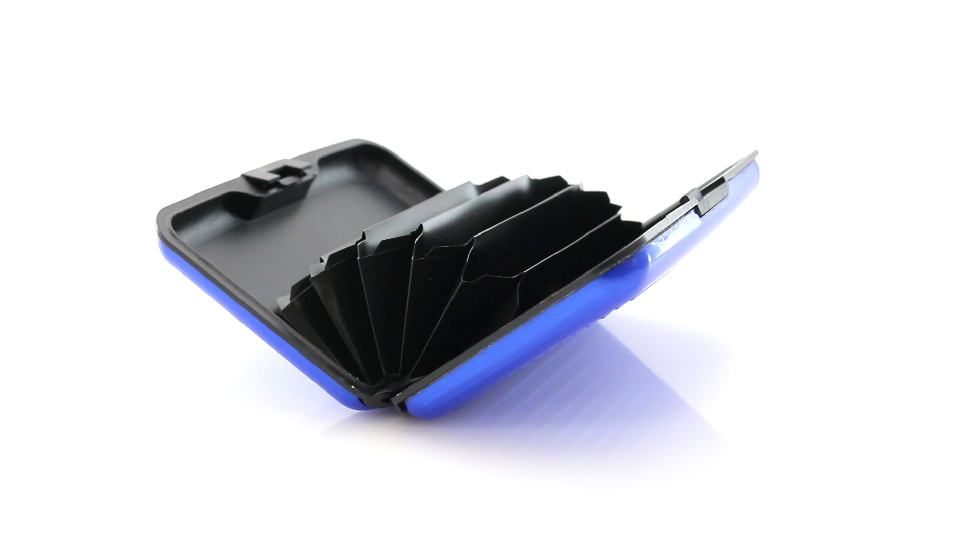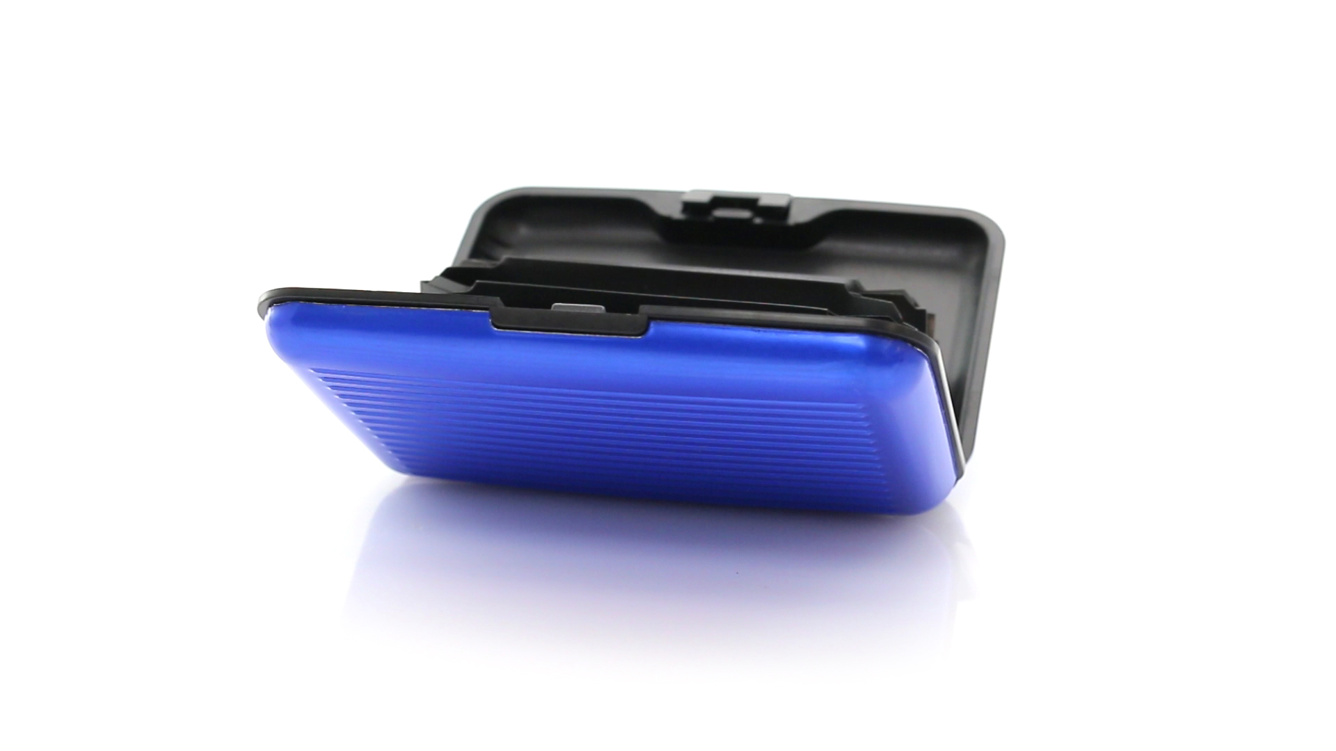 Elegantes Kartenetui in Aluminium-Ausführung in eleganten Farben. Mit 6 Innenfächern im Akkordeon-Stil, Klickverschluss und glatter Druckfläche an der Aussenseite - geeignet für die Personalisierung mittels Laserdruck. Präsentiert in einer individuellen Box in Silber.