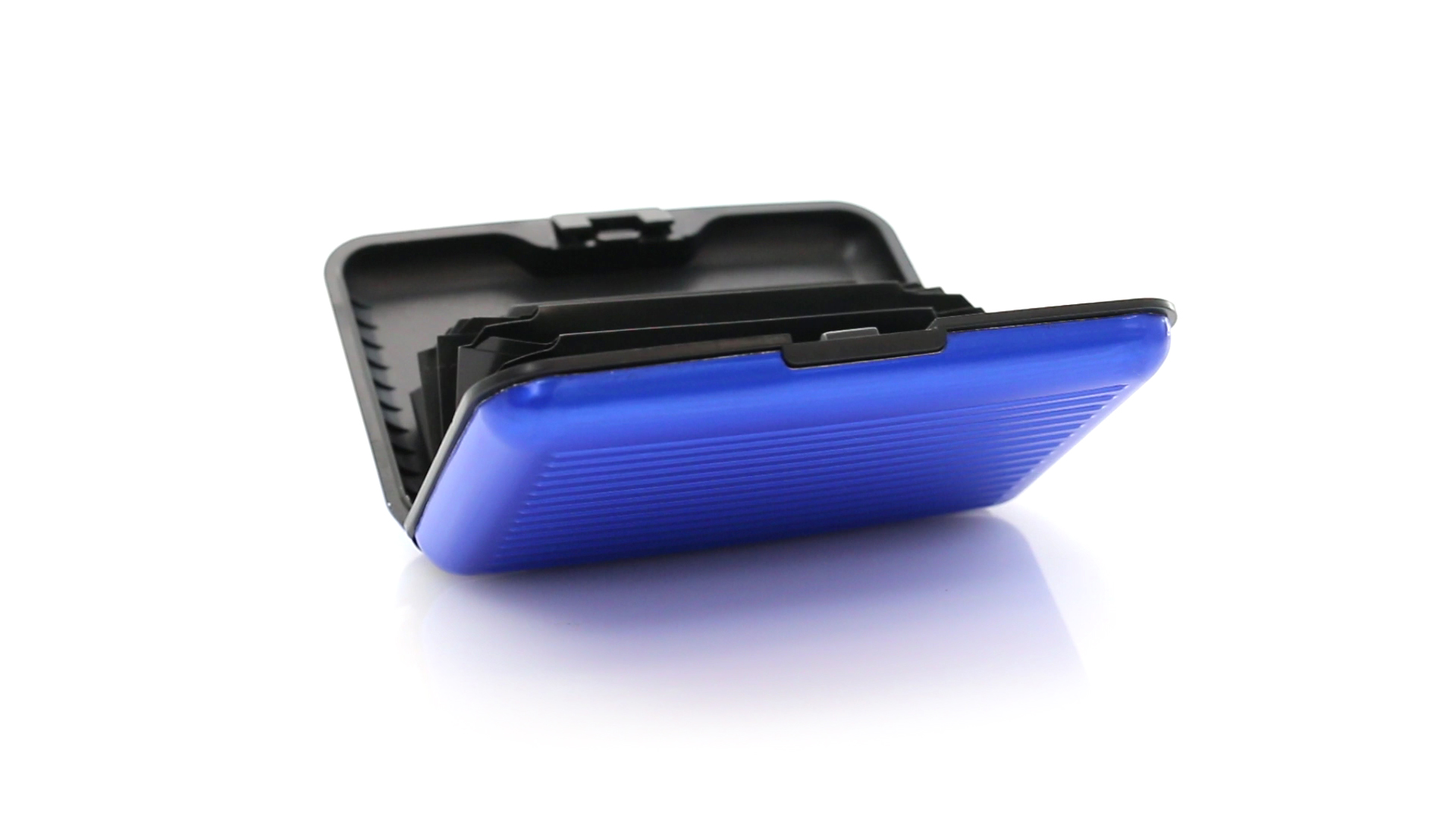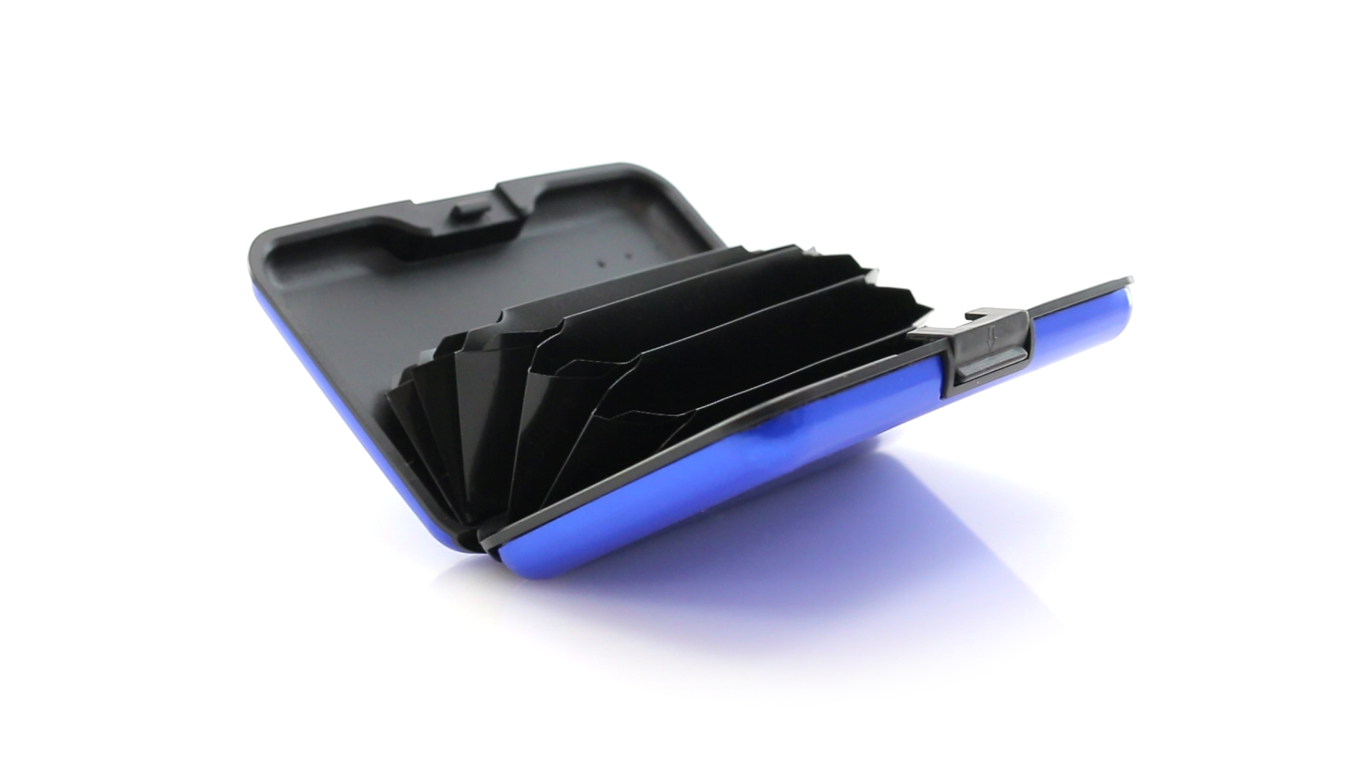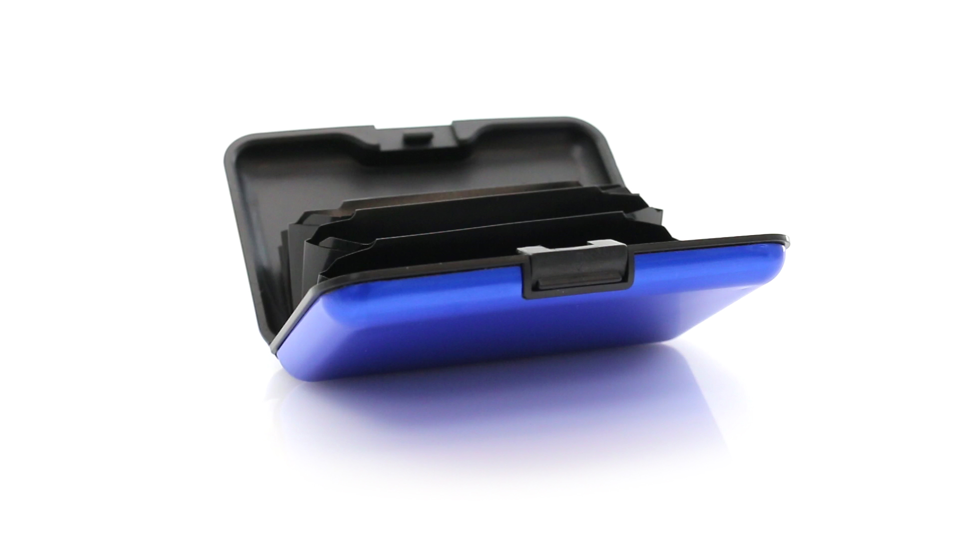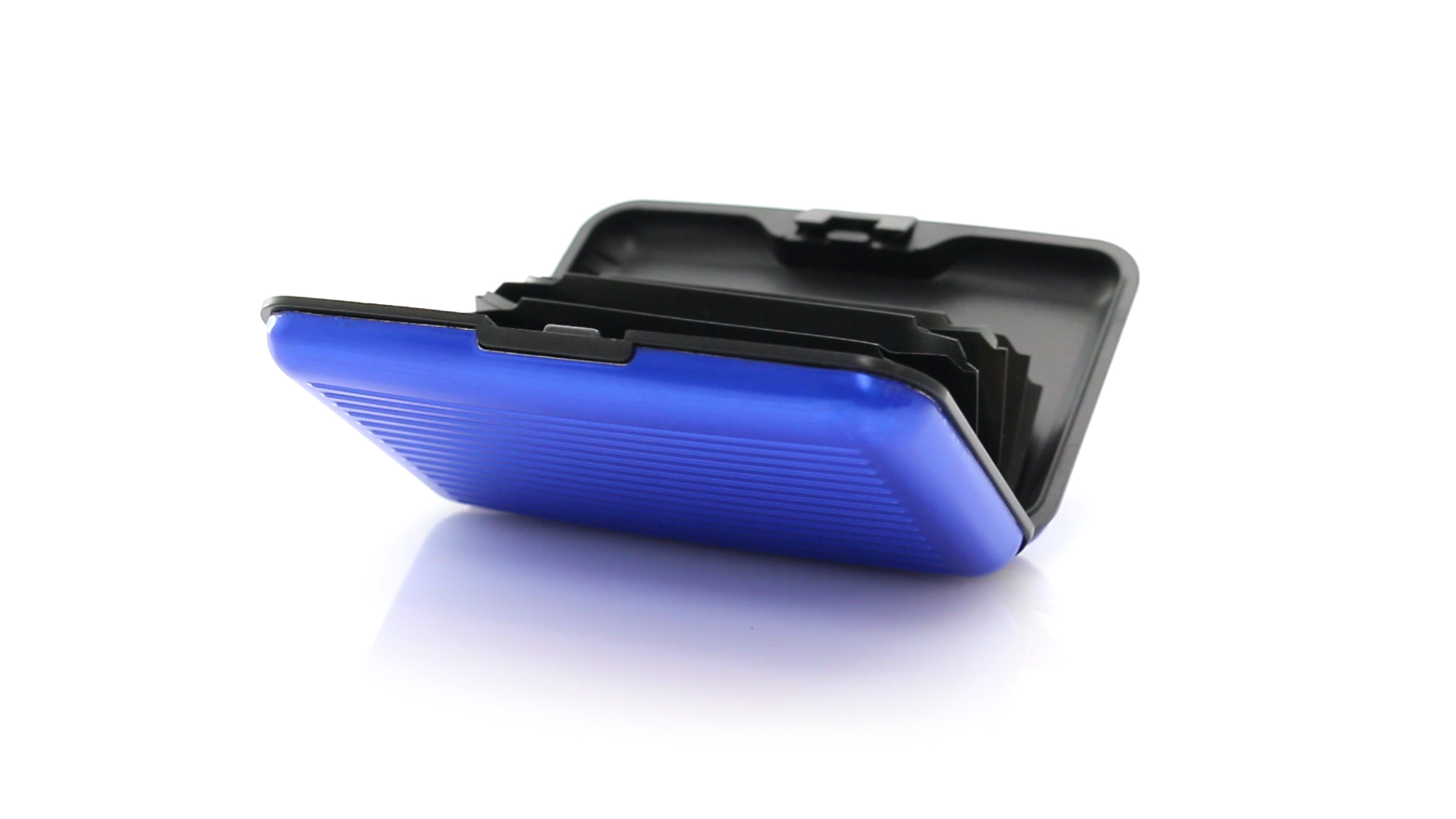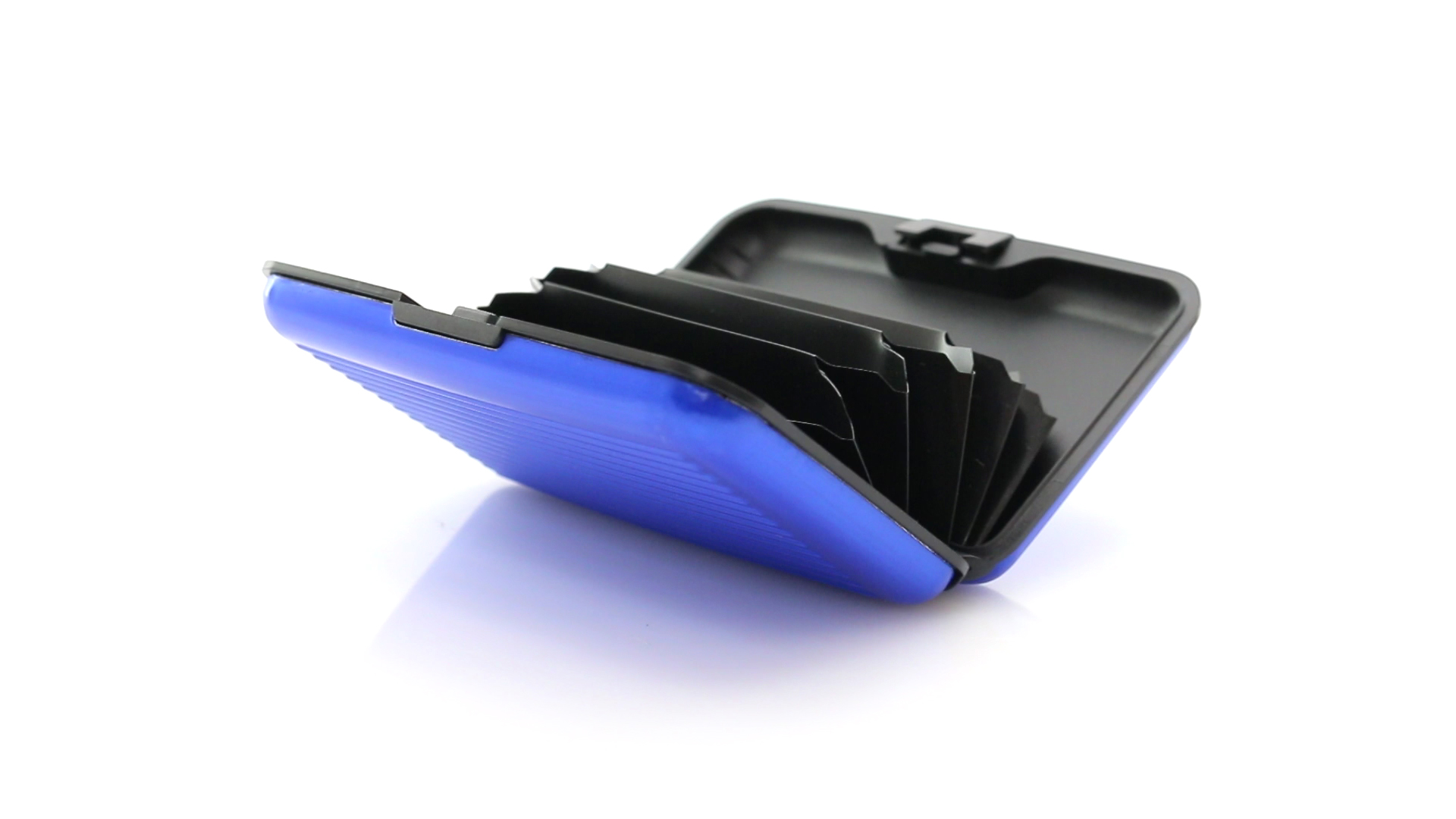 Elegantes Kartenetui in Aluminium-Ausführung in eleganten Farben. Mit 6 Innenfächern im Akkordeon-Stil, Klickverschluss und glatter Druckfläche an der Aussenseite - geeignet für die Personalisierung mittels Laserdruck. Präsentiert in einer individuellen Box in Silber.