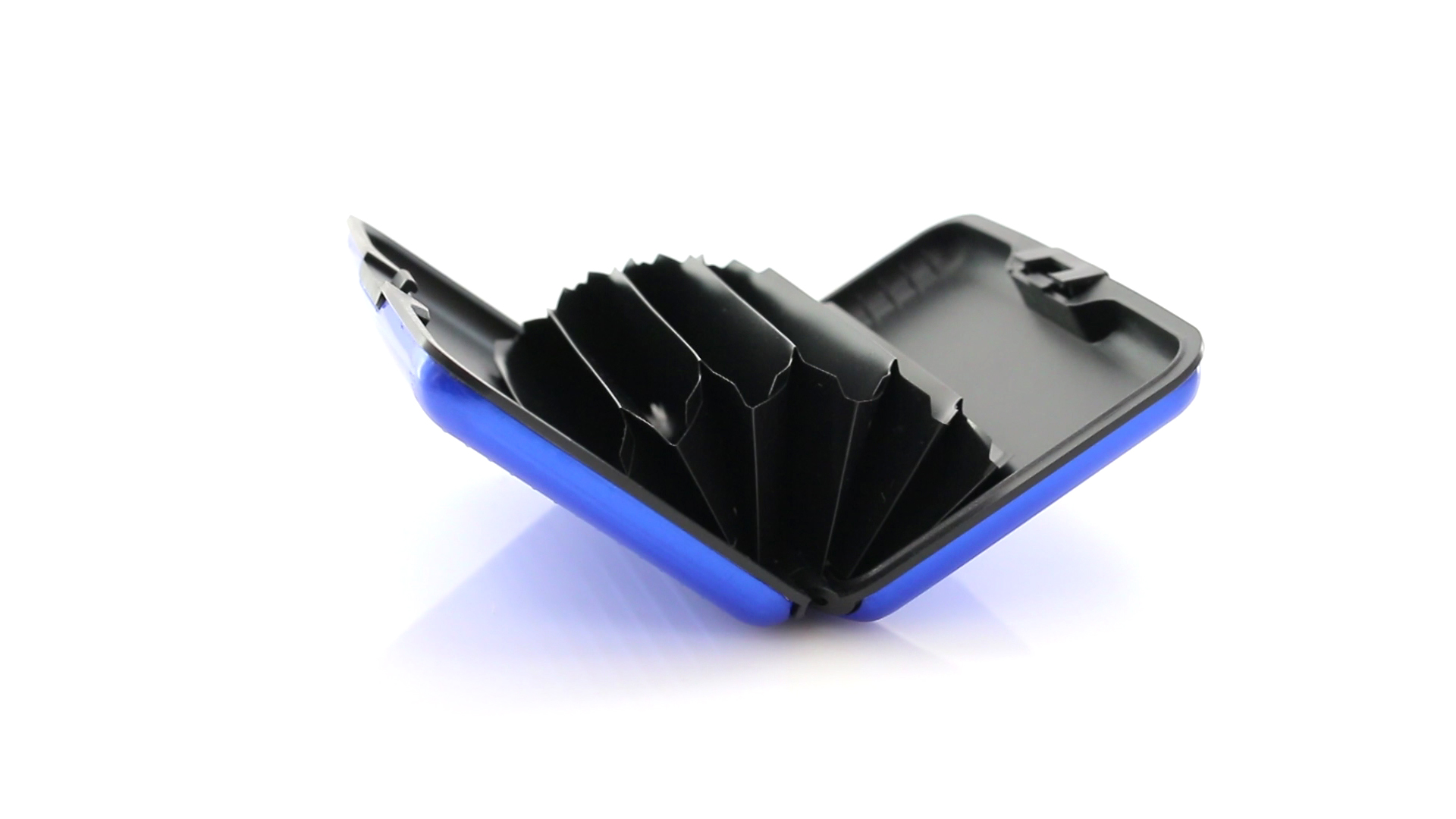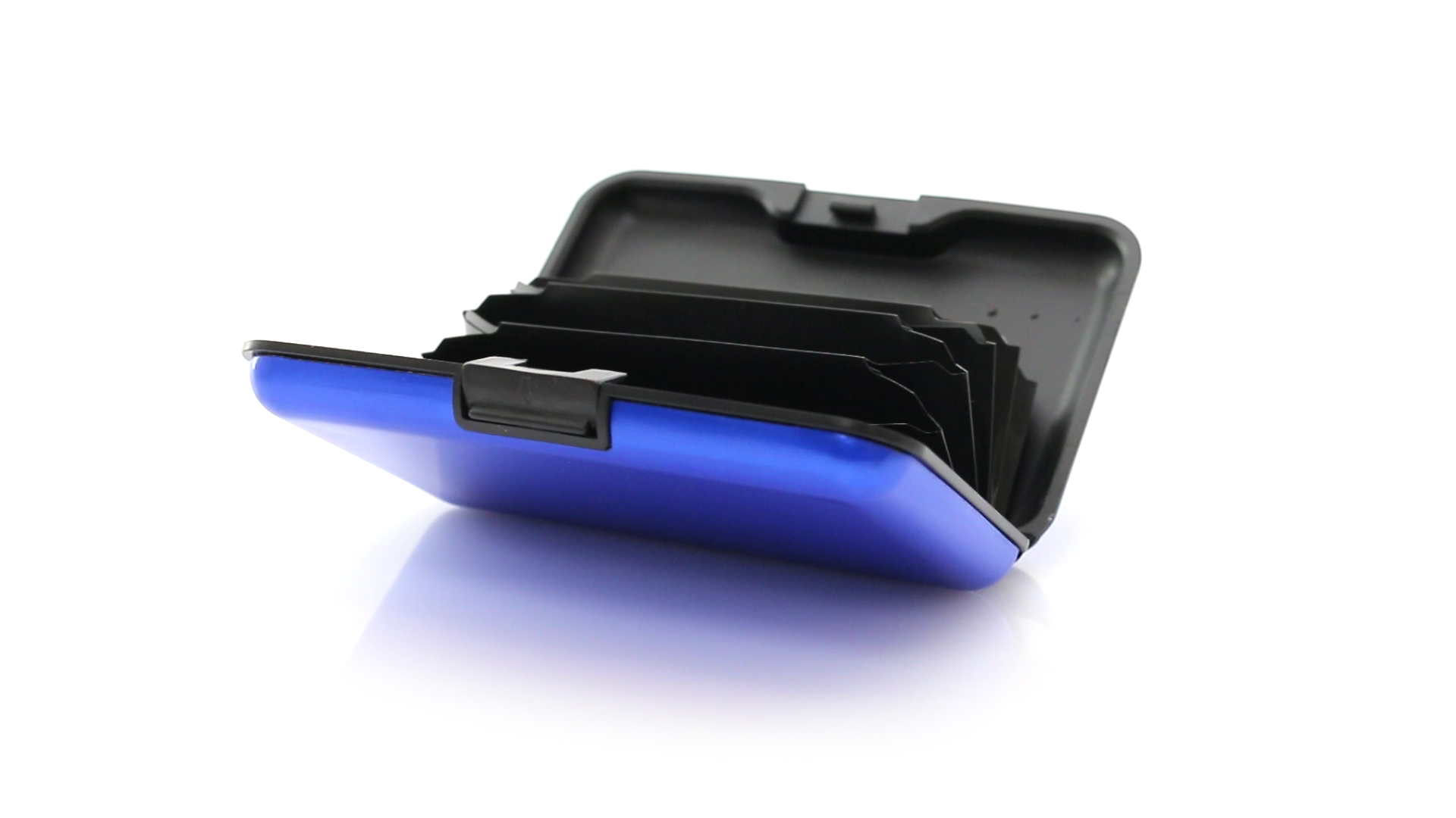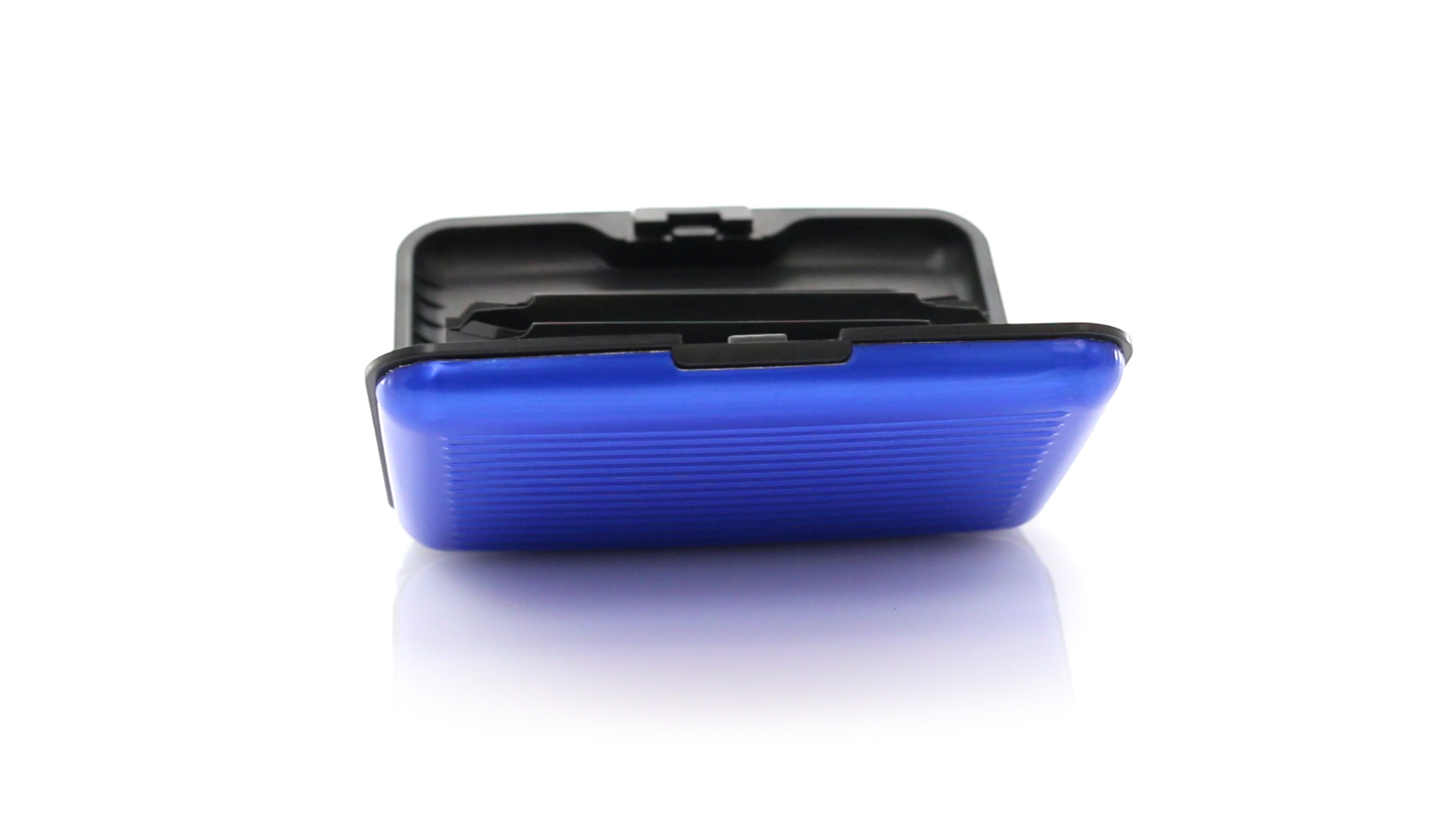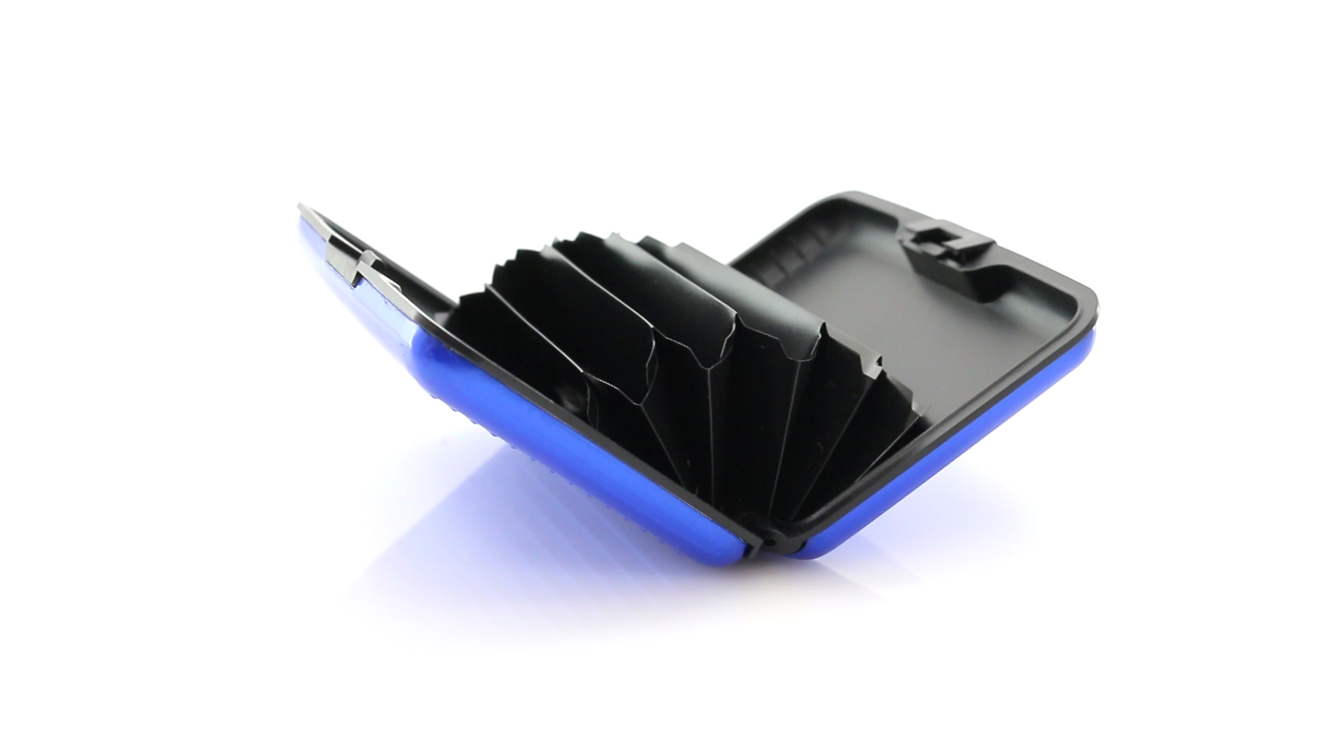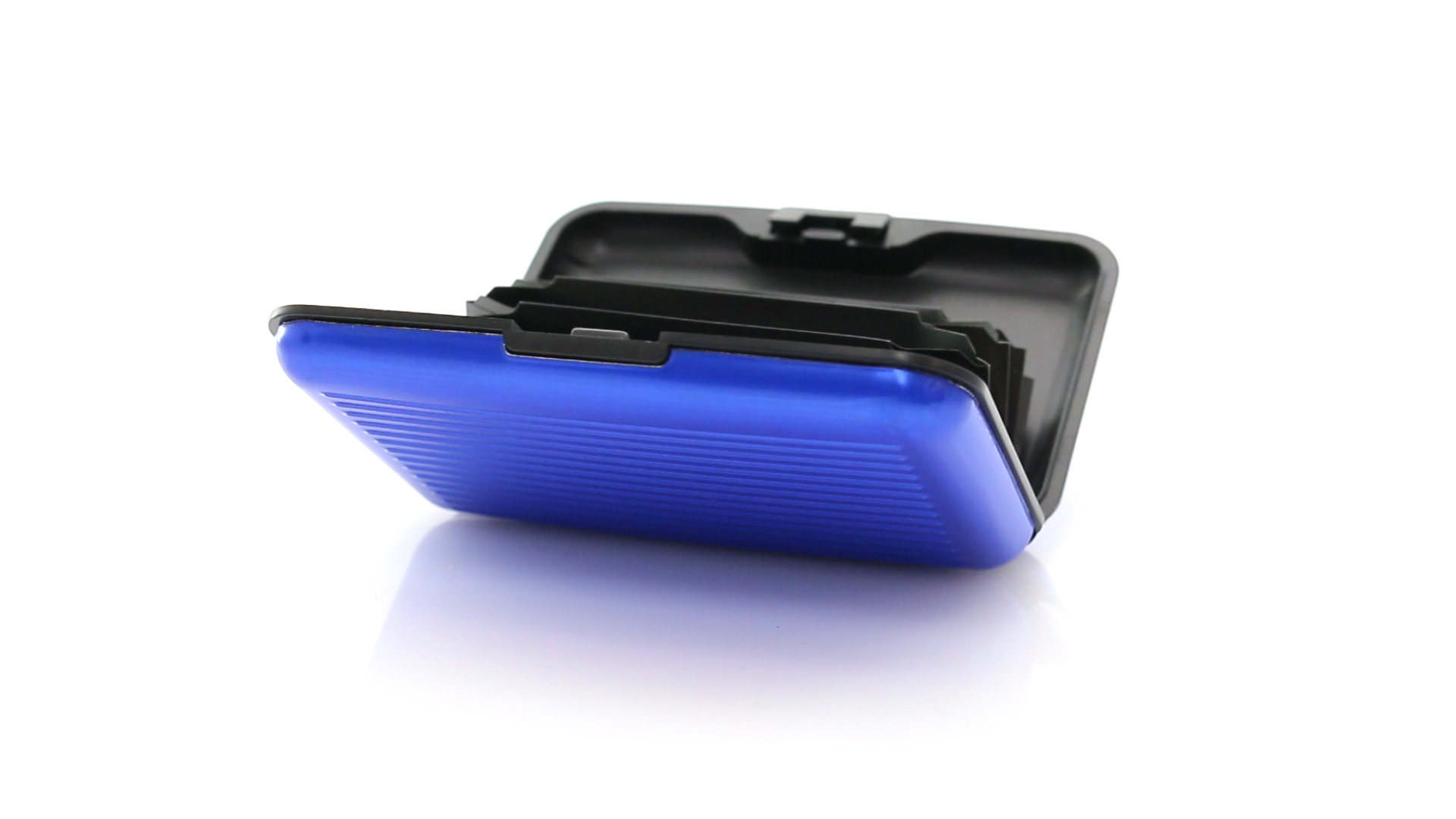 Elegantes Kartenetui in Aluminium-Ausführung in eleganten Farben. Mit 6 Innenfächern im Akkordeon-Stil, Klickverschluss und glatter Druckfläche an der Aussenseite - geeignet für die Personalisierung mittels Laserdruck. Präsentiert in einer individuellen Box in Silber.