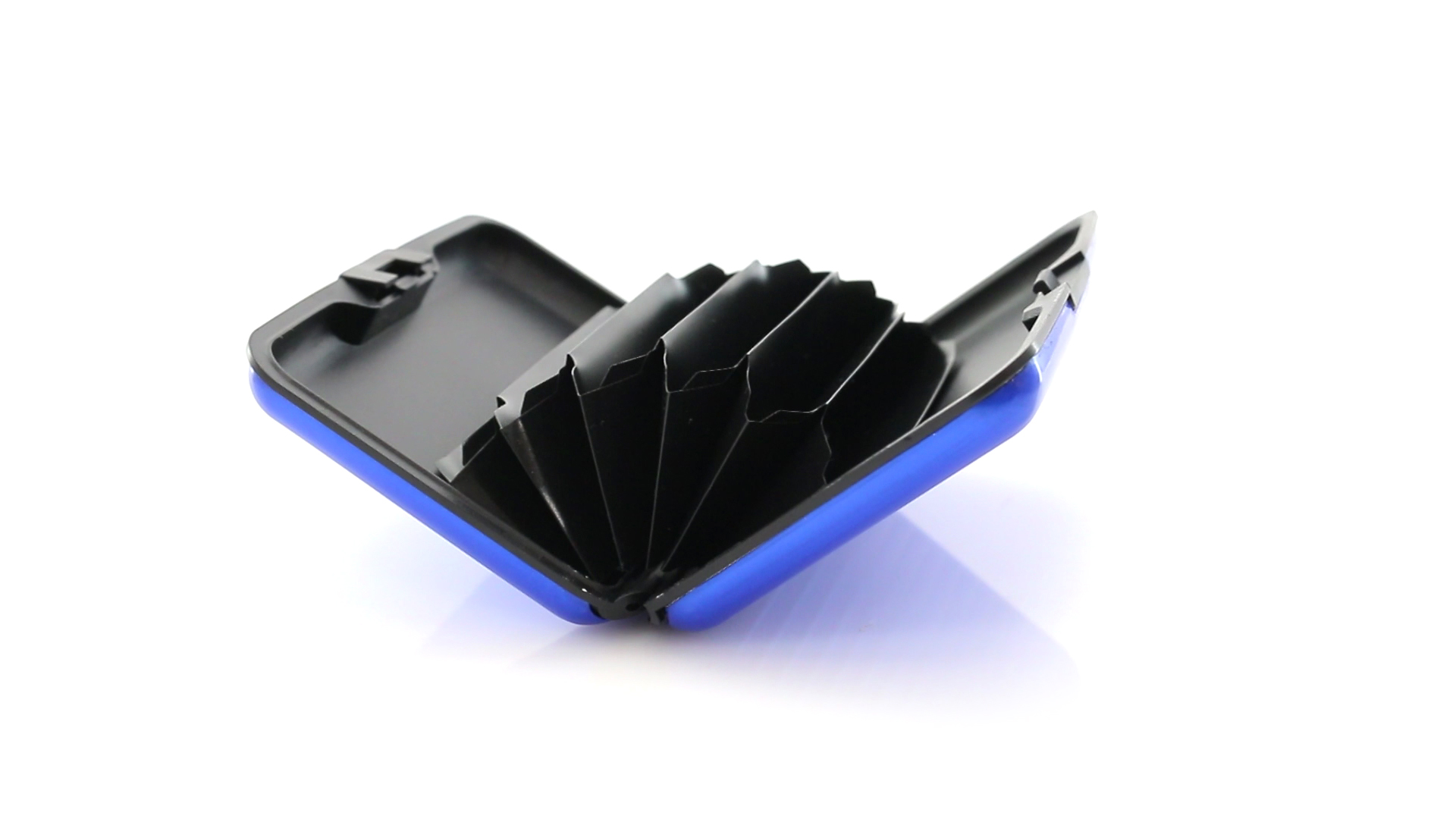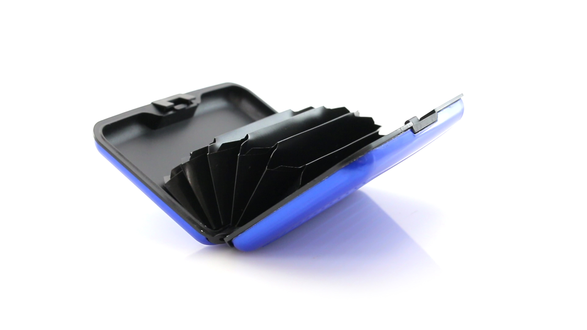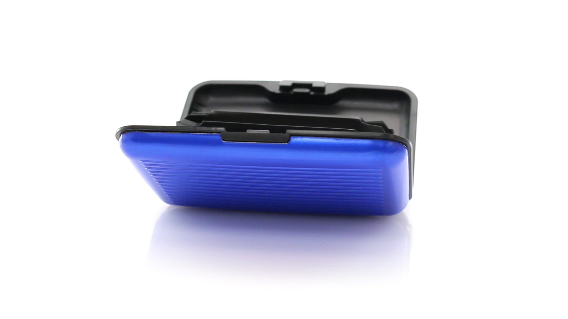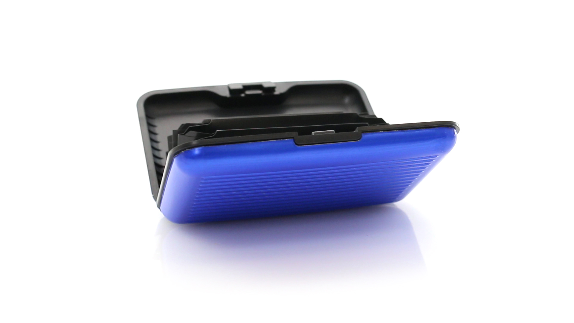 Elegantes Kartenetui in Aluminium-Ausführung in eleganten Farben. Mit 6 Innenfächern im Akkordeon-Stil, Klickverschluss und glatter Druckfläche an der Aussenseite - geeignet für die Personalisierung mittels Laserdruck. Präsentiert in einer individuellen Box in Silber.