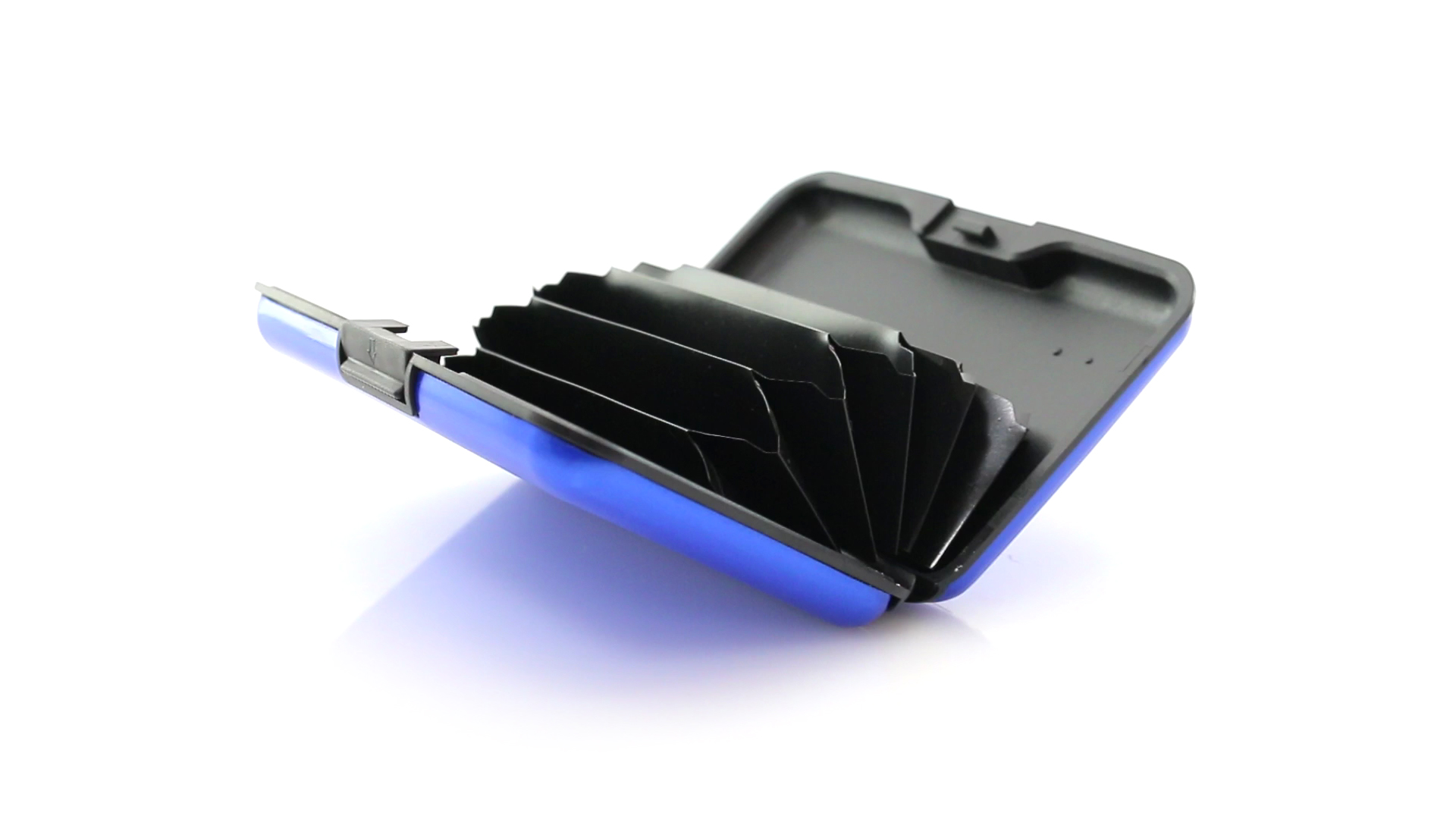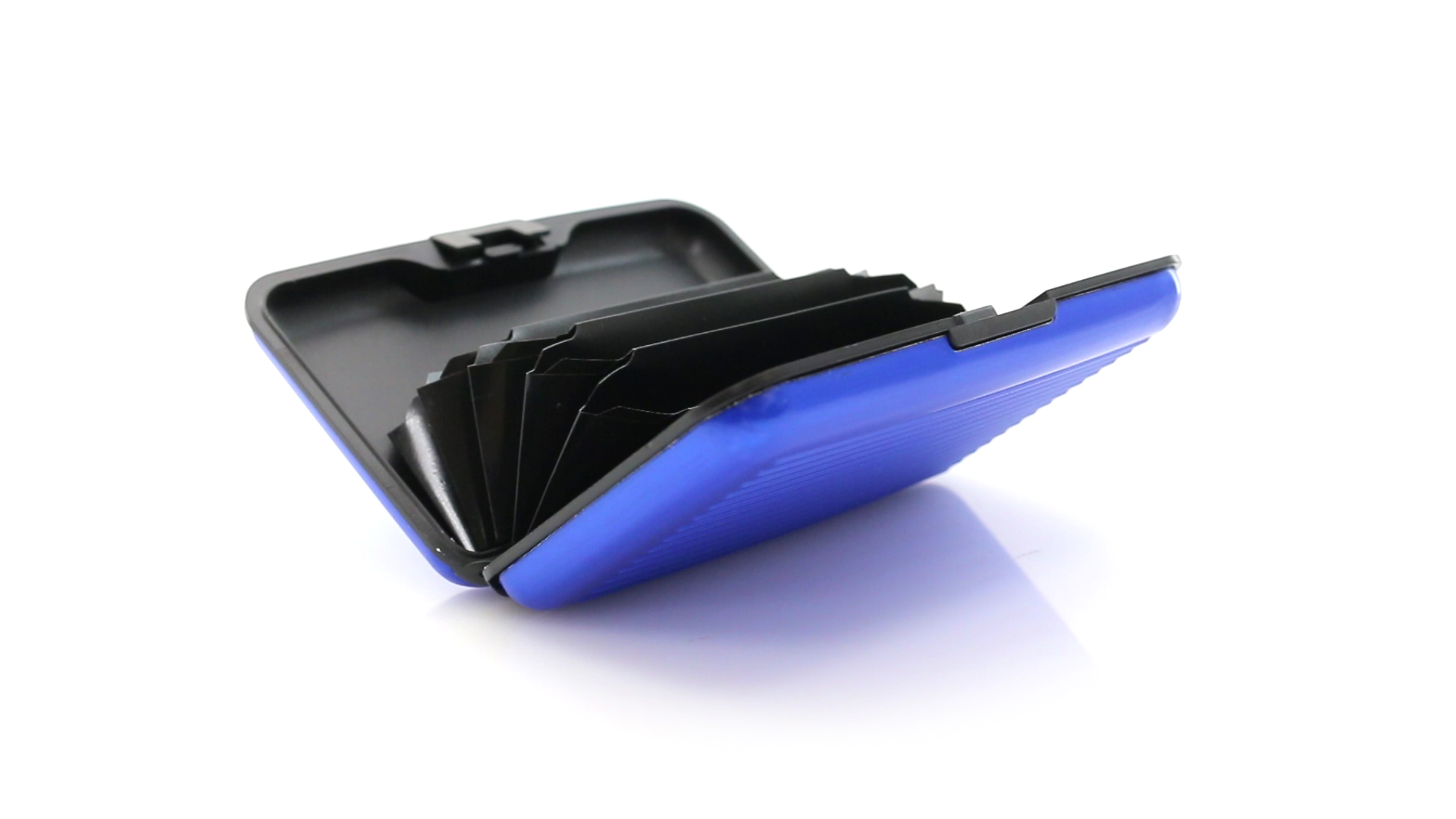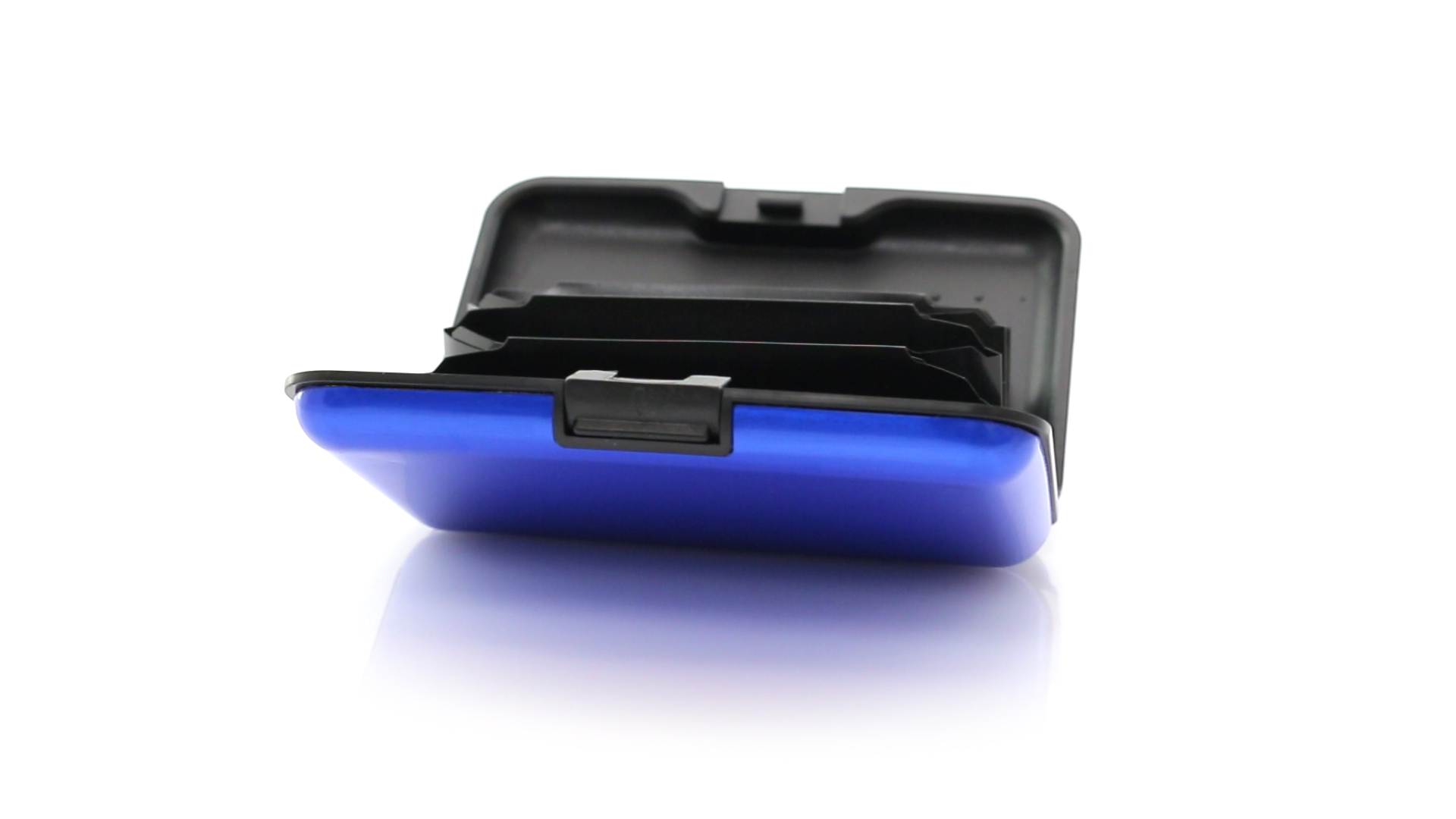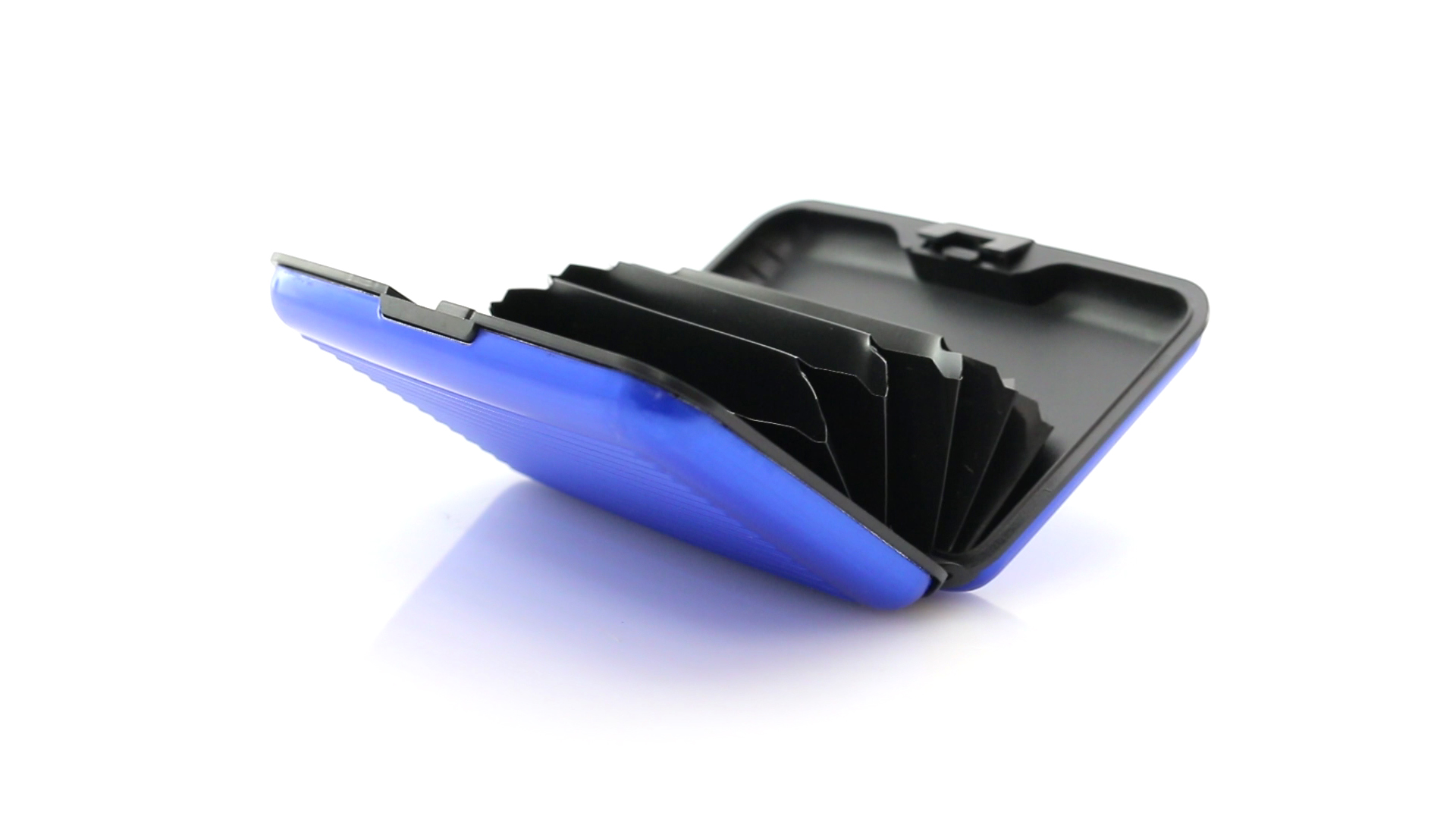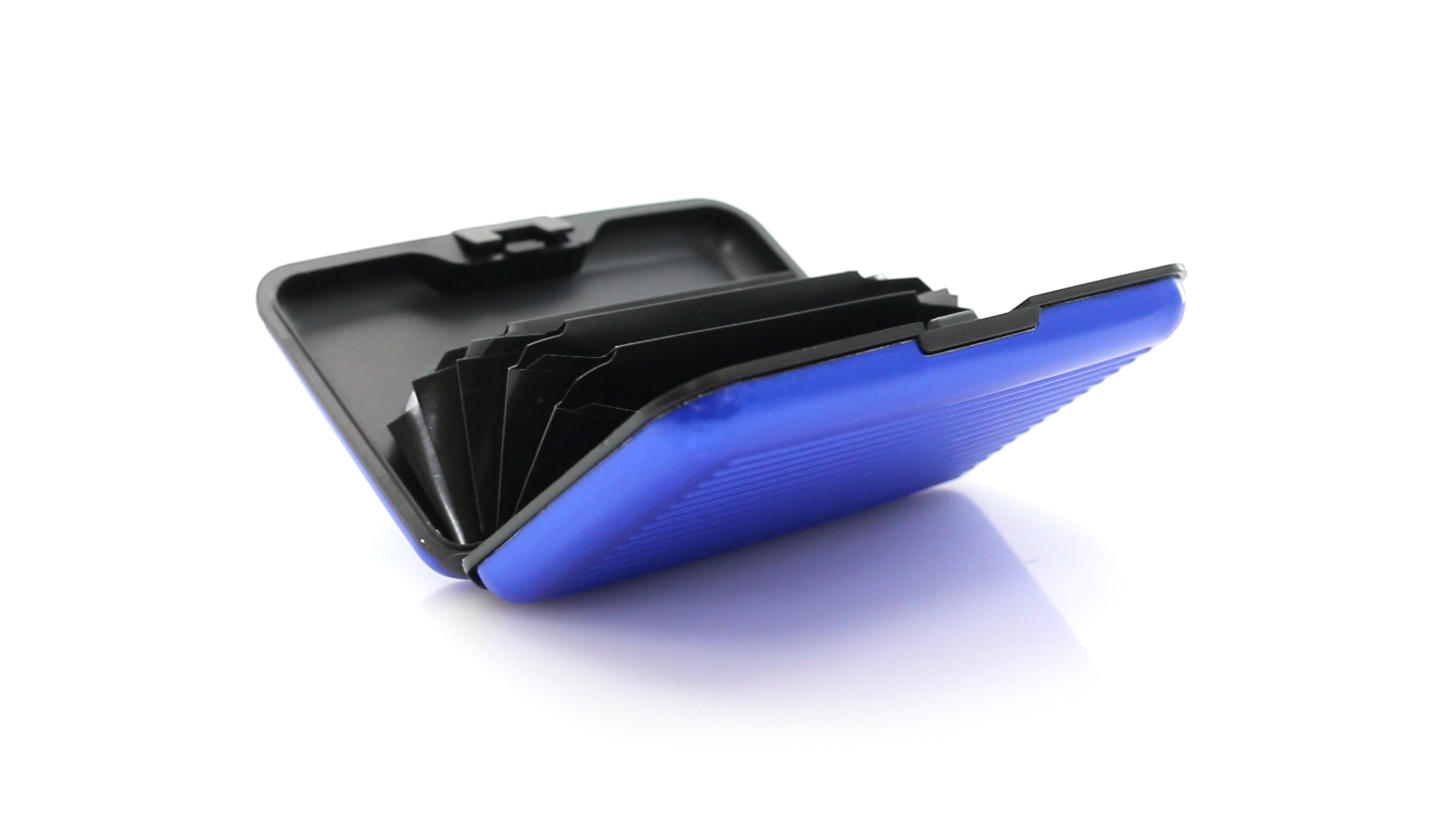 Elegantes Kartenetui in Aluminium-Ausführung in eleganten Farben. Mit 6 Innenfächern im Akkordeon-Stil, Klickverschluss und glatter Druckfläche an der Aussenseite - geeignet für die Personalisierung mittels Laserdruck. Präsentiert in einer individuellen Box in Silber.
