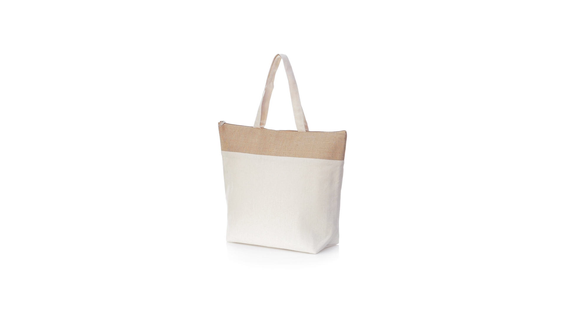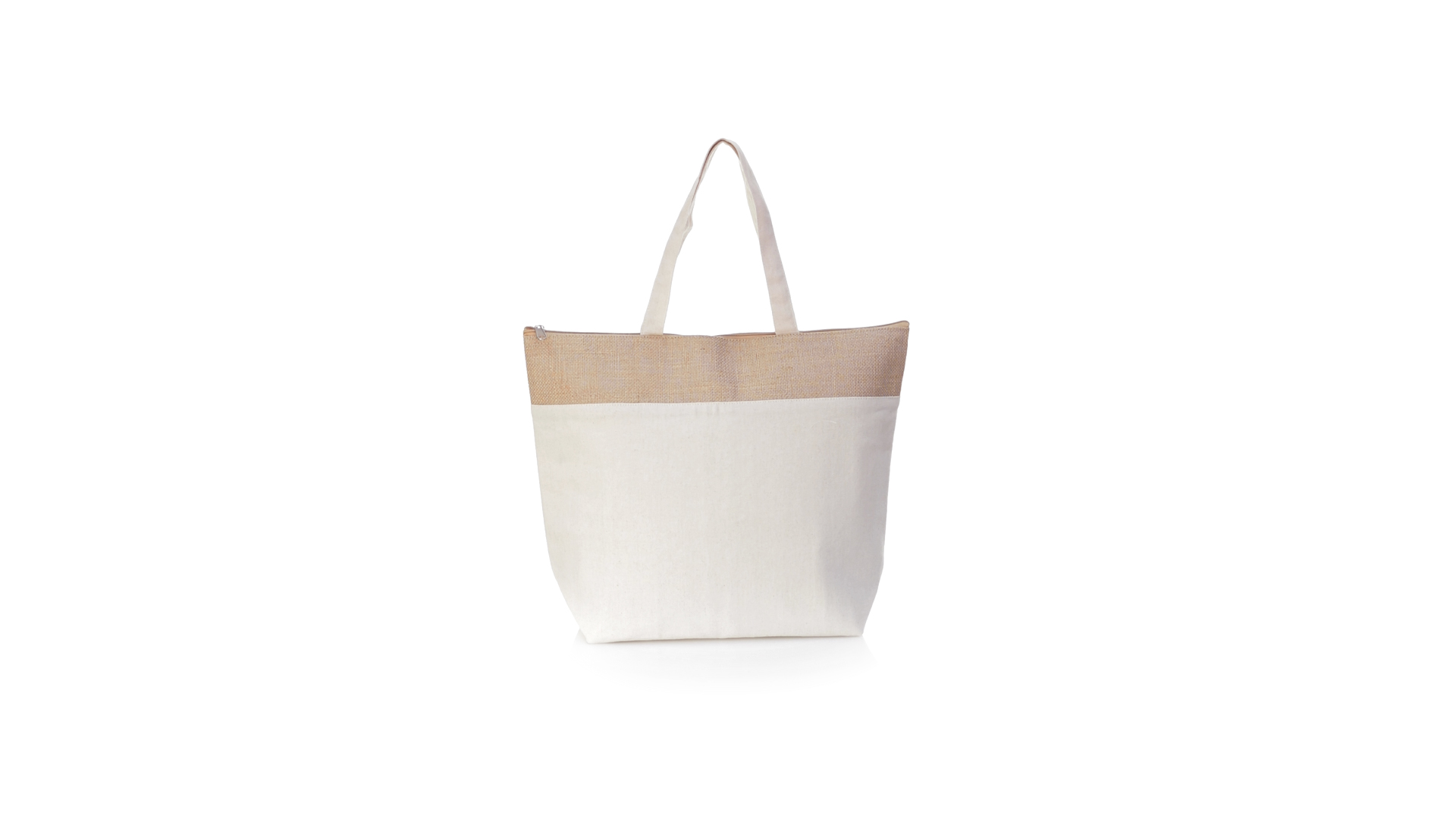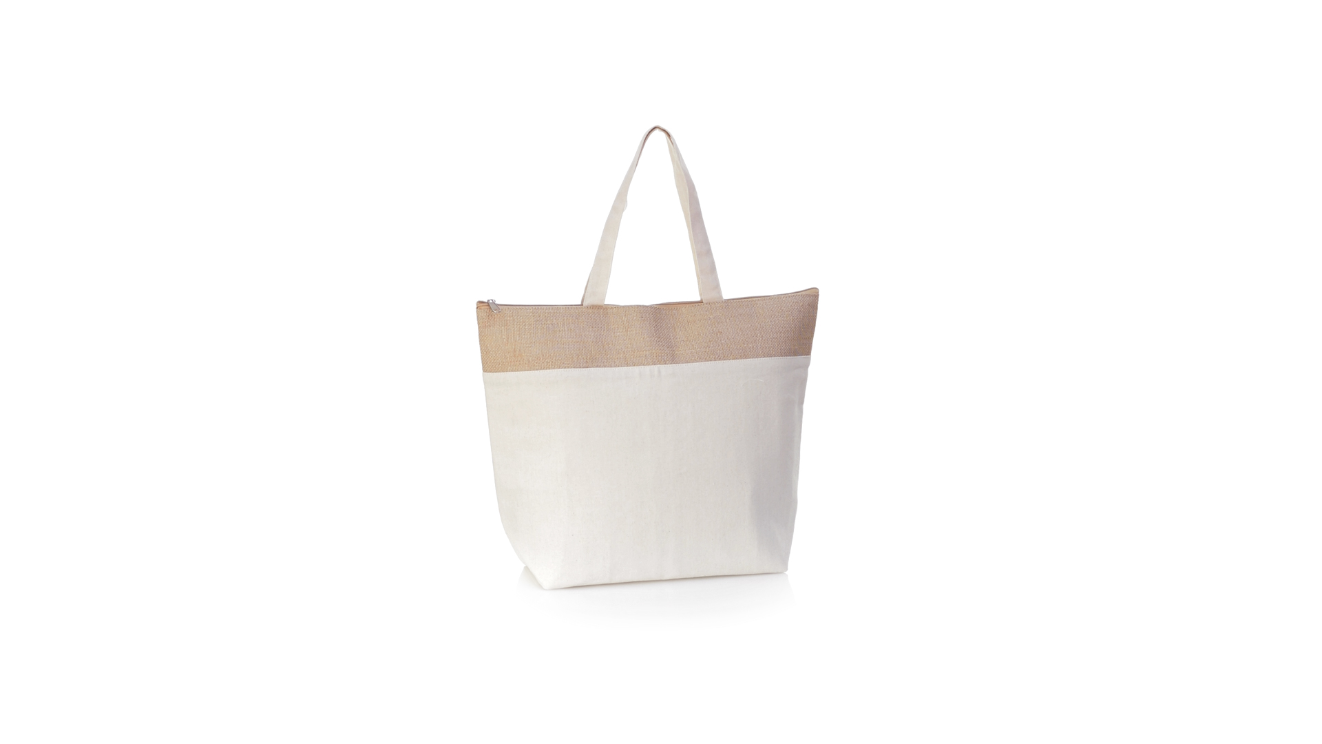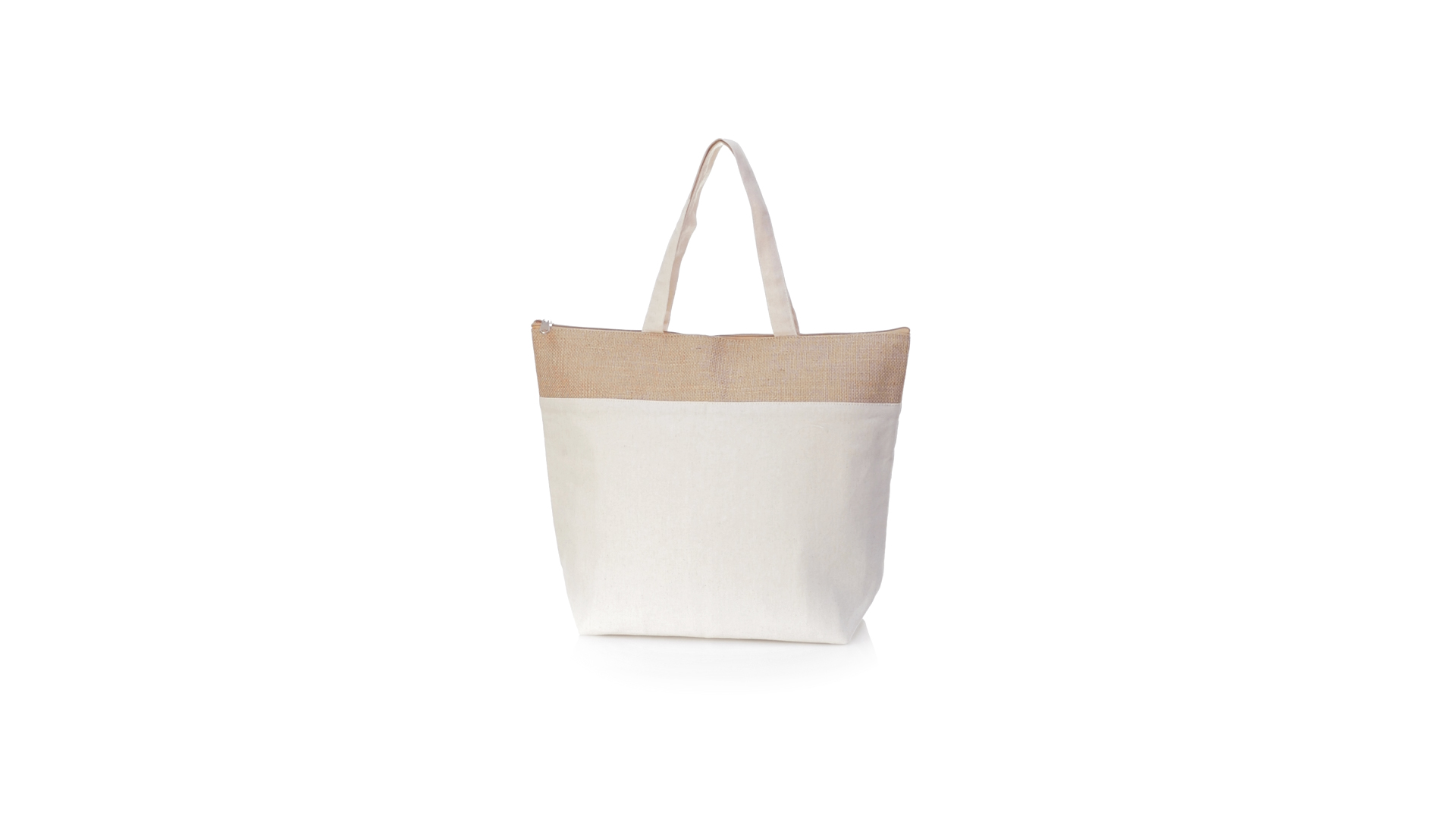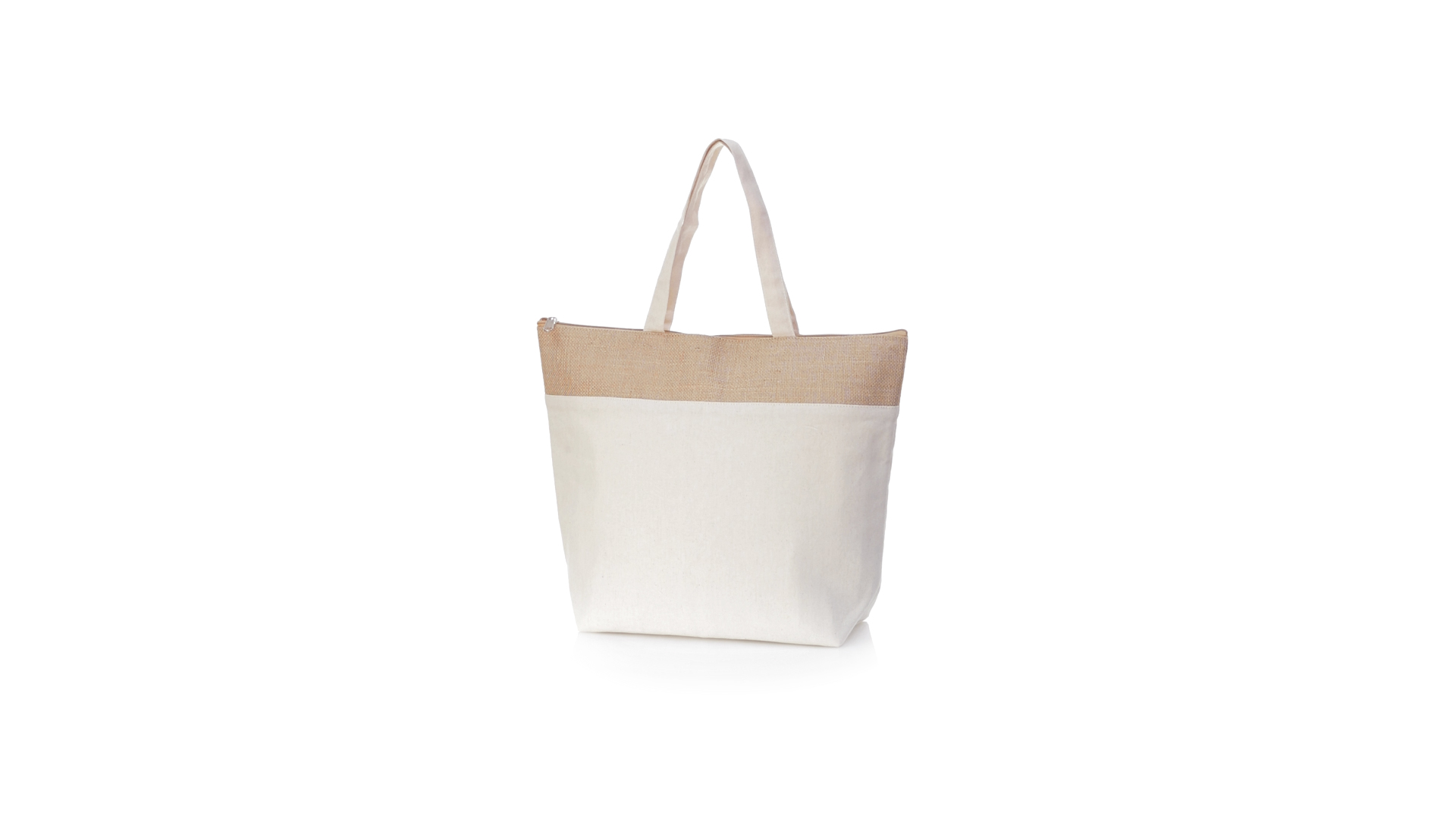 Thermotasche aus widerstandsfähigem Baumwollmaterial von 225g / m2, mit laminiertem Juteoberteil und Baumwollgriffen. Hauptfach mit Reissverschluss und Metallschieber, mit isothermer Aluminium-Innenausstattung. Genähtes Finish, mit verstärkten mittleren Griffen und einer Widerstandsfähigkeit von bis zu 7 kg.