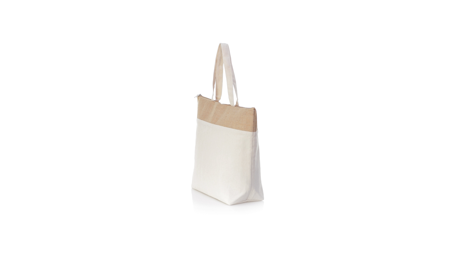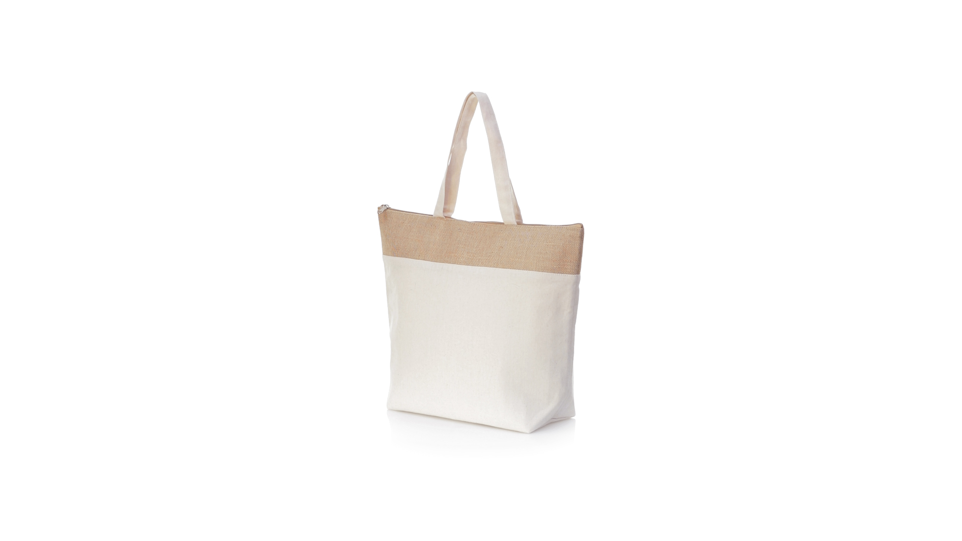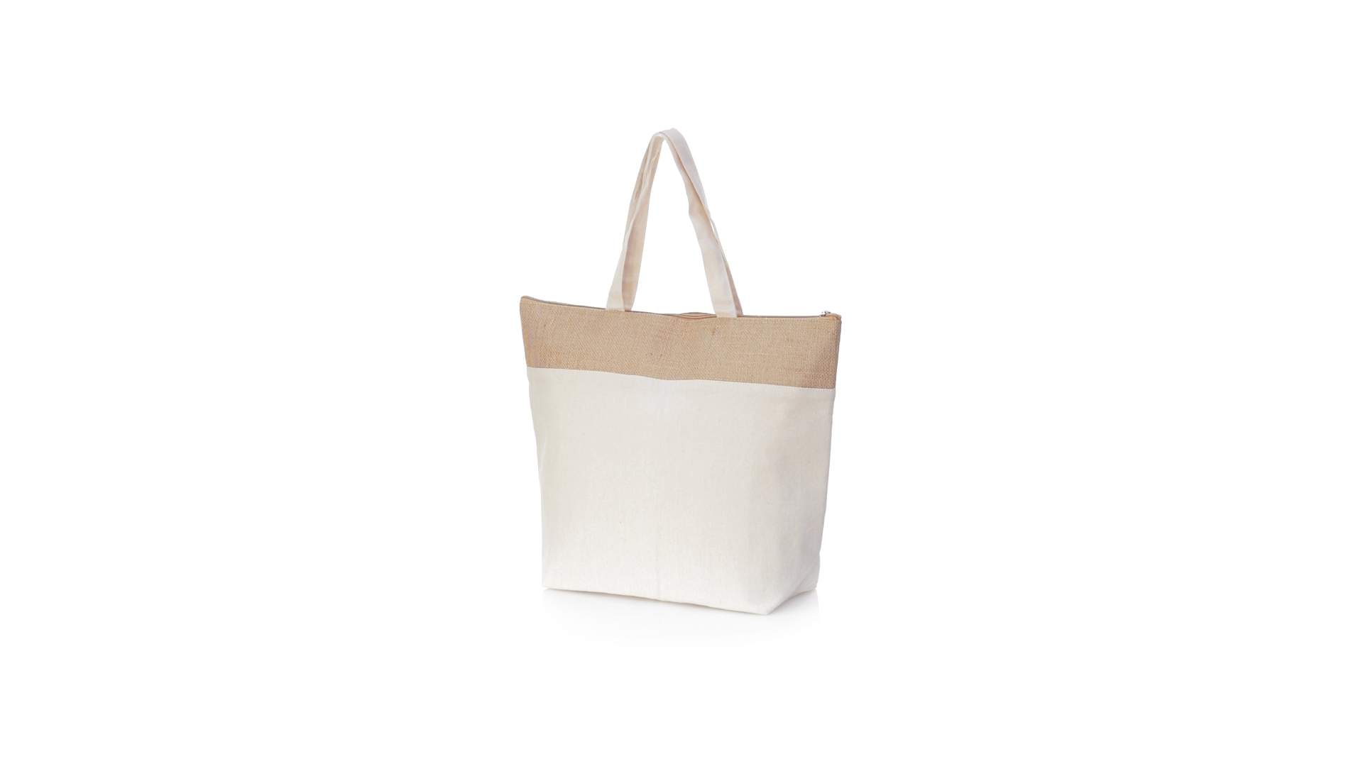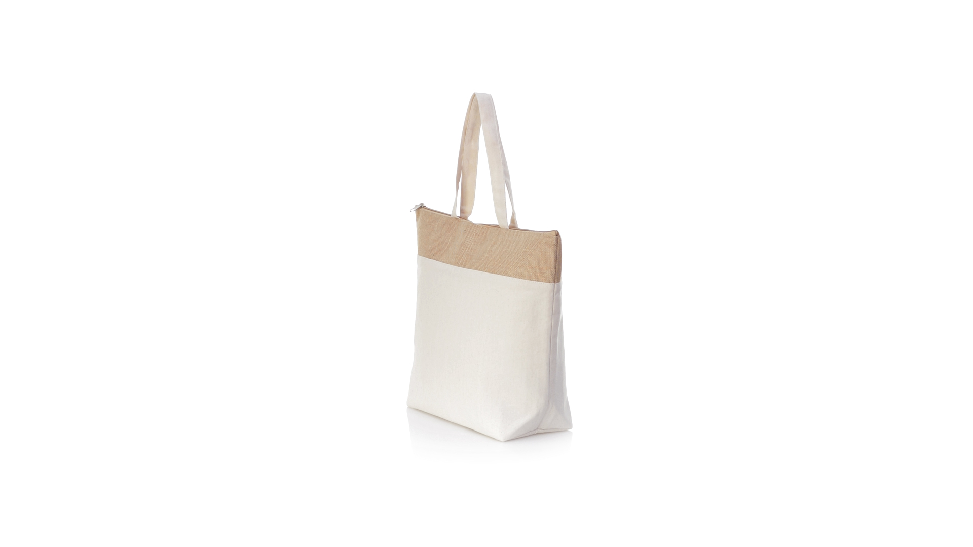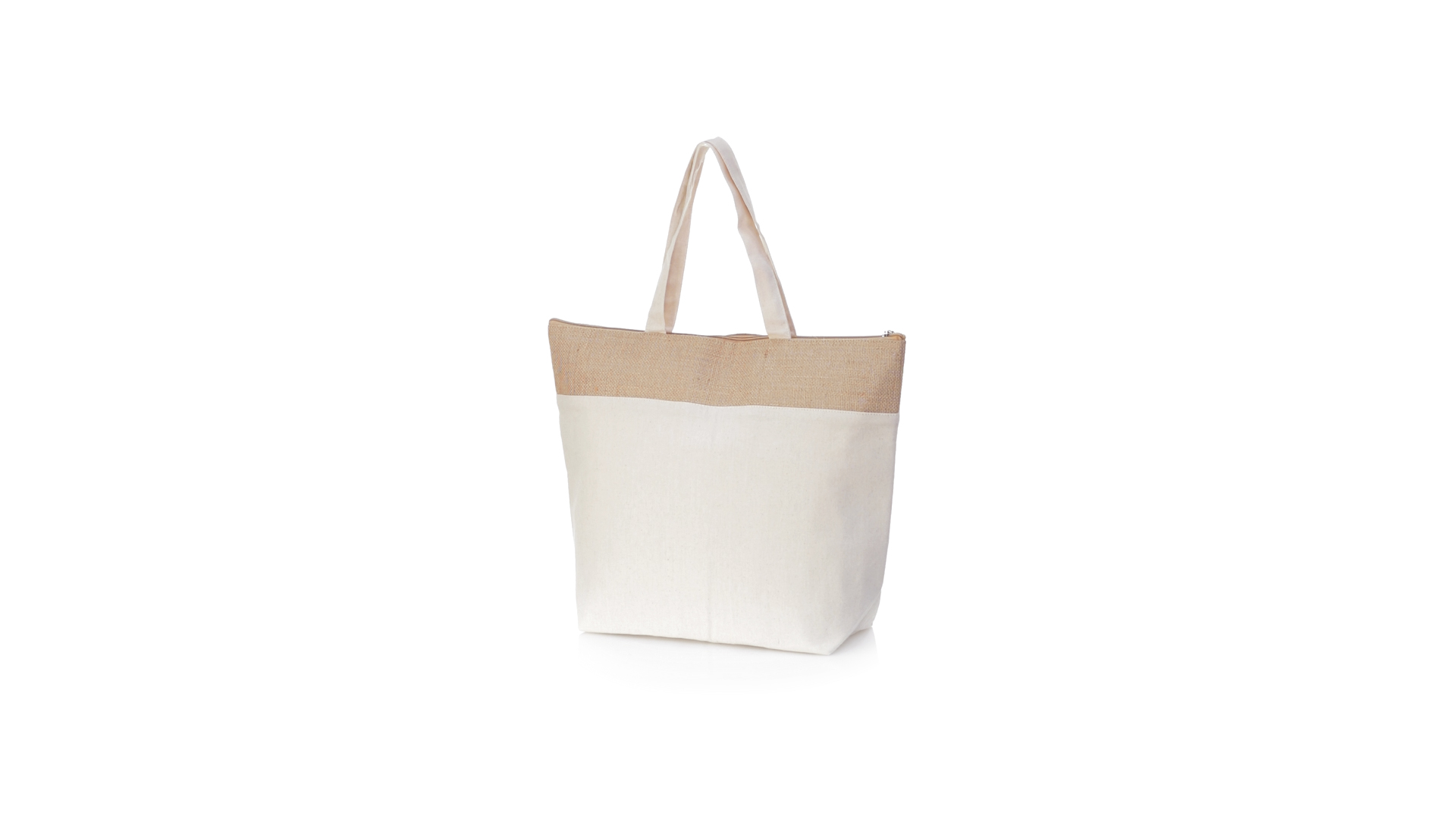 Thermotasche aus widerstandsfähigem Baumwollmaterial von 225g / m2, mit laminiertem Juteoberteil und Baumwollgriffen. Hauptfach mit Reissverschluss und Metallschieber, mit isothermer Aluminium-Innenausstattung. Genähtes Finish, mit verstärkten mittleren Griffen und einer Widerstandsfähigkeit von bis zu 7 kg.