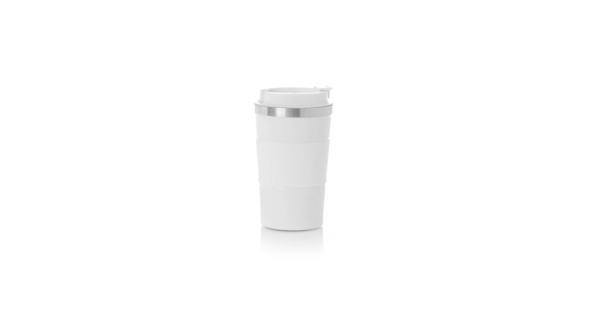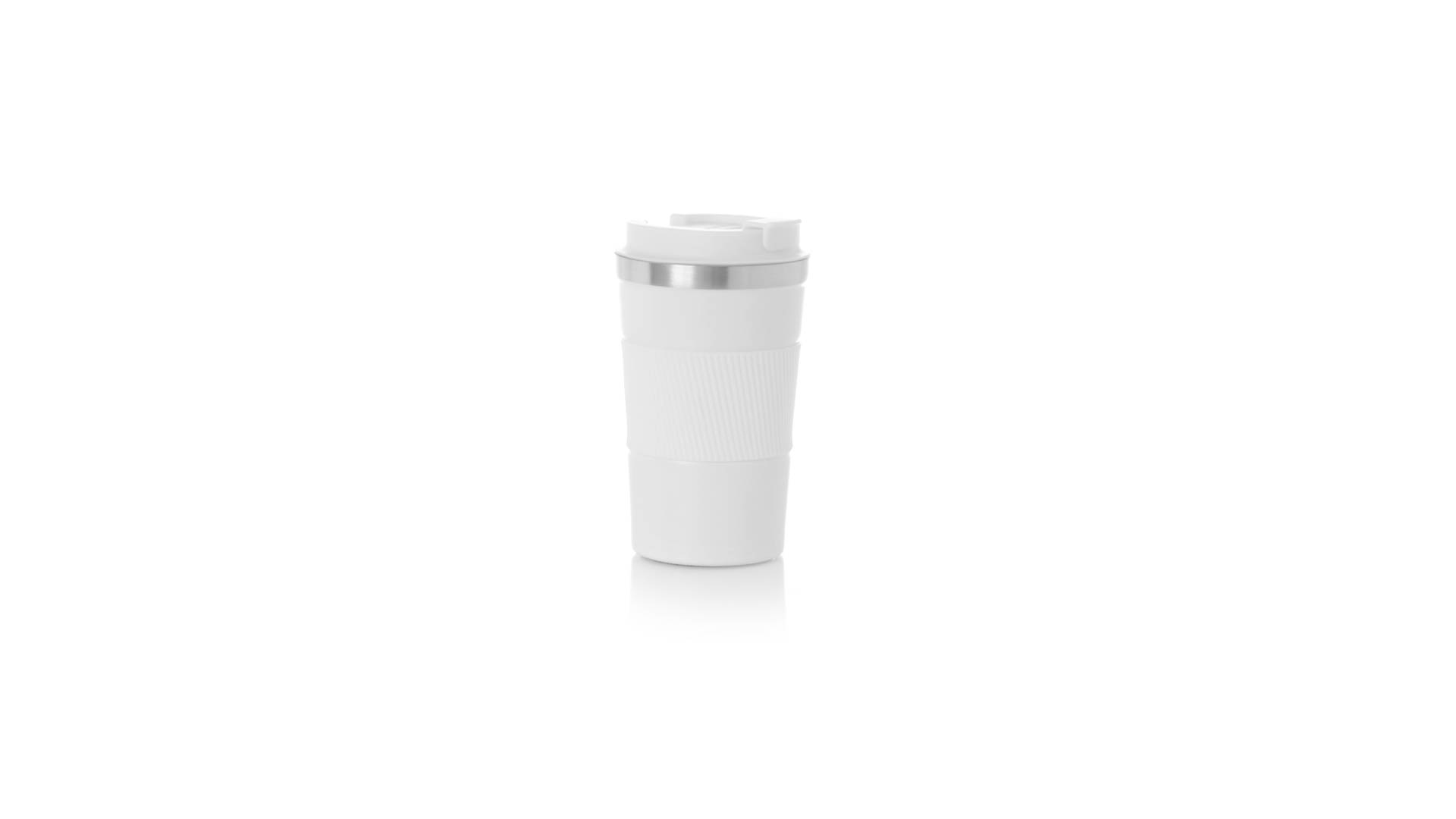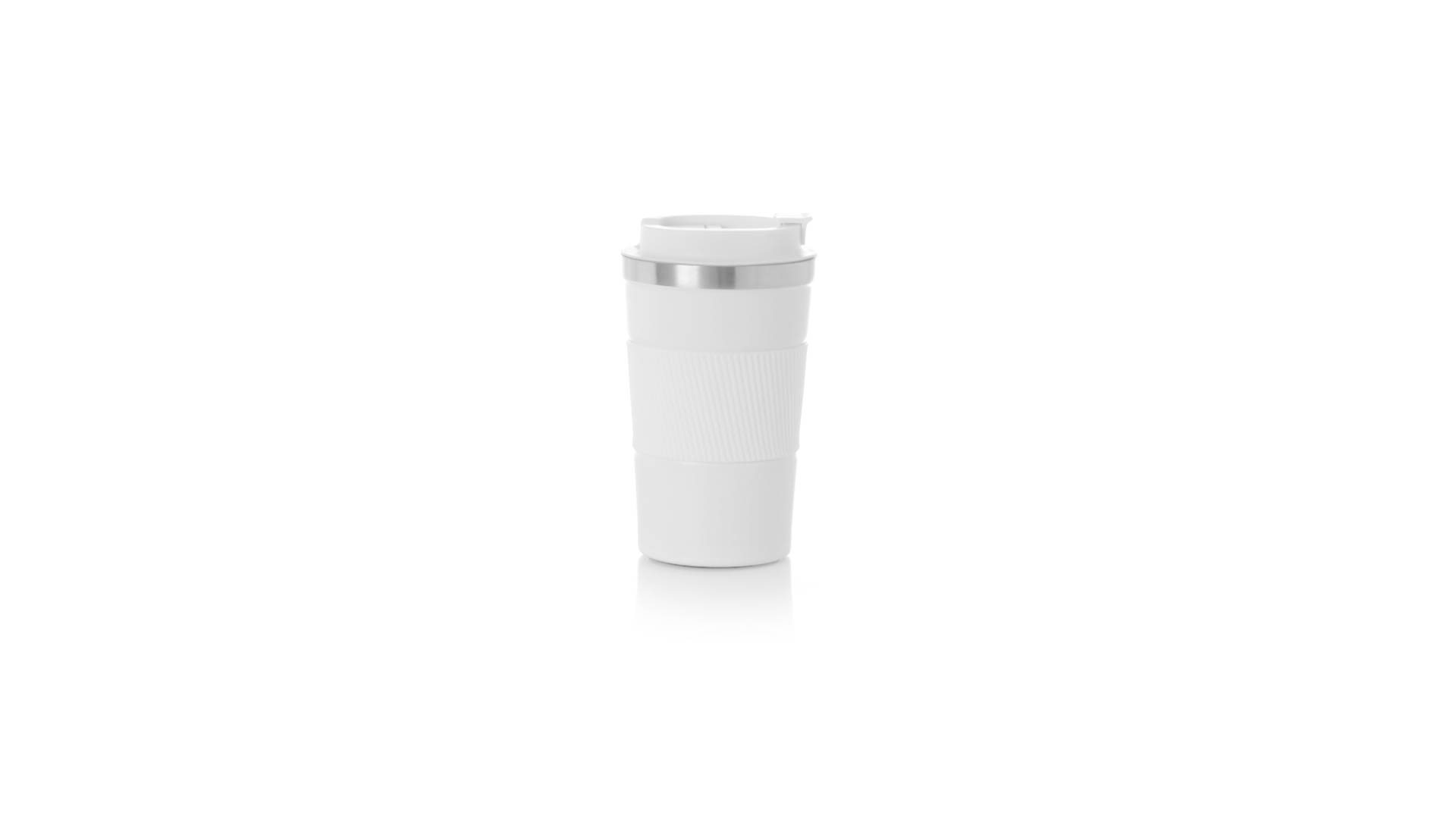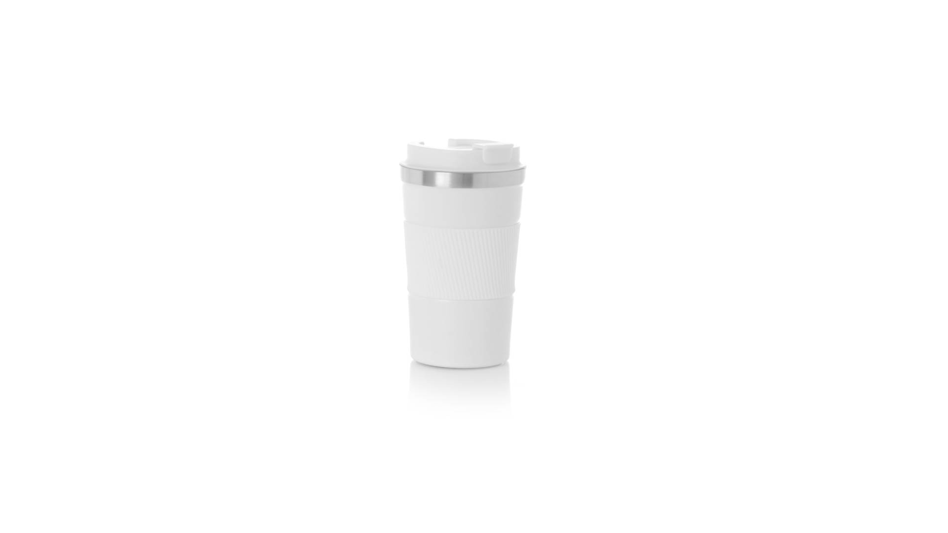 Thermobecher aus doppelwandigem Edelstahl mit einem Fassungsvermögen von 400 ml in matter Farbe. Mit Deckelspender und Easy-Opener, passendem Silikonband und rutschfestem Boden, BPA-frei. Es ist ideal für Ihren Schreibtisch, Tisch oder jede andere Oberfläche, auf der Sie in Ruhe Ihr Lieblingsgetränk geniessen können.